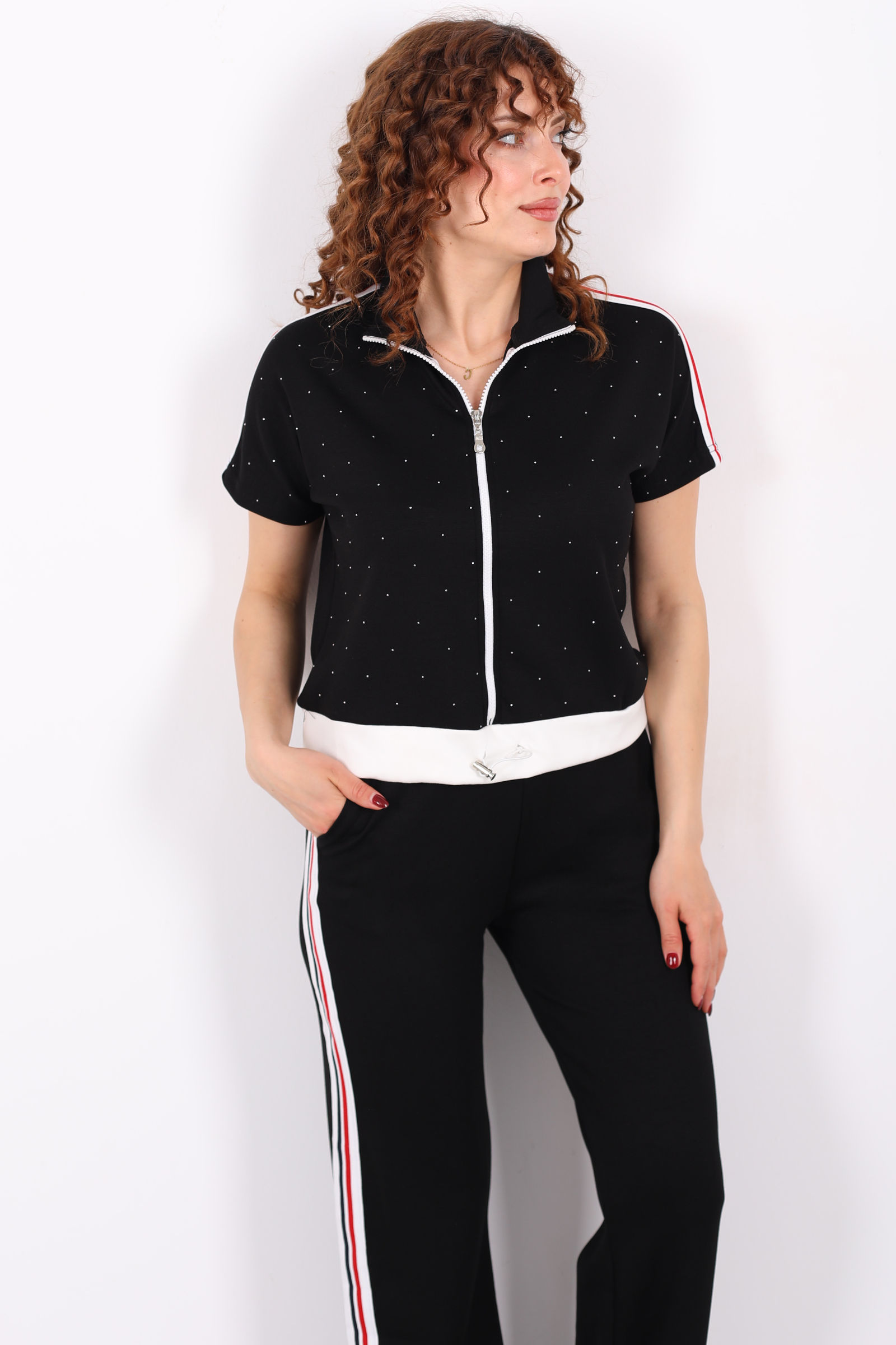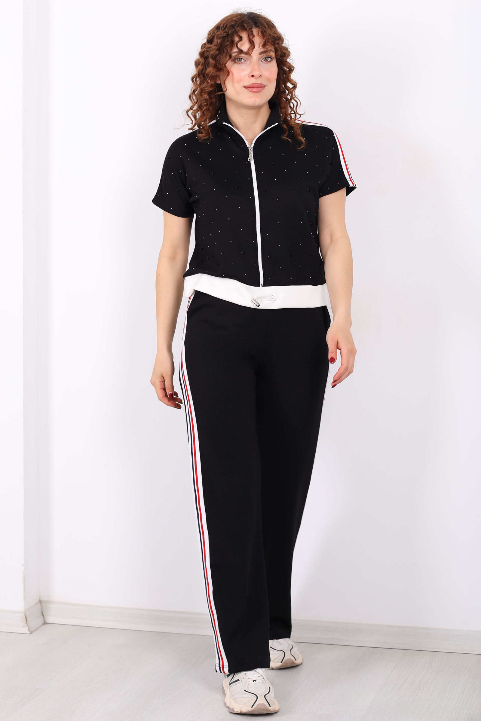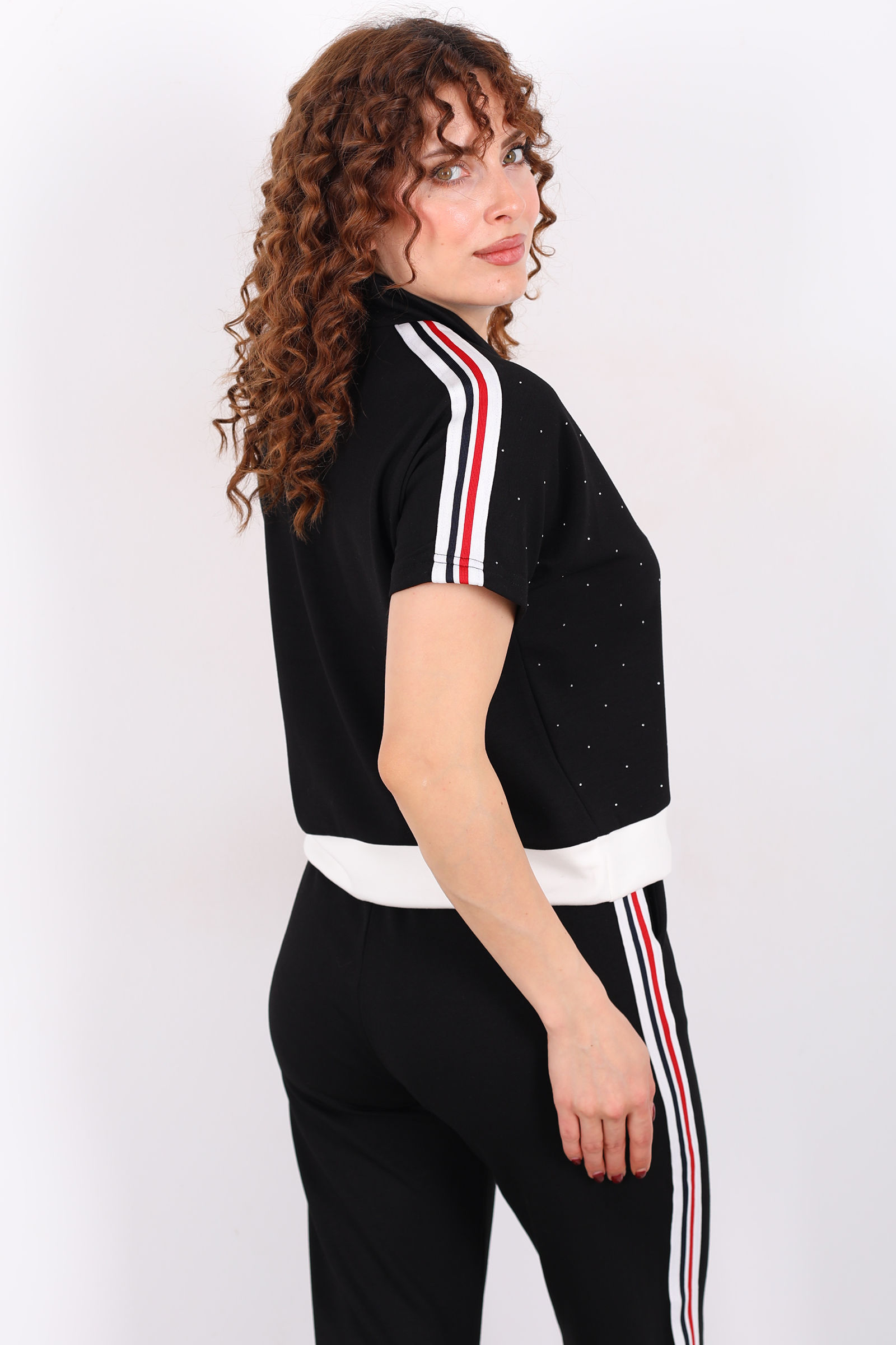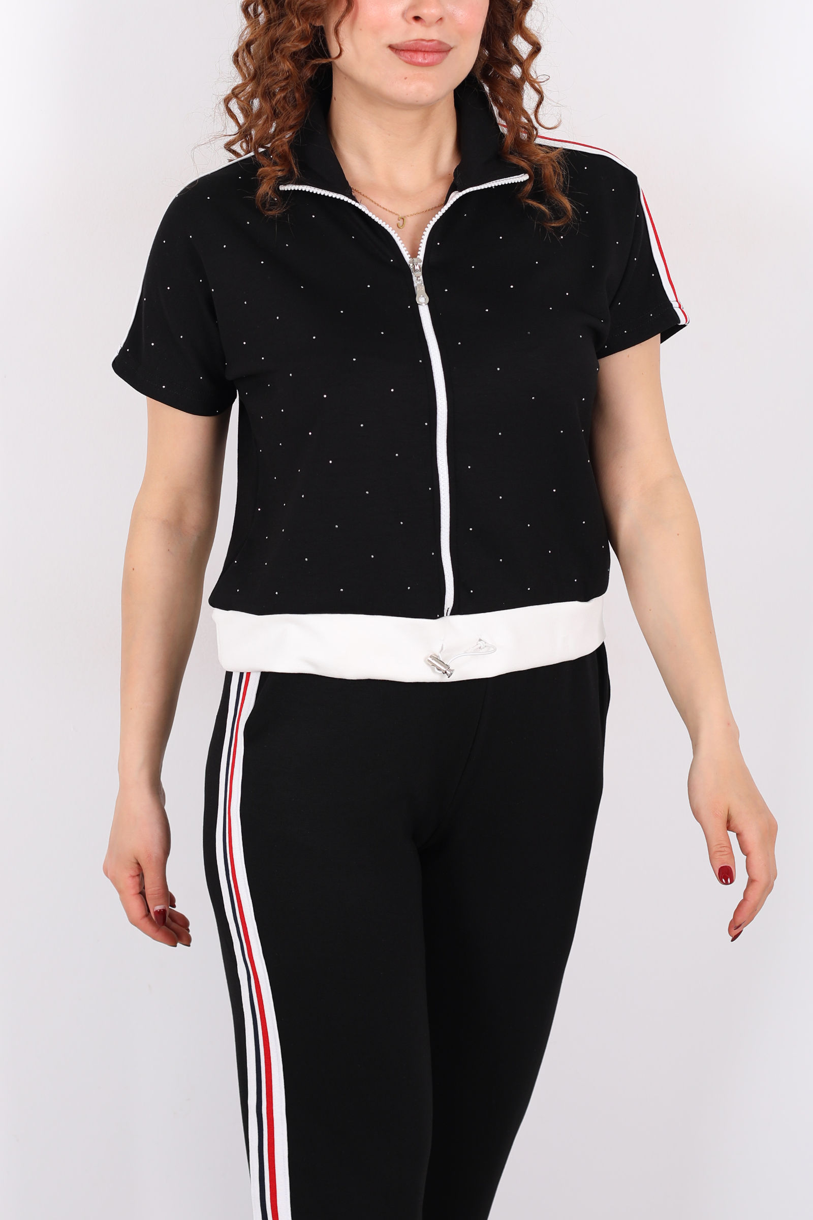 Serpme Taşlı Şerit Garnili Stoperli Siyah Kadın Takım
