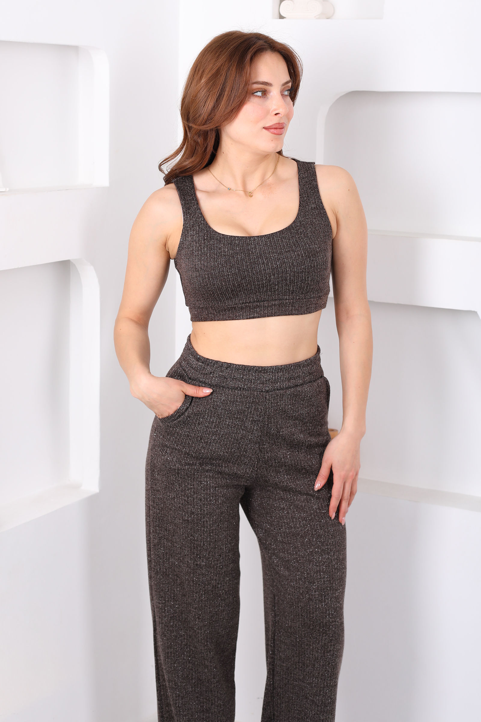 Kahverengi simli crop ceket ve pantolon takım, sofistike bir görünümü modern detaylarla buluşturur. Ceket üzerindeki ışıltılı sim detaylar ve zarif dikişler, şıklığı vurgularken crop kesim çağdaş bir siluet yaratır. Yüksek bel pantolon, bacak boyunu uzun gösterir ve takımın dengeli duruşunu destekler. Yumuşak dokulu kumaşı sayesinde hem özel davetlerde hem de şehir stilinde rahat kullanım sağlar. Minimal aksesuarlarla tamamlandığında gündüz stiline uyumlu, topuklu ayakkabılarla gece kombinlerinde öne çıkan bir parça haline gelir. Kahverenginin sıcak tonu, her mevsim rahatlıkla kullanılabilecek, gardırobunuzun göz alıcı temel parçalarından biri olur.