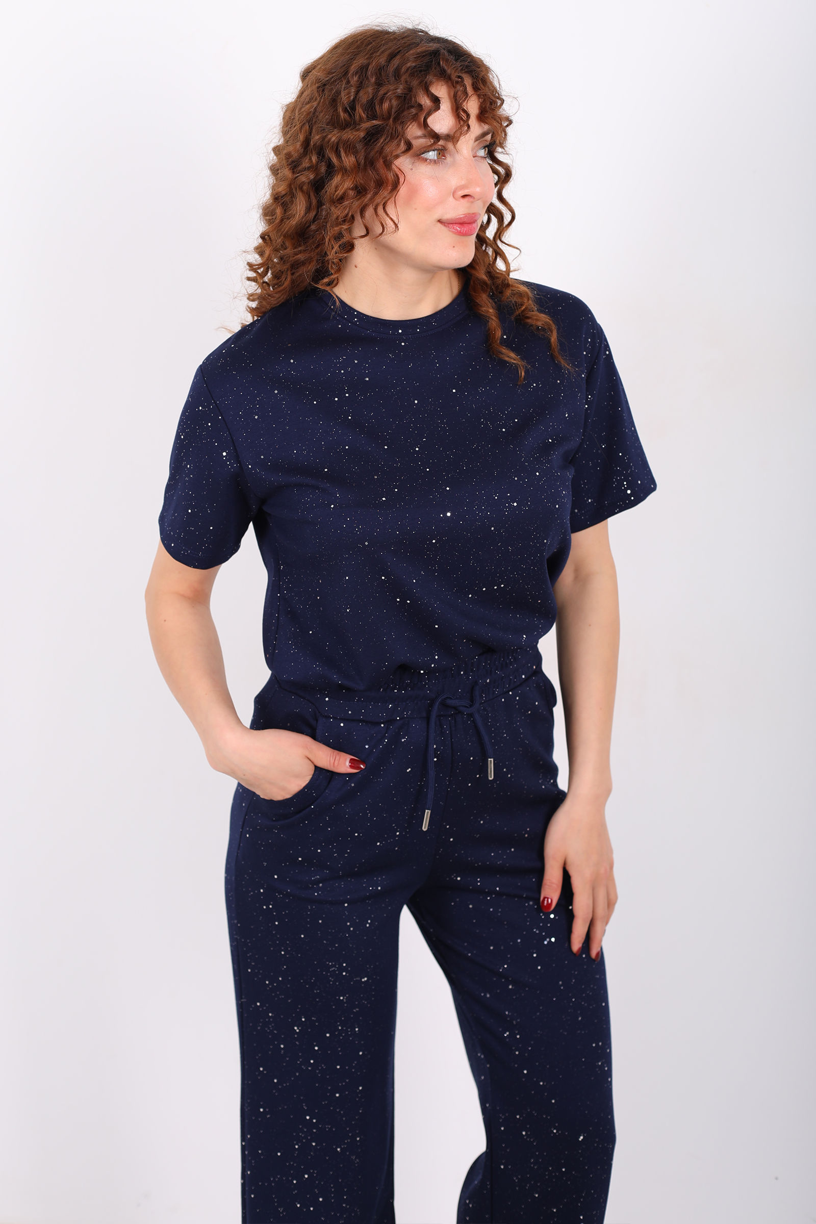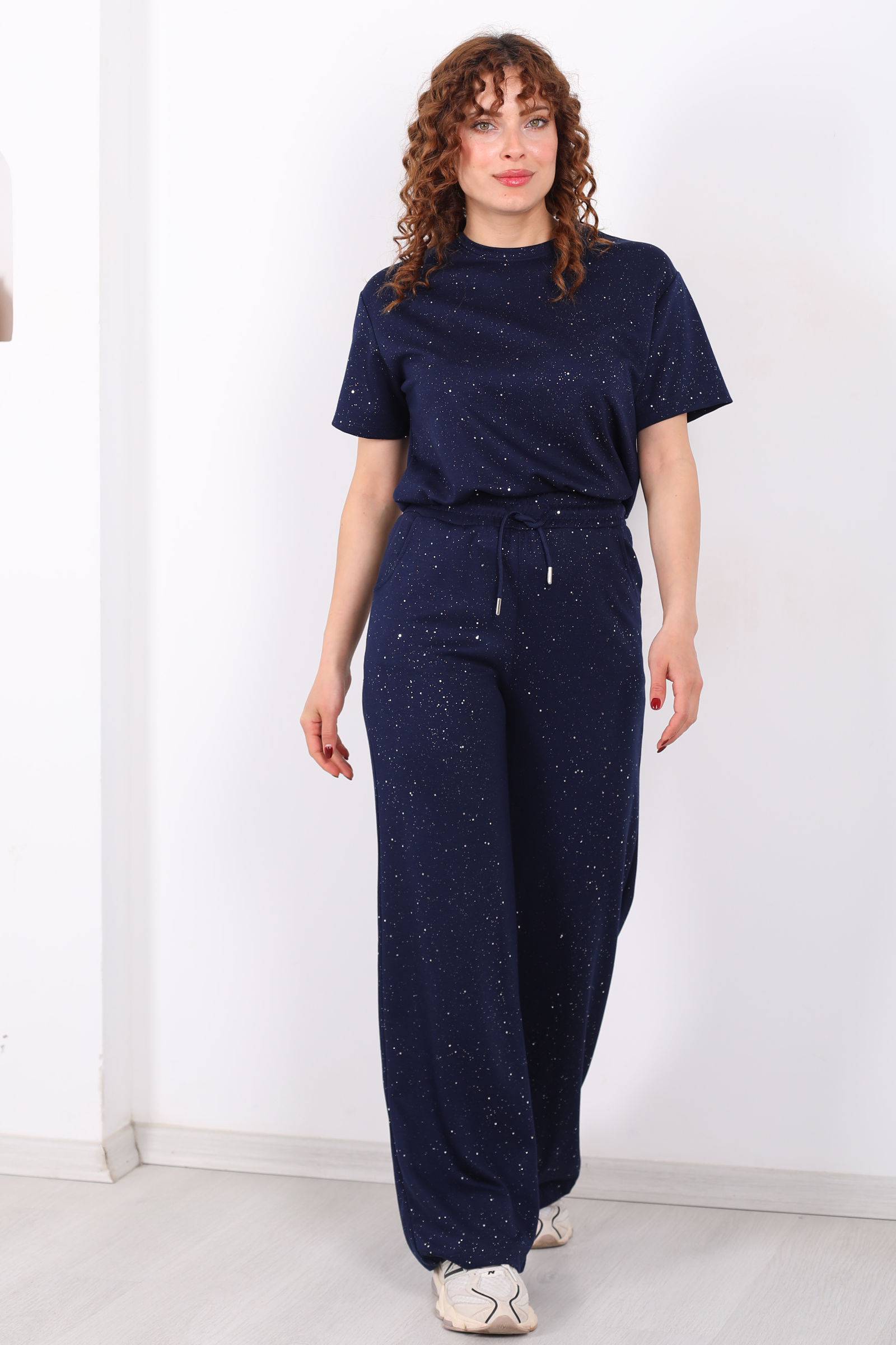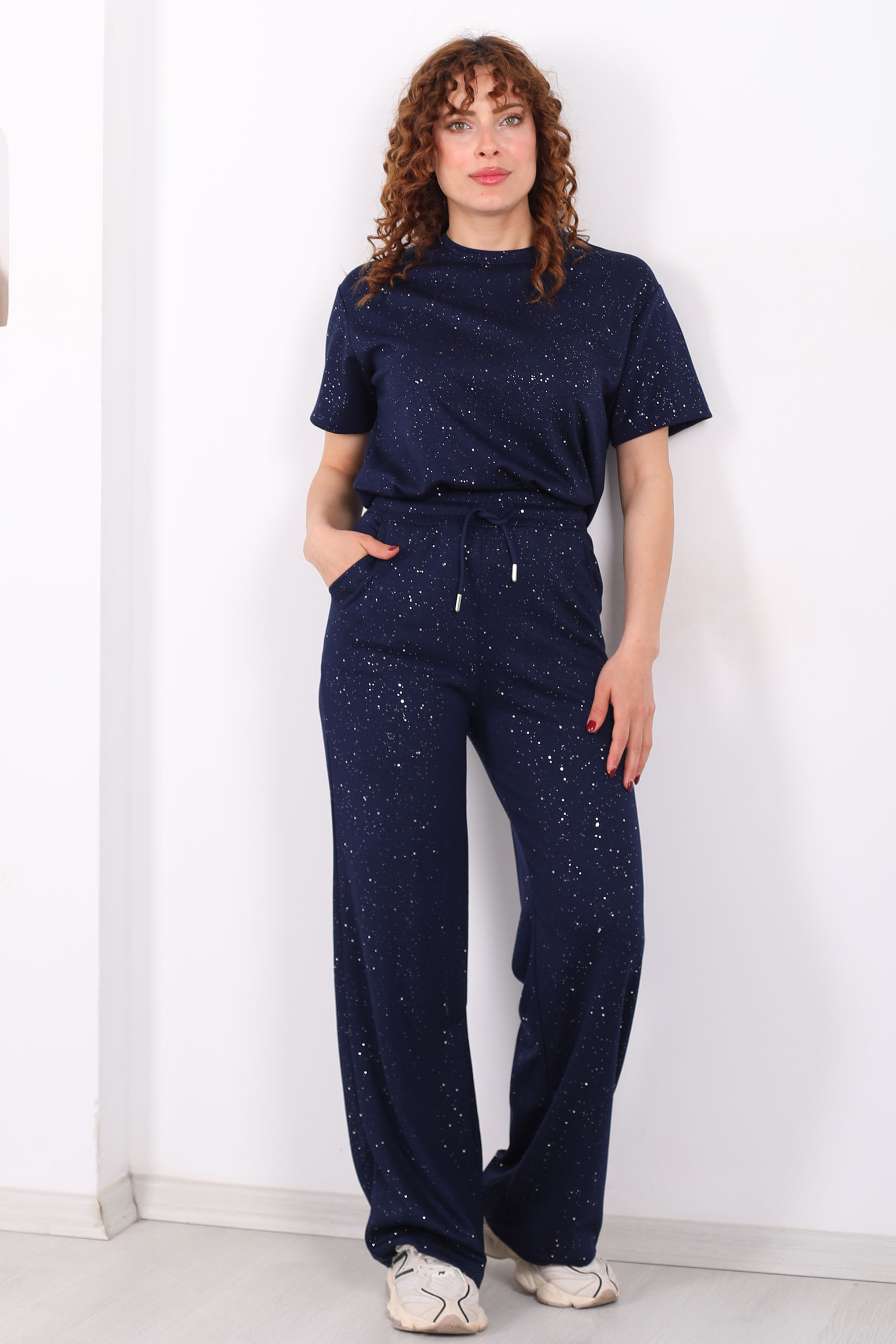 Ayna karşısında saatler harcamadan tek bir hareketle günün en şık kadını olmaya ne dersiniz? Simli kısa kol bol paça kadın lacivert modal takım, üzerindeki ışıltılı detayları ve göz kamaştıran dökümlü kumaşıyla özel günlerinizden şık akşam yemeklerine kadar her ortama uyum sağlıyor. Hem alt hem üst parçasıyla bütünlük sağlayan bu set, konforu lüks bir hisle buluşturuyor.