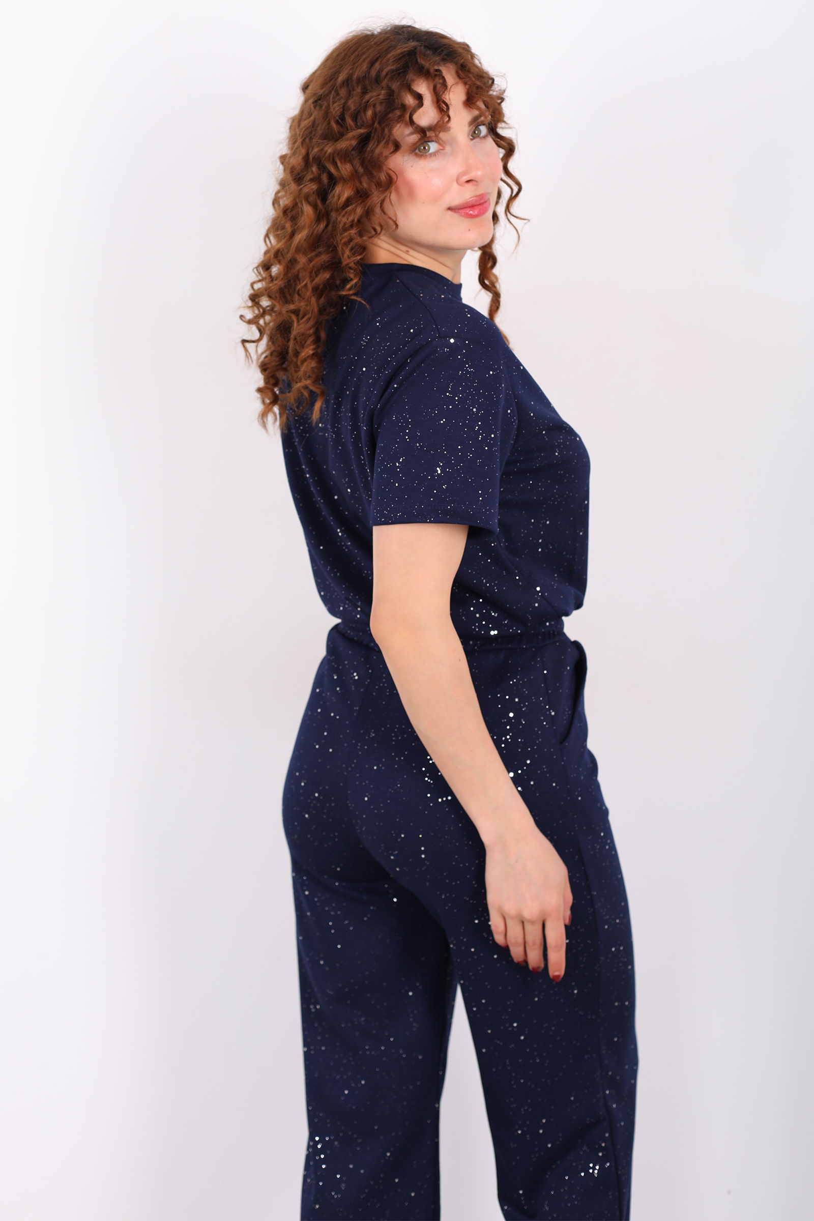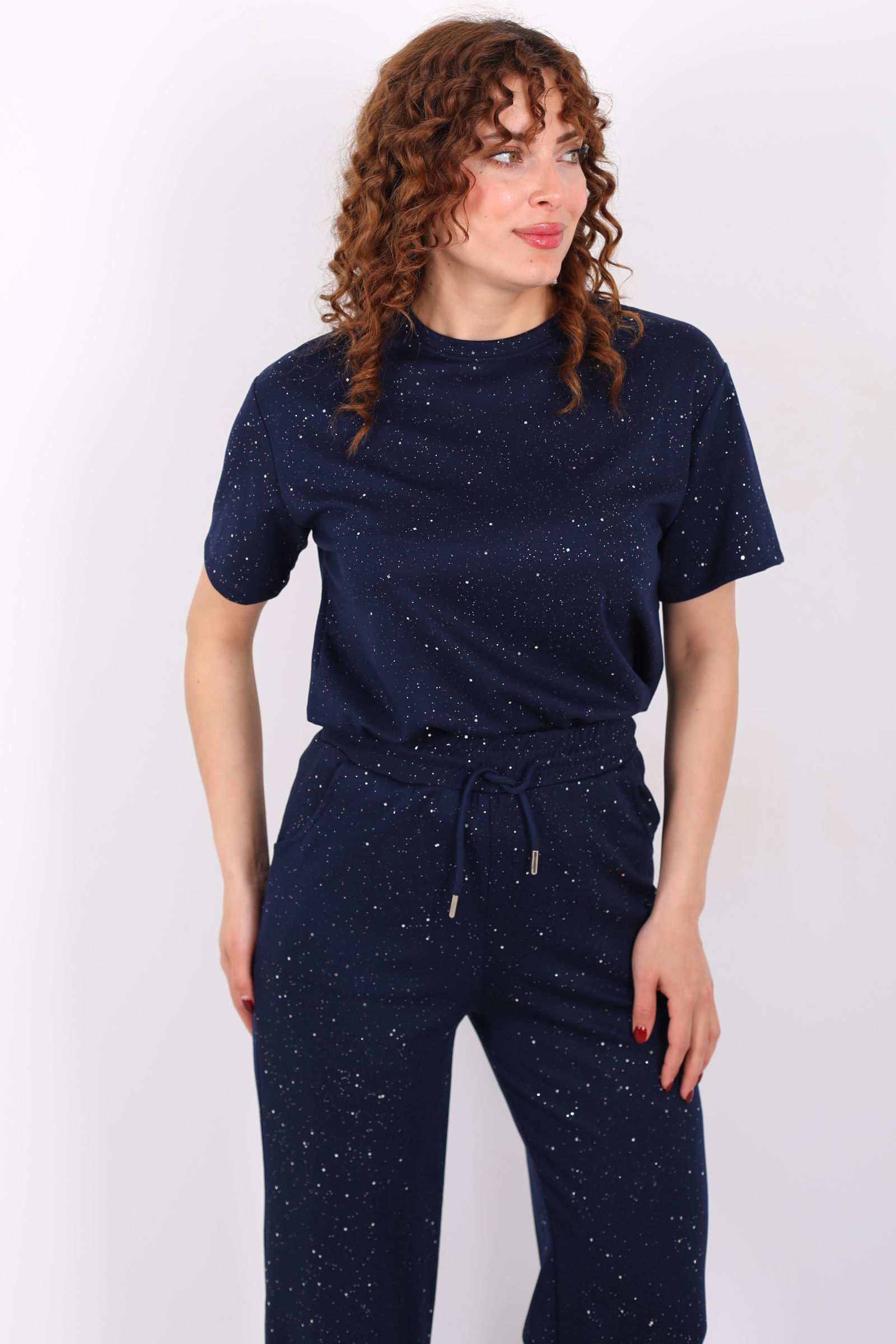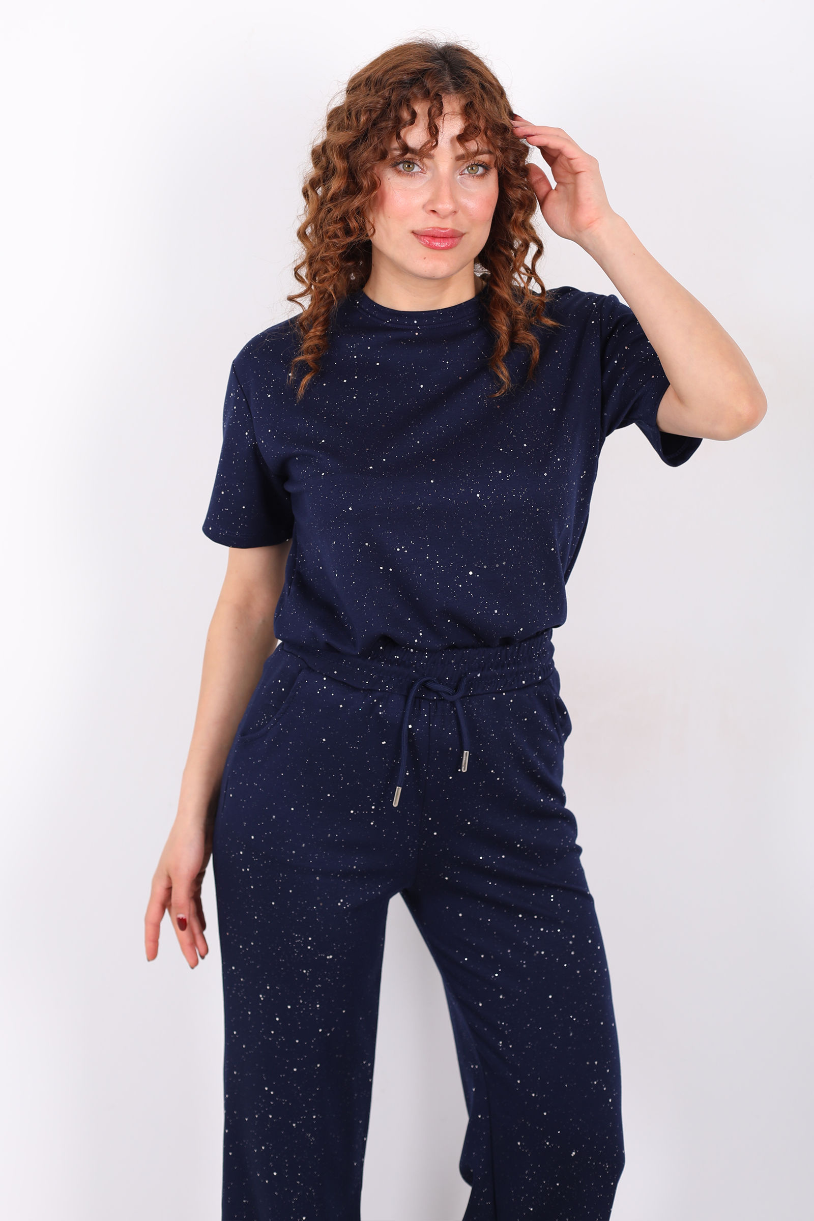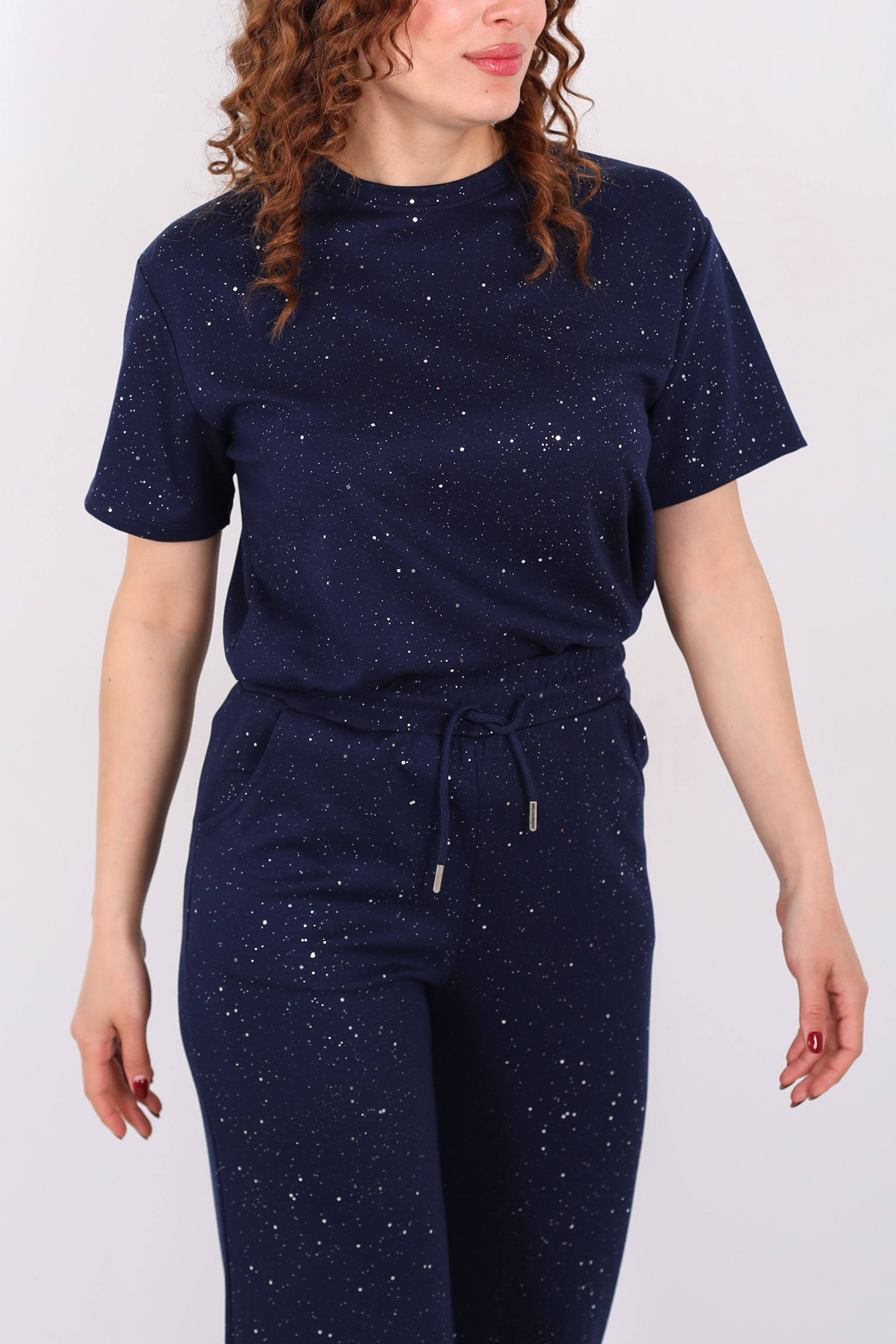 Ayna karşısında saatler harcamadan tek bir hareketle günün en şık kadını olmaya ne dersiniz? Simli kısa kol bol paça kadın lacivert modal takım, üzerindeki ışıltılı detayları ve göz kamaştıran dökümlü kumaşıyla özel günlerinizden şık akşam yemeklerine kadar her ortama uyum sağlıyor. Hem alt hem üst parçasıyla bütünlük sağlayan bu set, konforu lüks bir hisle buluşturuyor.