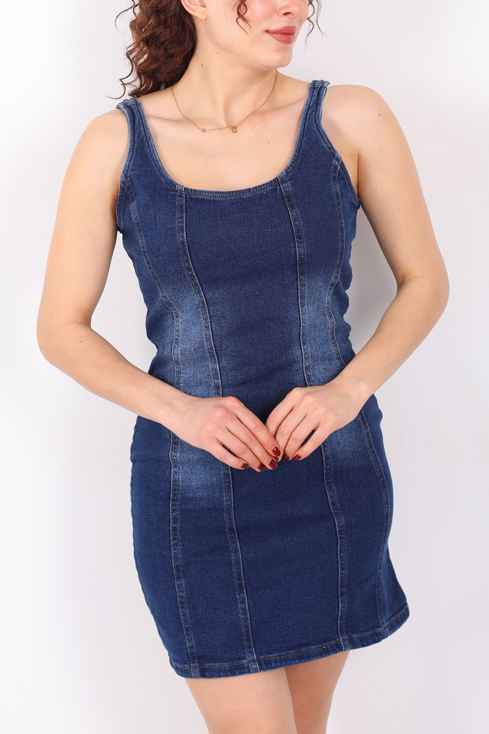 Şehrin ritmini kot şıklığıyla buluşturan kalın askılı arkası yırtmaçlı koyu mavi kar yıkama midi kot elbise, günlük tarzını rahatlık ve modern detaylarla tamamlamak isteyenlerin favorisi olacak. Koyu mavi kar yıkama dokusu, klasik denim görünümüne sofistike bir hava katar; kalın askılar ise güçlü bir duruş sunar. Arkada yer alan yırtmaç detayı hem hareket özgürlüğünü artırır hem de elbiseye dinamik bir ifade kazandırır.