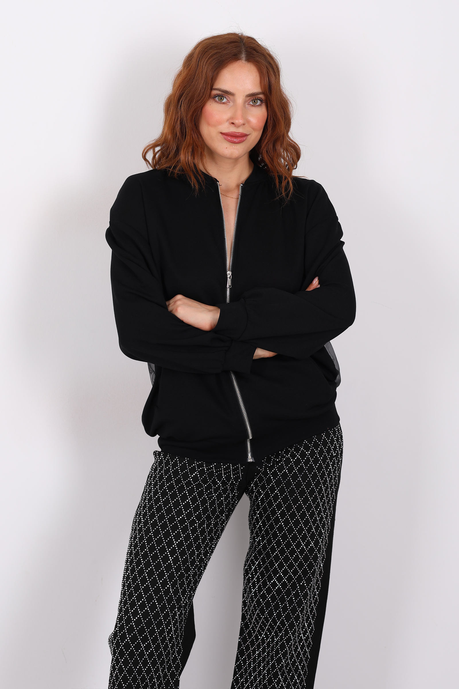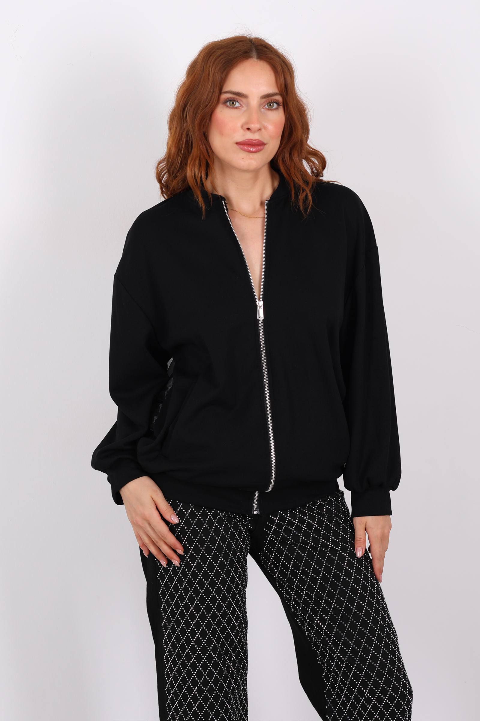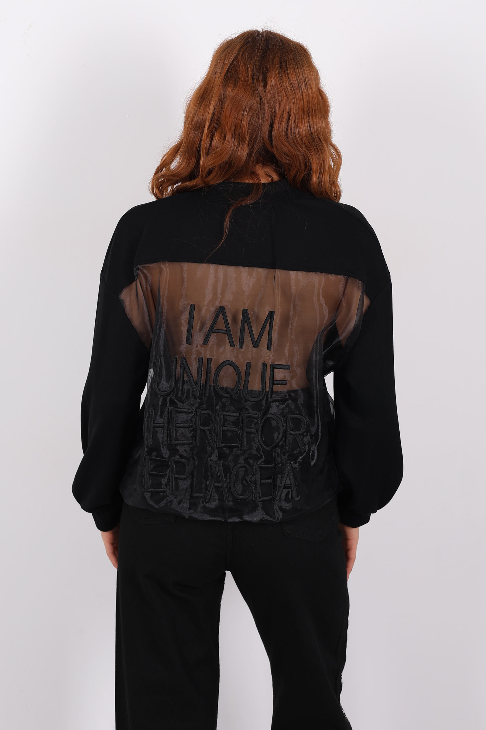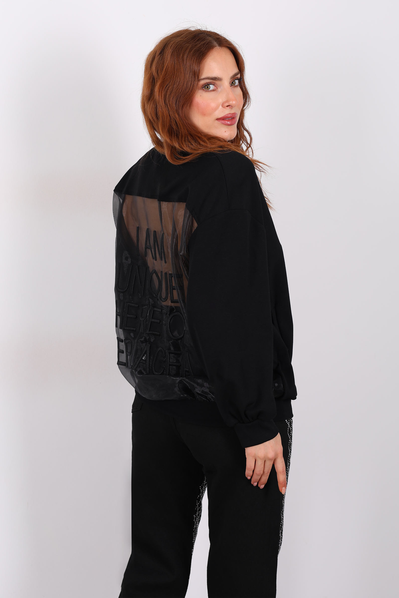 Bu siyah sweatshirt klasik rahatlığın üzerine modern bir dokunuş ekleyen bir parça. Siyah rengiyle zamansız bir temel sunarken, sırtındaki transparan fermuar detayıyla sıradanlıktan uzaklaşıyor ve göz alıcı bir stil yaratıyor.Muhtemelen pamuk‑polyester karışımı bir kumaştan üretilmiş. Bu tür karışımlar, polyesterin dayanıklılığını ve form koruma özelliğini pamuklu dokunun yumuşaklığıyla bir araya getirir.