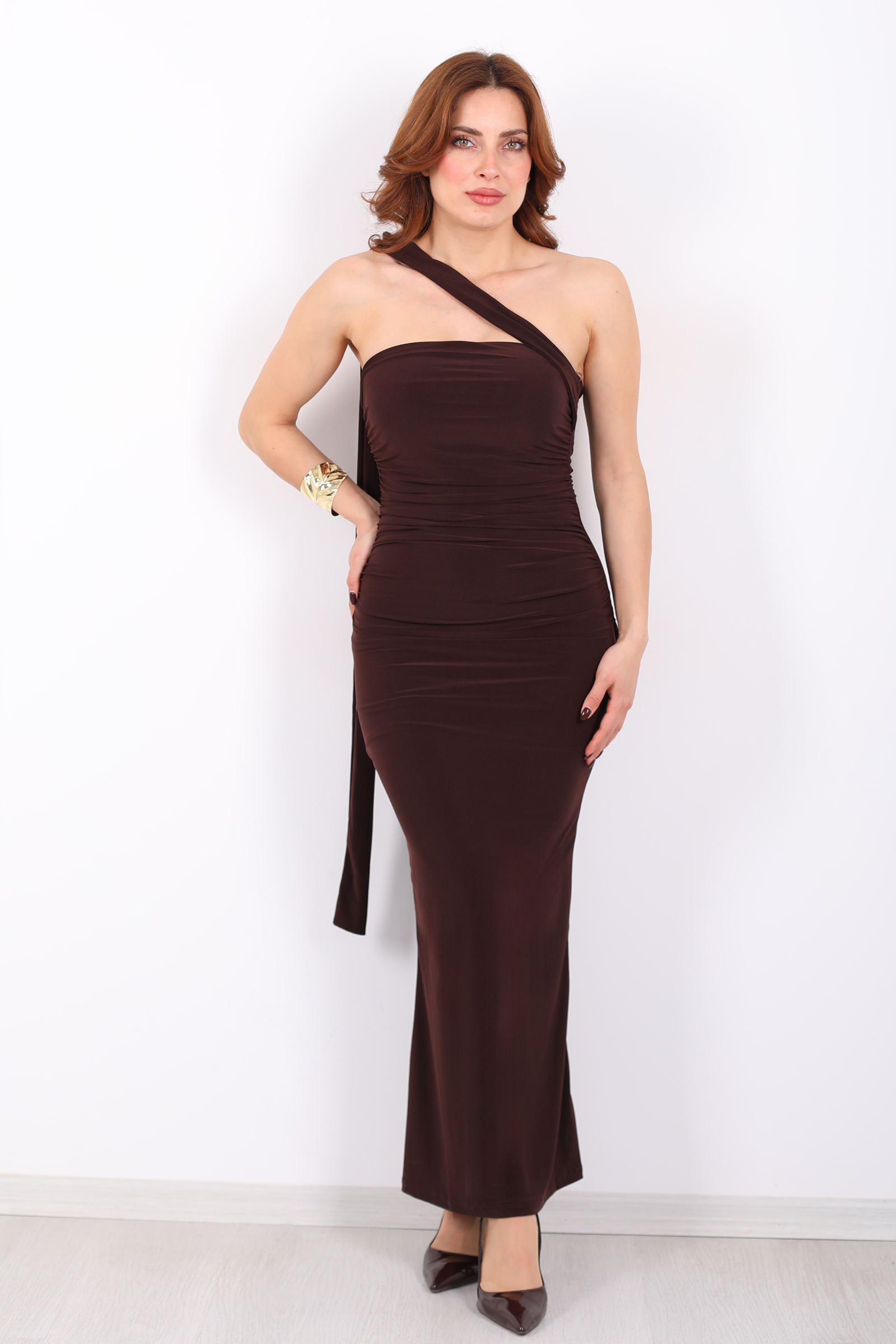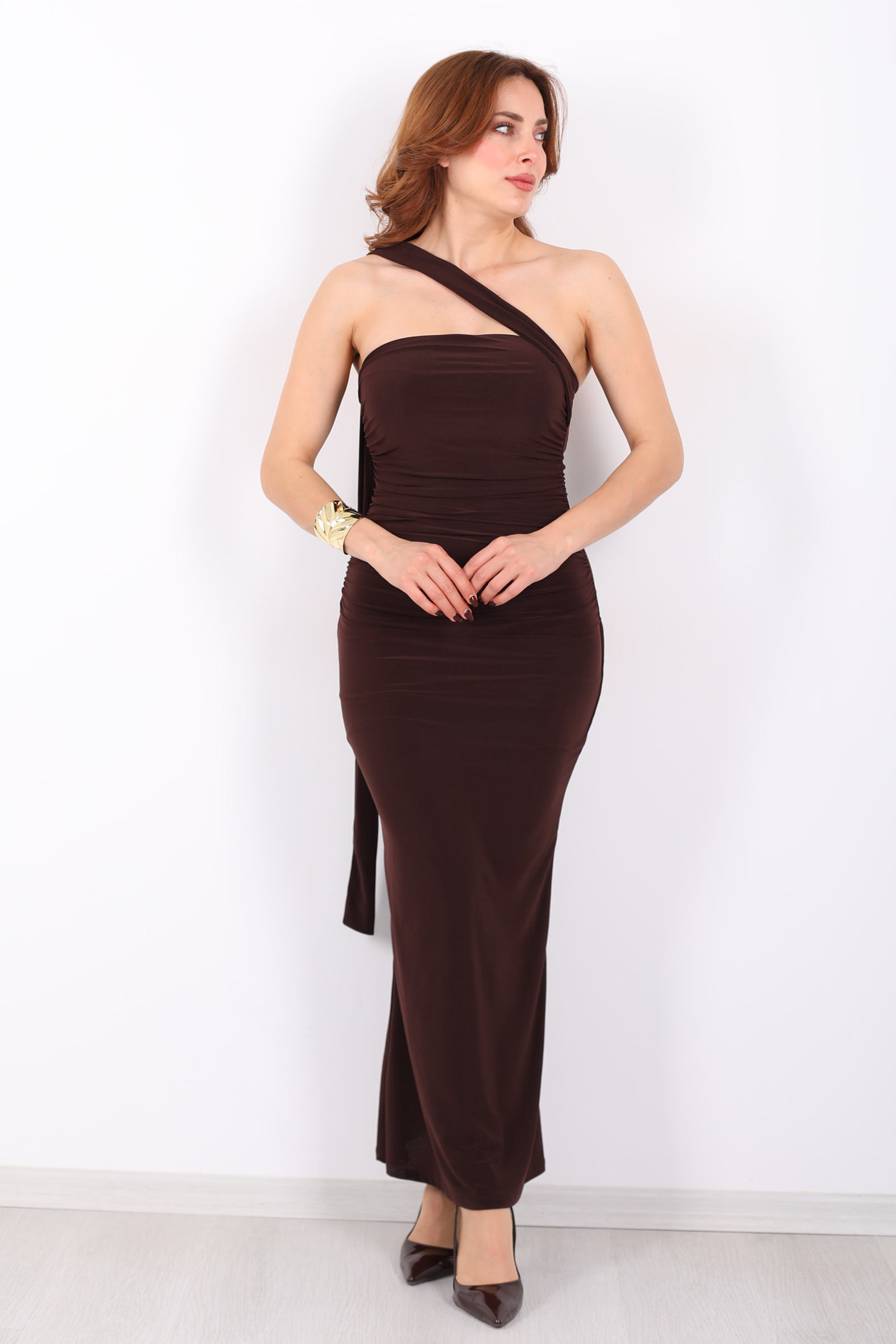 Kahverenginin sıcak tonlarını zarafetle buluşturan bu elbise, sadece bir kıyafet değil duygulara dokunan bir stil ifadesi. Straplez yaka kesimi, omuz ve kol çizgisini özgür bırakarak feminen bir duruş sağlar; drapeler ise kumaşı ince ince sarıp her adımda hafif bir ritim yaratır.Şal gibi düşen detaylar, elbiseyi klasik formların ötesine taşır ve sade hareketlenmeyi kıvrımlı bir estetikle buluşturur.Kahverengi ton, nötr ama derin bir karakter sunar.