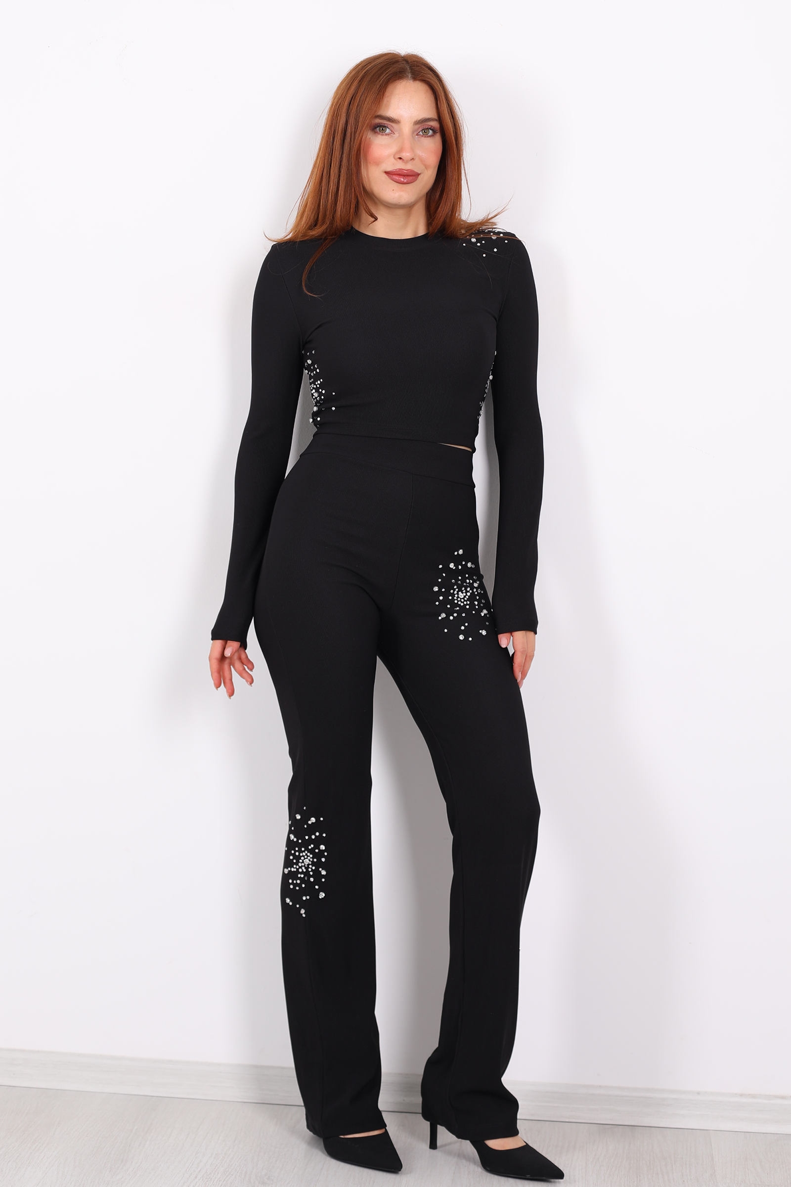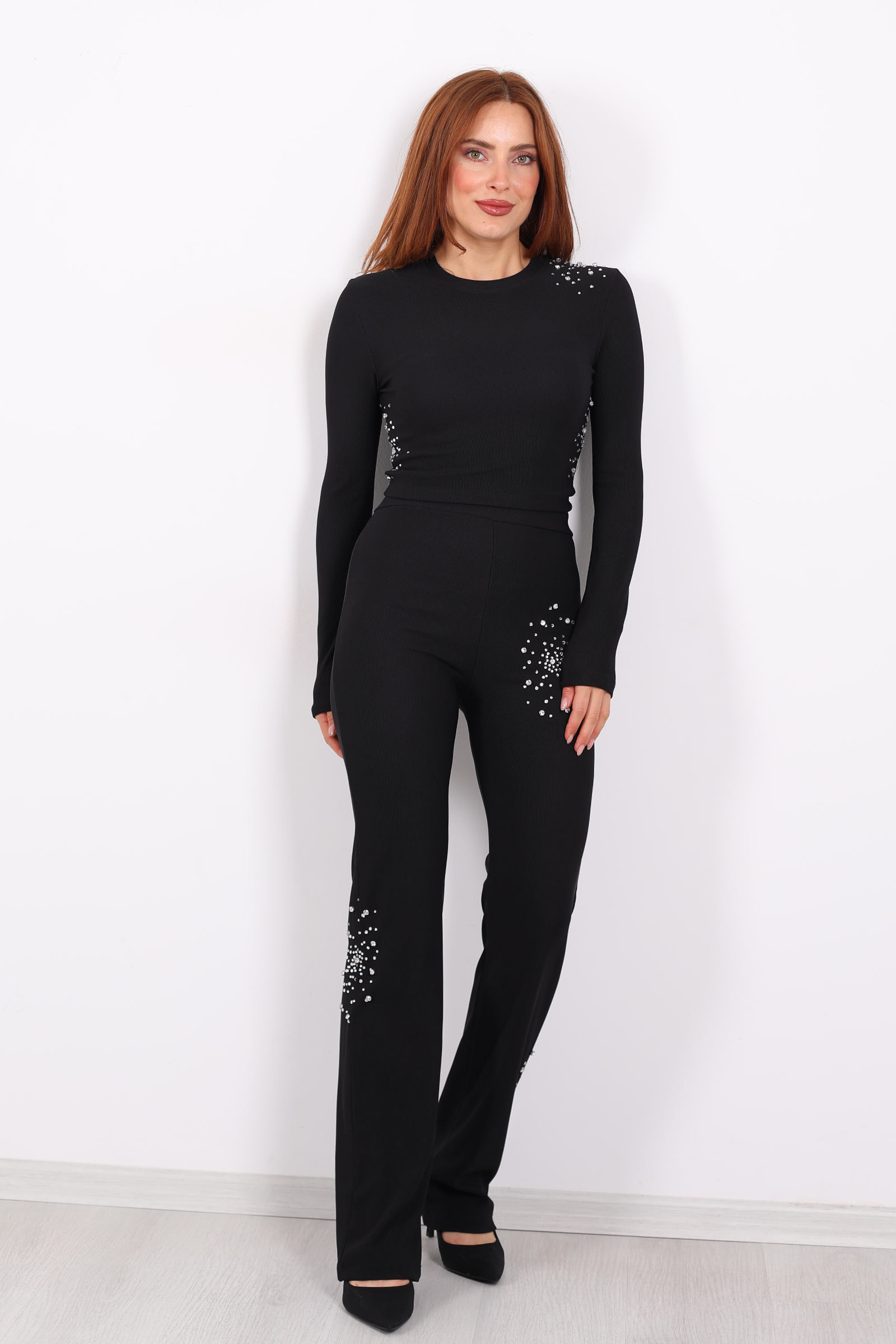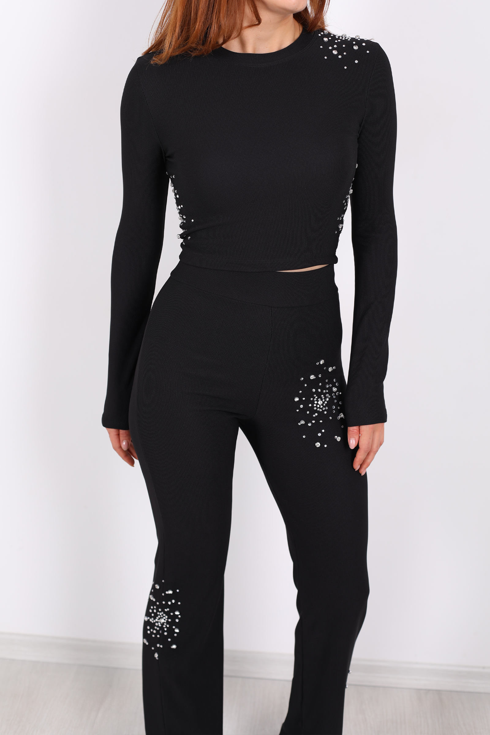 Siyahın gücünü ve zarafetini taşa dokunan detaylarla birleştiren bu Taş Aksesuarlı Ottoman Crop Takım, hem gece parıltısında hem gündüz şehir enerjisinde kendine özgü bir duruş yakalıyor. Ottoman kumaşın belirgin nervürlü (rib) dokusu, ekonomik duruşuyla takımın formunu korurken taş aksesuarlar parçaya anlık bir ışıltı kazandırıyor. Kalın ve tok yapısıyla da hem şık hem sağlam bir hissiyat sunar.