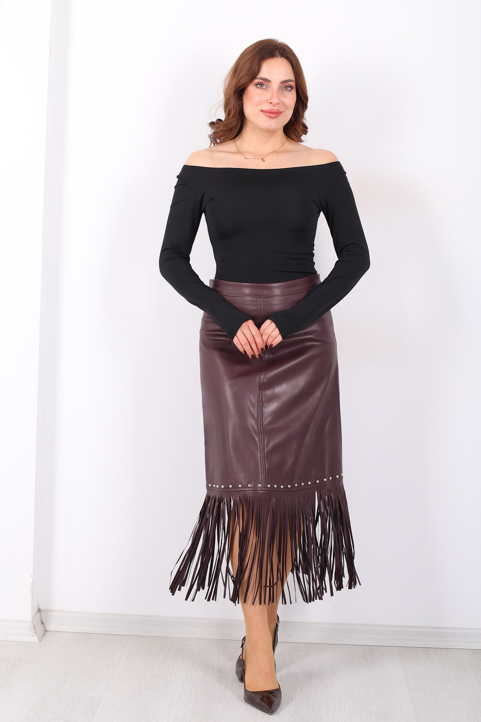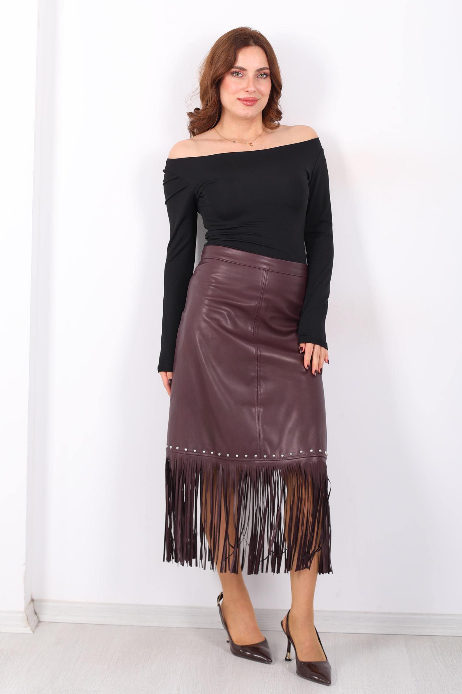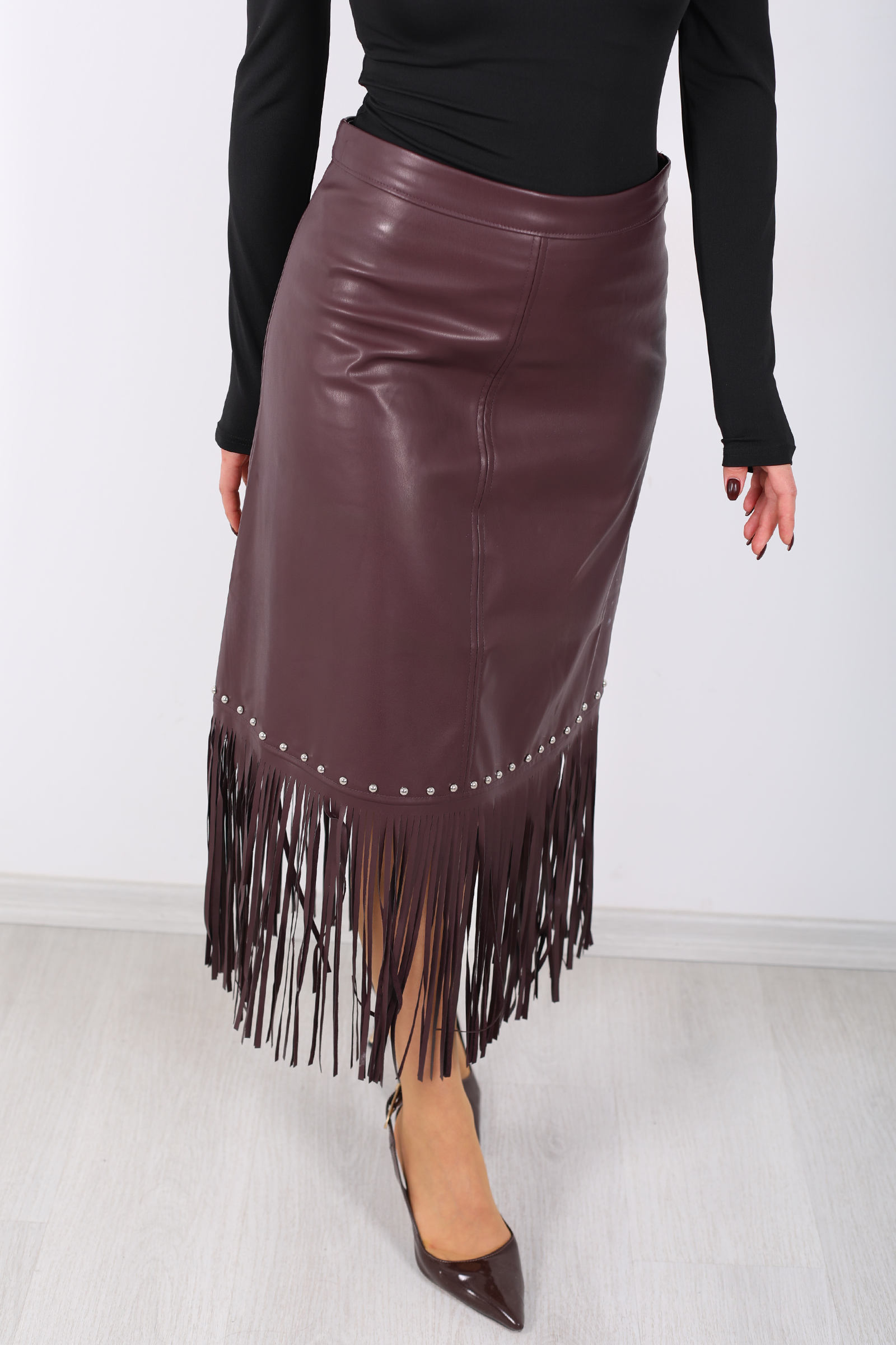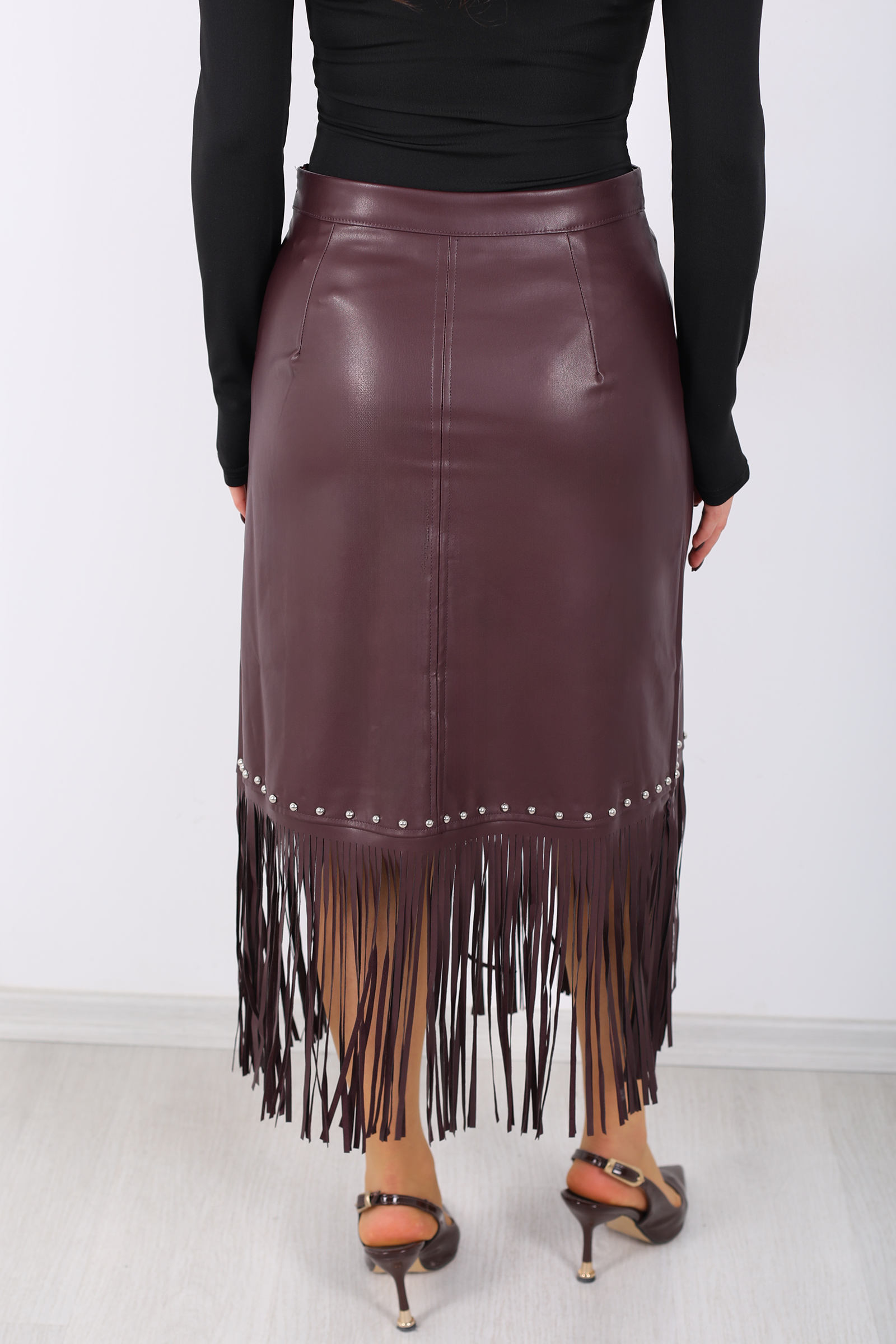 Taş Detaylı Püsküllü Mürdüm Kadın Uzun Deri Etek