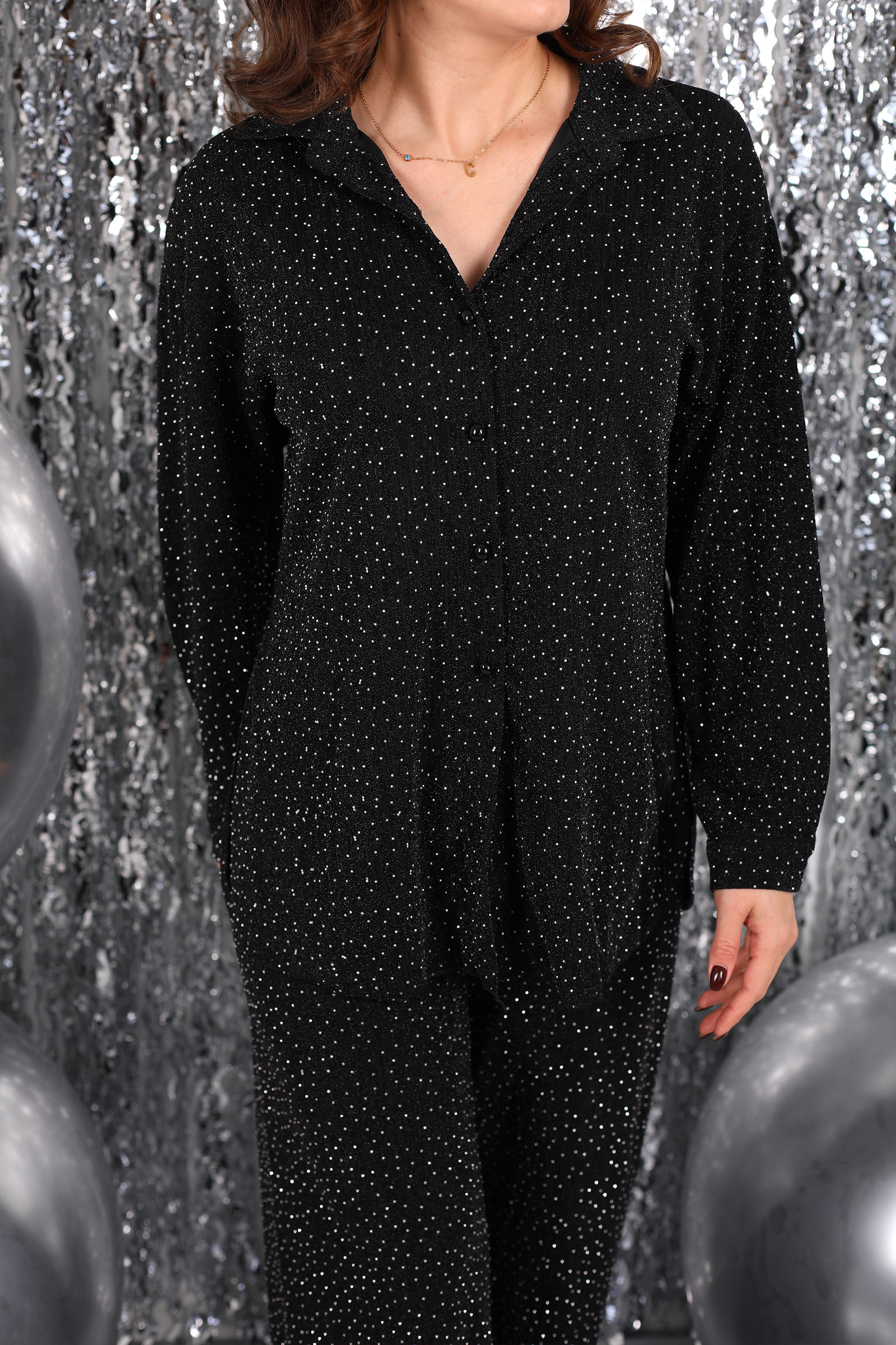 Taş İşlemeli Gömlek-Pantolon Siyah Kadın Salaş Takım