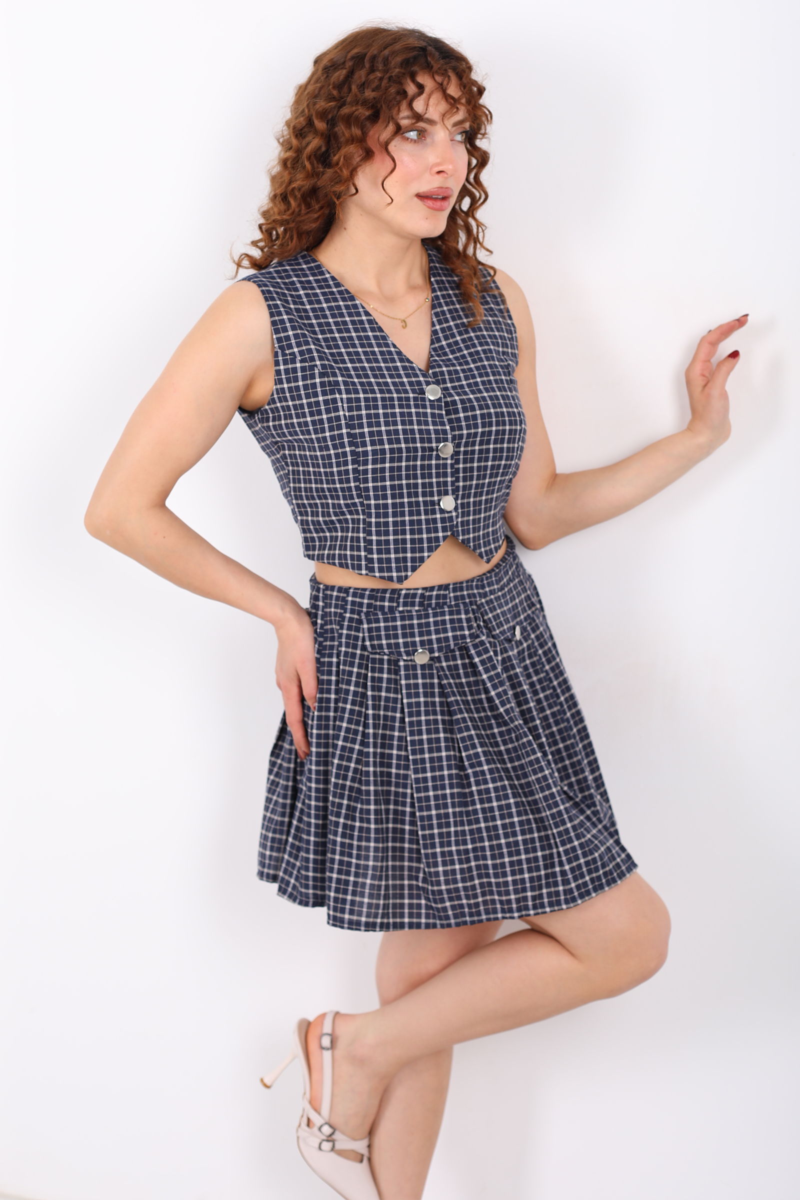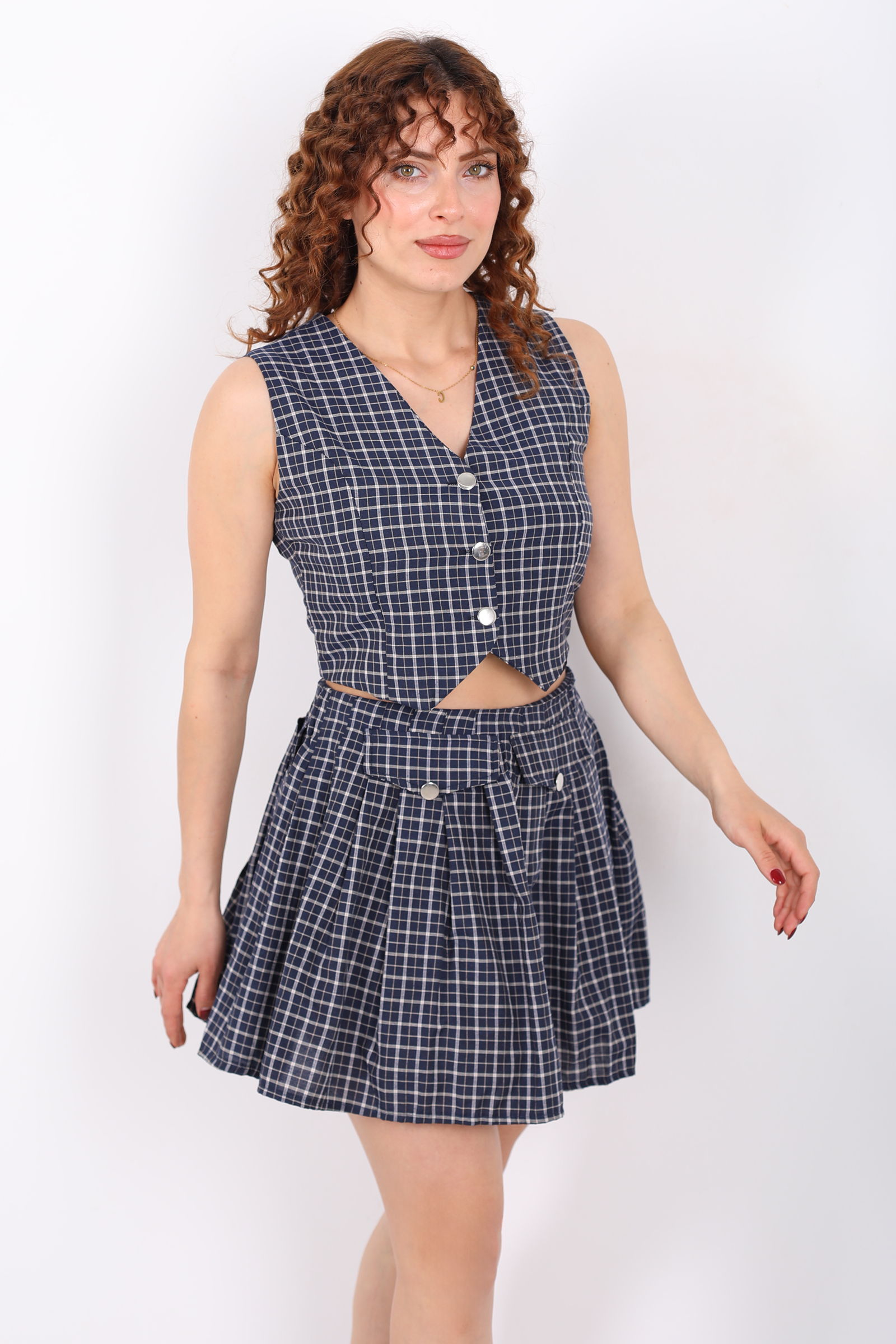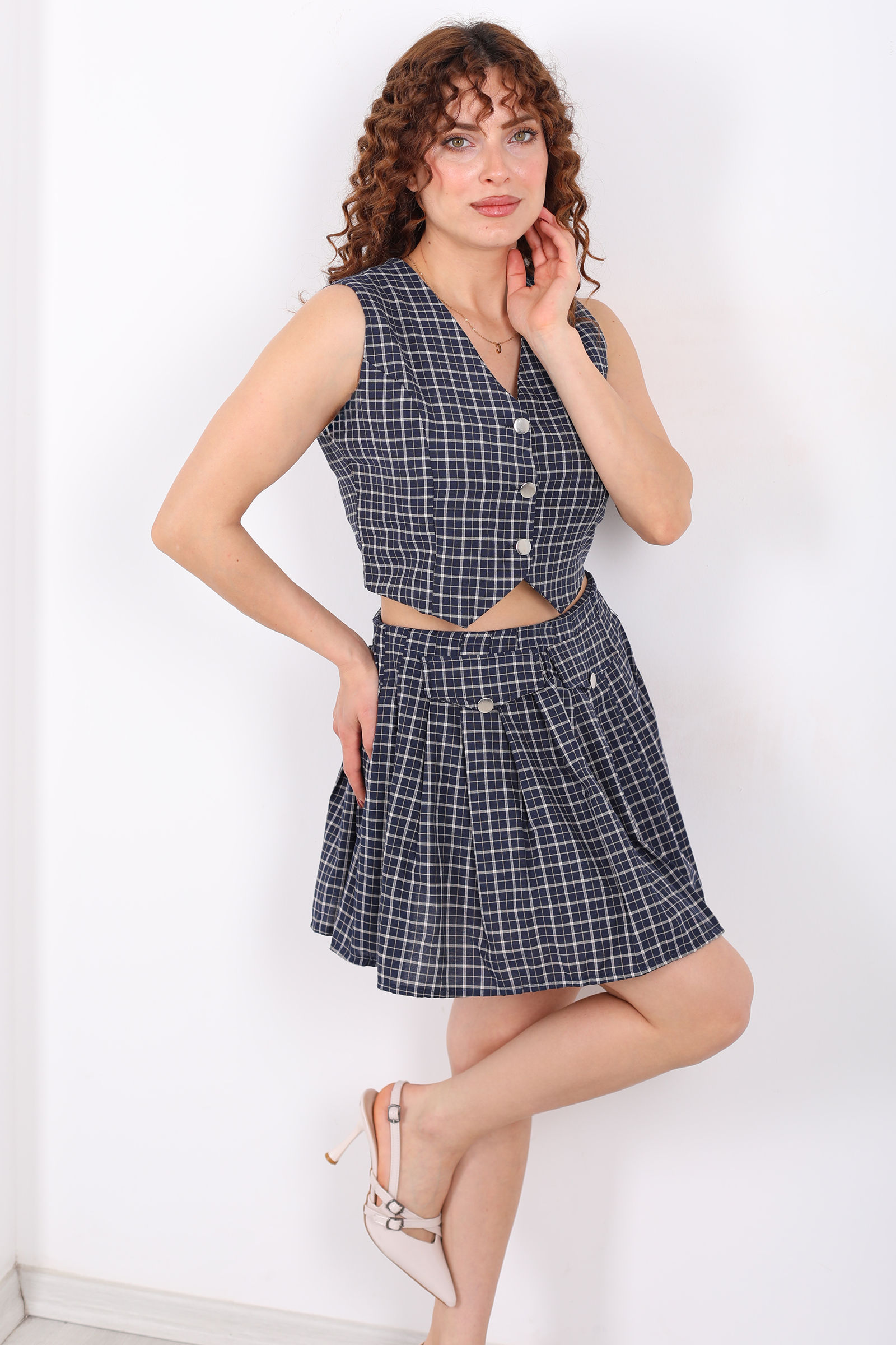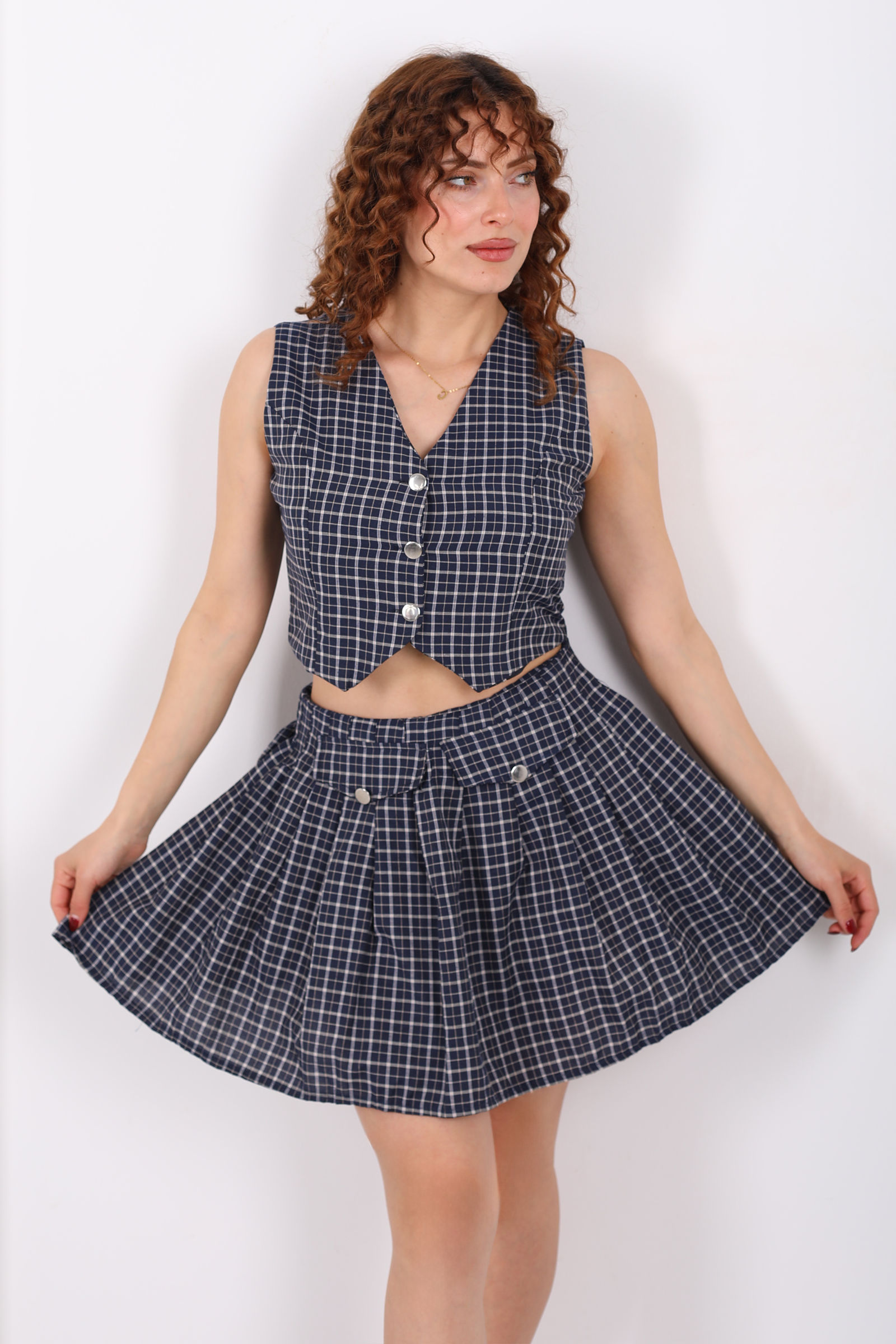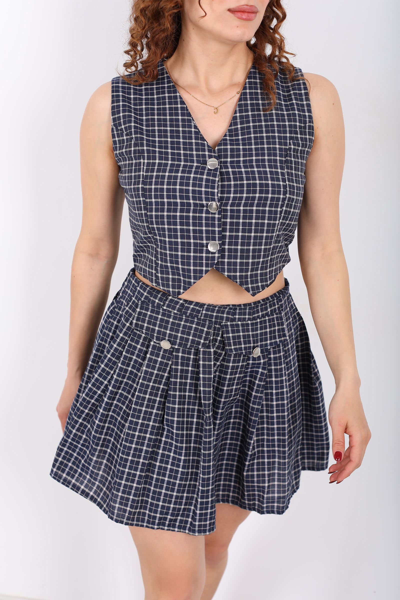 Tasarım Ekose Desenli Kadın Lacivert Mini Etek- Yelek Takım