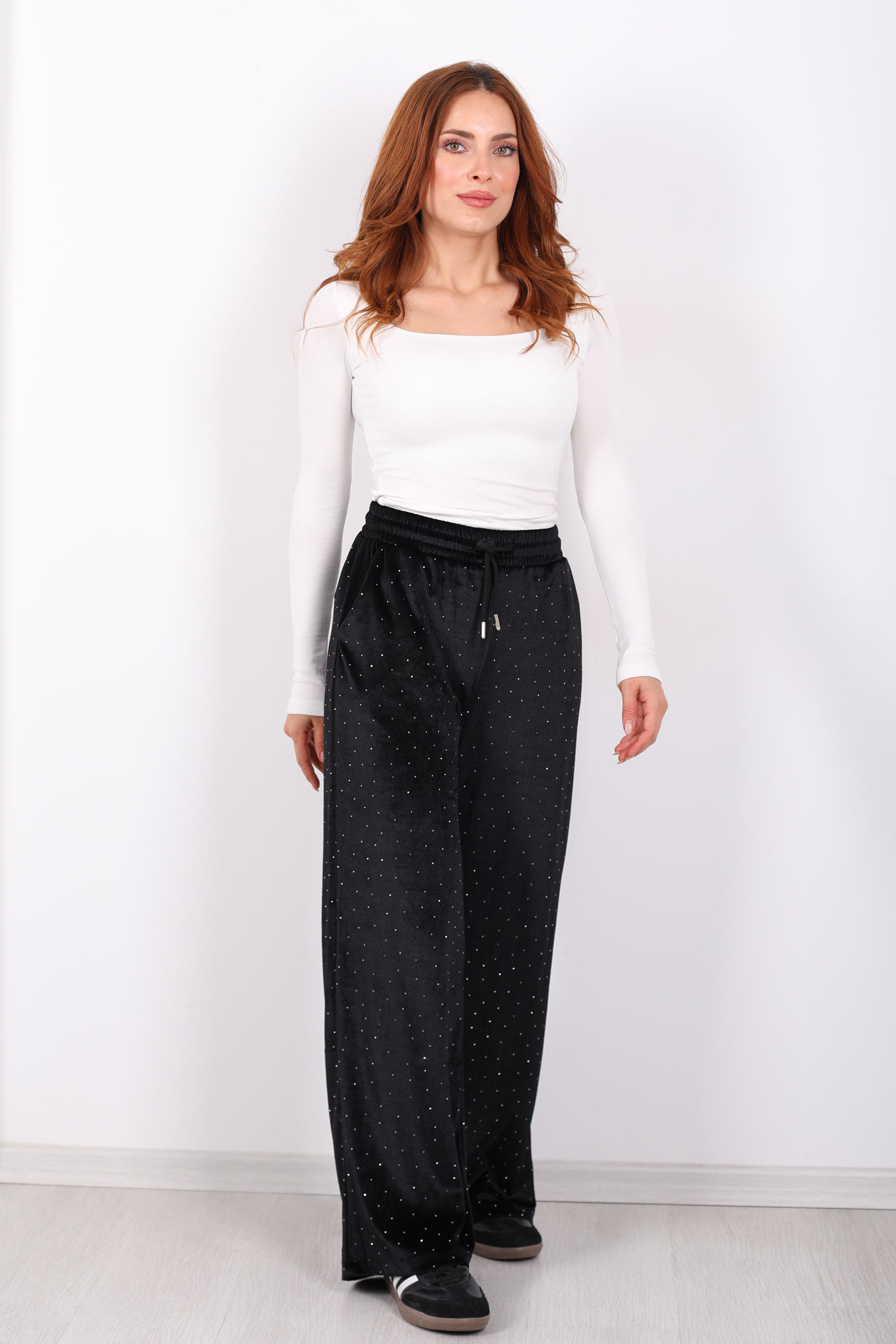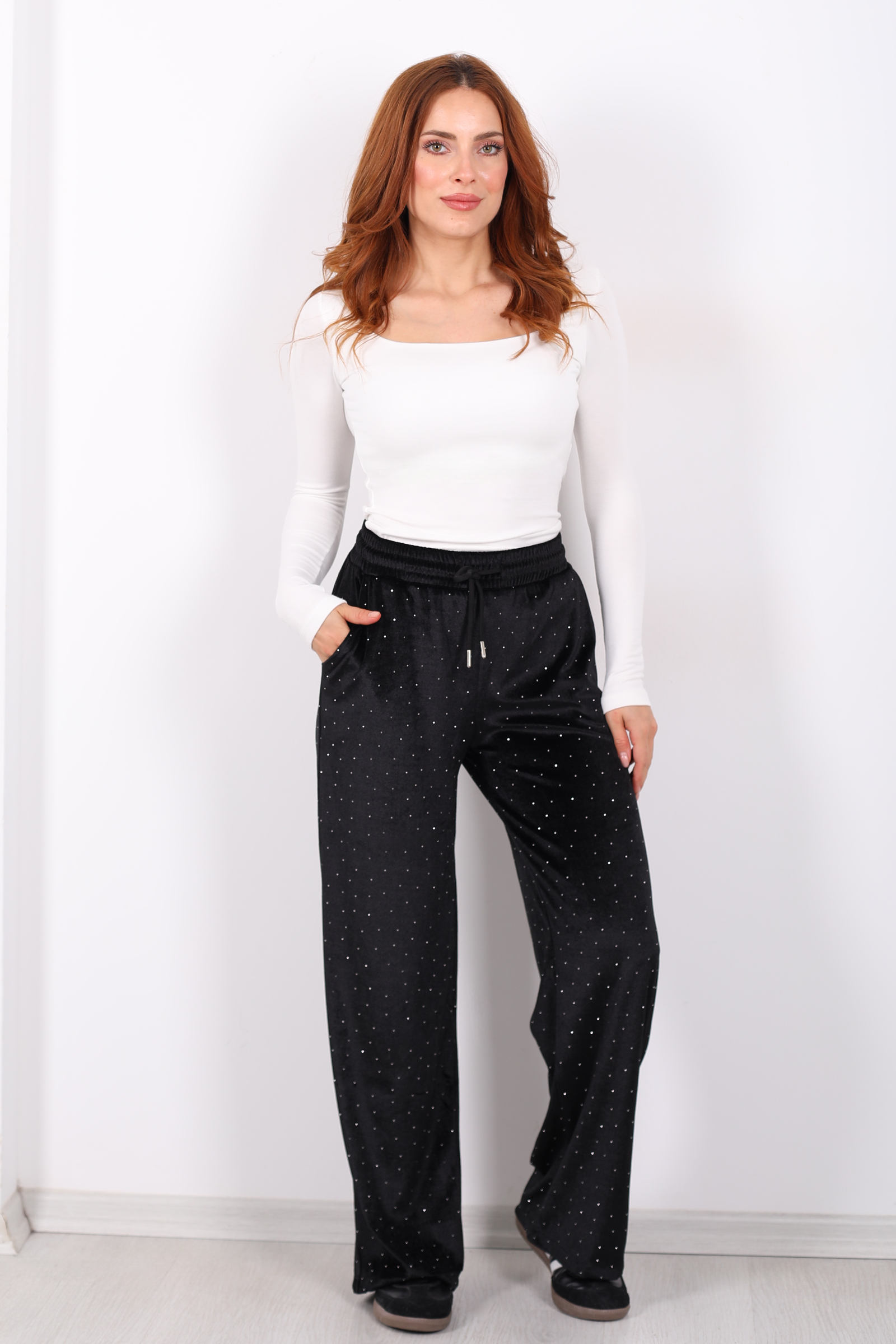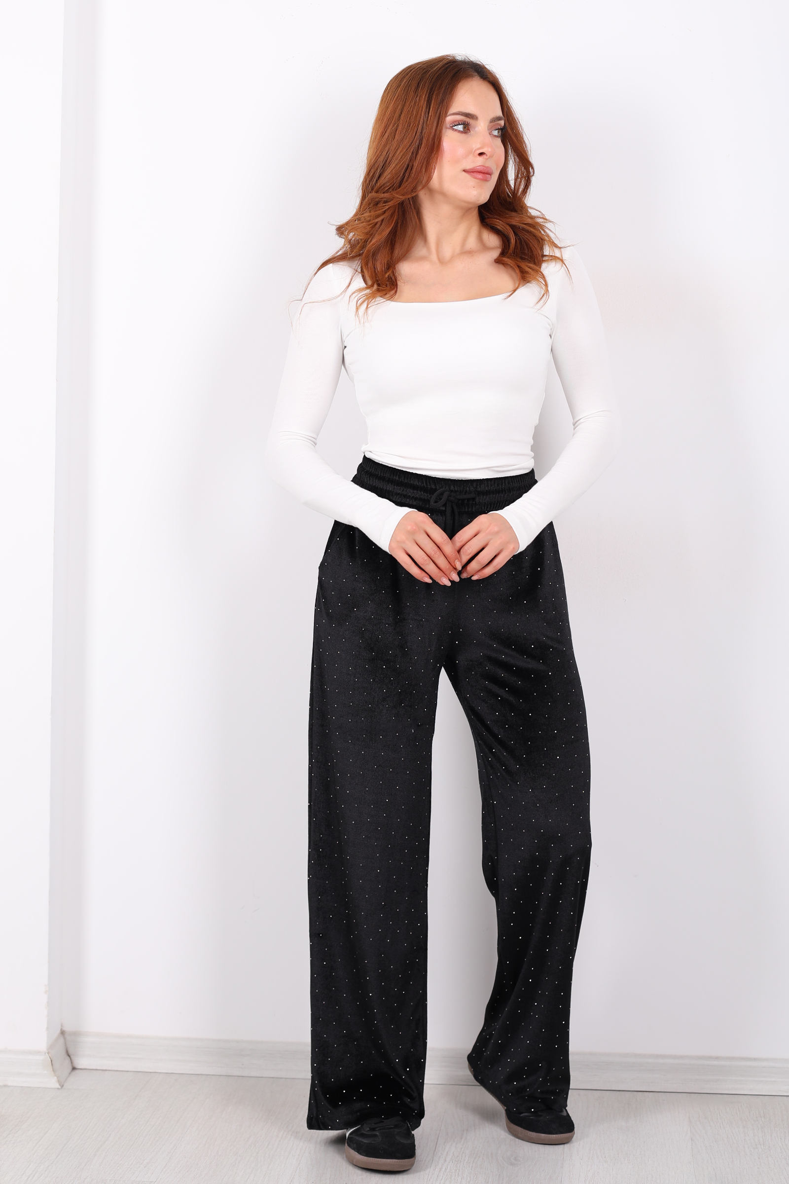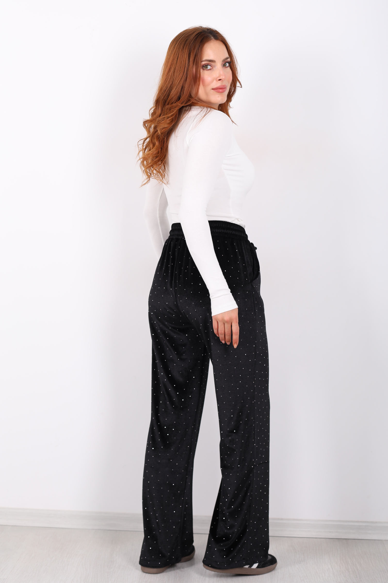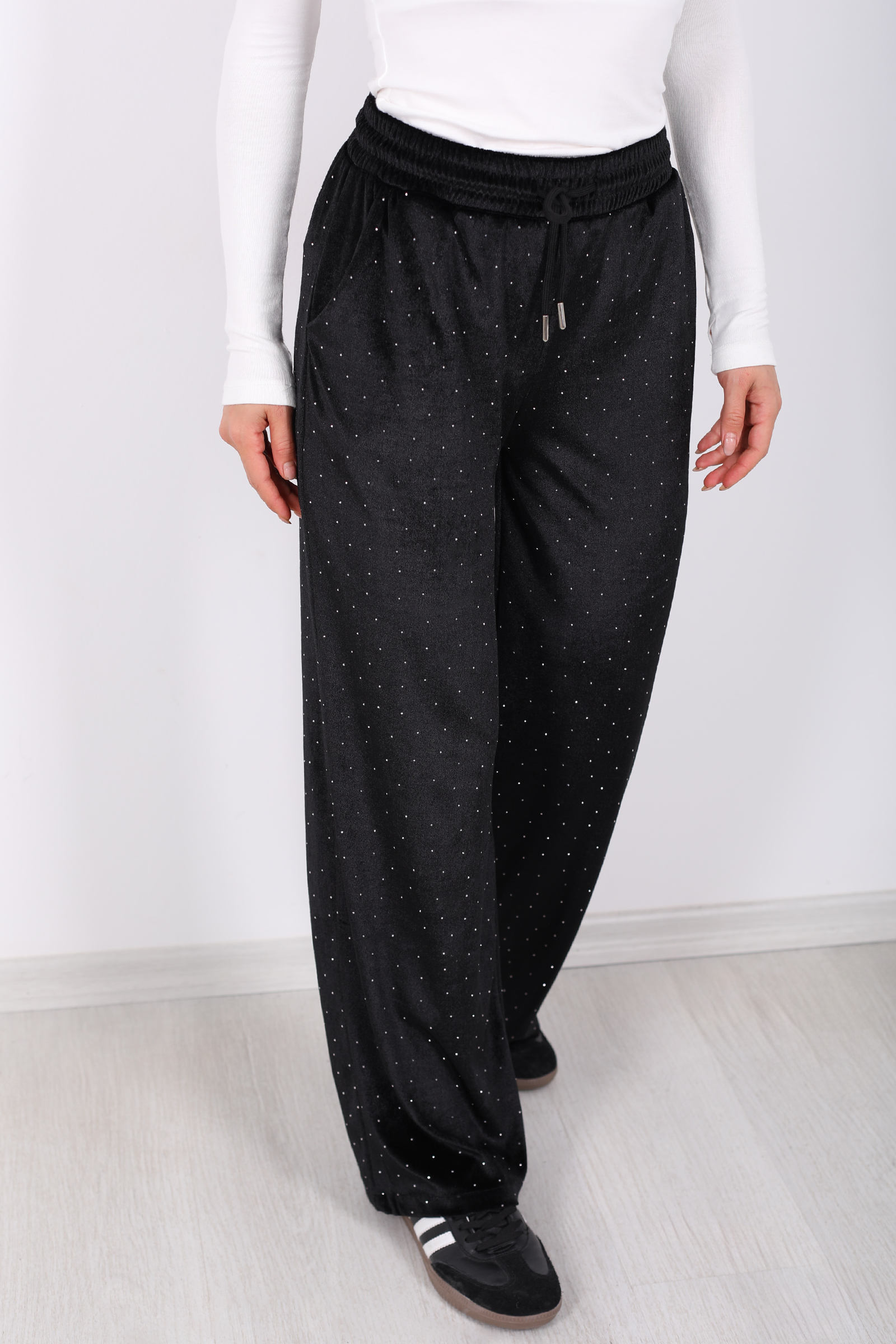 Taşlı Bol Paça Siyah Kadın Kadife Pantolon