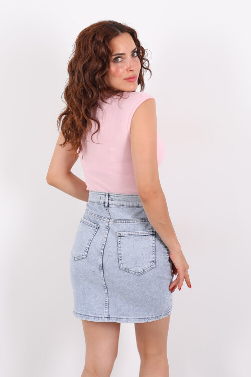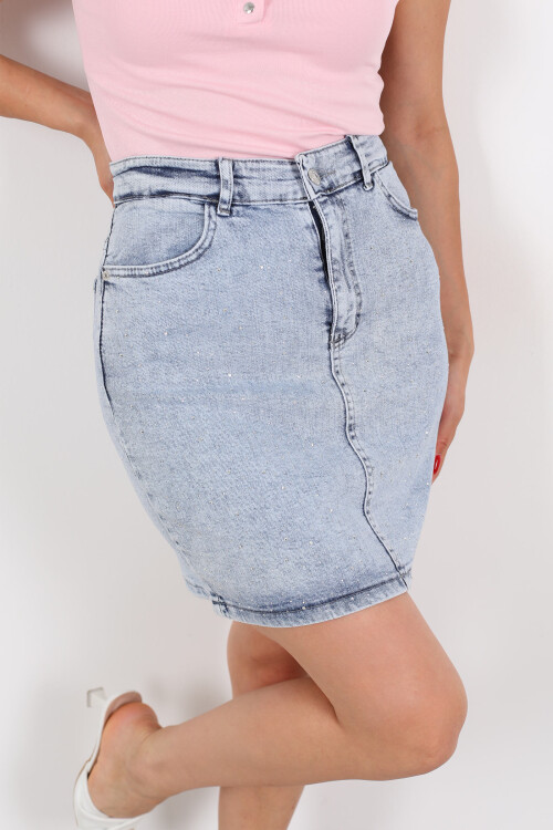Mavi tonlarının zarifliğini ve taş detaylarının ışıltısını bir araya getiren bu kot etek, stilinize modern bir dokunuş katıyor. Mini boyu, bacak boyunuzu uzun gösterirken, taş işlemeleriyle zarif bir ışıltı sunar. Karyıkama tekniğiyle elde edilen yıkama efekti, pantolona vintage bir hava katarken, taş işlemeleriyle zarif bir ışıltı sunar. %100 pamuklu denim kumaşı, dayanıklı ve nefes alabilir yapısıyla konforlu bir kullanım sağlar. Normal kalıp kesimi sayesinde rahat hareket imkanı sunar. Ürün boyu 41 cm olup, 36 bedene göre ölçülmüştür.