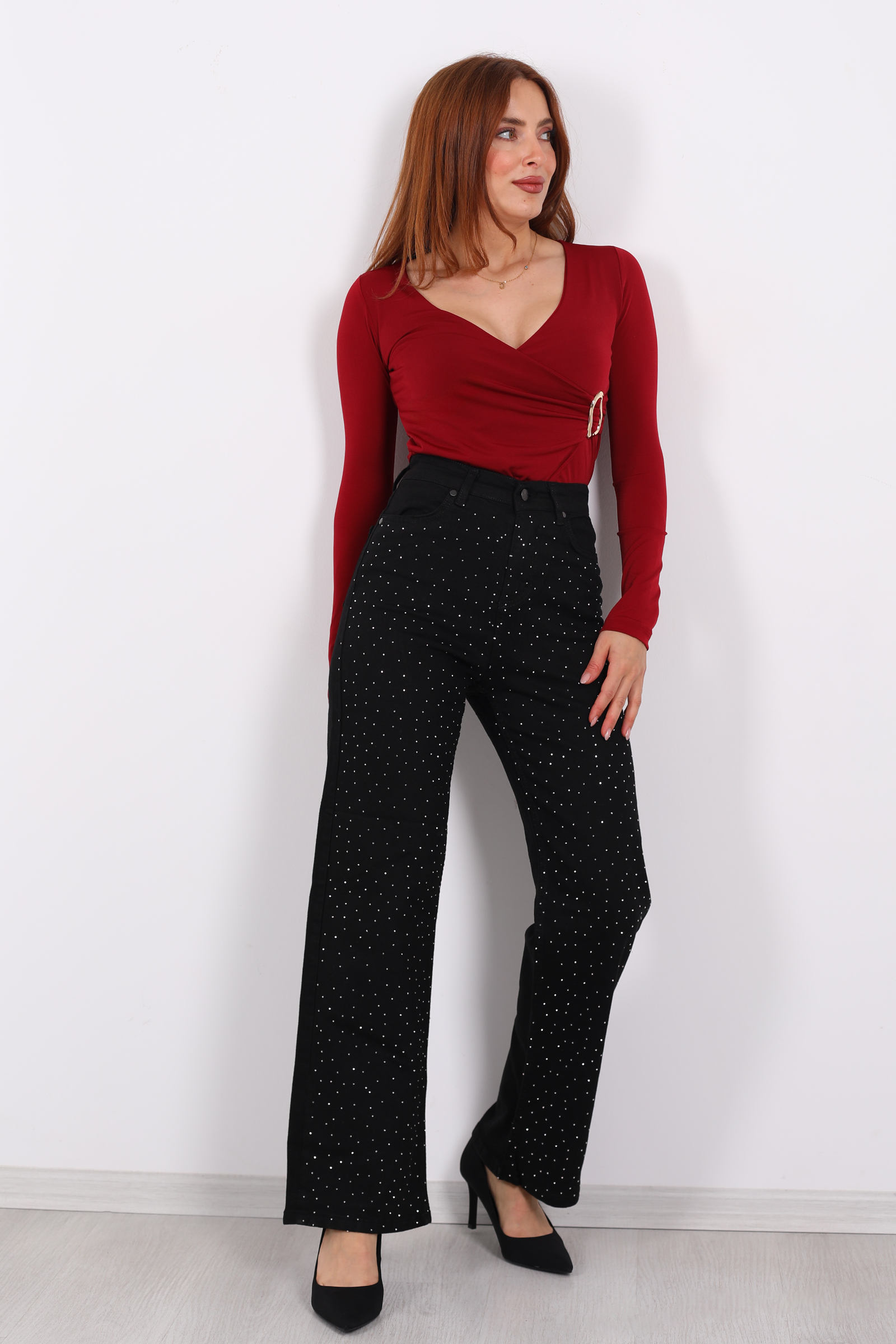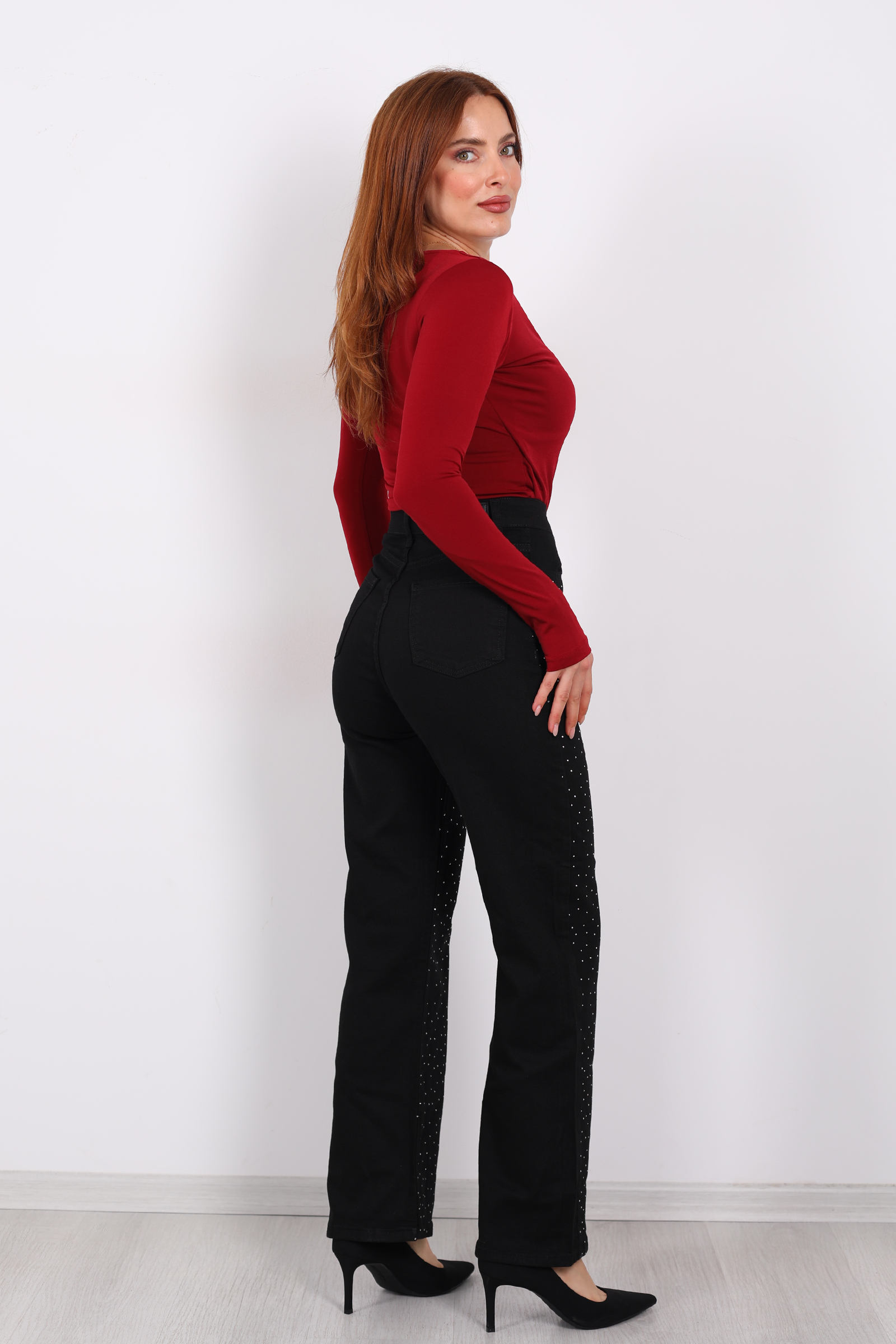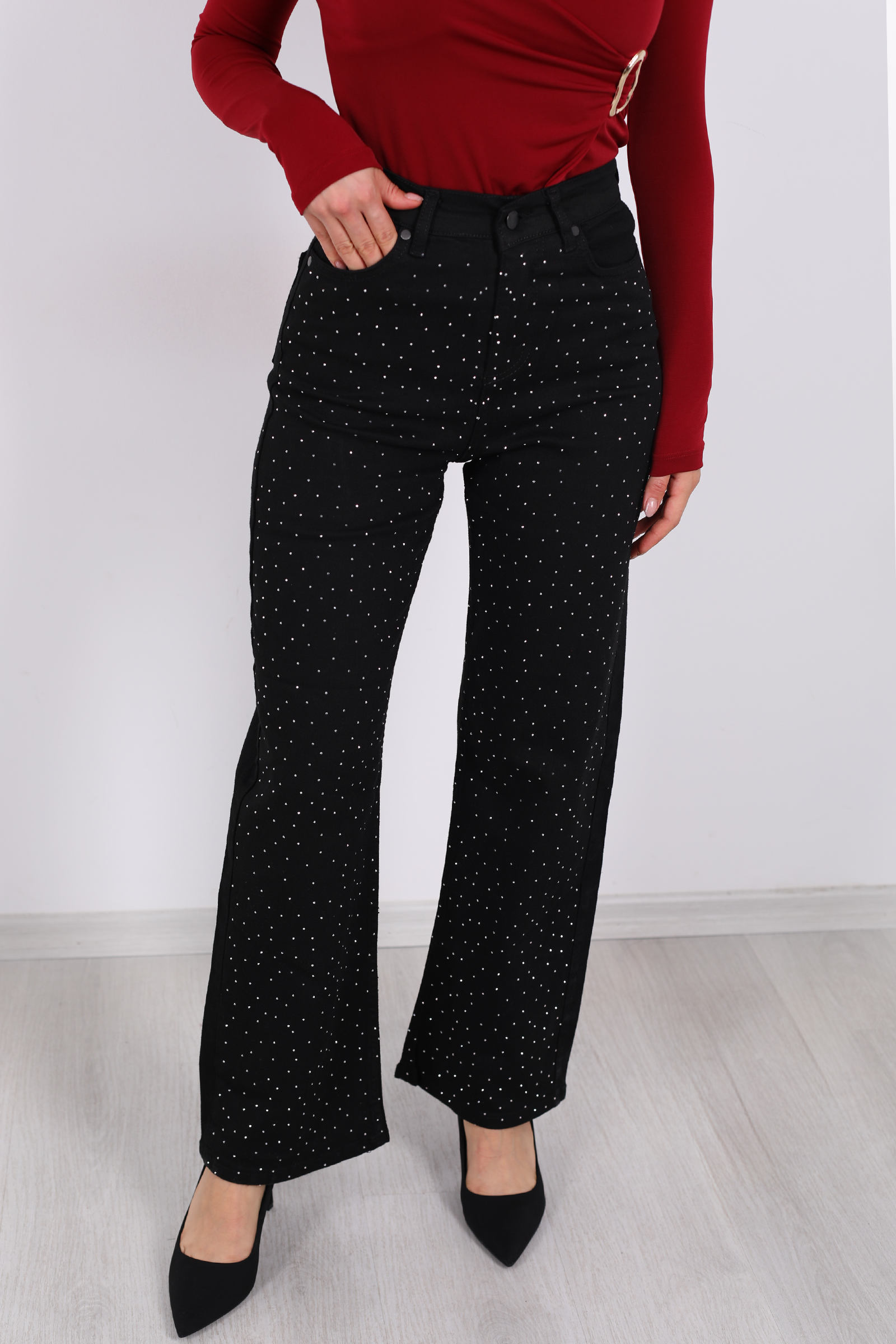 Parlak taş detaylarıyla süslenmiş siyah palazzo kot pantolon, hem feminen hem asi bir duruş yakalamanızı sağlıyor. Bol paçalarıyla retro bir hava taşırken, taş süslemeleriyle göz alıcı ve şık bir stil sunuyor.Dayanıklı siyah kot kumaşından üretilmiş; sağlam dokusu sayesinde uzun süreli kullanım için ideal.Derin siyah zemin, taşların ışıltısını vurgular ve hem gündüz hem gece kombinlerinde güçlü bir temel oluşturur.