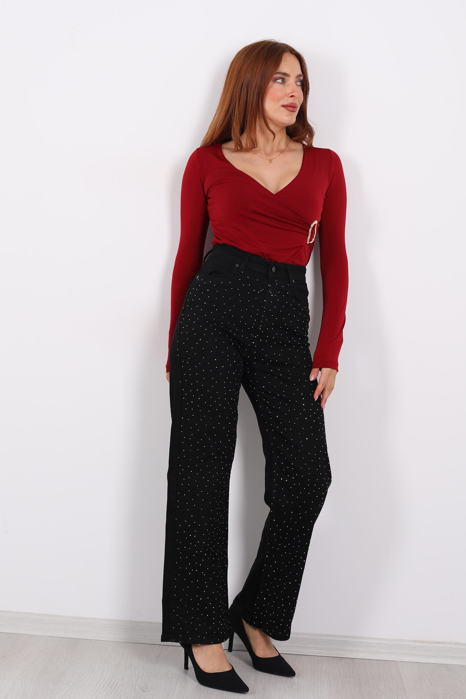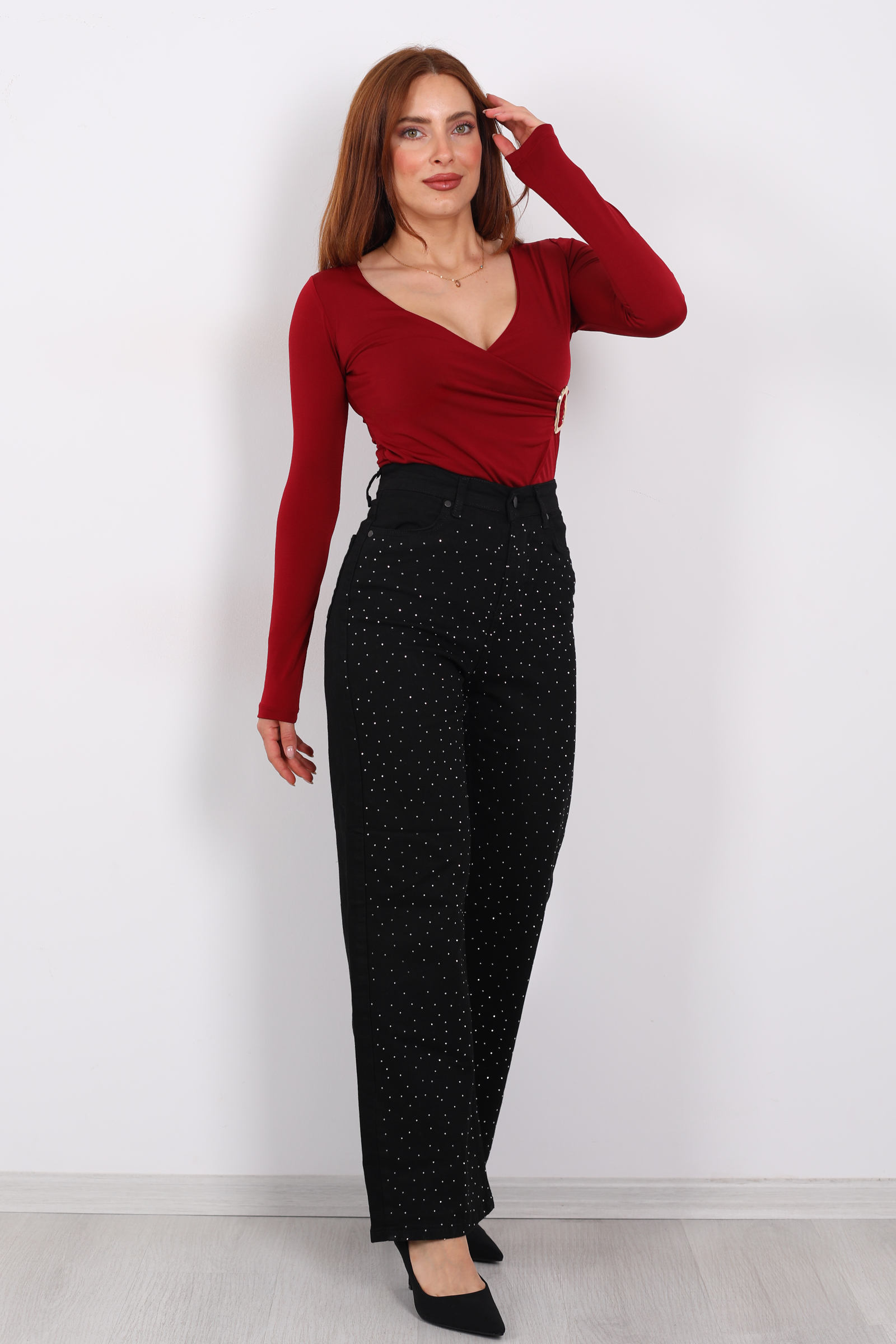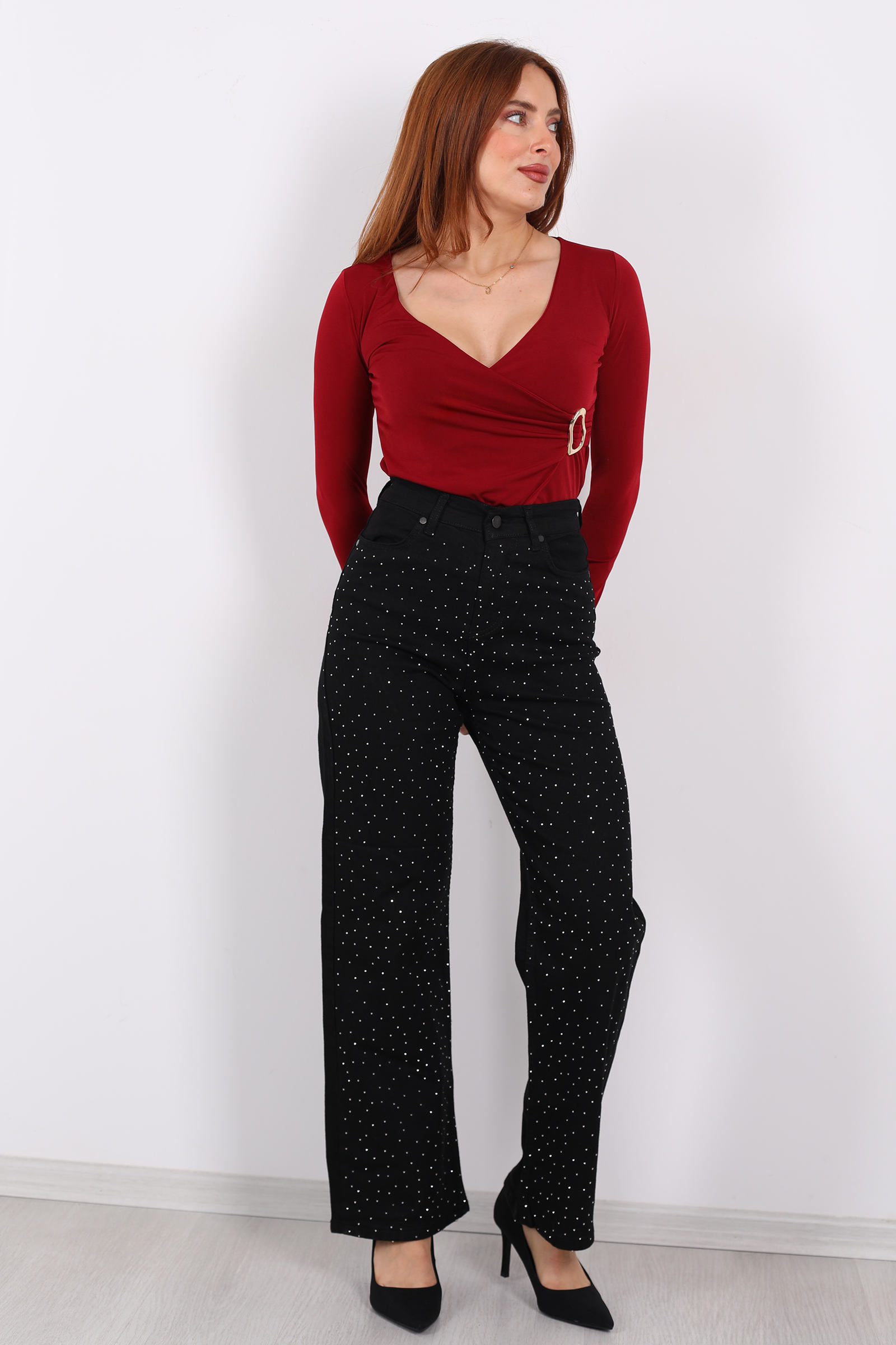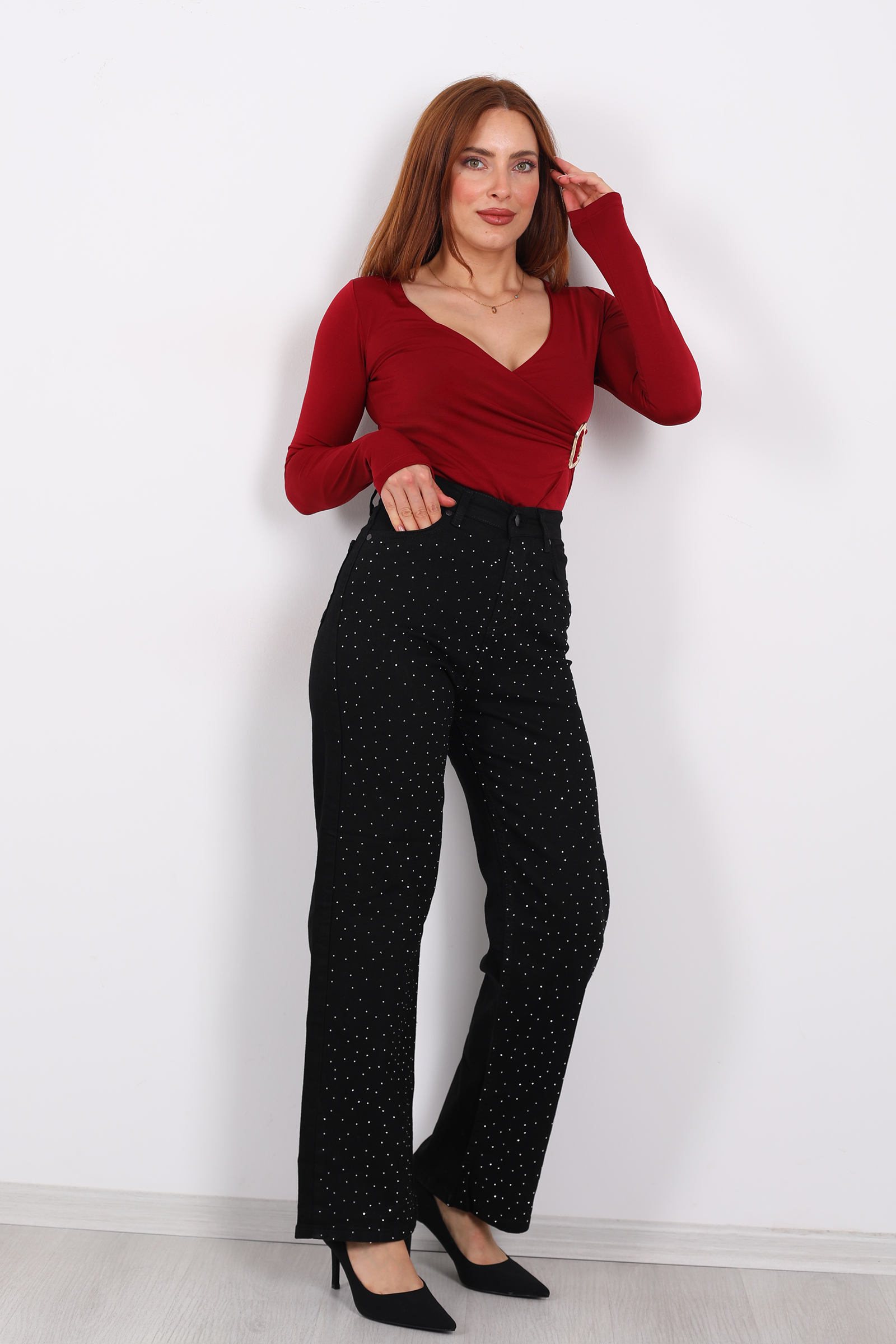 Parlak taş detaylarıyla süslenmiş siyah palazzo kot pantolon, hem feminen hem asi bir duruş yakalamanızı sağlıyor. Bol paçalarıyla retro bir hava taşırken, taş süslemeleriyle göz alıcı ve şık bir stil sunuyor.Dayanıklı siyah kot kumaşından üretilmiş; sağlam dokusu sayesinde uzun süreli kullanım için ideal.Derin siyah zemin, taşların ışıltısını vurgular ve hem gündüz hem gece kombinlerinde güçlü bir temel oluşturur.