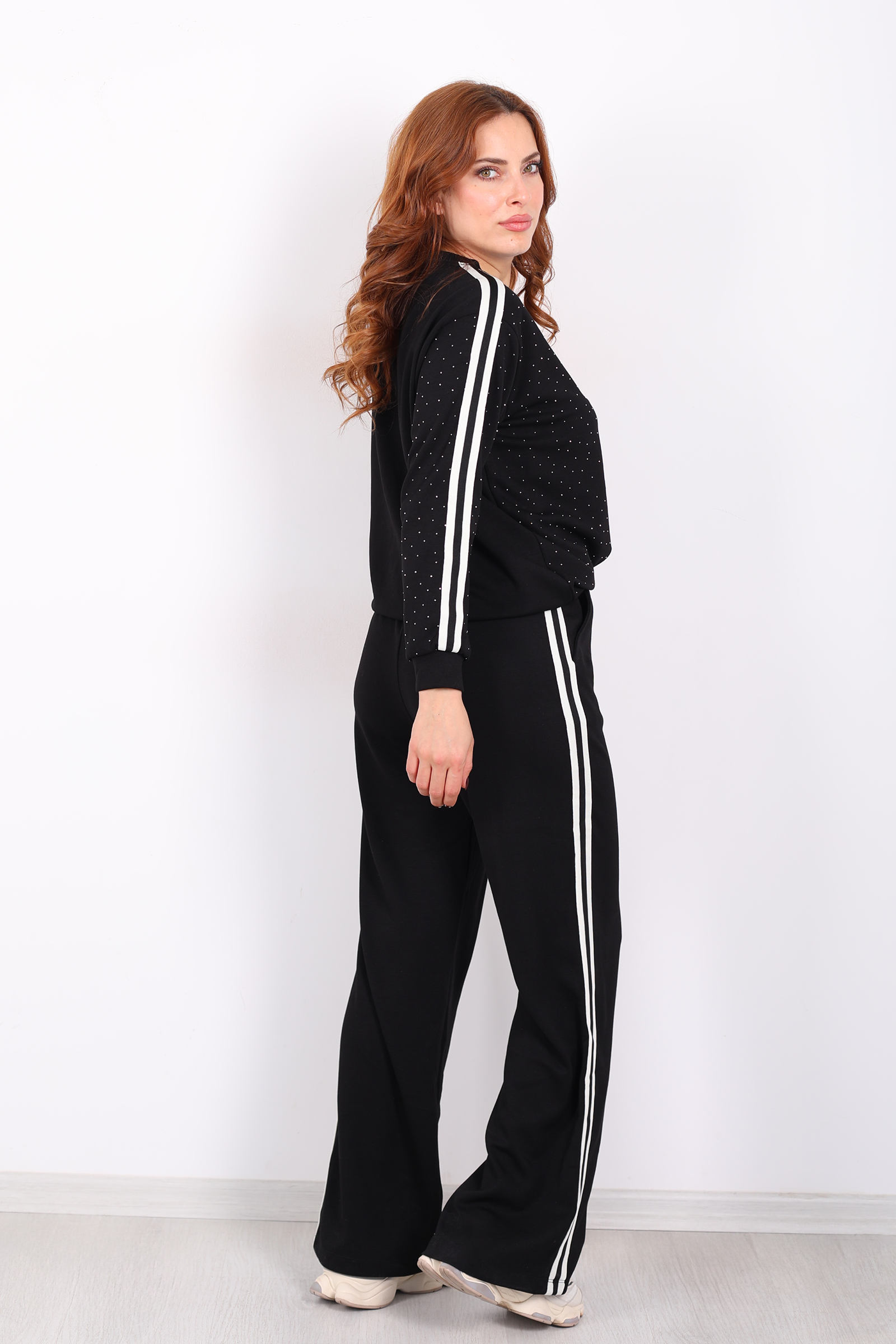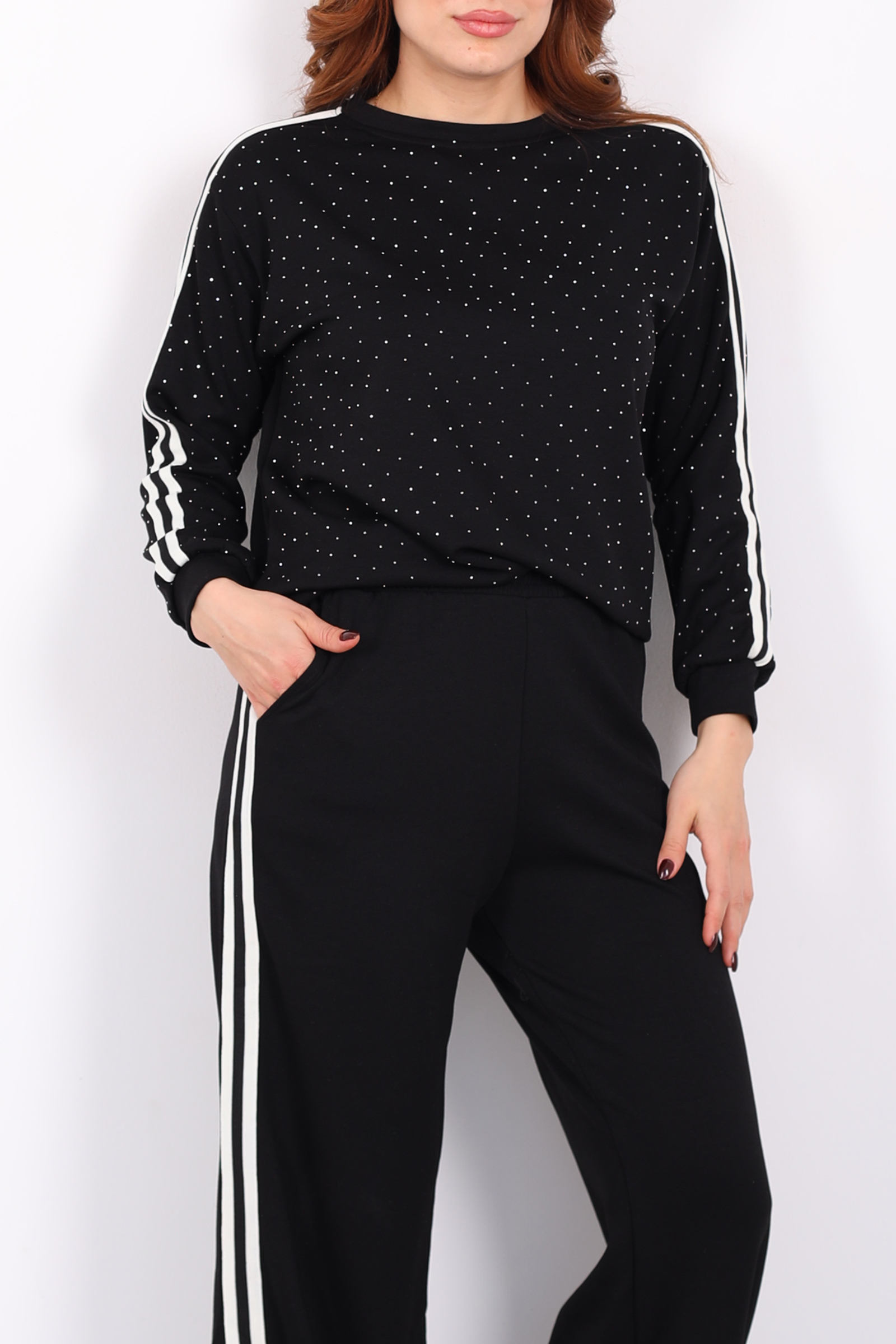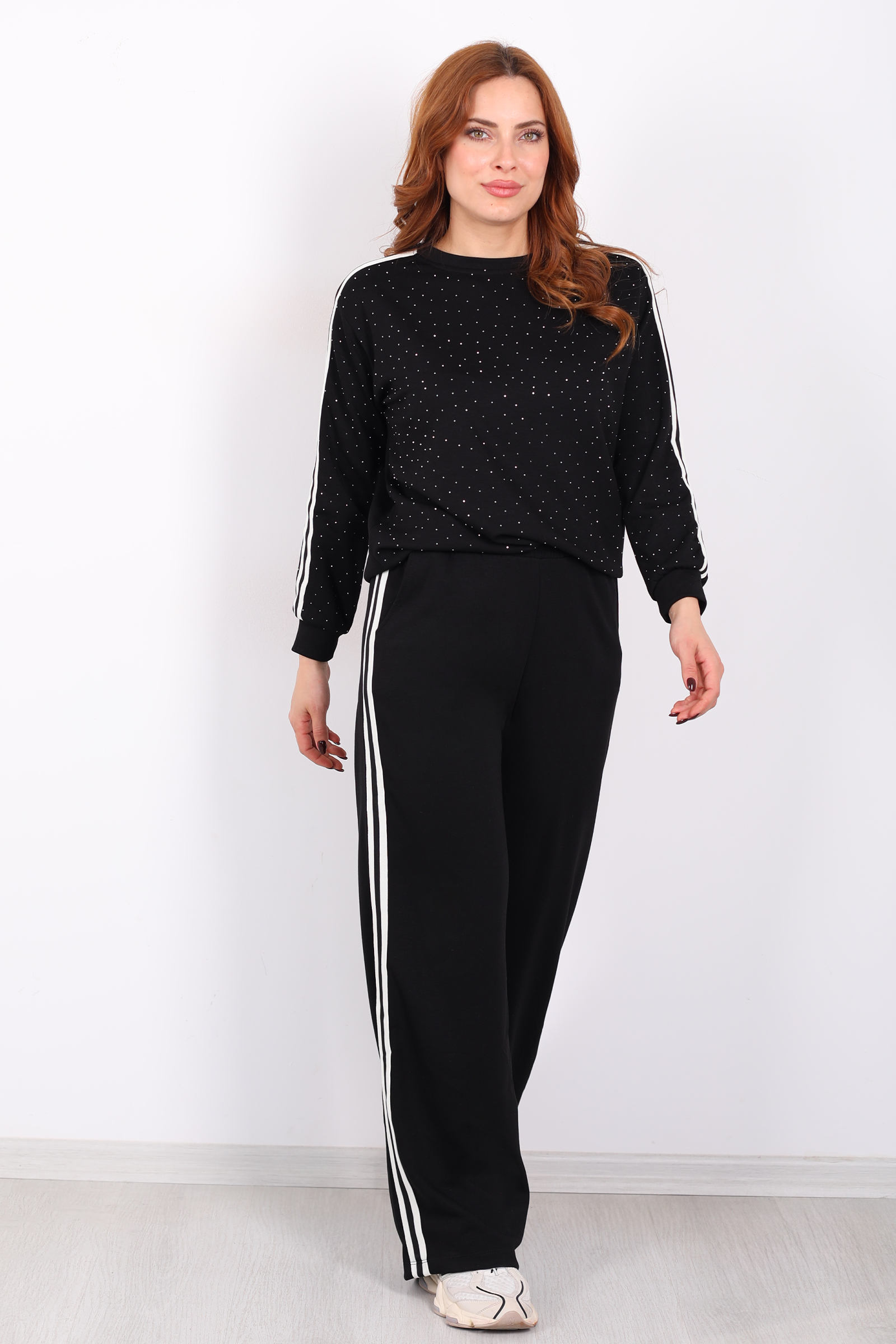 Taşlı Şerit Detaylı Kadın Siyah Takım
