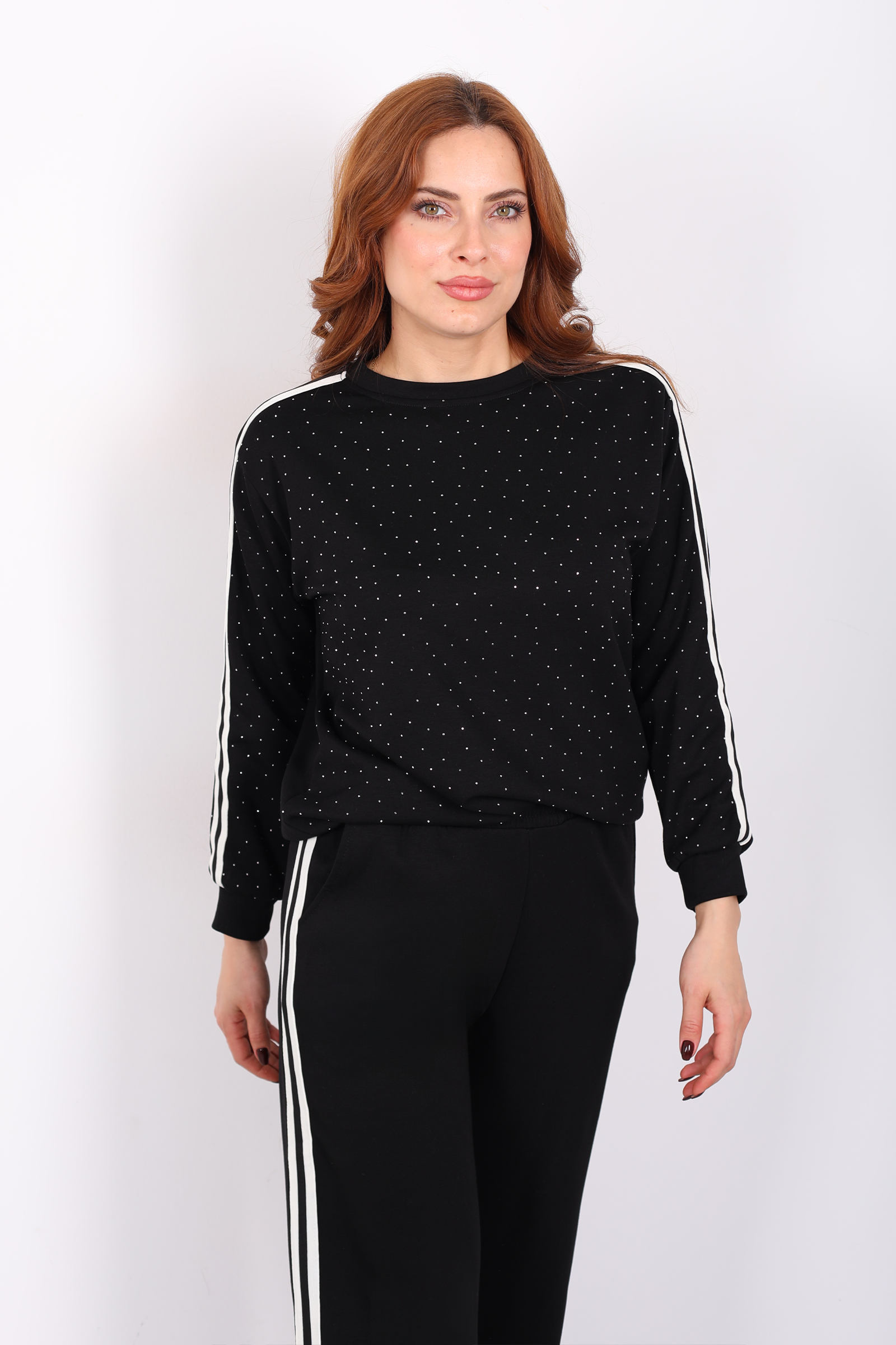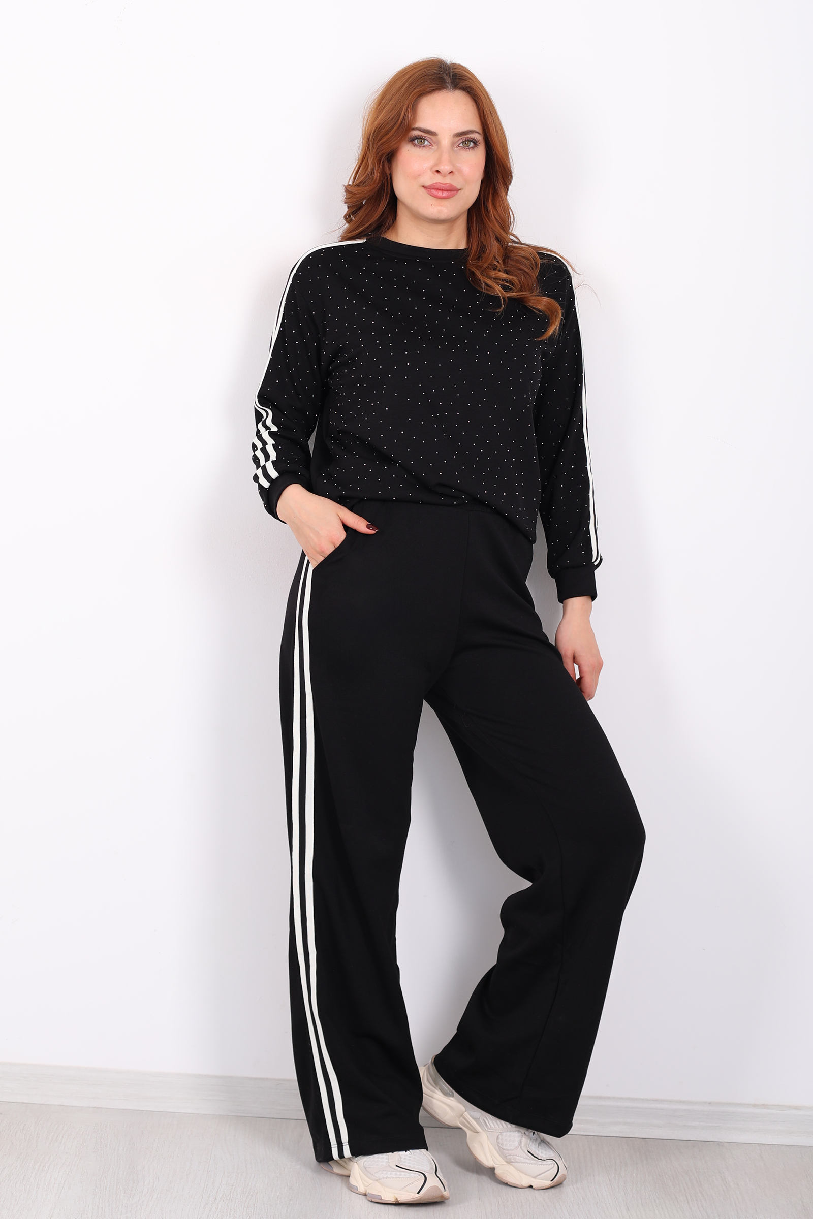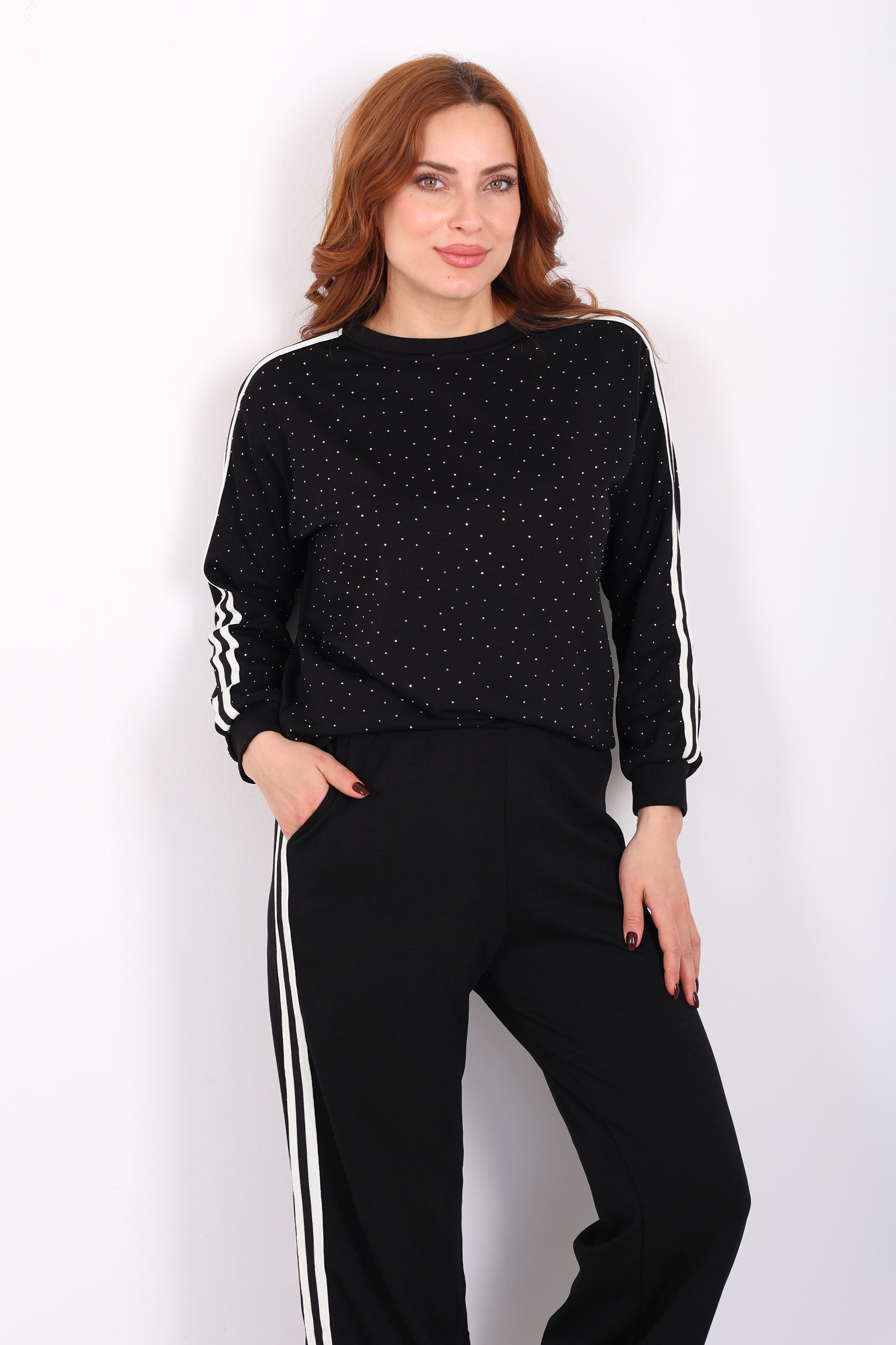 Taşlı Şerit Detaylı Kadın Siyah Takım