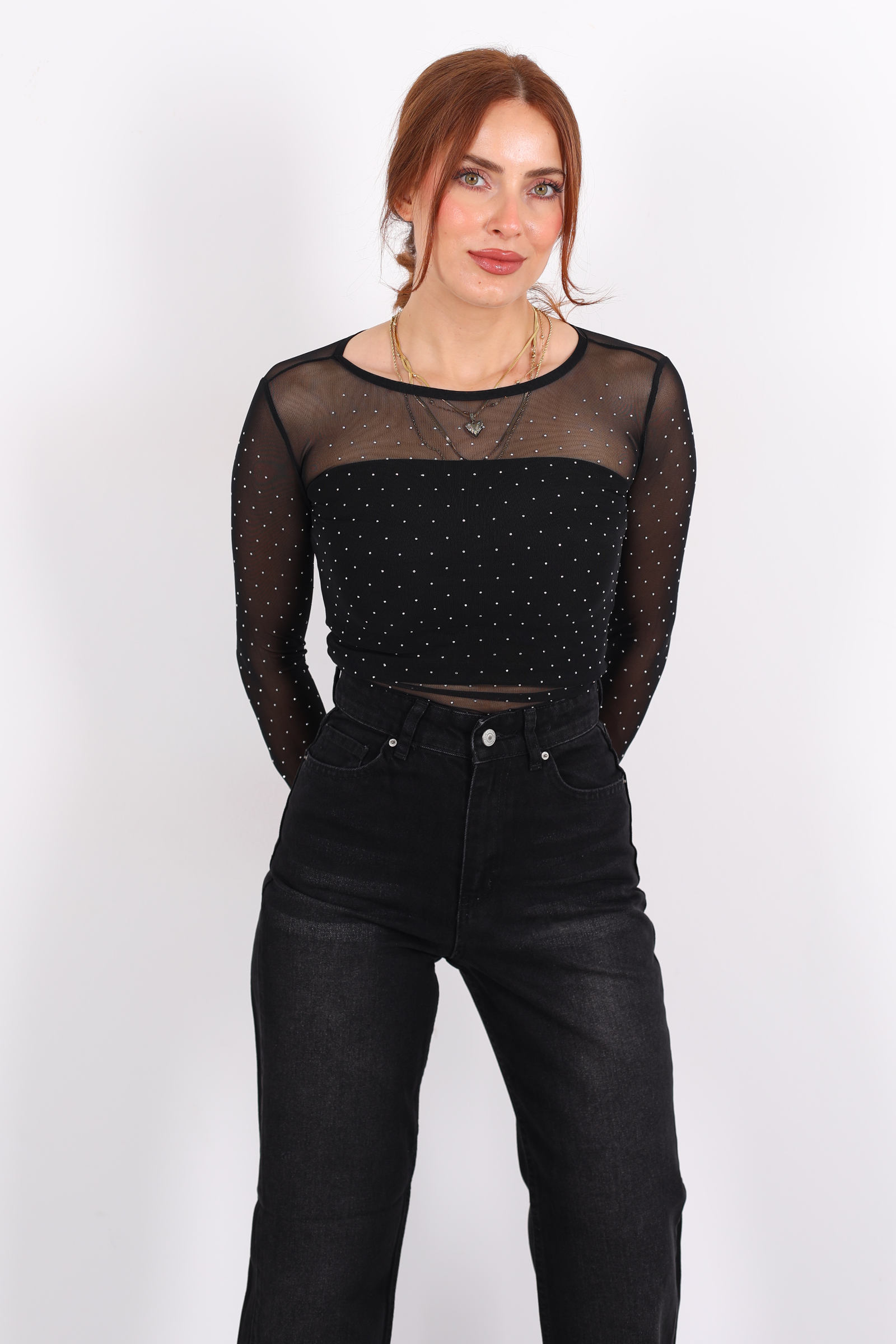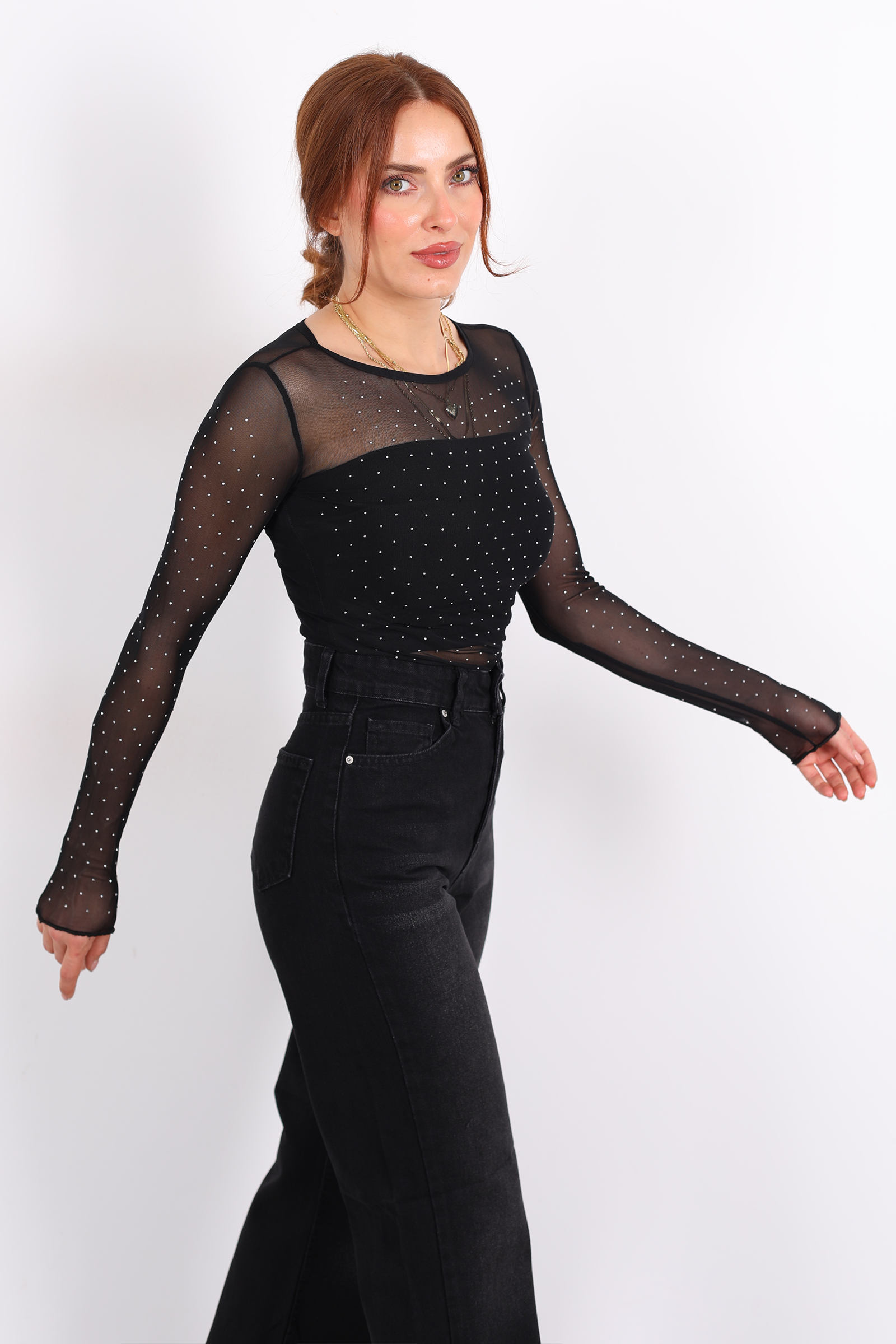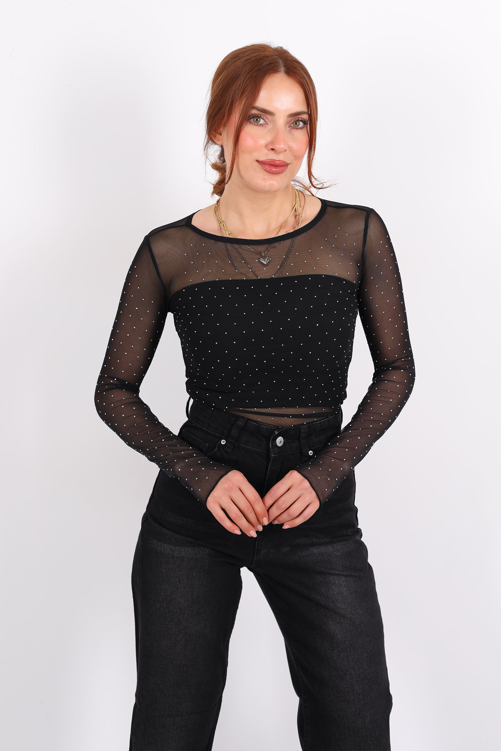 Siyahın gizemli duruşu, tül kumaşın zarif ağırlıksızlığıyla buluşuyor bu bluz, zarafet ile parlak detayları ustalıkla birleştiriyor. İnce tül dokusu sayesinde yarı transparan bir hava yaratırken, minik taş işlemeleri göğe işlemeli bir gece gibi ışıldıyor.Tül kumaşı, altıgen ağ formuyla oldukça hafif ve ferah bir yapı sunar. Bu yapısı sayesinde hem hava geçirgen hem de estetik olarak hacimli bir görünüm sağlayabilir.