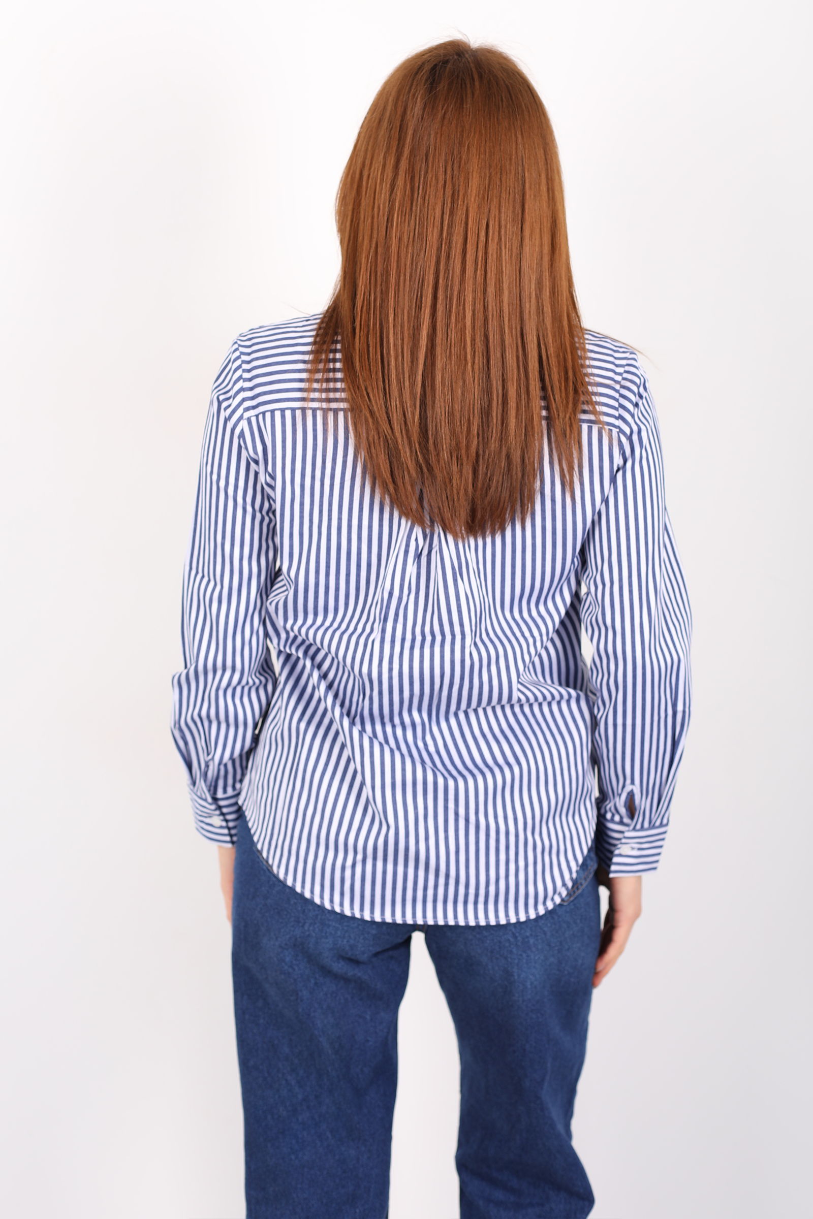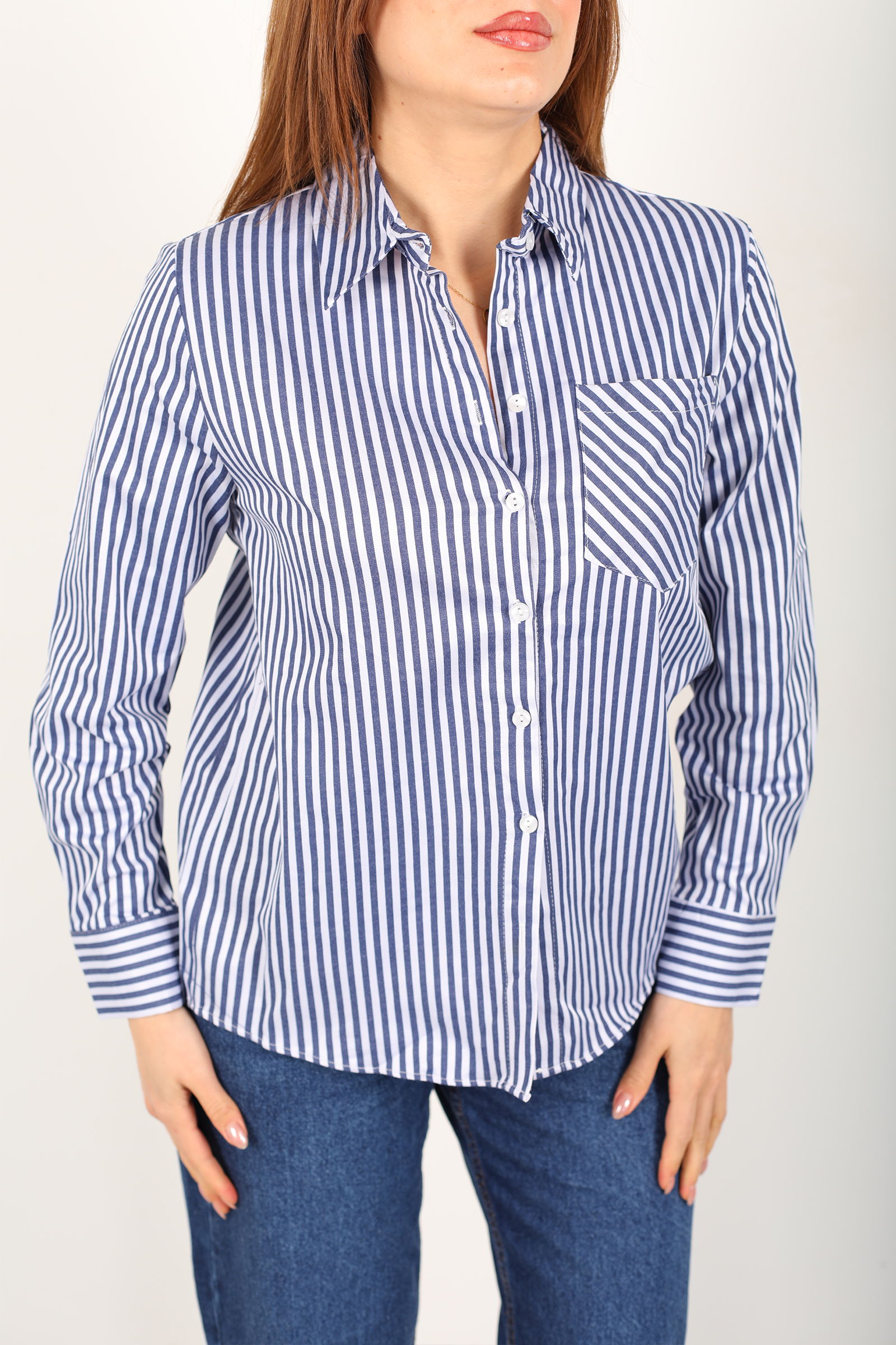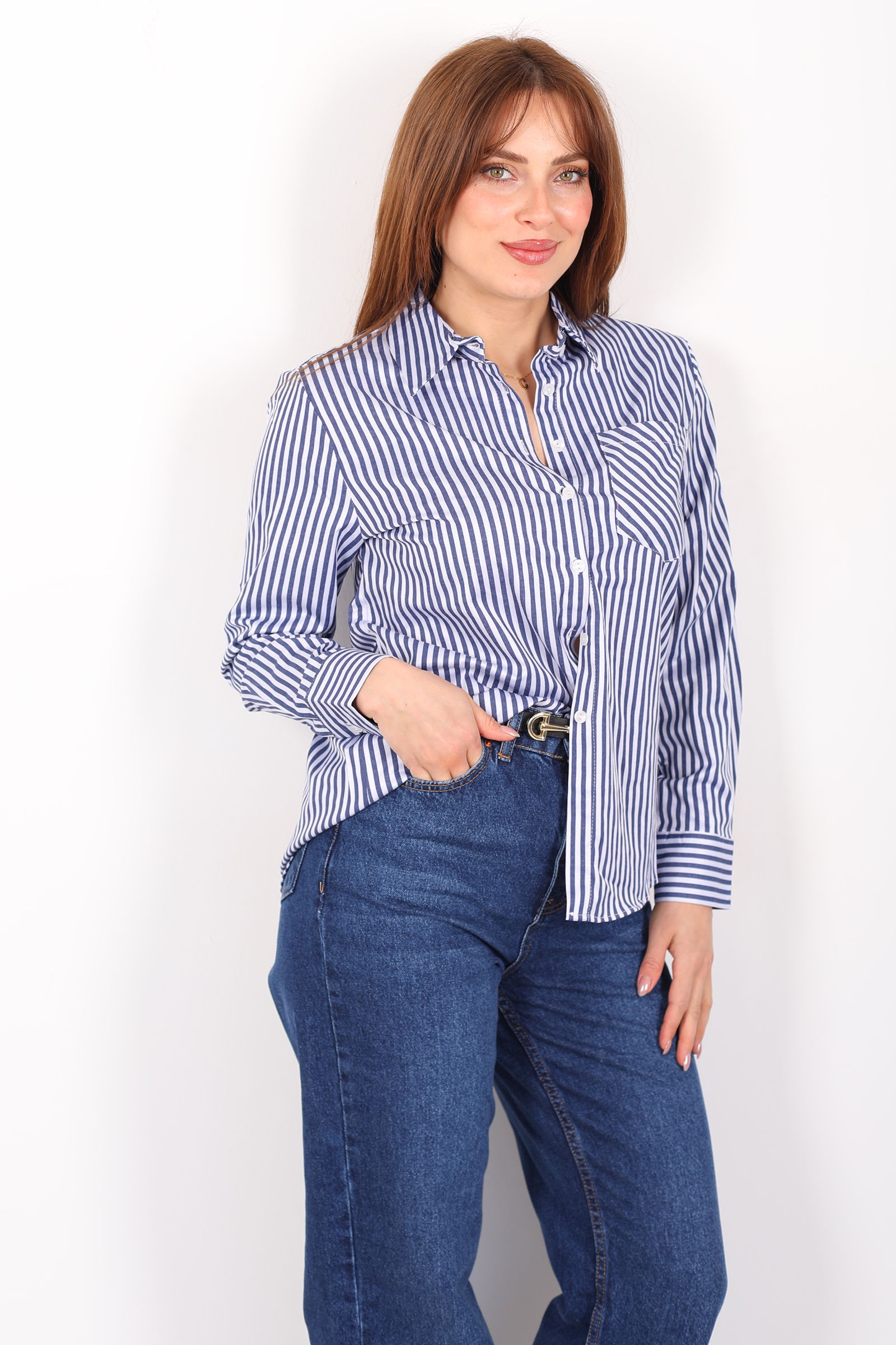 Tek cep detayı, gömleğe minimalist bir işlevsellik kazandırırken çizgili deseni klasikle modernin buluştuğu bir tarz yaratır. Lacivert temel ton, hem spor hem de ofis kombinlerinde rahatça kullanılır ve jean, kumaş pantolon veya eteklerle kolayca uyum sağlar. Zarif düğme kapamalı yaka tasarımı, hem günlük giyimde hem de şık kombinlerde pratik ve stil sahibi bir dokunuş sağlar.