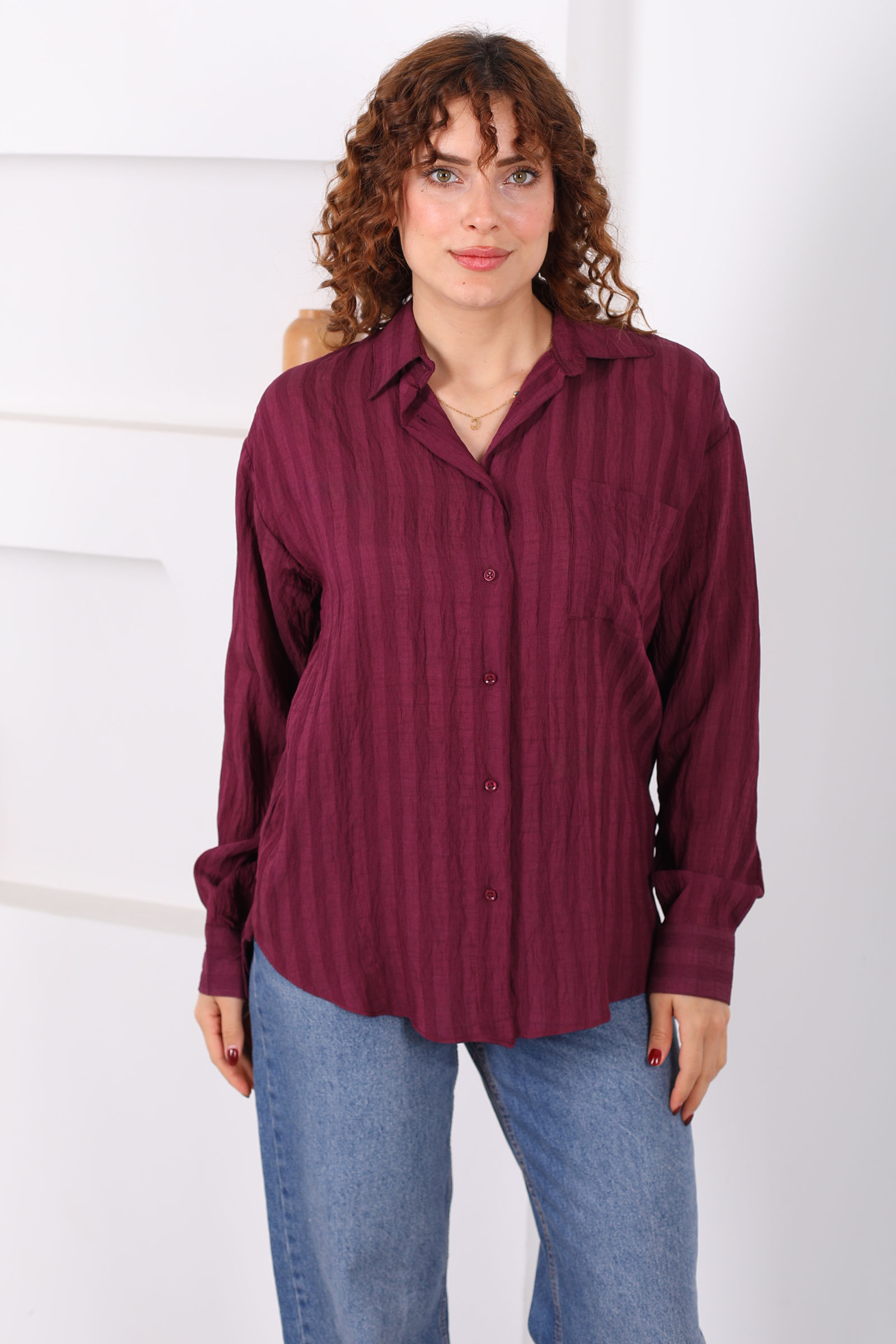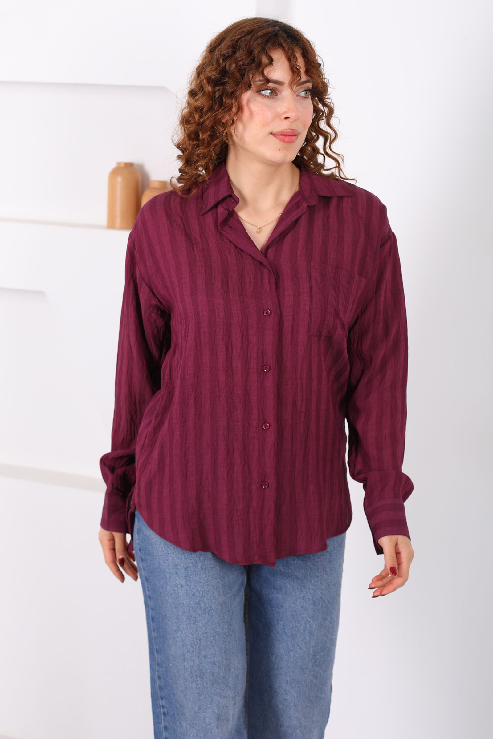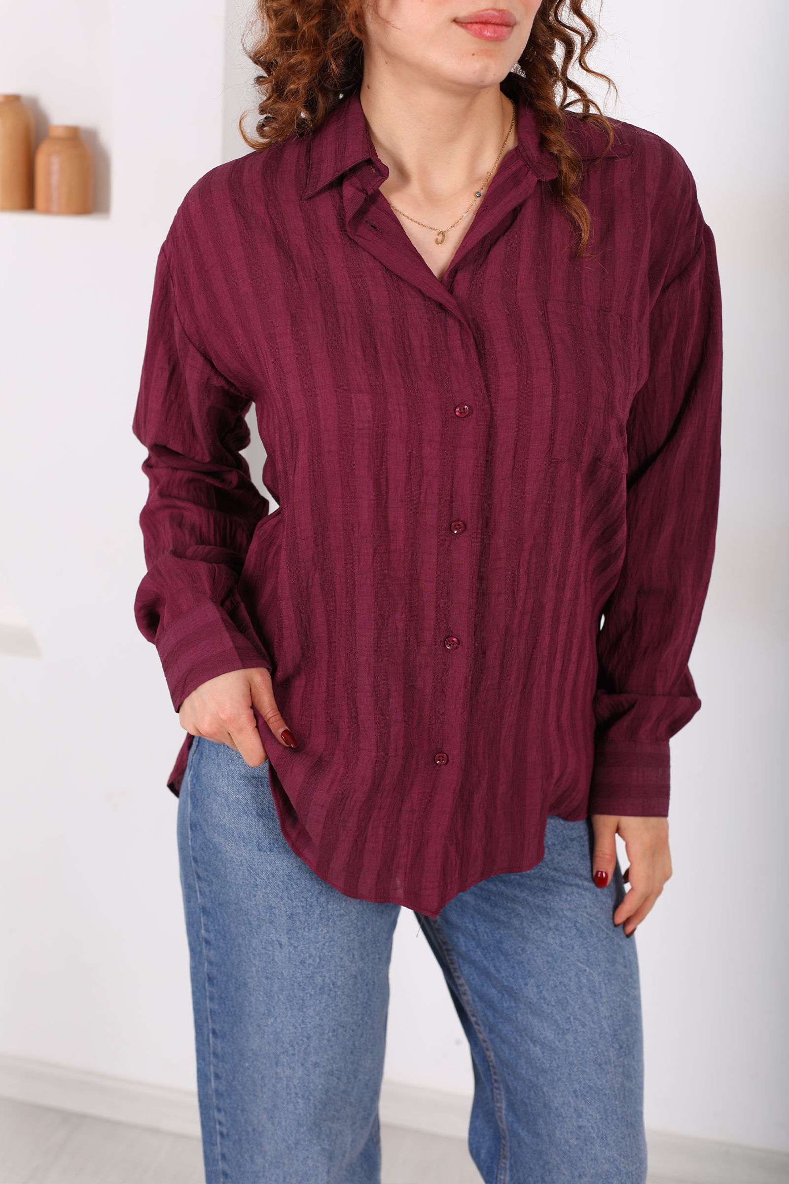 Tek Cepli Kalın Çizgili Kadın Mürdüm Oversize Gömlek