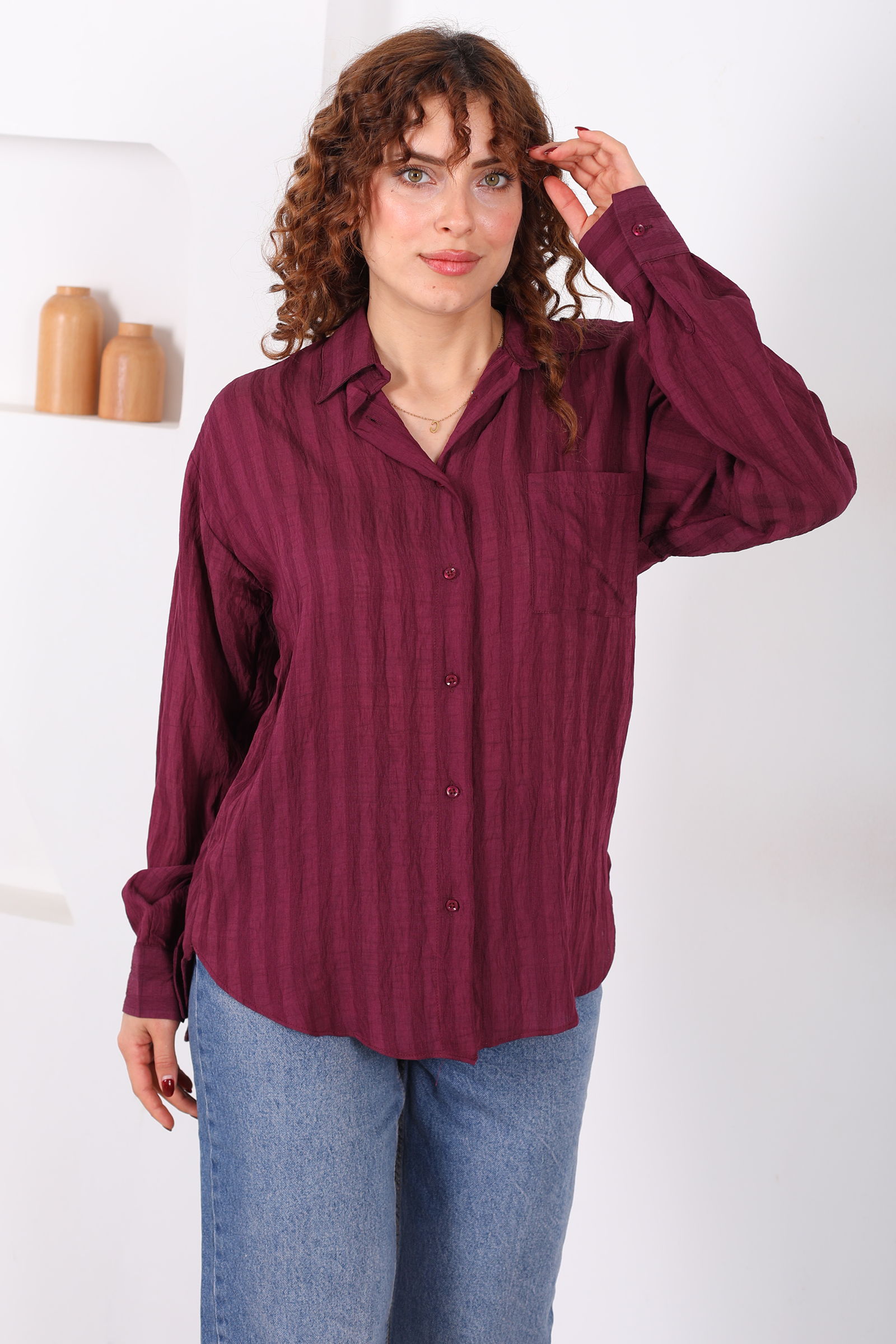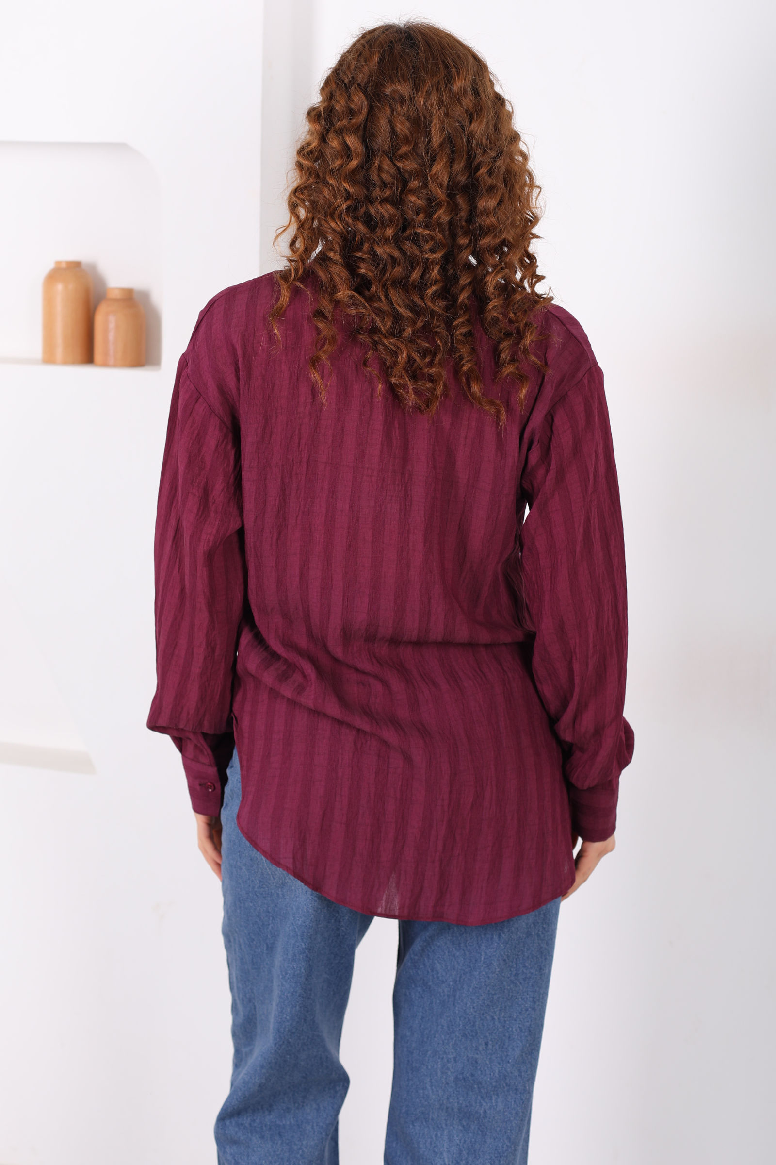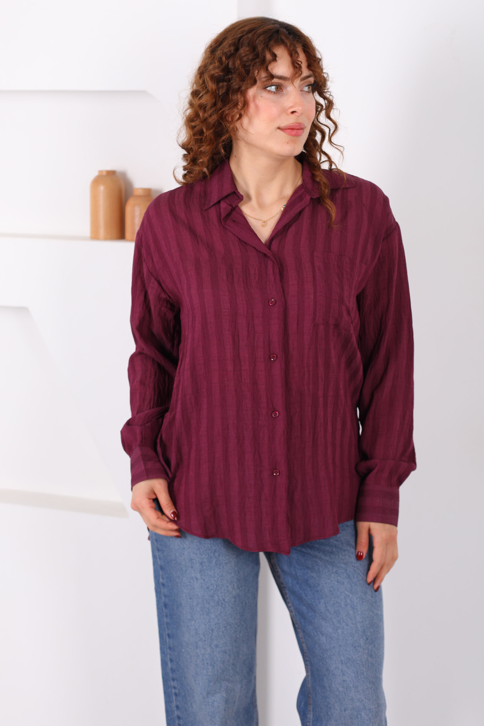 Tek Cepli Kalın Çizgili Kadın Mürdüm Oversize Gömlek