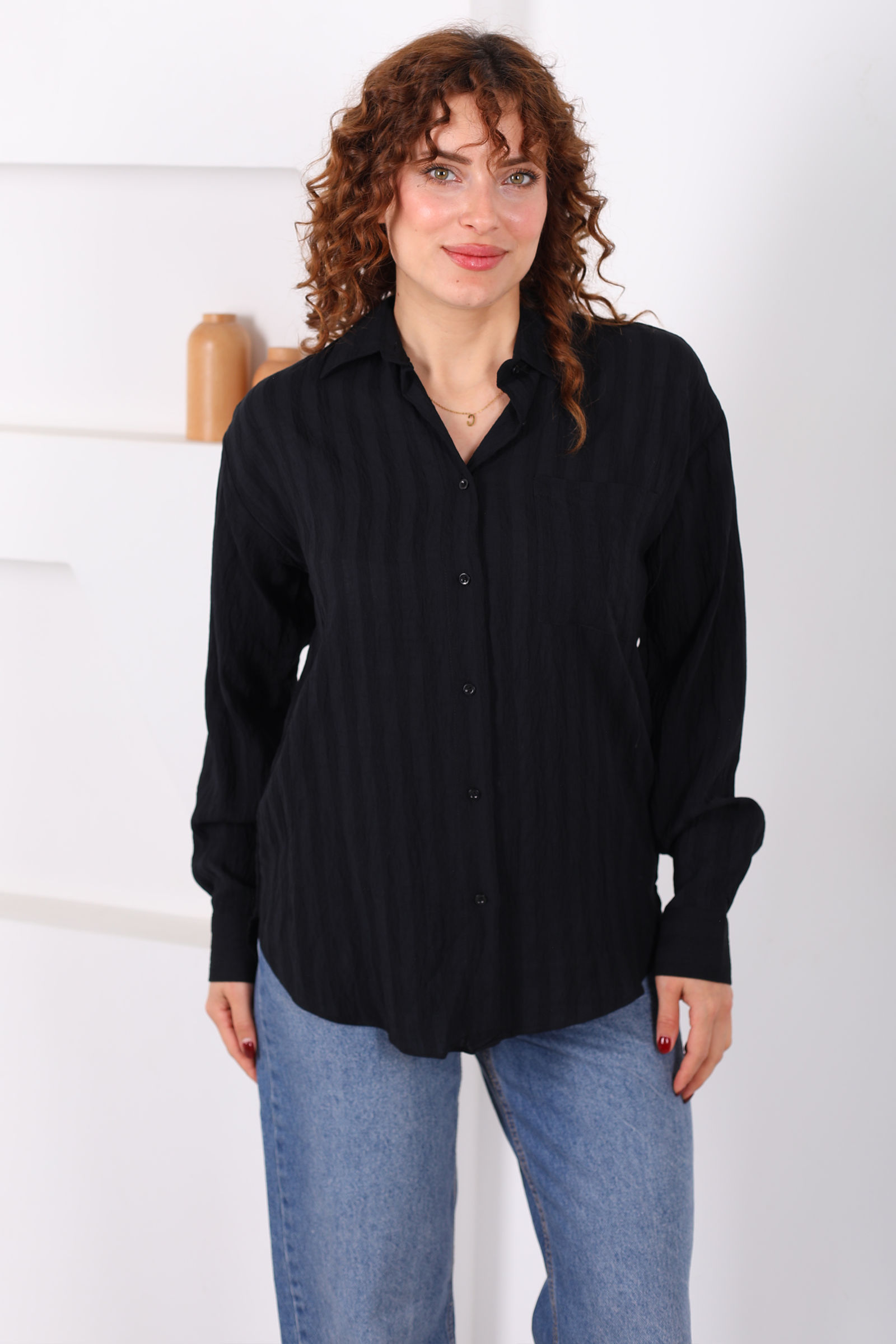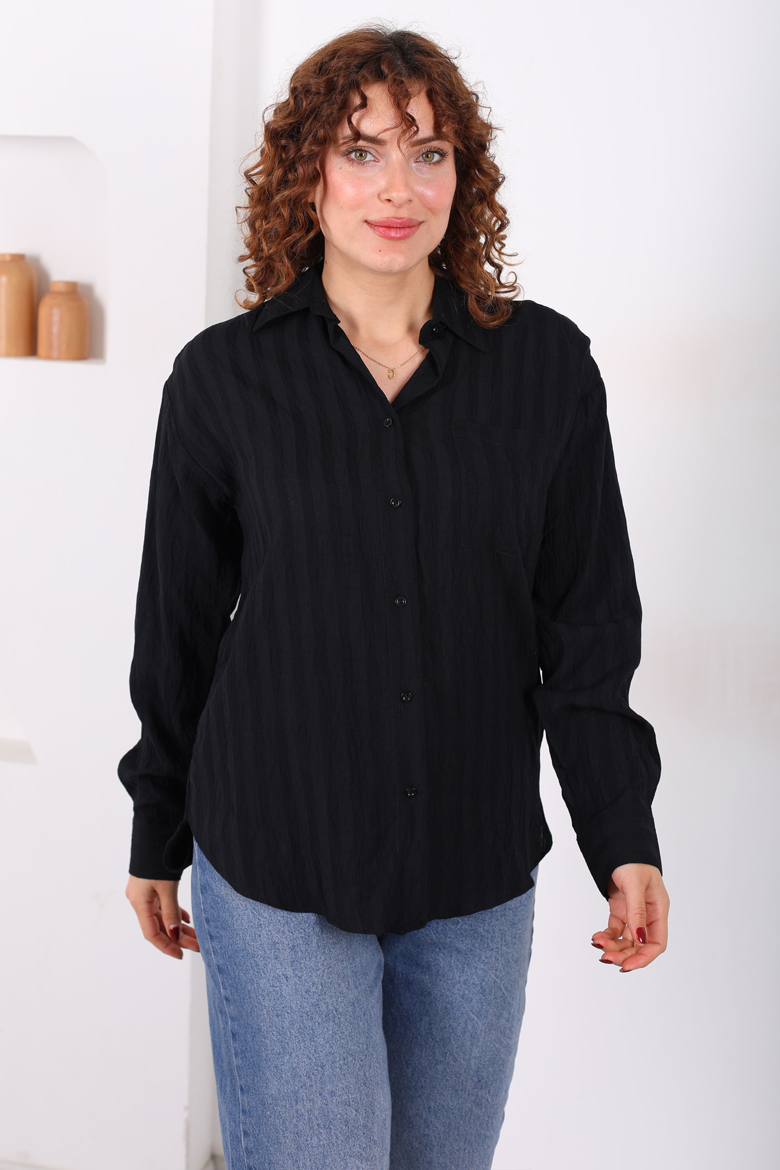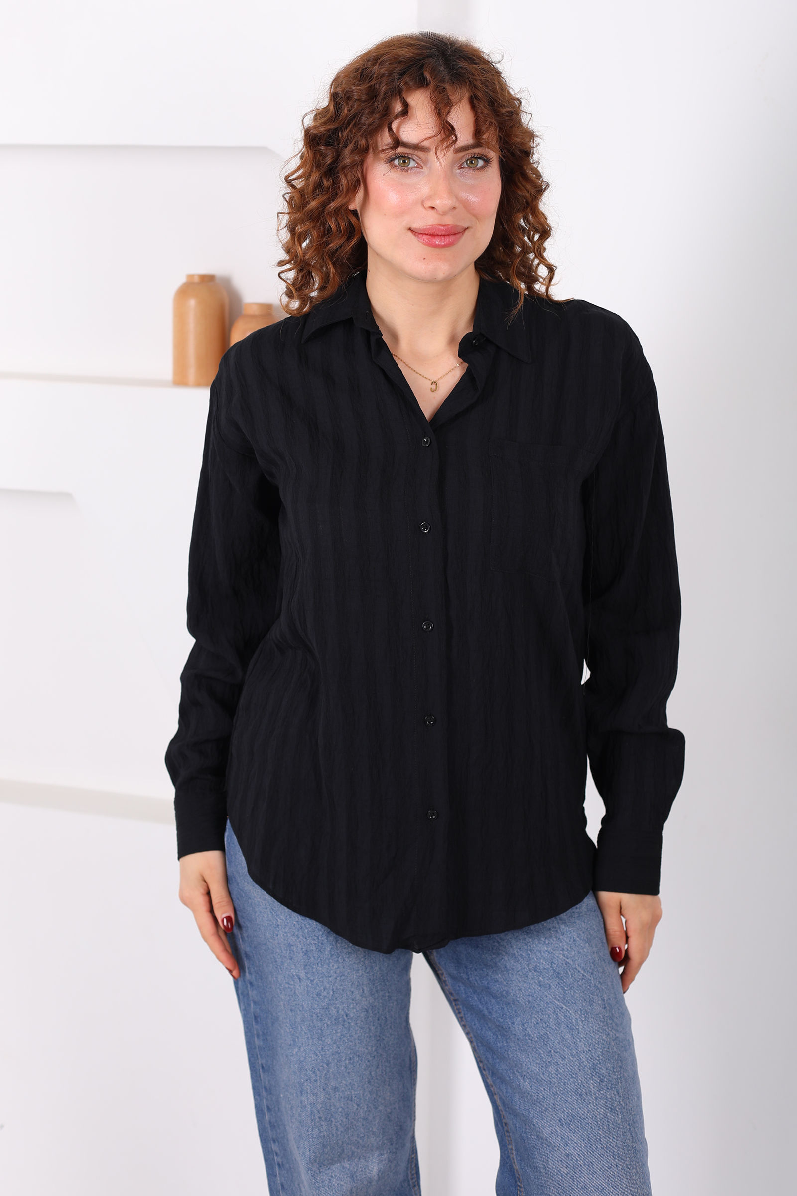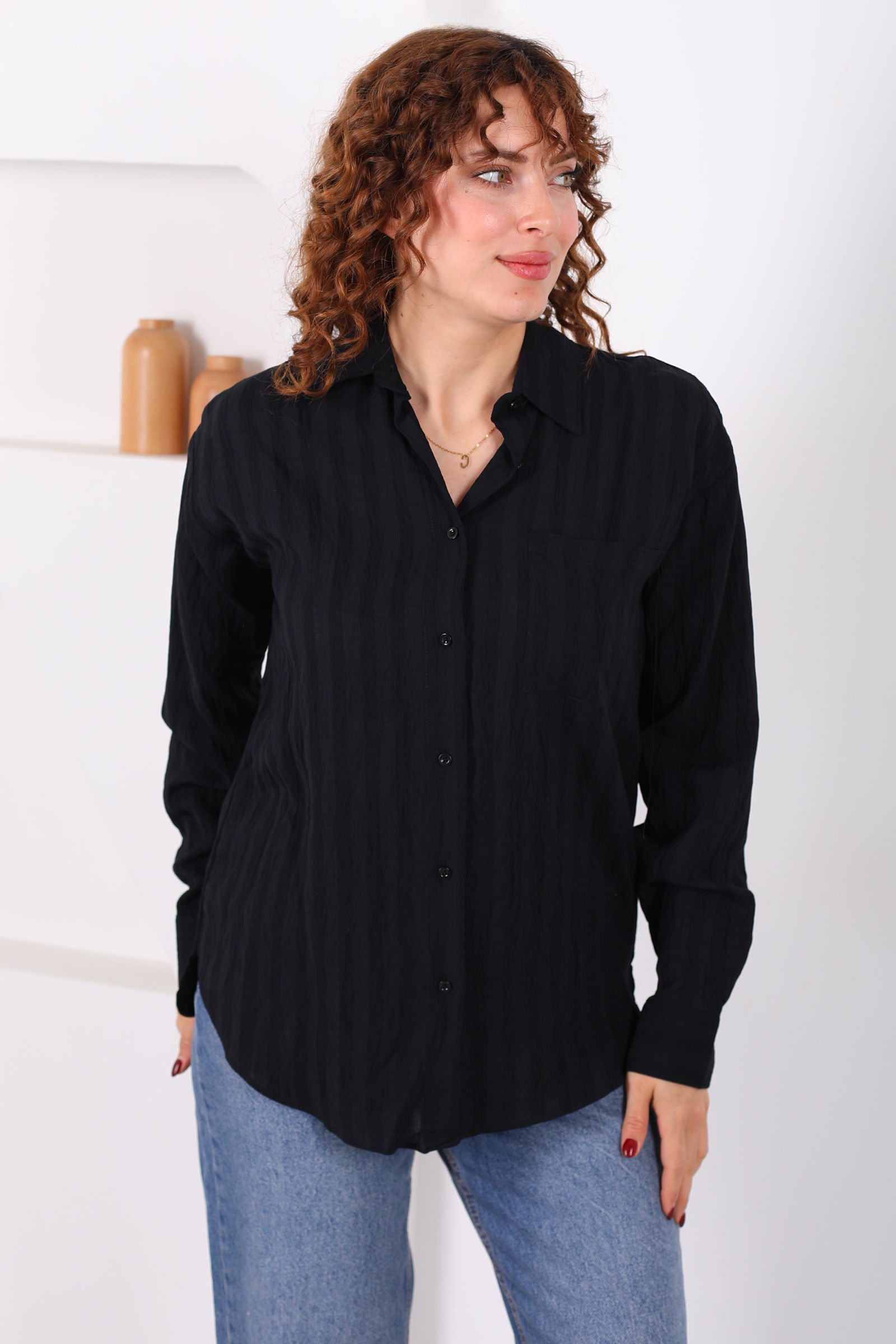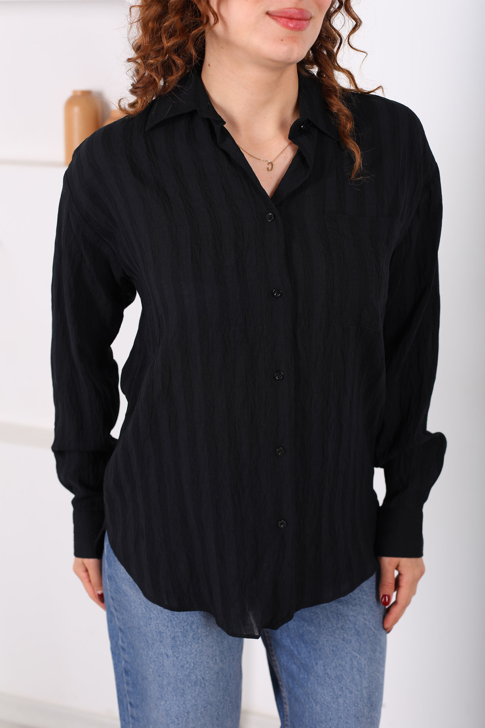 Tek Cepli Müslin Oversize Siyah Kadın Gömlek