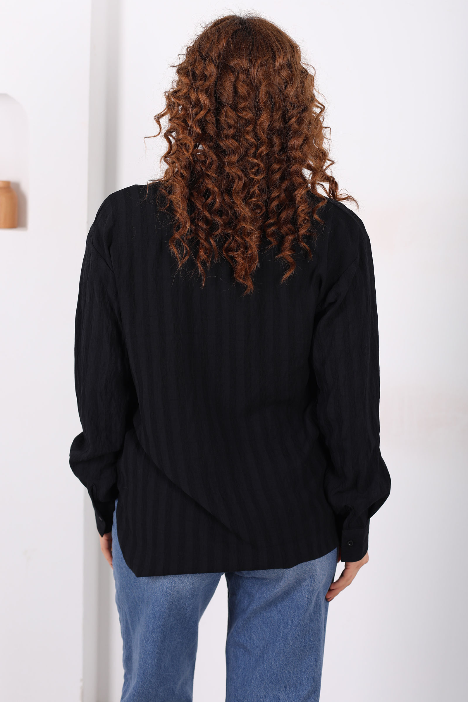 Tek Cepli Kalın Çizgili Kadın Siyah Oversize Gömlek