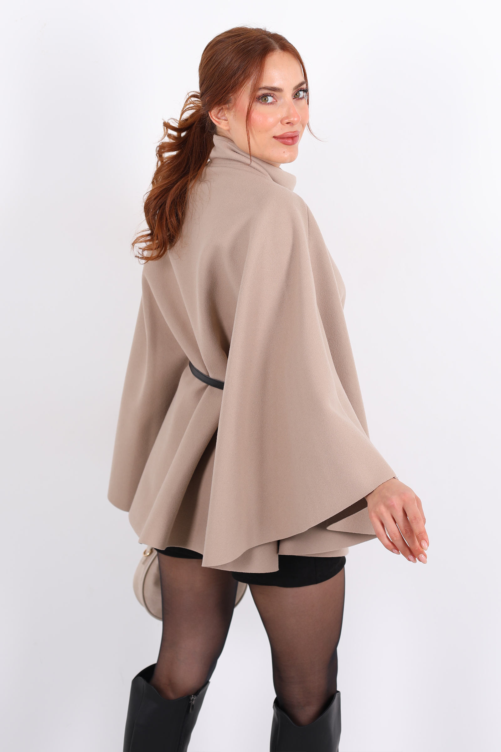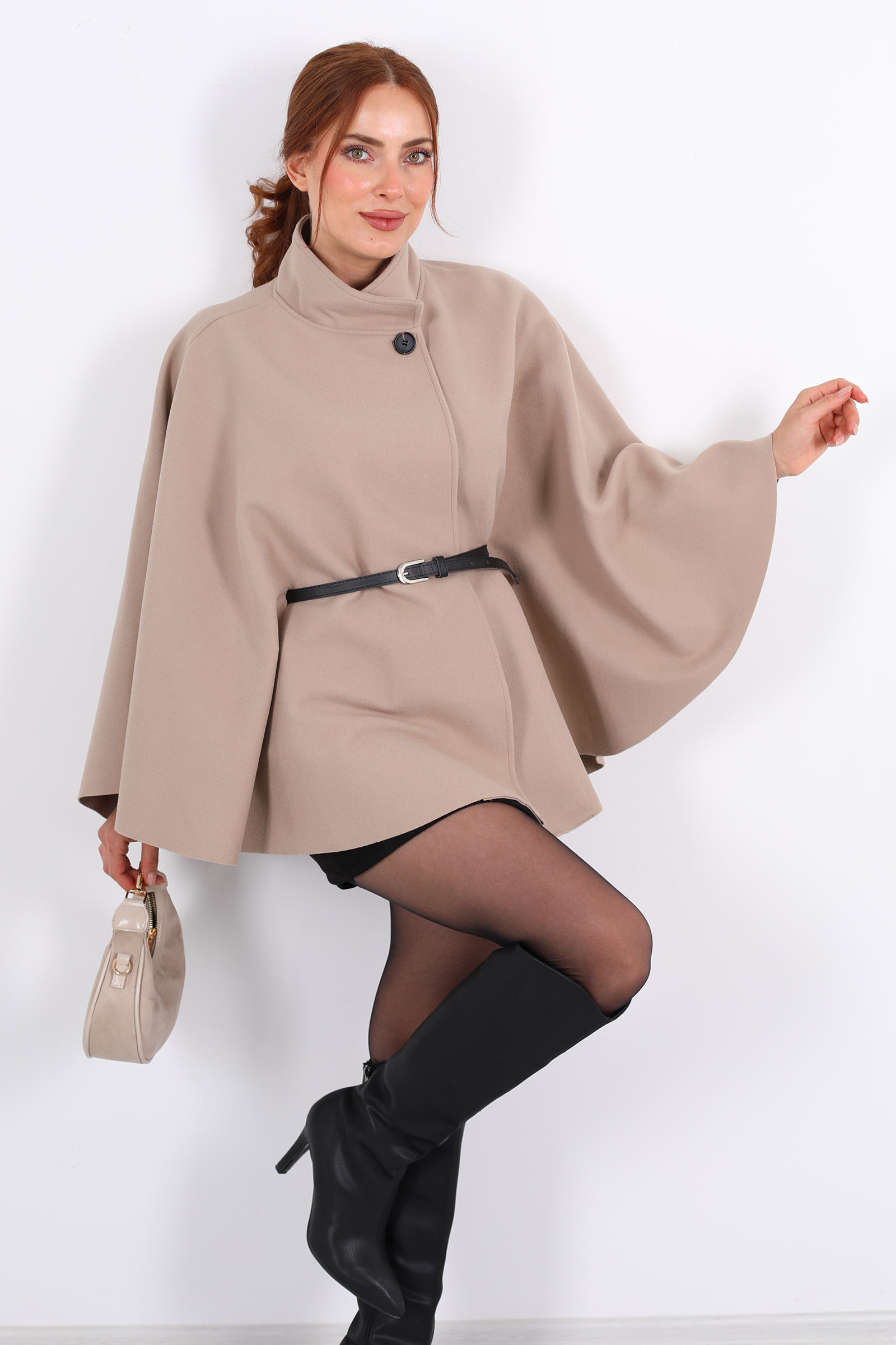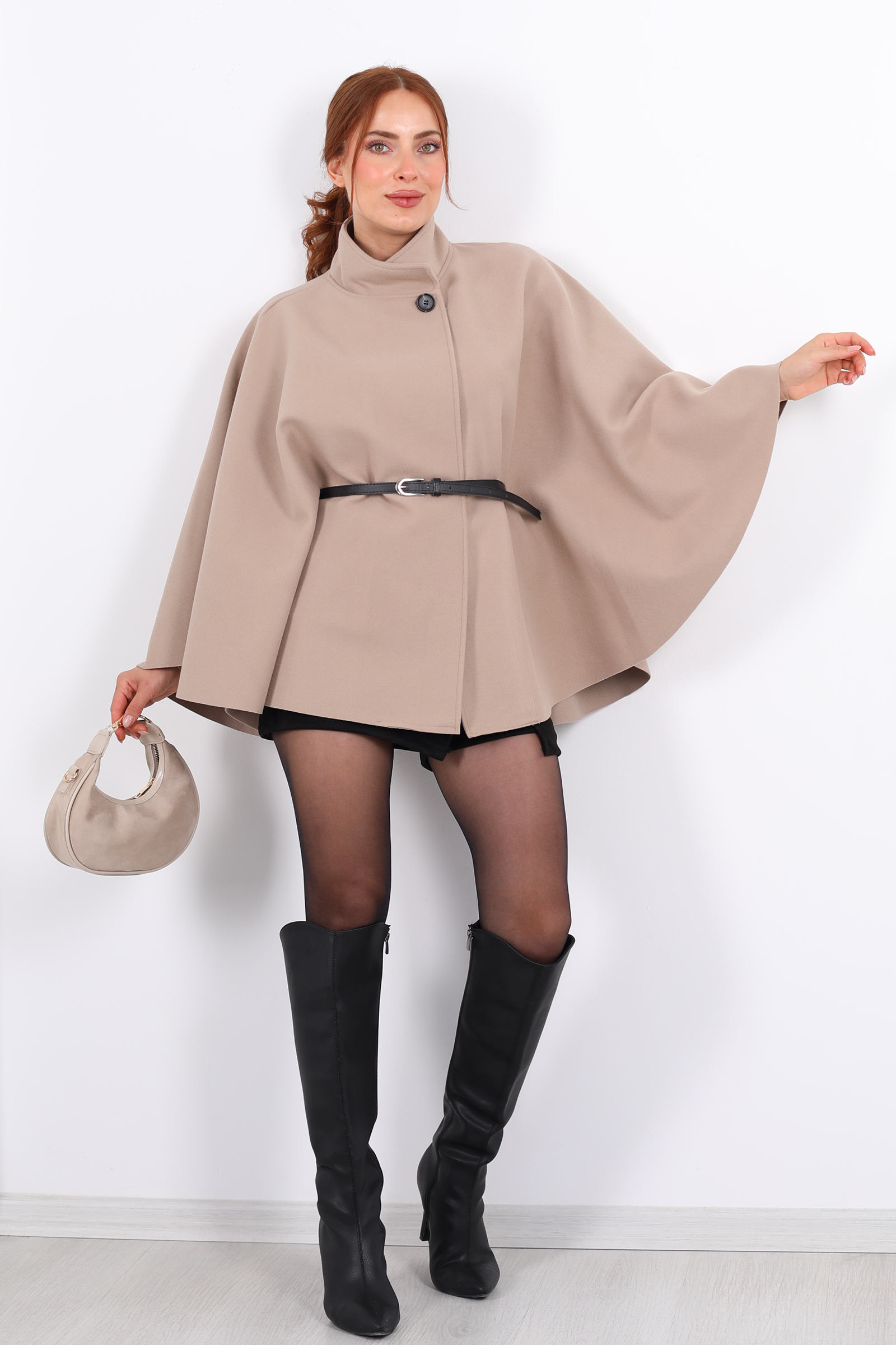 Sıcacık ve zarif bir duruş sergileyen Tek Düğmeli Kemerli Taş Rengi Kadın Panço, hem stil hem fonksiyon açısından etkileyici bir parça. Kemer detayı bele hafif bir vuruş yaparak silueti dengelerken, tek düğme kapama pançoya modern bir hava kazandırıyor.Bu pançoyu açık tonlarda dar paça pantolon ile kombinleyerek şehirli, casual bir stil yakalayabilir; veya bordo ya da kahverengi uzun etek ve botlarla bohem‑şık bir akşam görünümü oluşturabilirsin.
