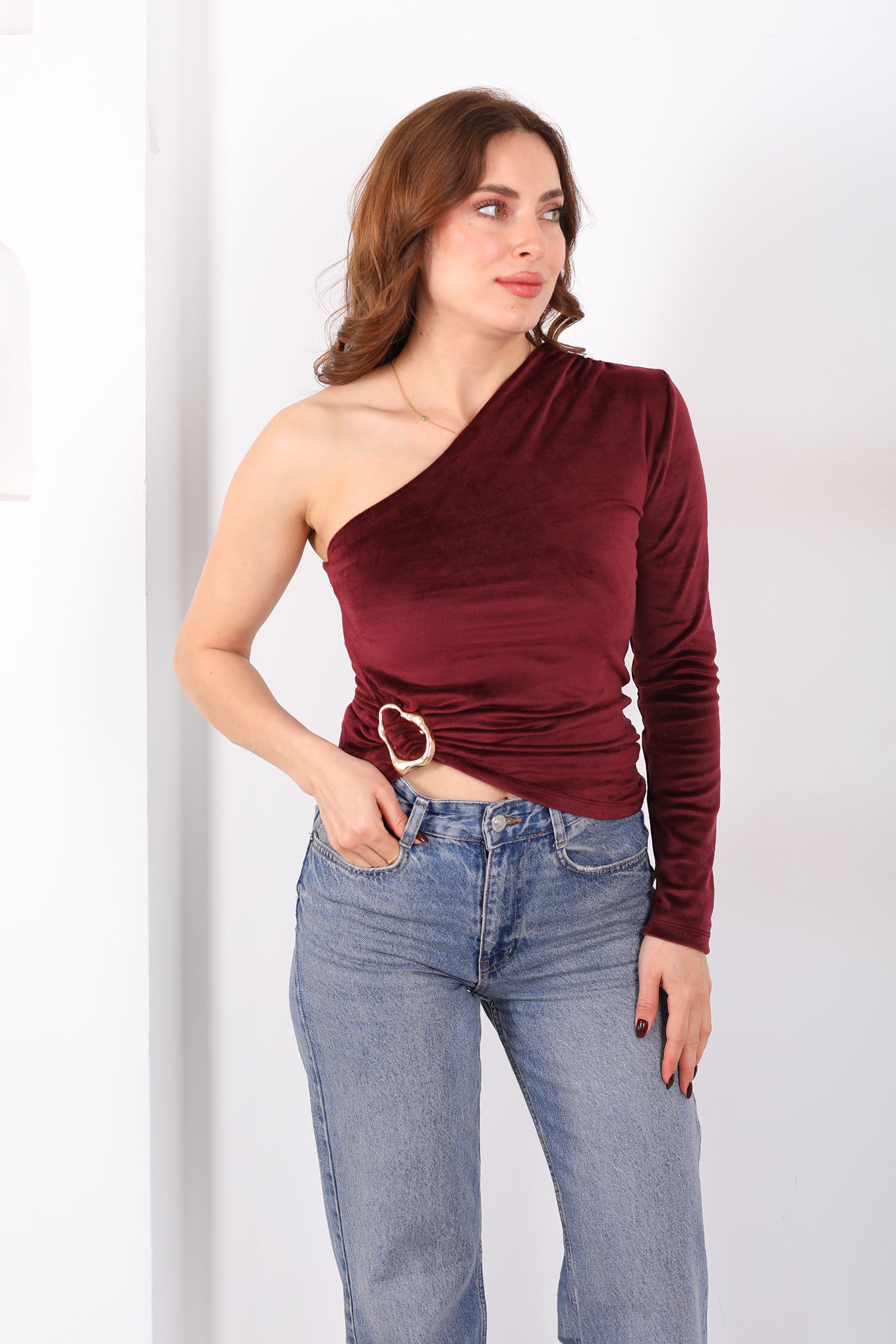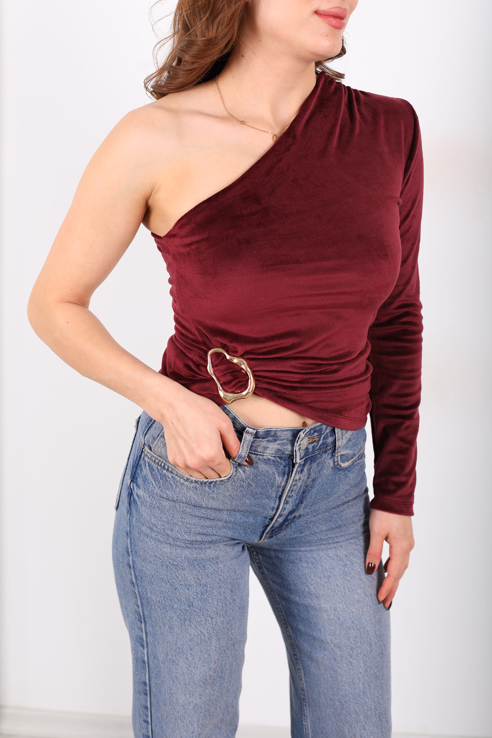 Tek Kol Aksesuarlı Bordo Kadın Kadife Bluz