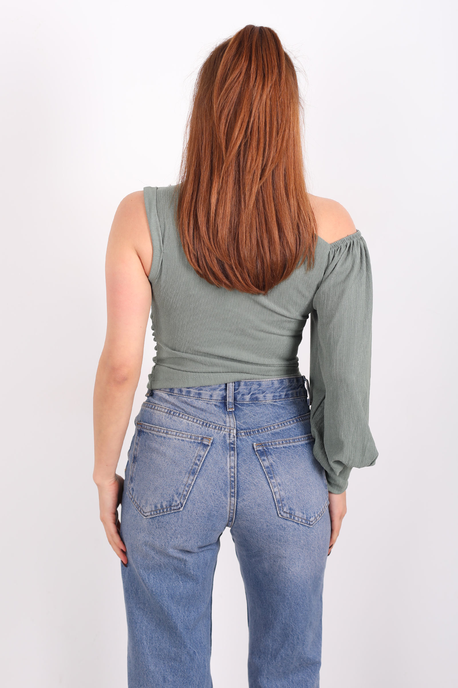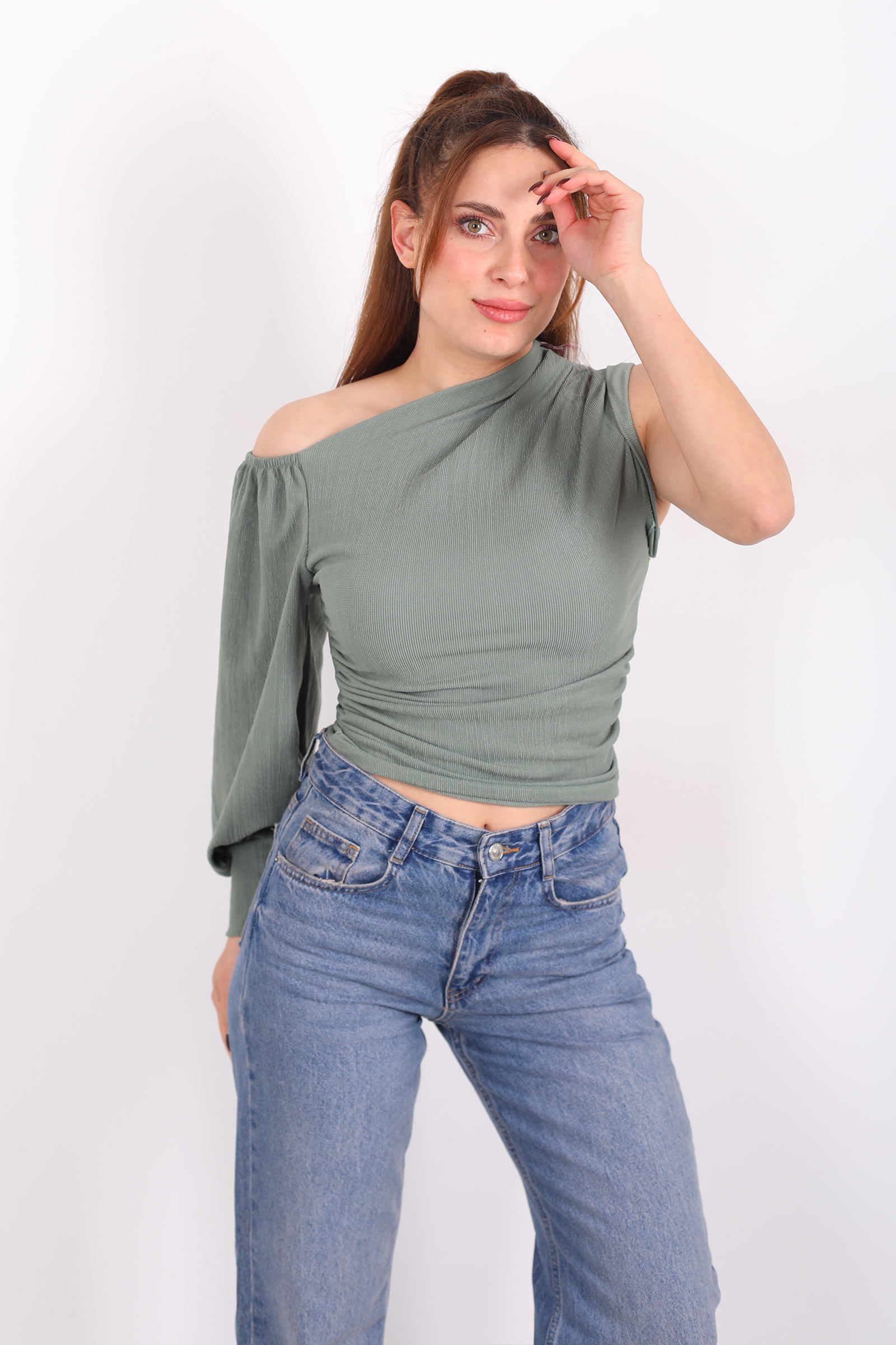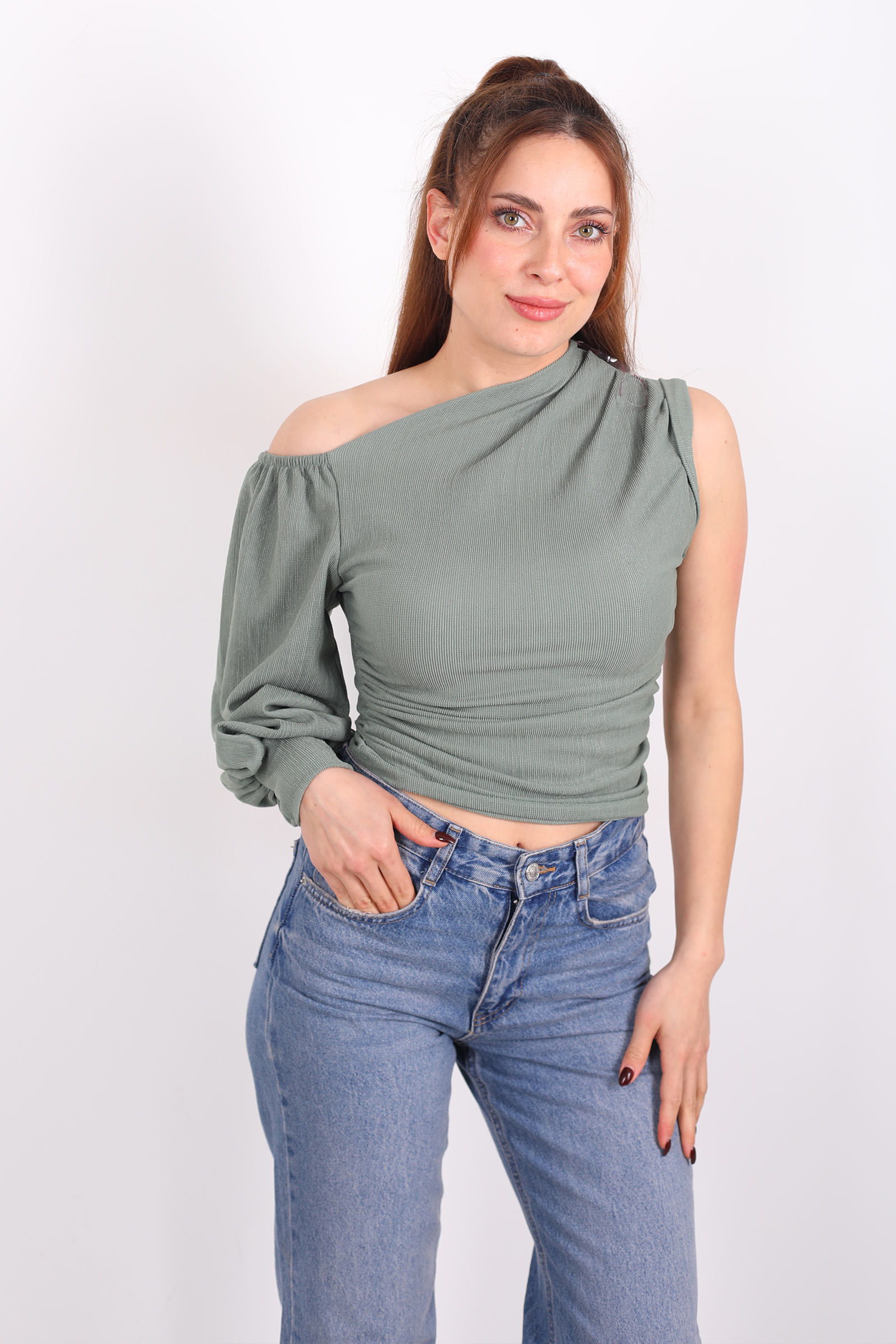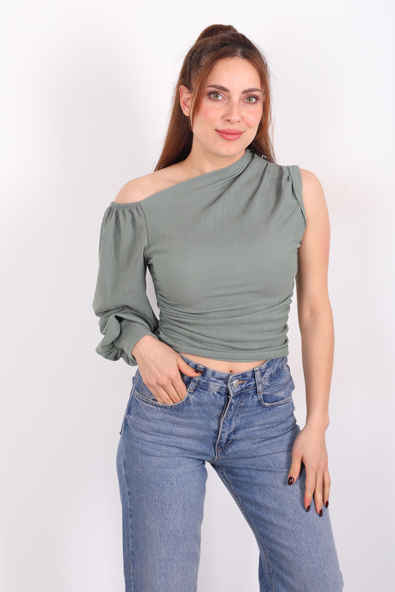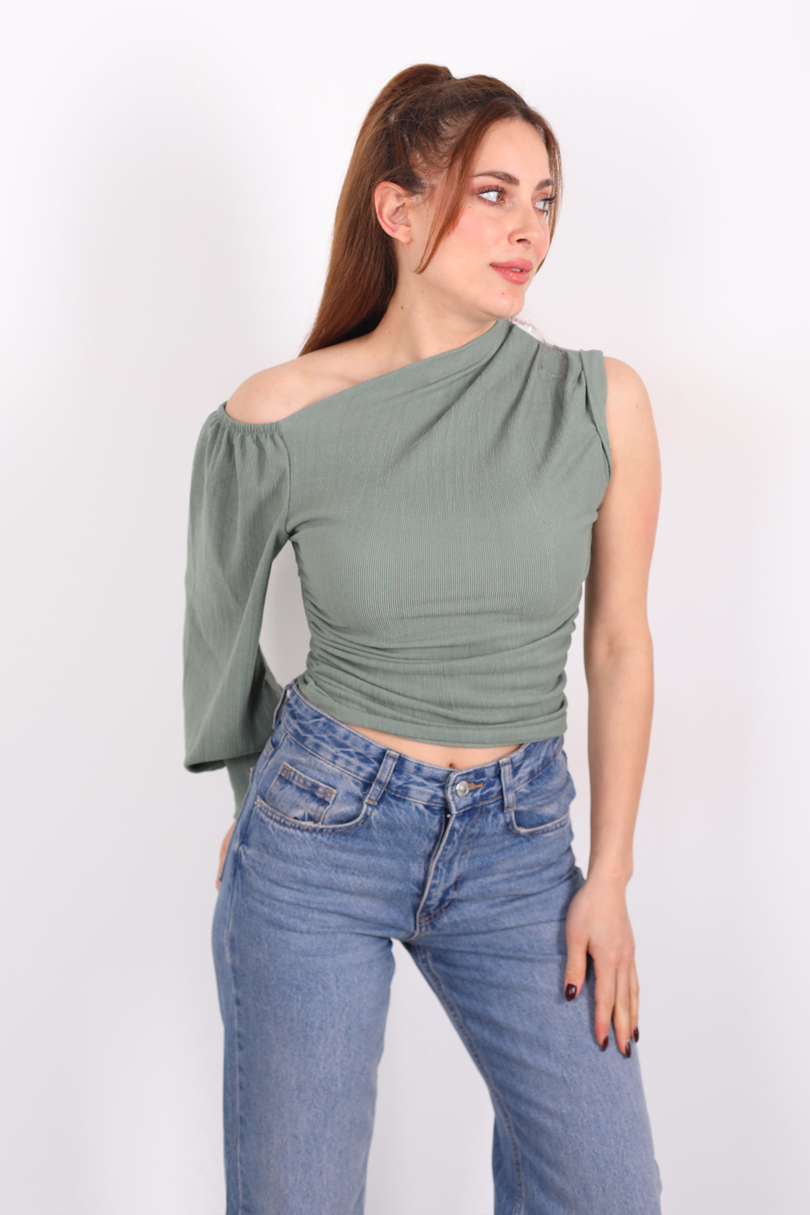 Bir kıyafetin suskun bir dil varsa, bu bluz o dili renkle konuşur. Çağla yeşili, sakin bir nehir akışı gibi yumuşak ama belirgin bir enerji taşır; sana sade bir tshirt’ten daha fazlasını vadeder. Düşük omuz kesimi, tek kolun hafifçe açığa çıkmasıyla birlikte stil bölen bir ritim yaratır simetriden bilinçli bir uzaklaşma, kendinden emin bir tavır.
