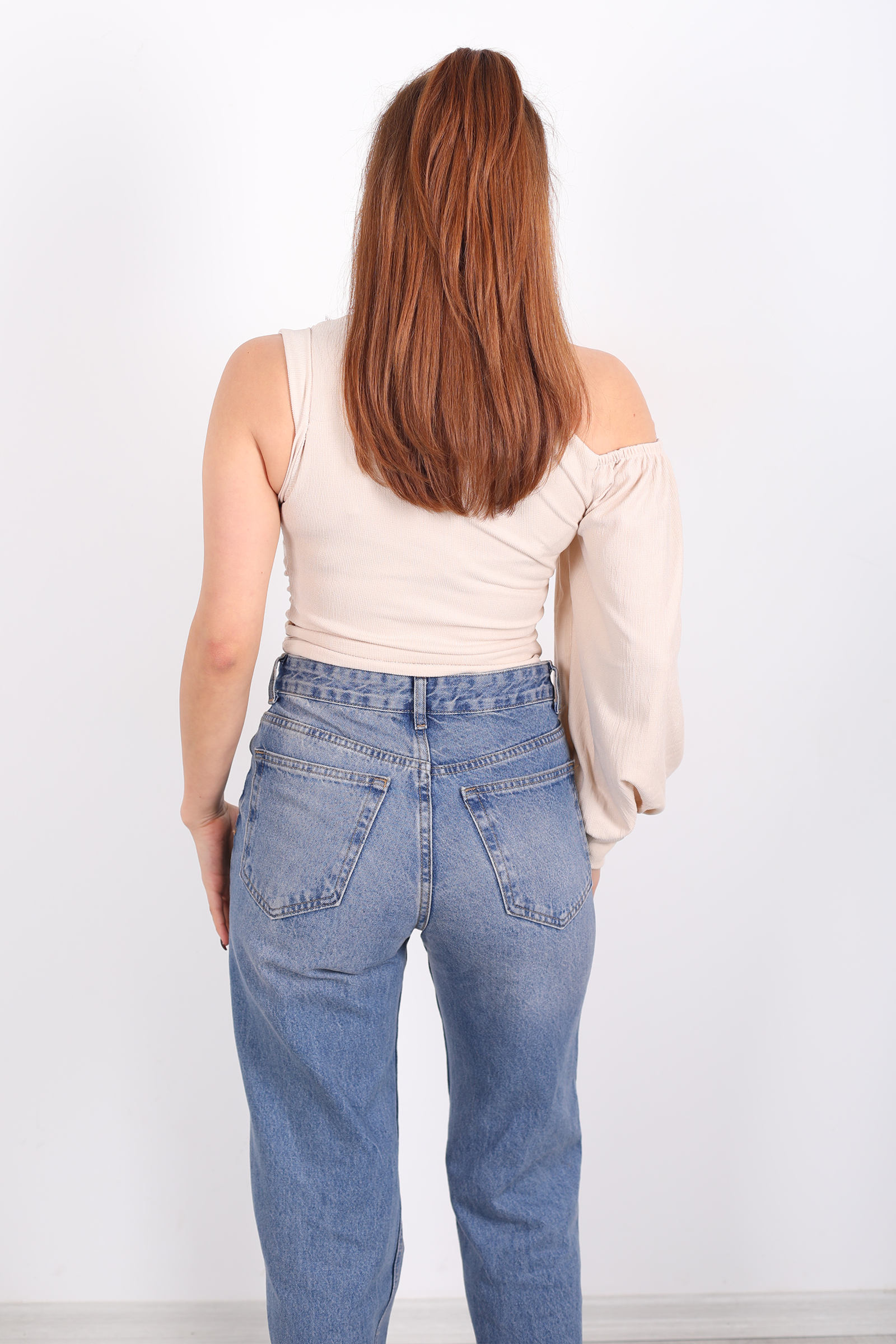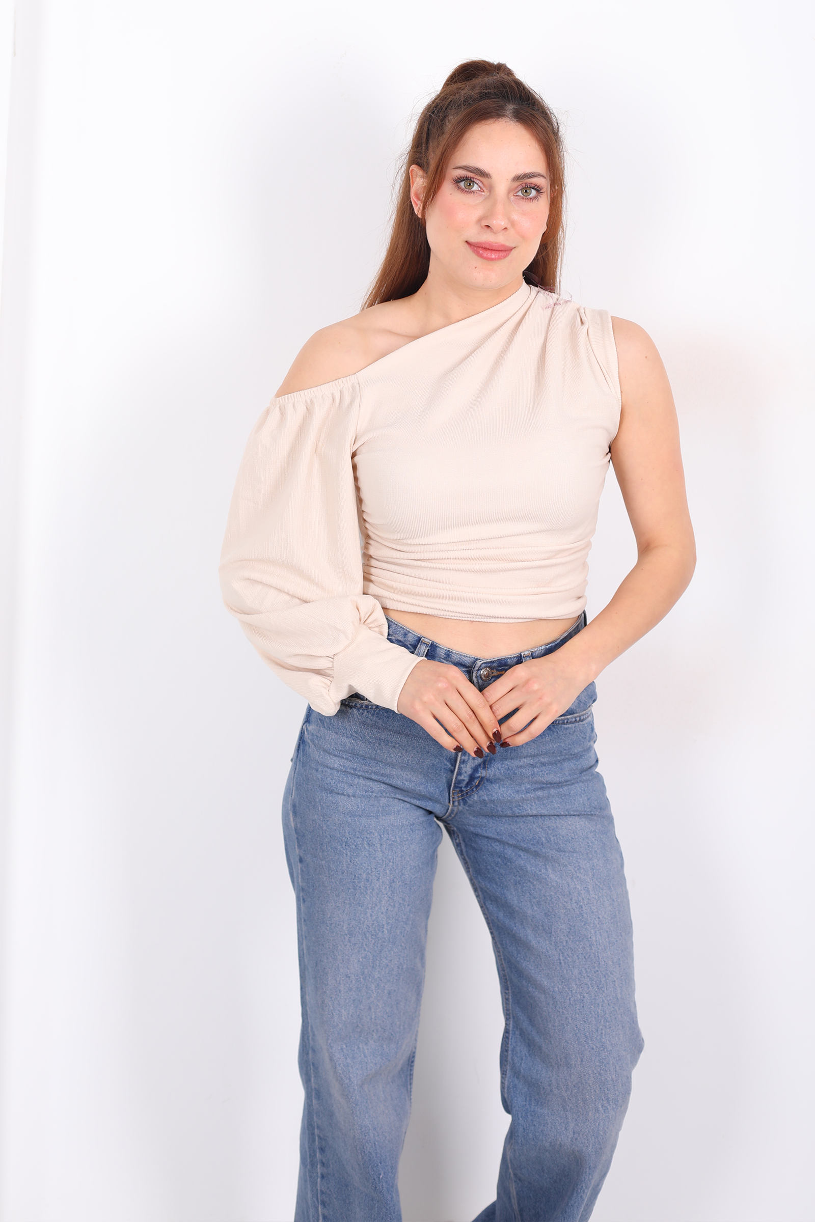 Bir bluz düşün: tek taraflı görünüşüyle statükoyu yıkıyor ve minimalizmin sessiz diline cesur bir aksan ekliyor. İşte bu taş rengi bluz, tam da bunu yapıyor. Düşük omuz kesimi sadece bir detay değil stilini harekete geçirerek anlatan küçük bir sahne. Kumaş nazikçe vücudu takip ederken taş rengi, nötr paletin sakin ama sıcak tonunu yansıtıyor; gündüz ışığında yumuşak, akşam ışıltısında zengin bir ifadeye dönüşüyor.