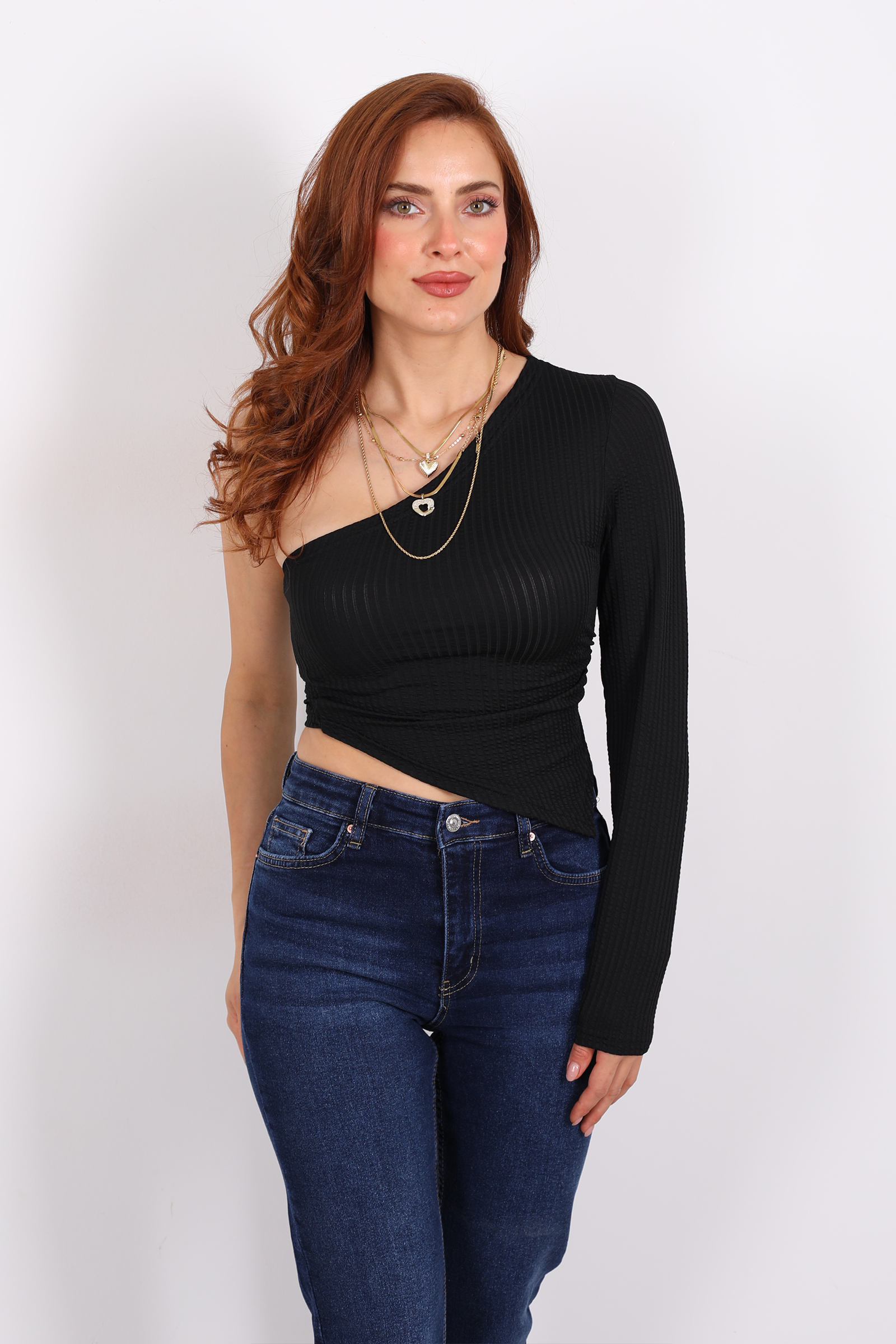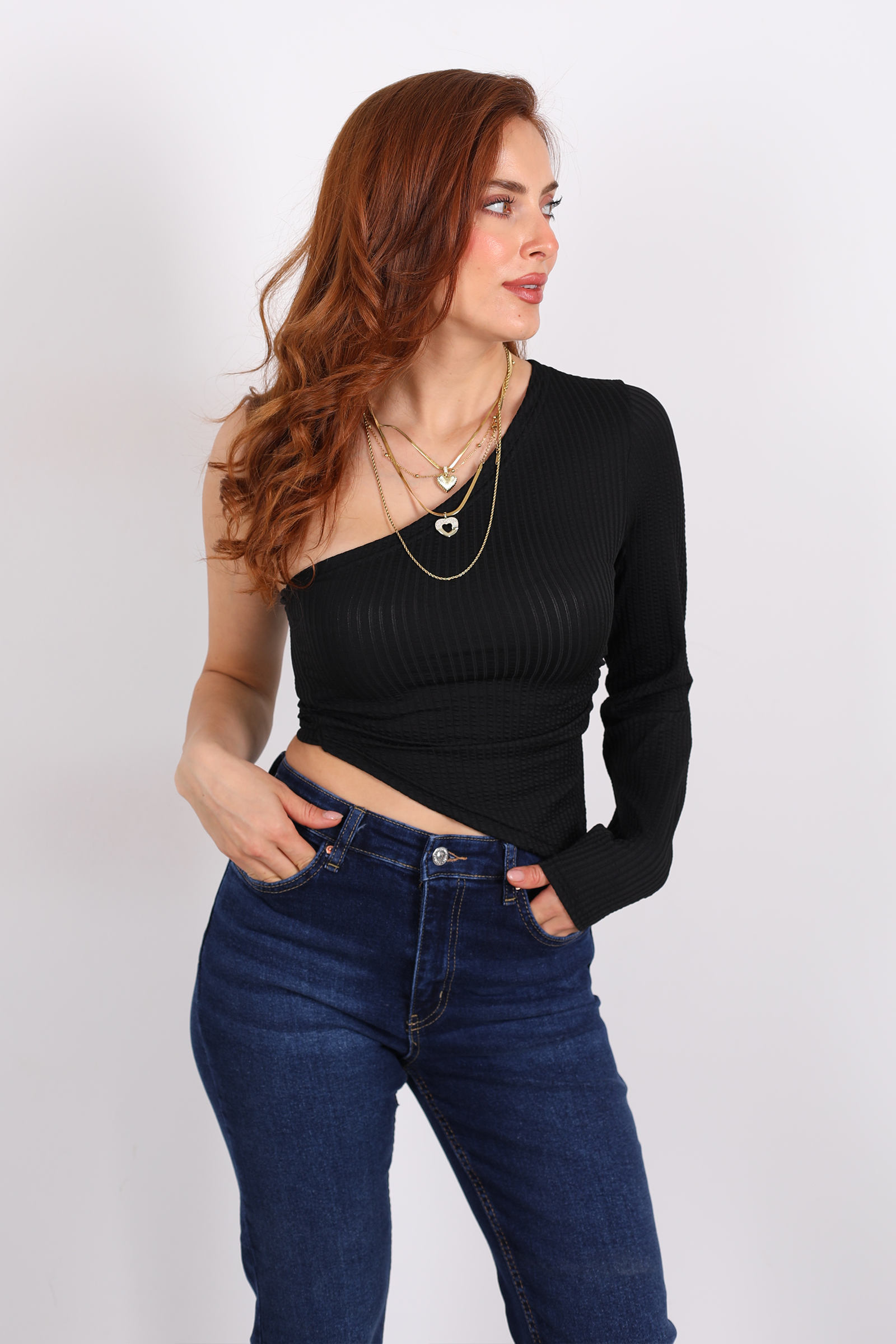 Siyahın zamansızlığını asimetrik tasarımla buluşturan bu tek kol bluz, tek omuz detayıyla cesur bir siluet sunuyor. Minimal ama etkileyici bir duruş için ideal bir seçim.Derin siyah tonu, zarif ve sofistike bir ifade sunar. Bu renk, hem nötr alt parçalarla hem dikkat çekici aksesuarlarla kusursuz kombine edilebilir.Minimal ama etkileyici parçalarla stil oluşturmayı seven kadınlar için.