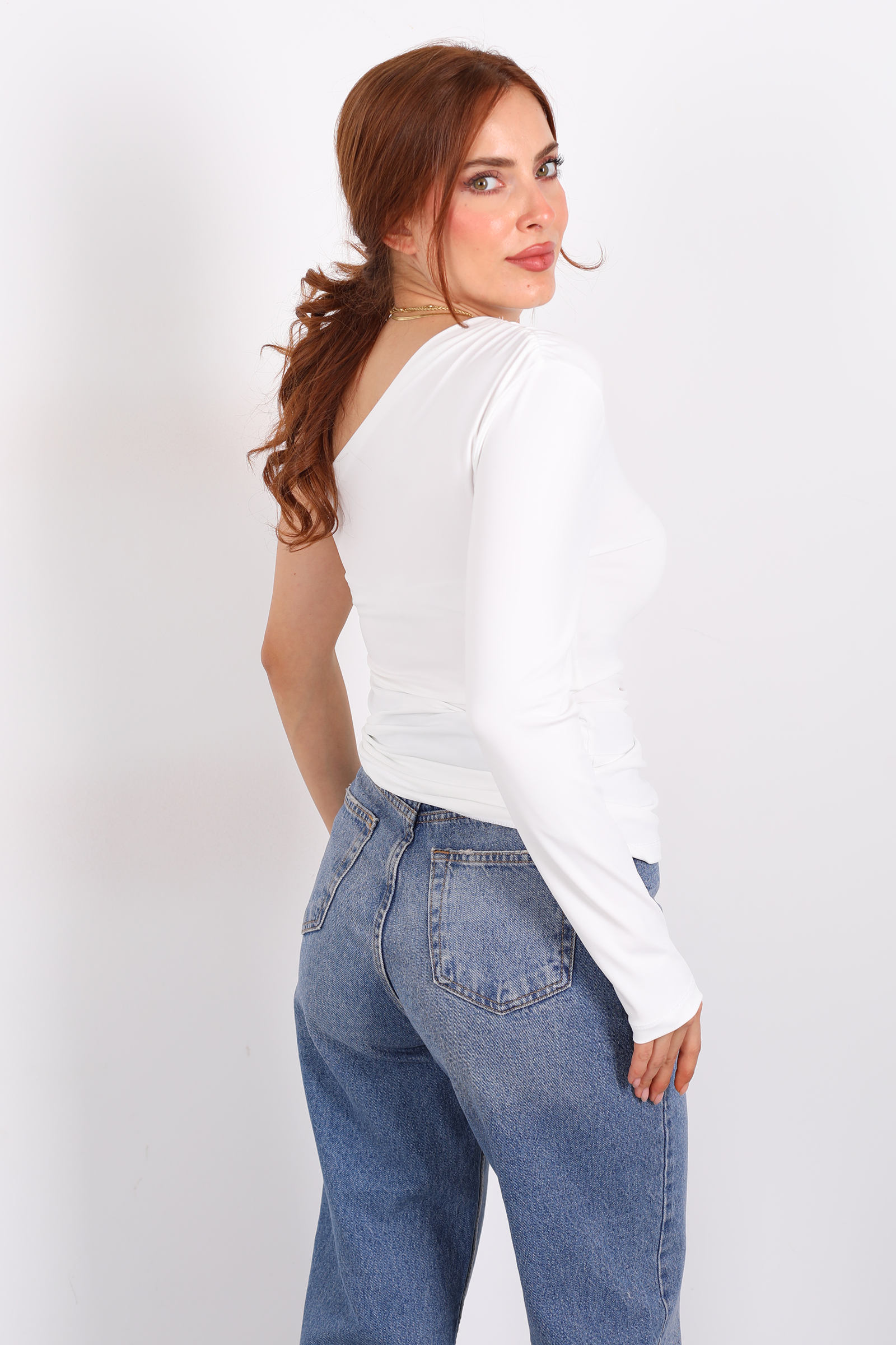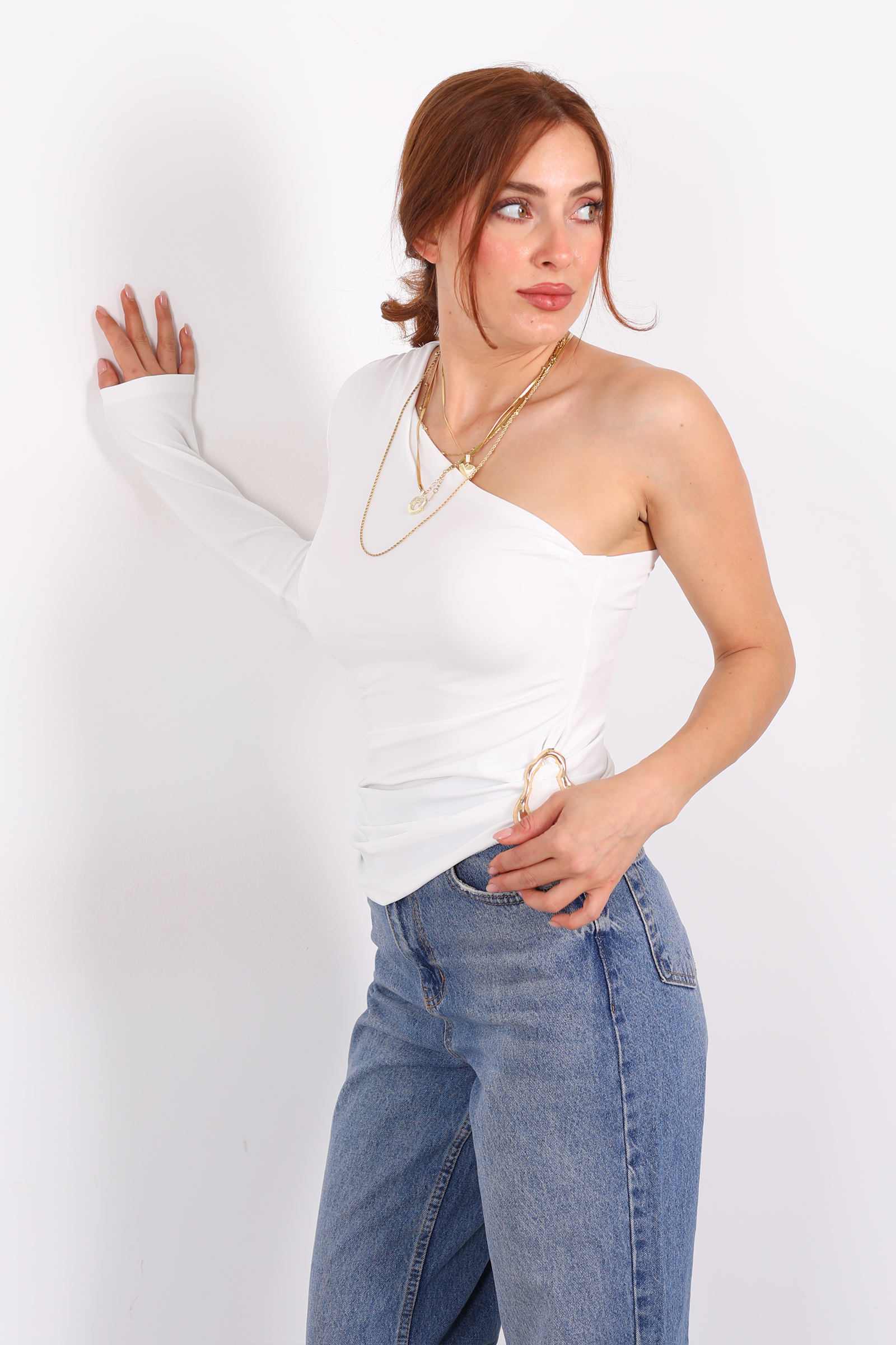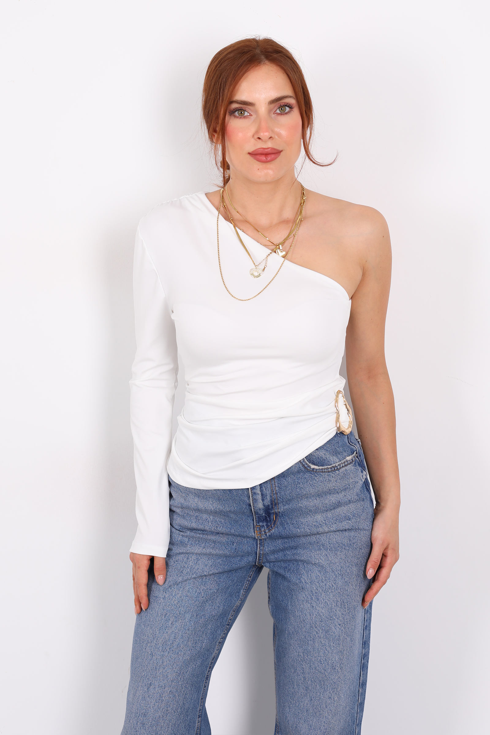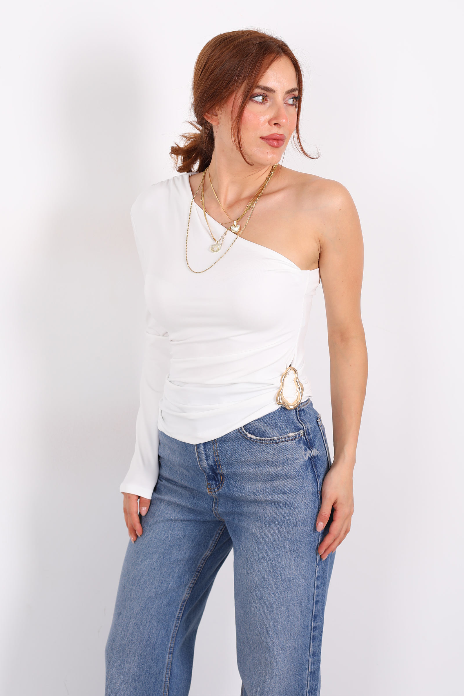 Tek Kol Toka Detaylı Beyaz Kadın Bluz