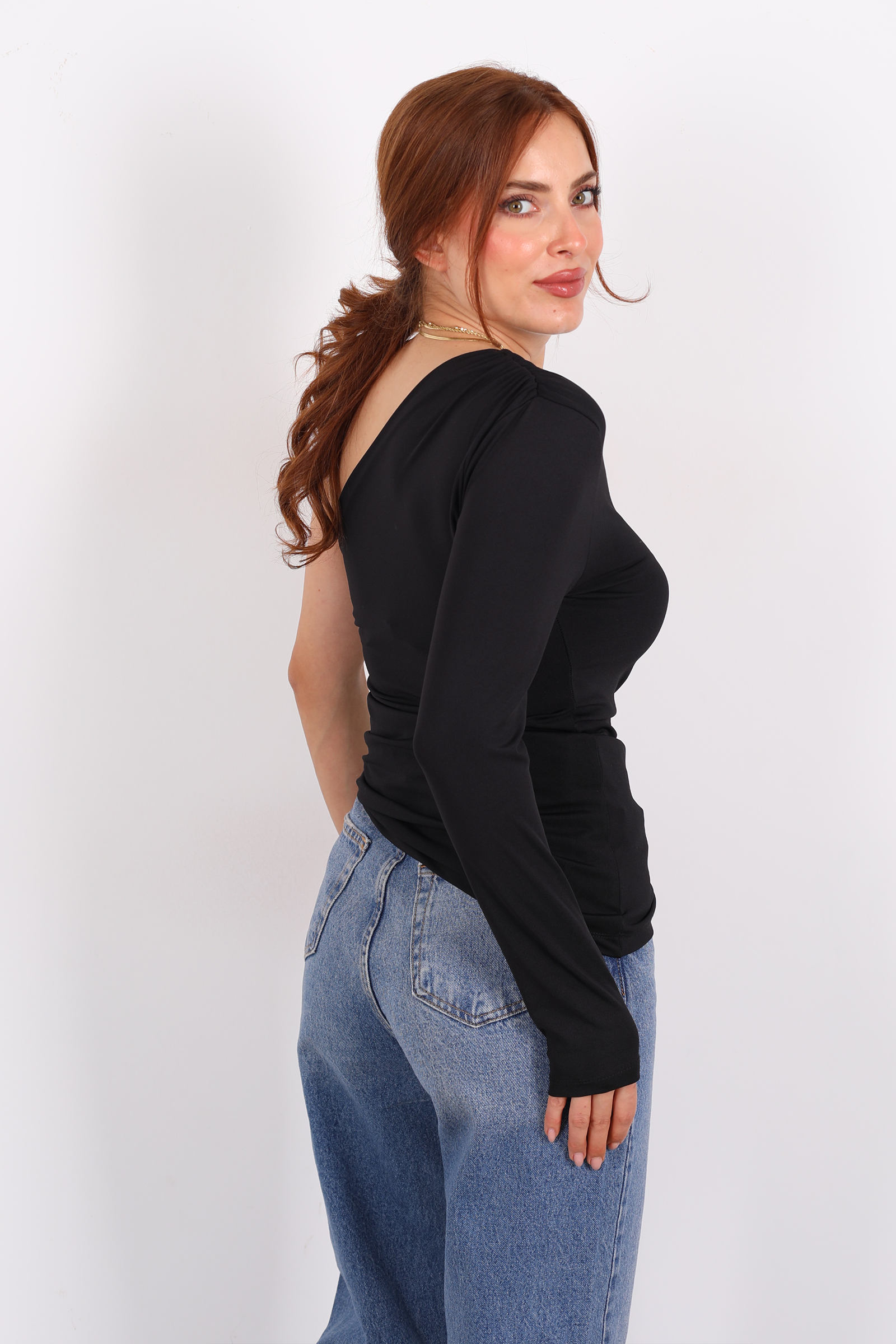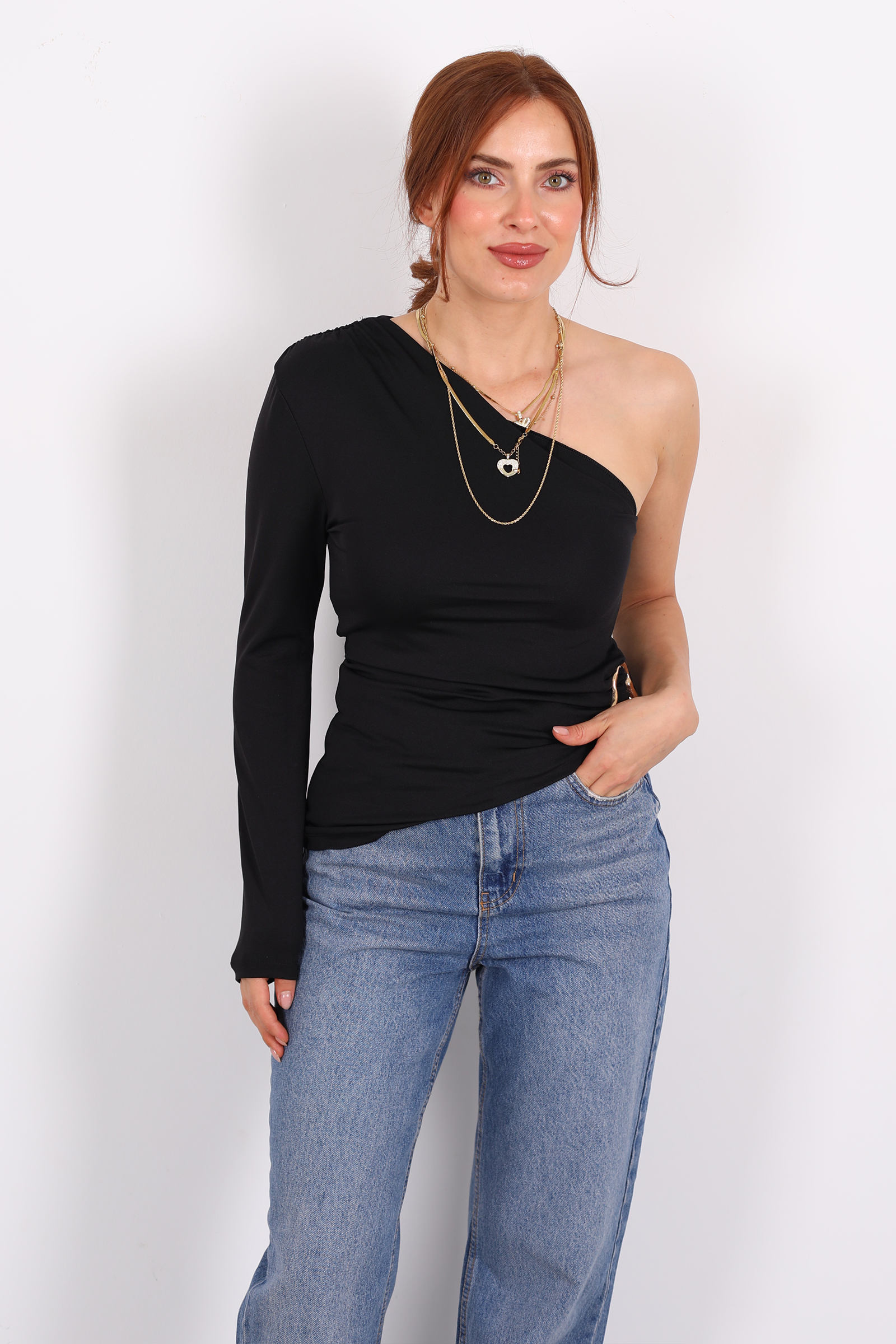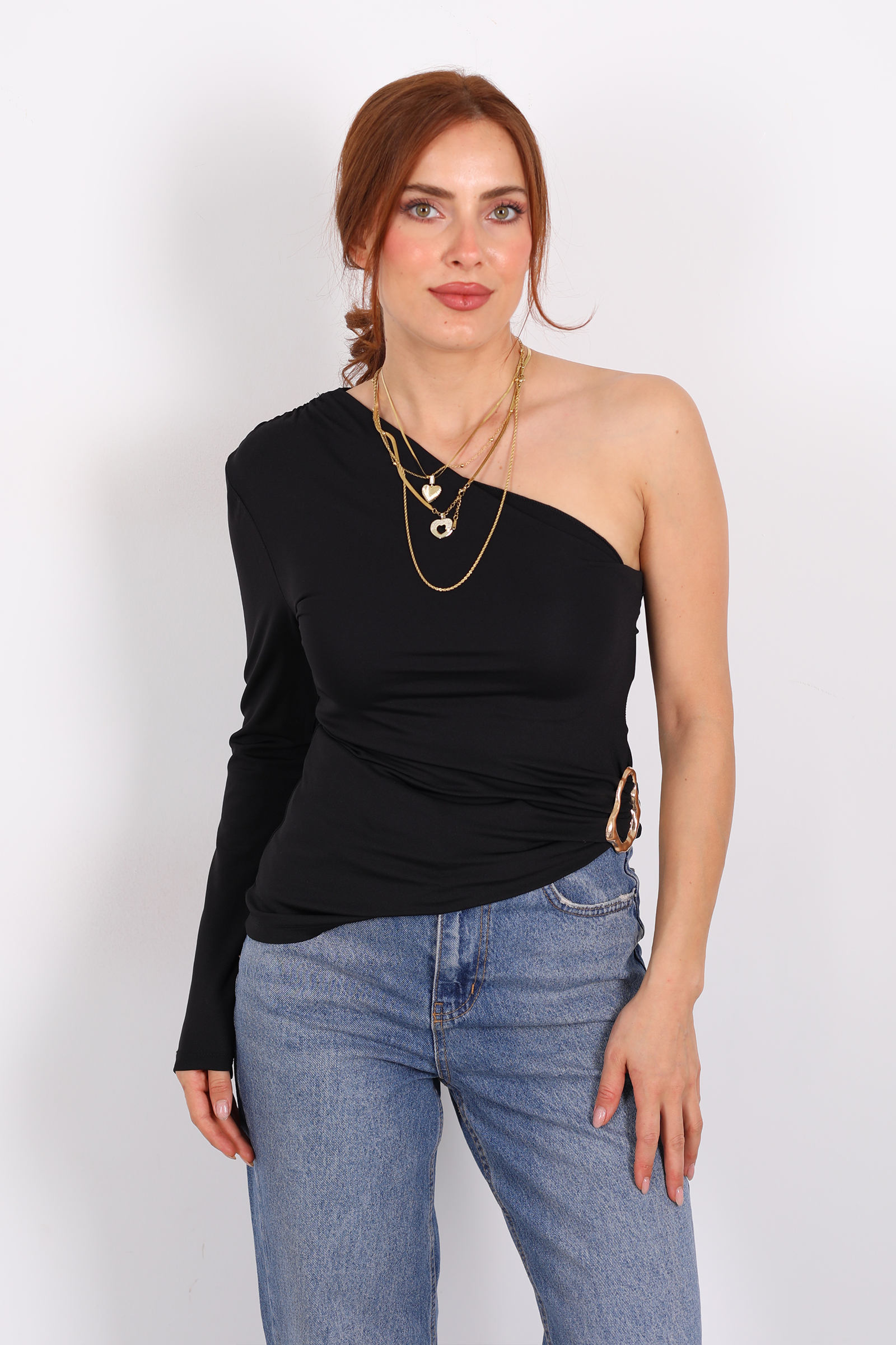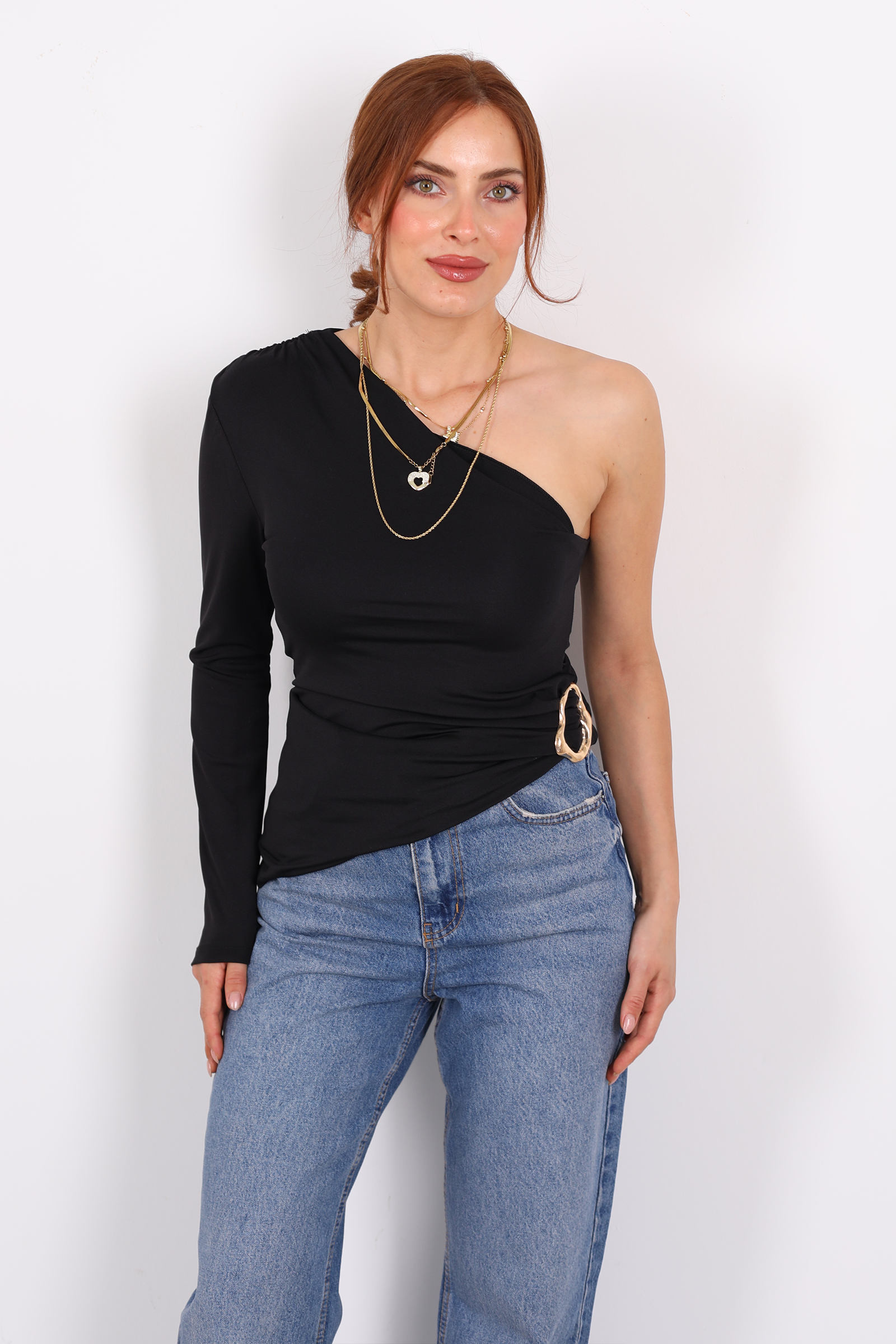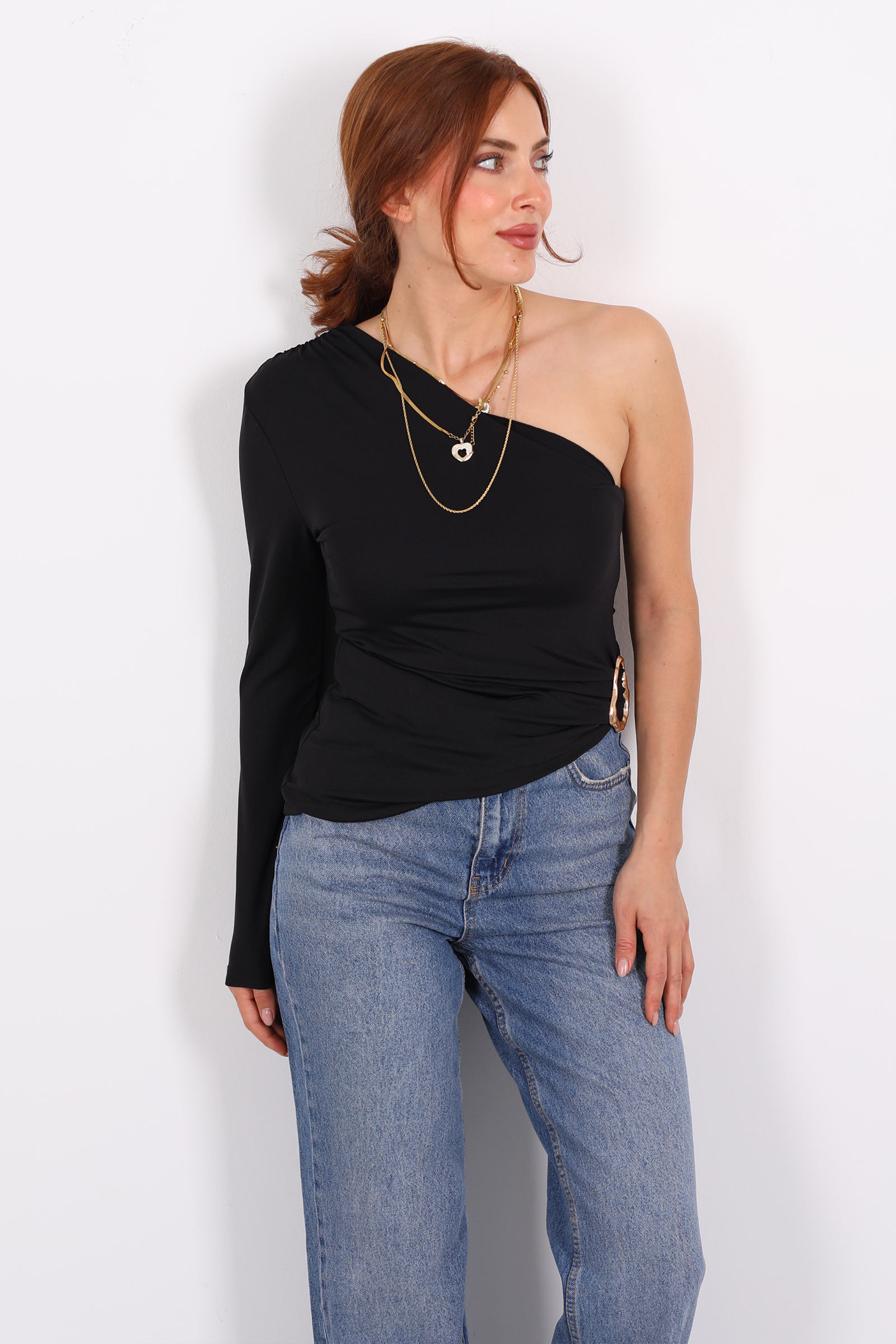 Tek Kol Toka Detaylı Siyah Kadın Bluz