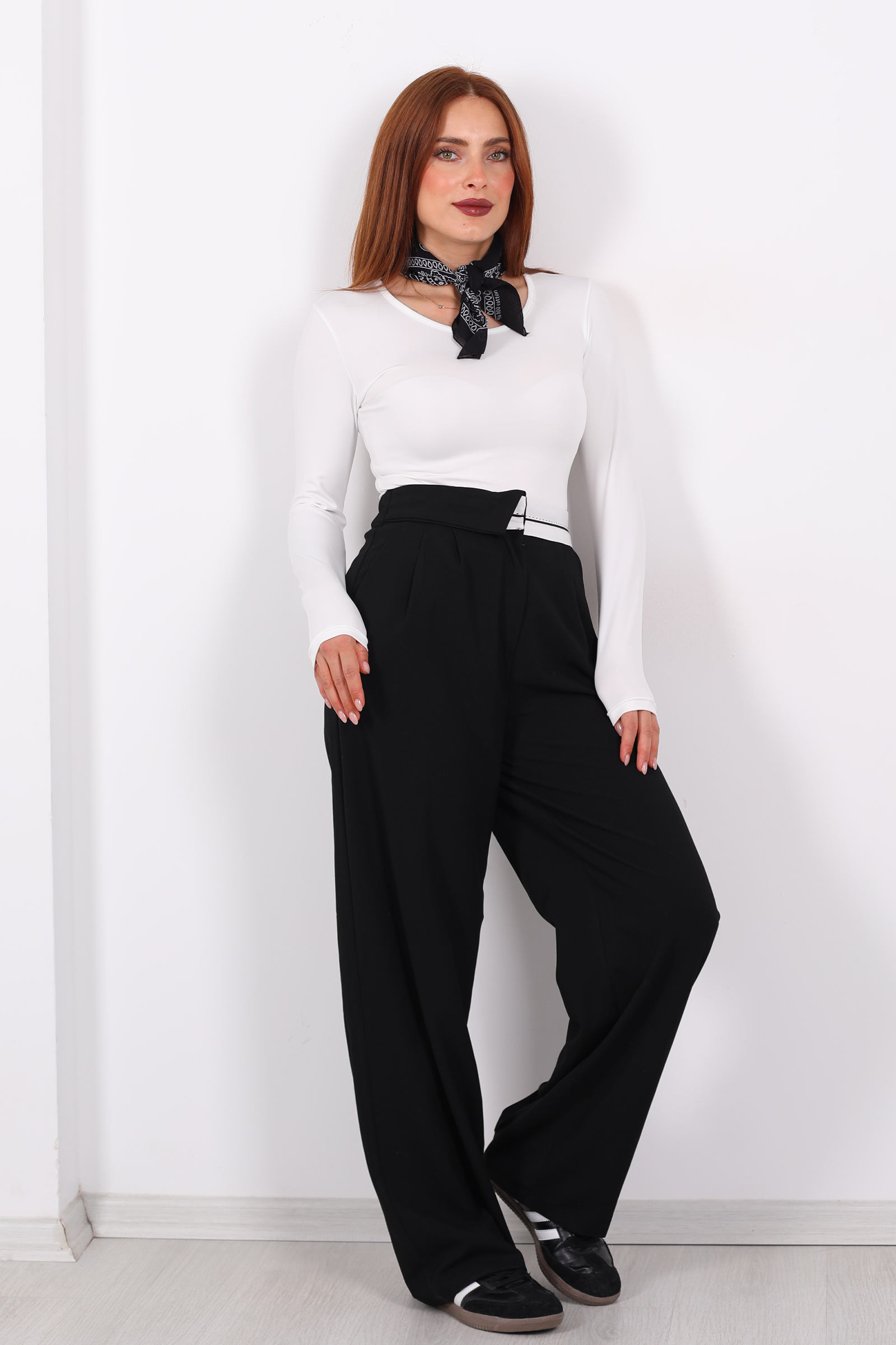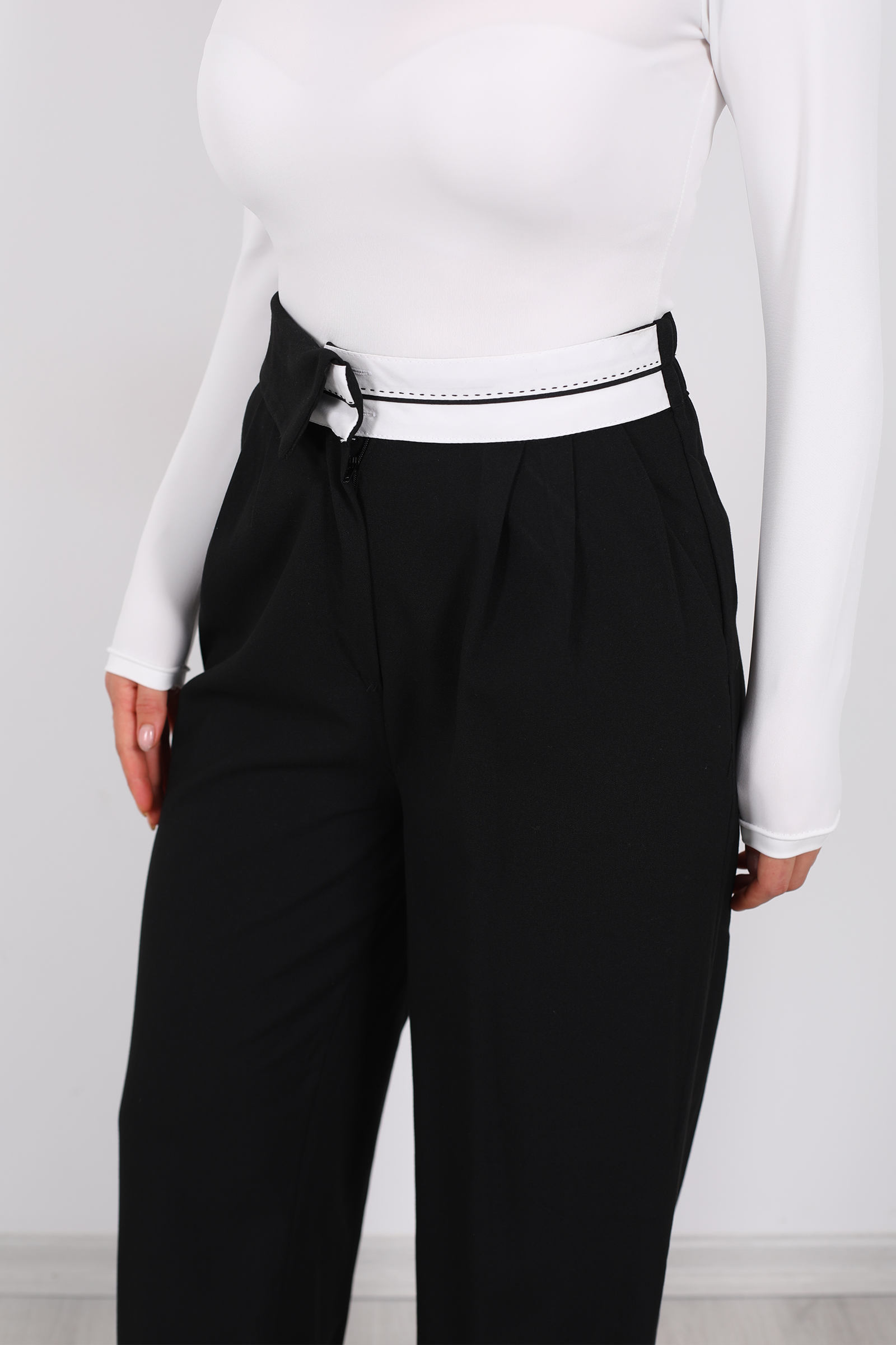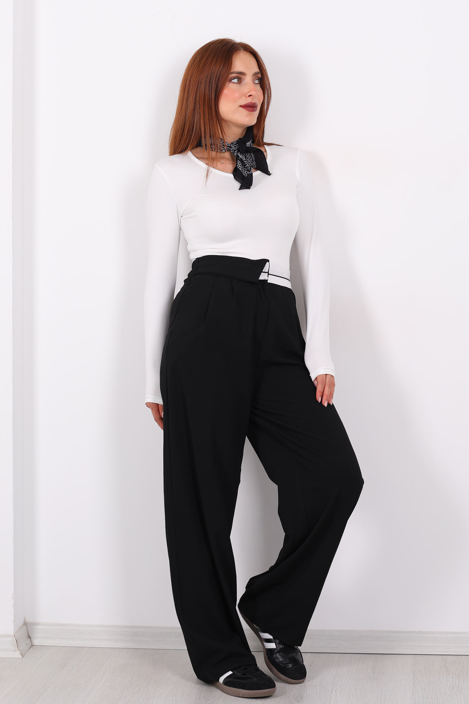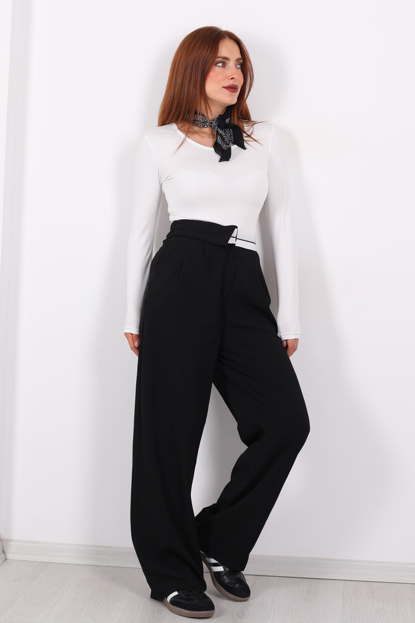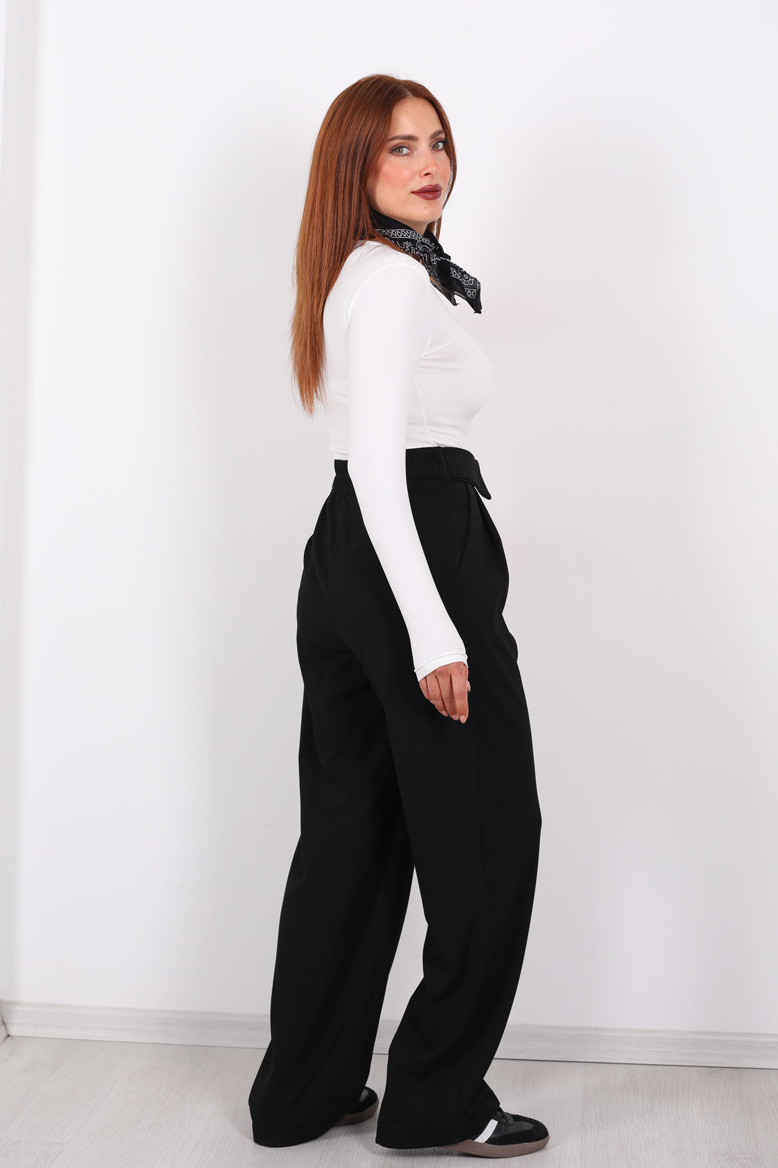 Bu şık ters kemer detaylı bol paça siyah kumaş pantolon, modern ve zarif bir duruş sunarken günlük yaşamdan iş ortamına kadar geniş bir kullanım alanı sağlıyor. %63 polyester, %33 viskon ve %4 elastan içeriğiyle hem konforlu hem de dökümlü bir yapıya sahip. Elastan sayesinde hareket özgürlüğü yüksek ve rahat bir kullanım sunuyor.