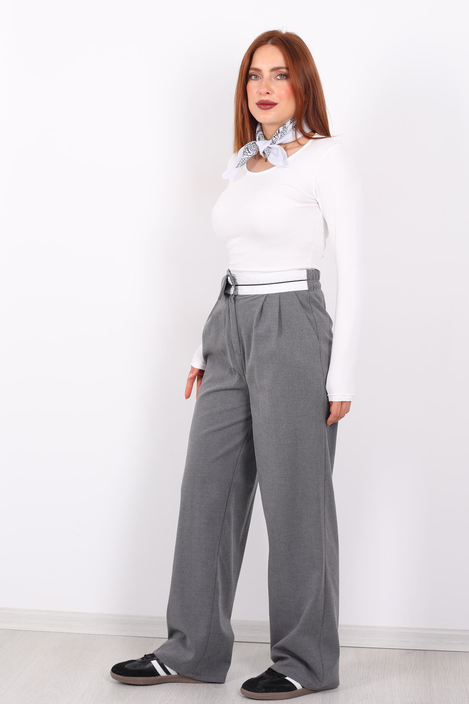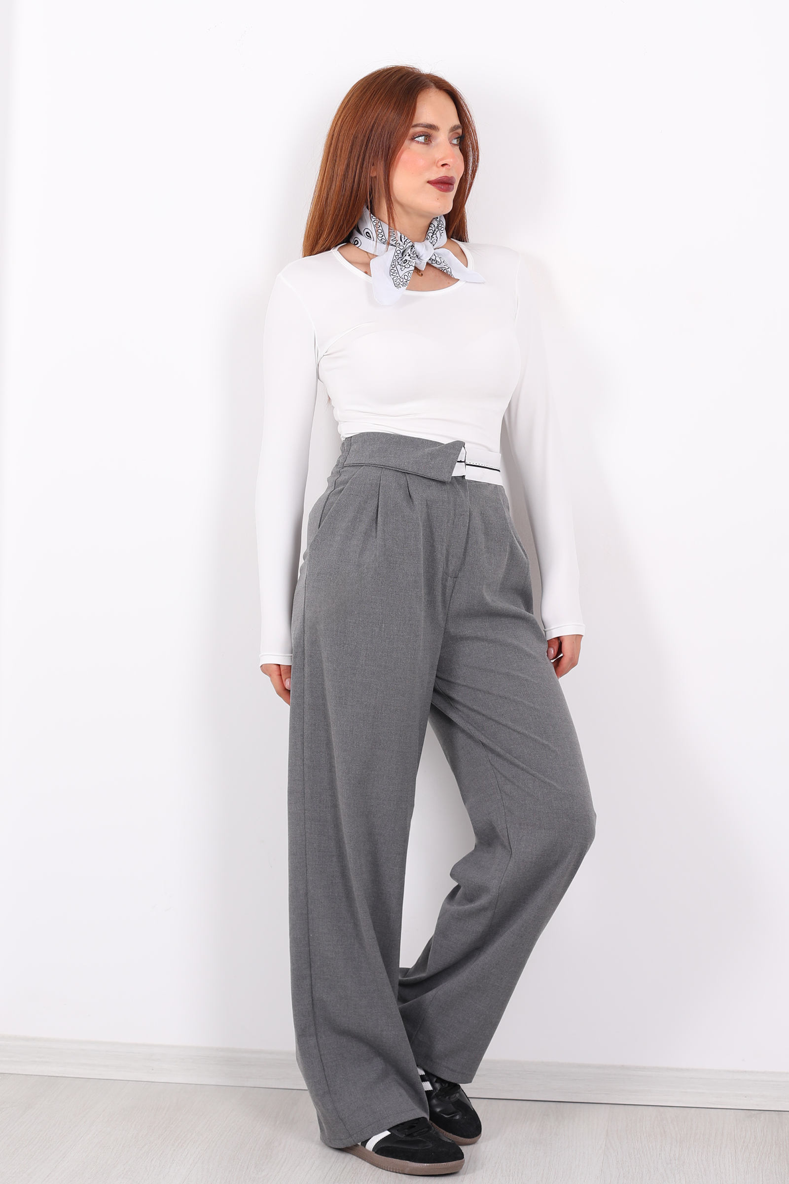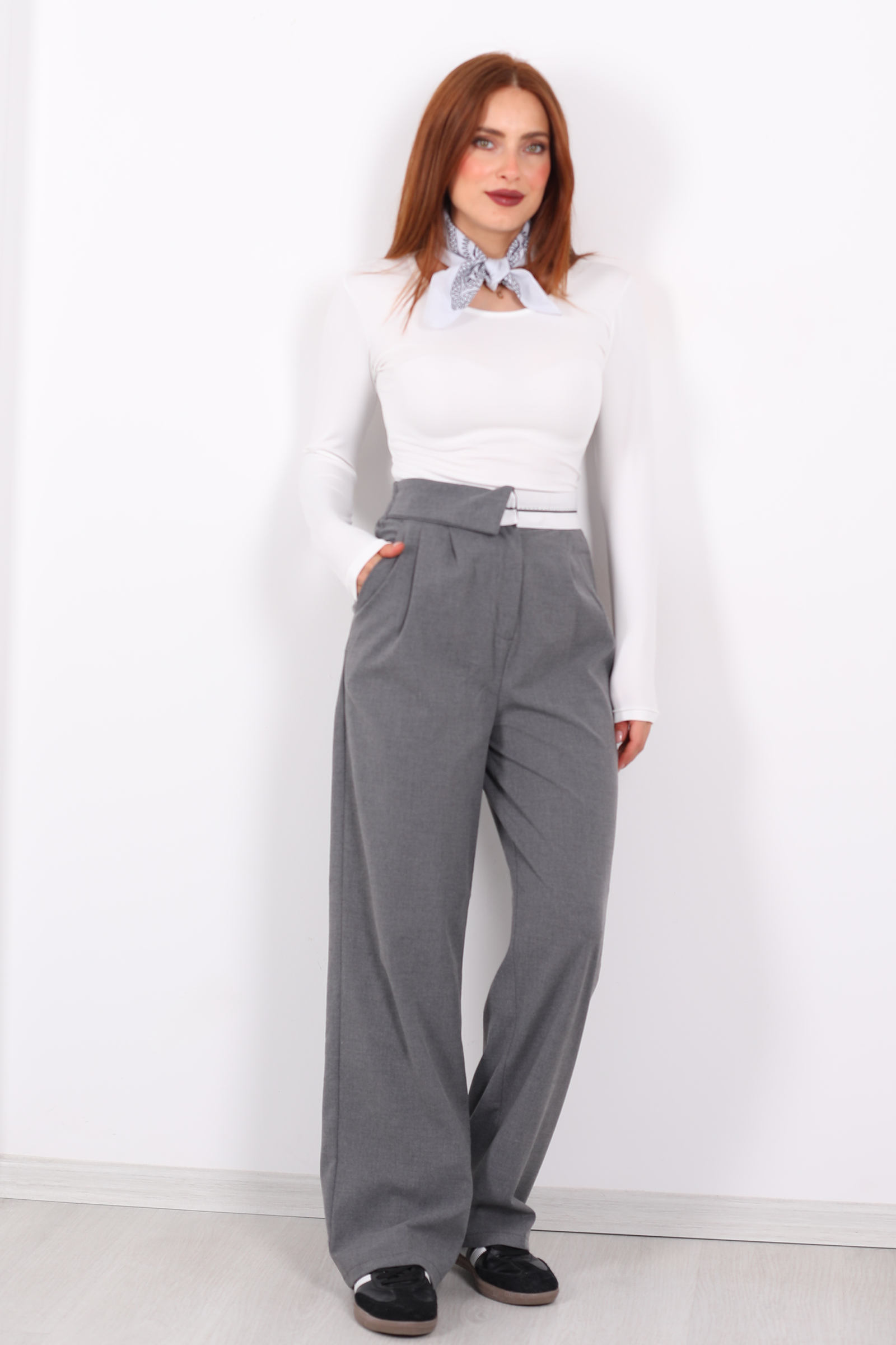 Şık ve sofistike bir dokunuş arayan kadınlar için tasarlanmış bu ters kemer detaylı bol paça antrasit kumaş pantolon, modern kesimiyle dikkat çekiyor. 108 cm’lik paça boyu ve bol paça kesimi sayesinde hem rahat bir duruş hem zarif bir siluet sunuyor. Beldeki ters kemer detayı, klasik kumaş pantolonlardan farklılaşarak tasarıma dinamik ve stil dolu bir hava kazandırıyor.