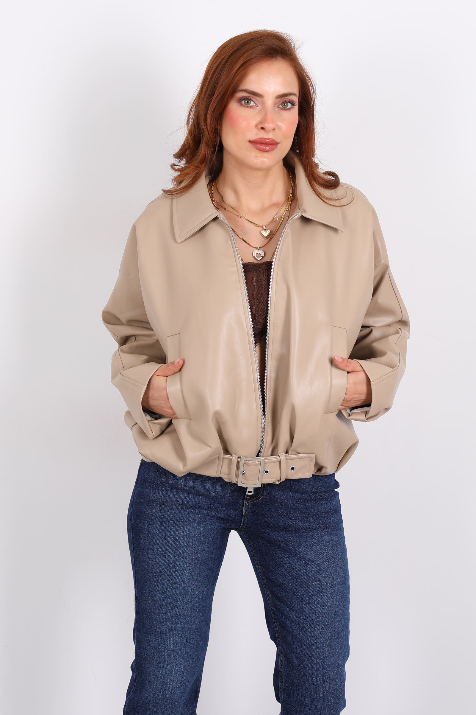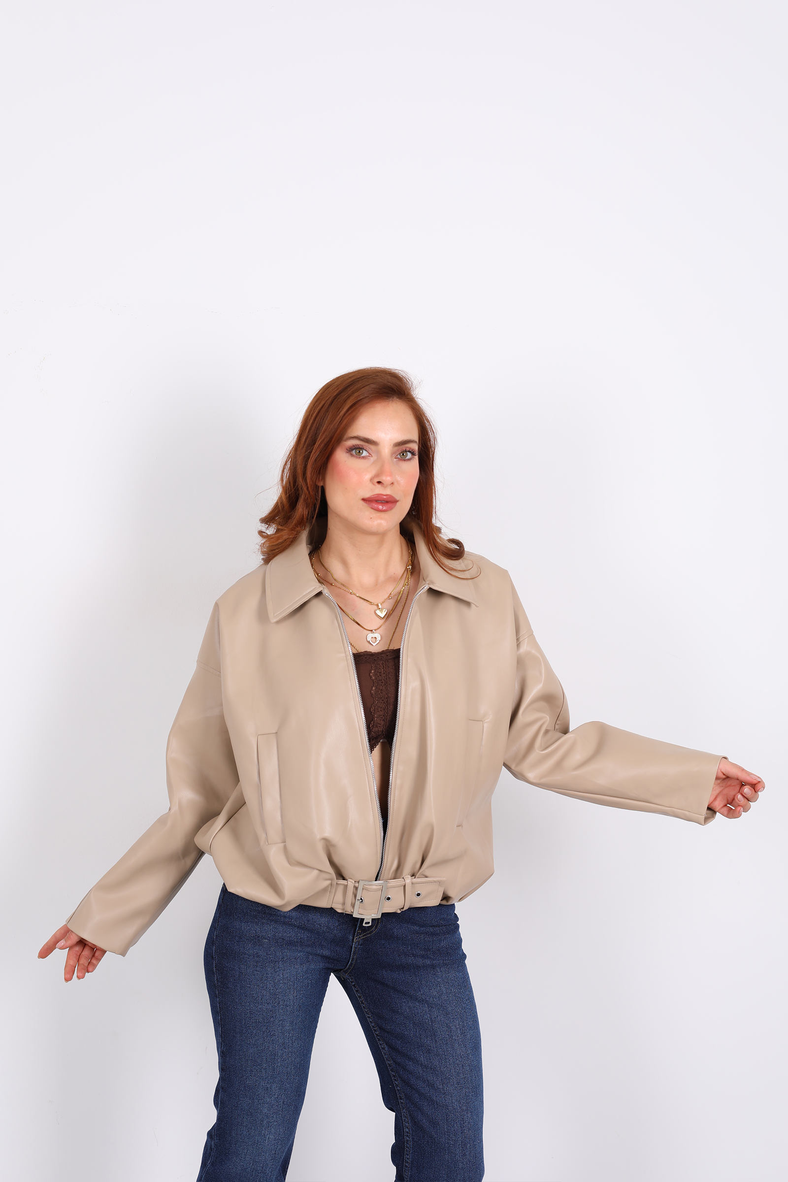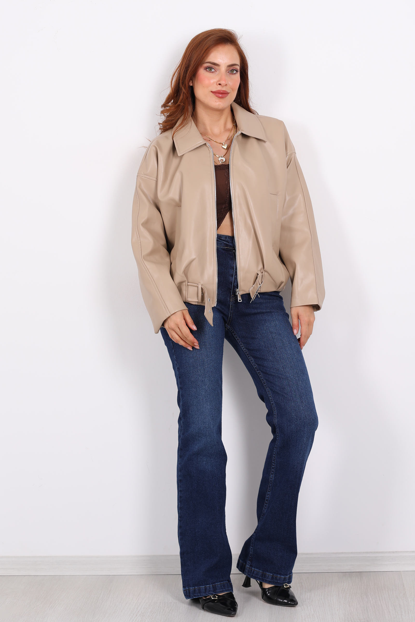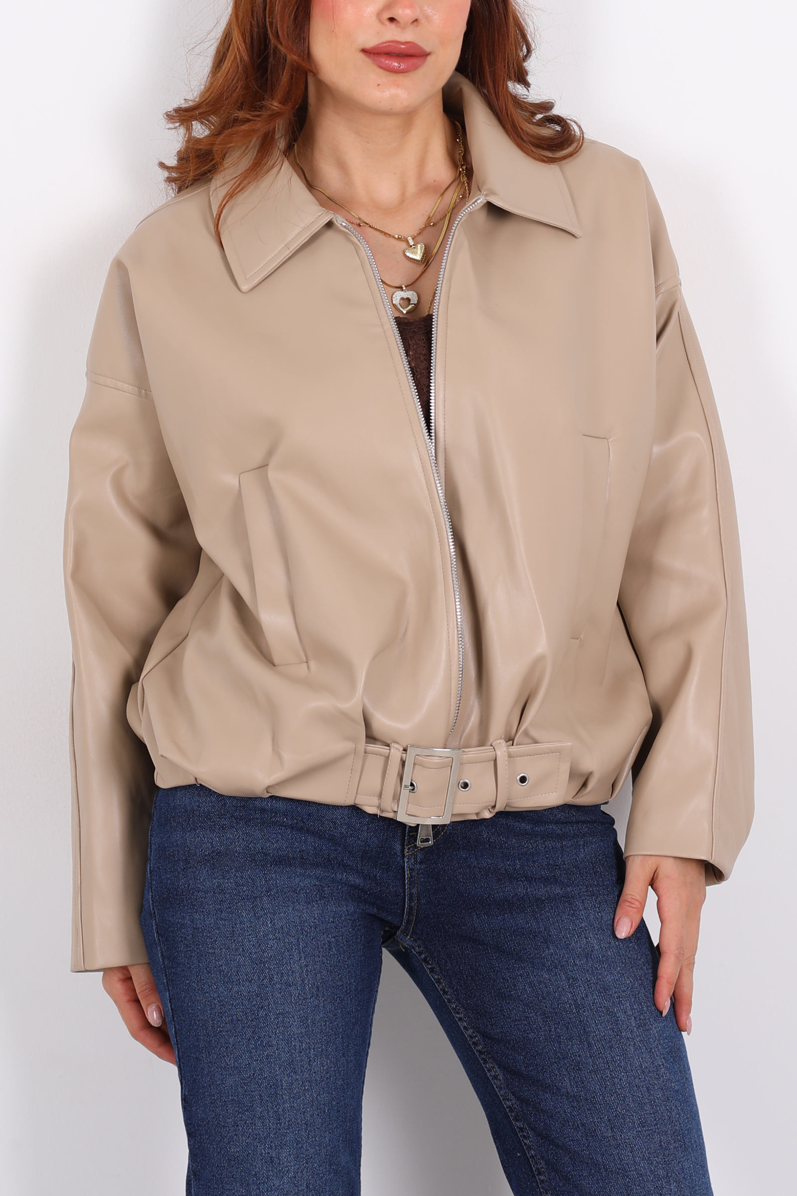 Bej tonunda deri mont, kemerli ve toka detaylarıyla feminen bir güç ve zarafet sunuyor. Kemer kısmındaki tokalar, belinizi vurgulayarak şık bir siluet yaratırken, montun yapısı klasik bir deri parçası olmasına rağmen sportif bir hava da taşıyor.Yapay deri kullanılan bu model, hem hayvan dostu hem de modern bir yaşam tarzına uygun. Doku olarak cilt üzerinde pürüzsüz ve hafif parlak bir görünüm sunar.