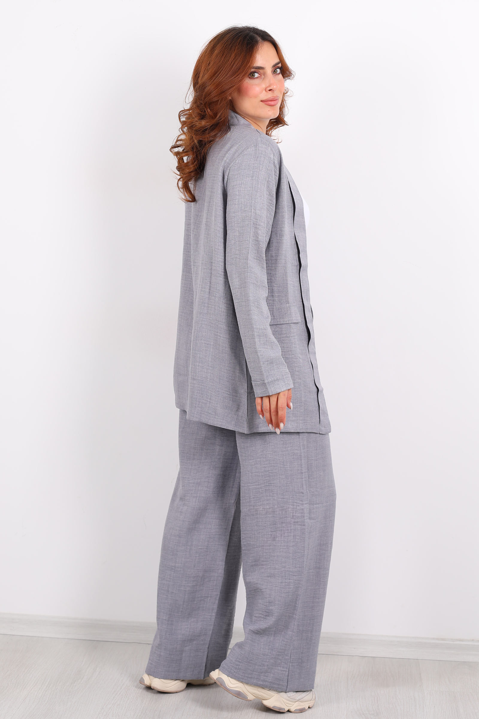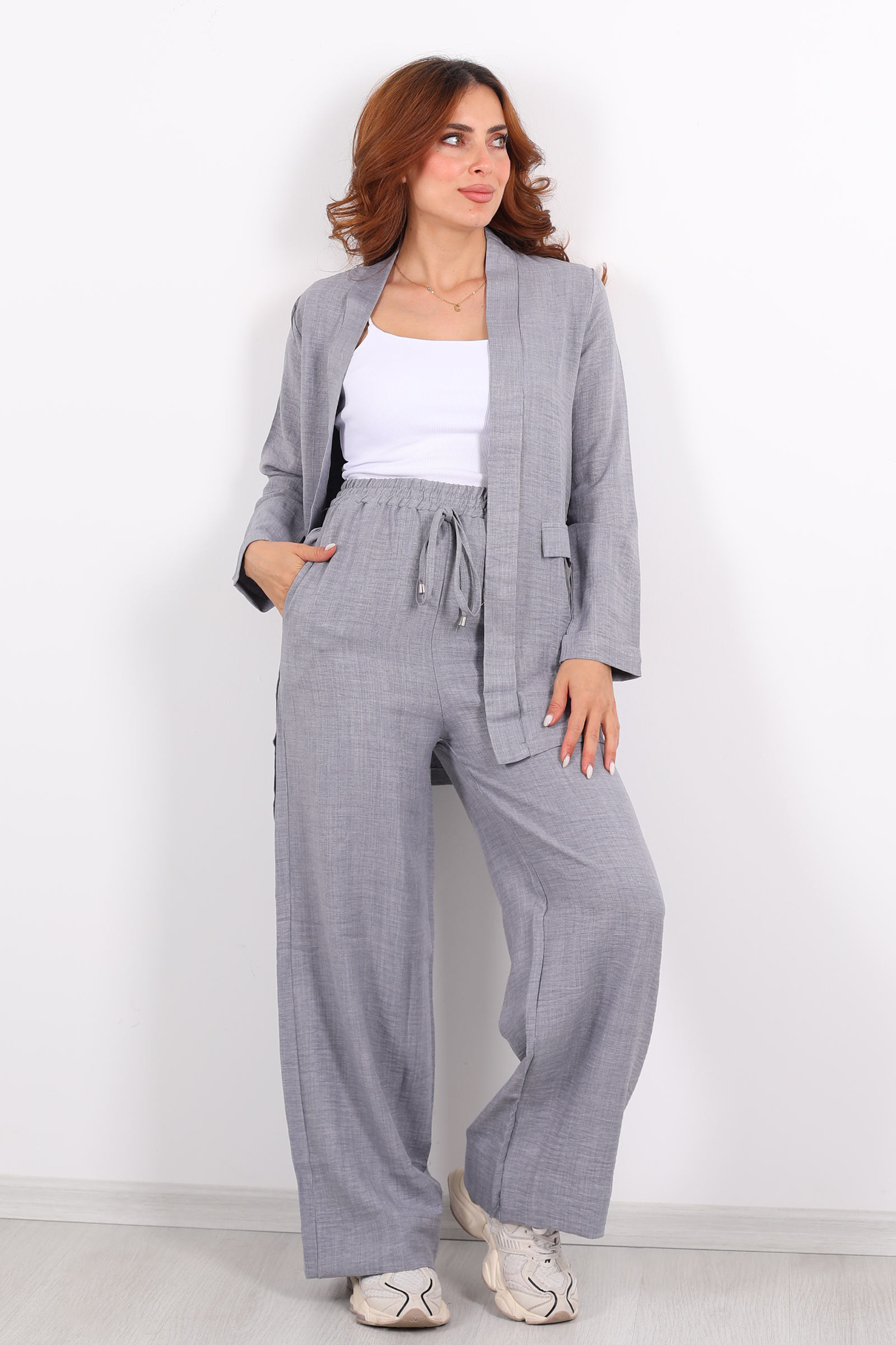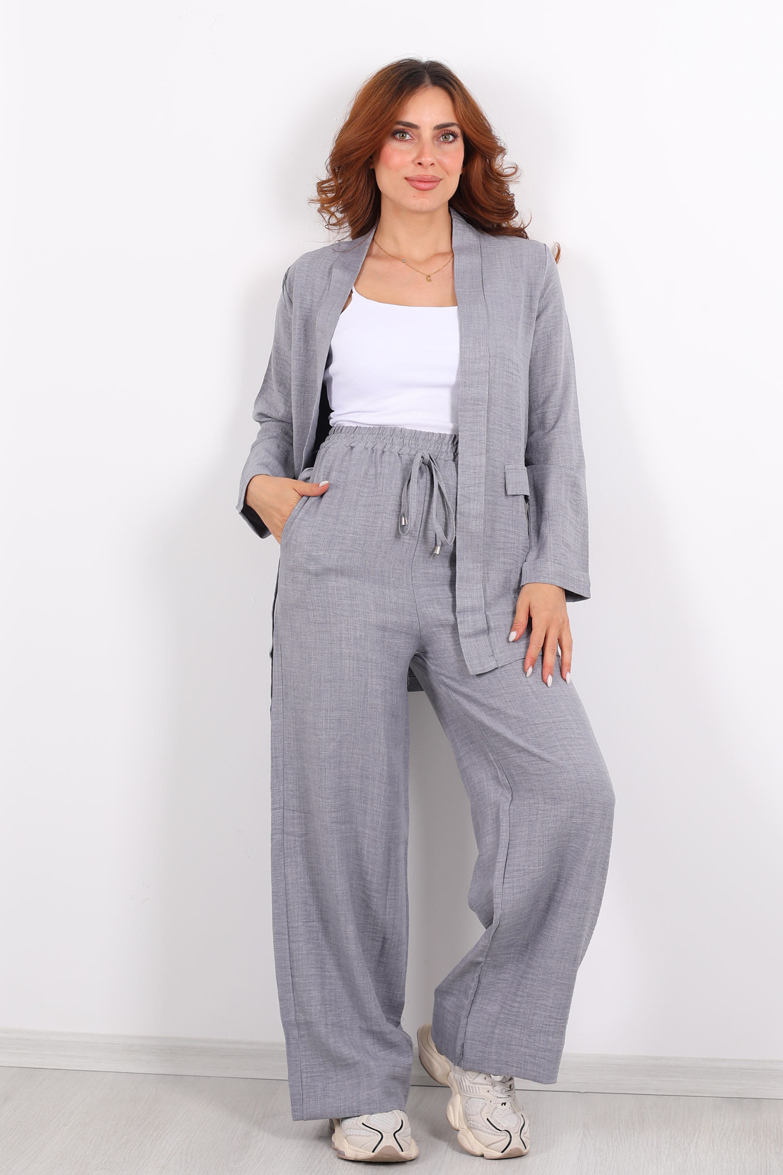 Sıcak yaz günlerinde hem şık hem de rahat bir kombin arayanlar için ideal olan bu üçlü takım, %100 yerli üretim olup, pamuk, polyamid ve keten karışımı kumaşıyla nefes alabilirlik ve konfor sunar. Gri tonlarıyla zarif bir görünüm sağlayan takım, oversize blazer ceket, crop top ve yüksek bel pantolondan oluşur. Günlük şıklığınızı tamamlayacak bu takım, ofis kombinlerinden hafta sonu buluşmalarına kadar geniş bir kullanım alanı sunar.