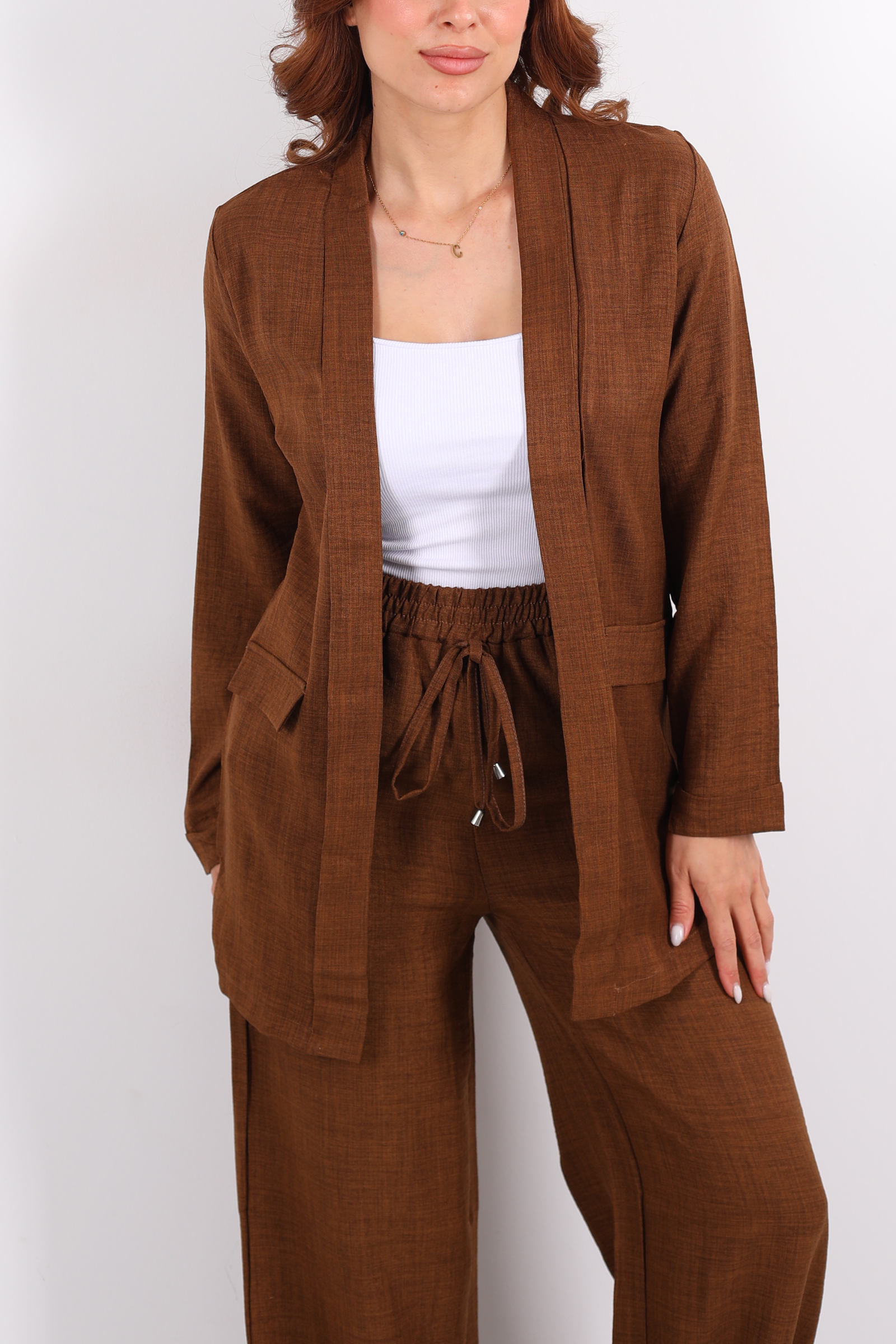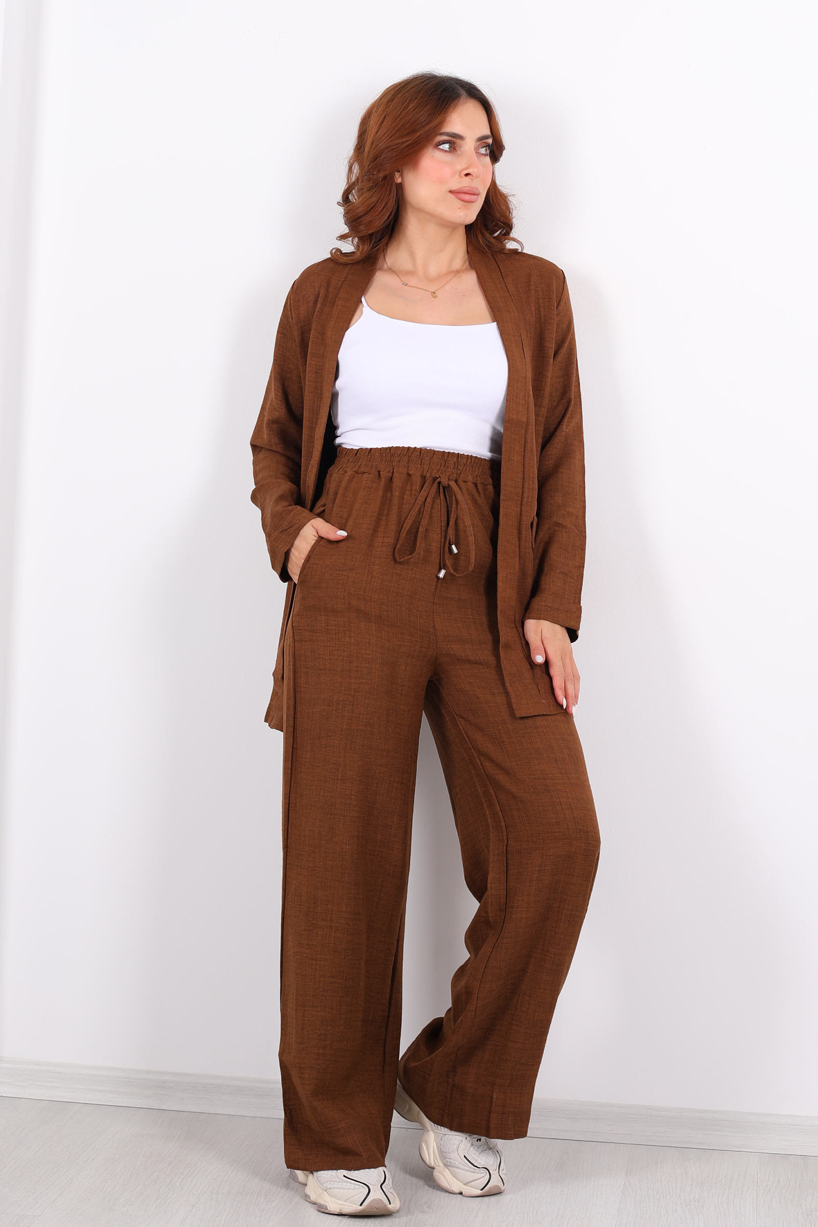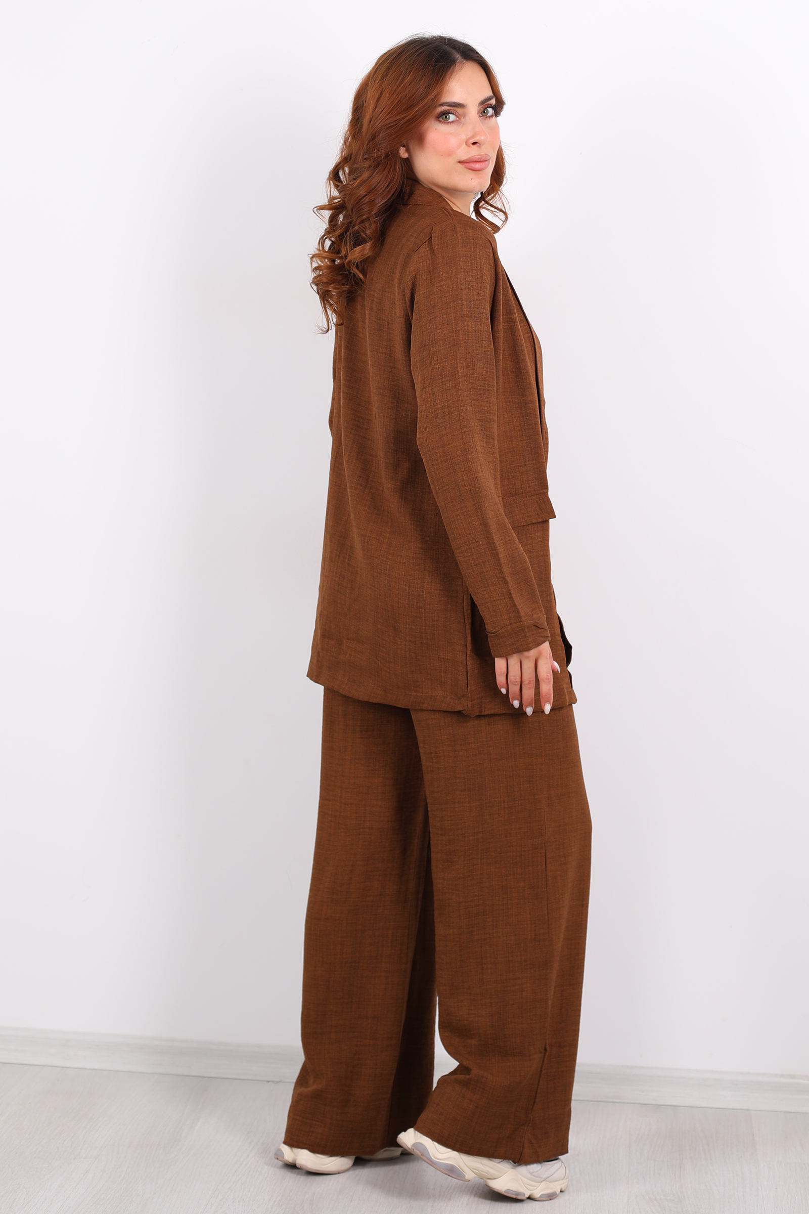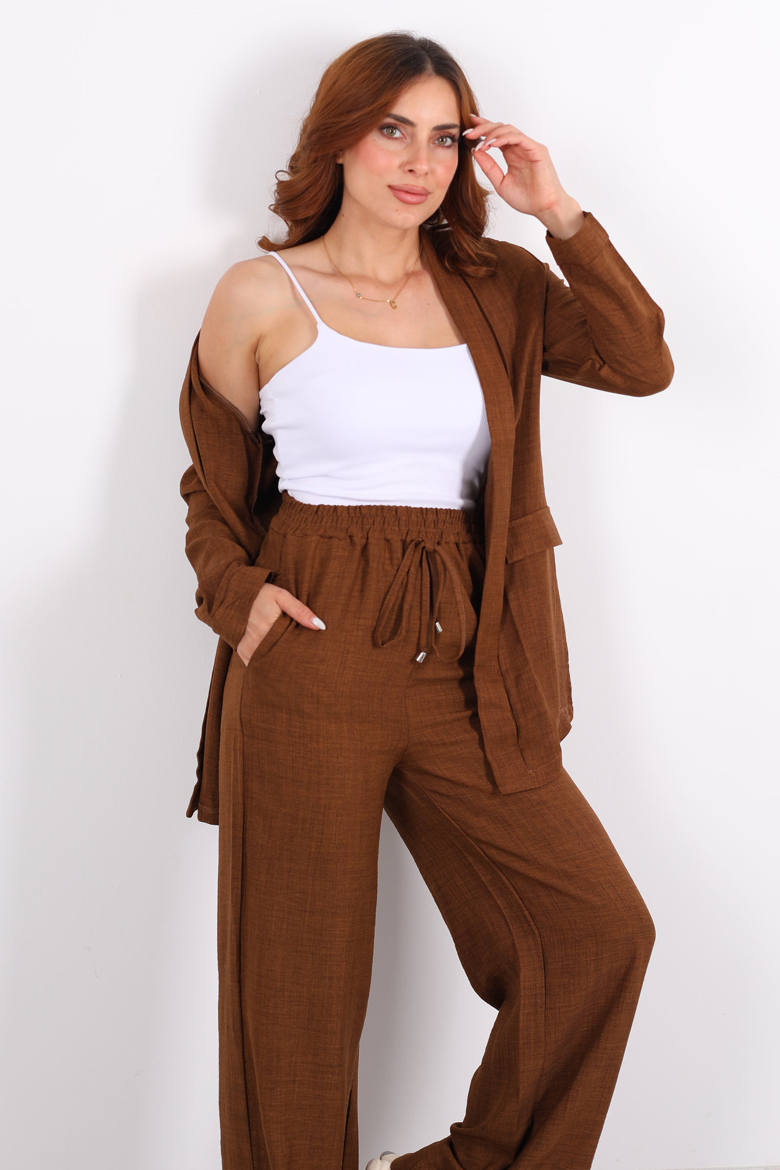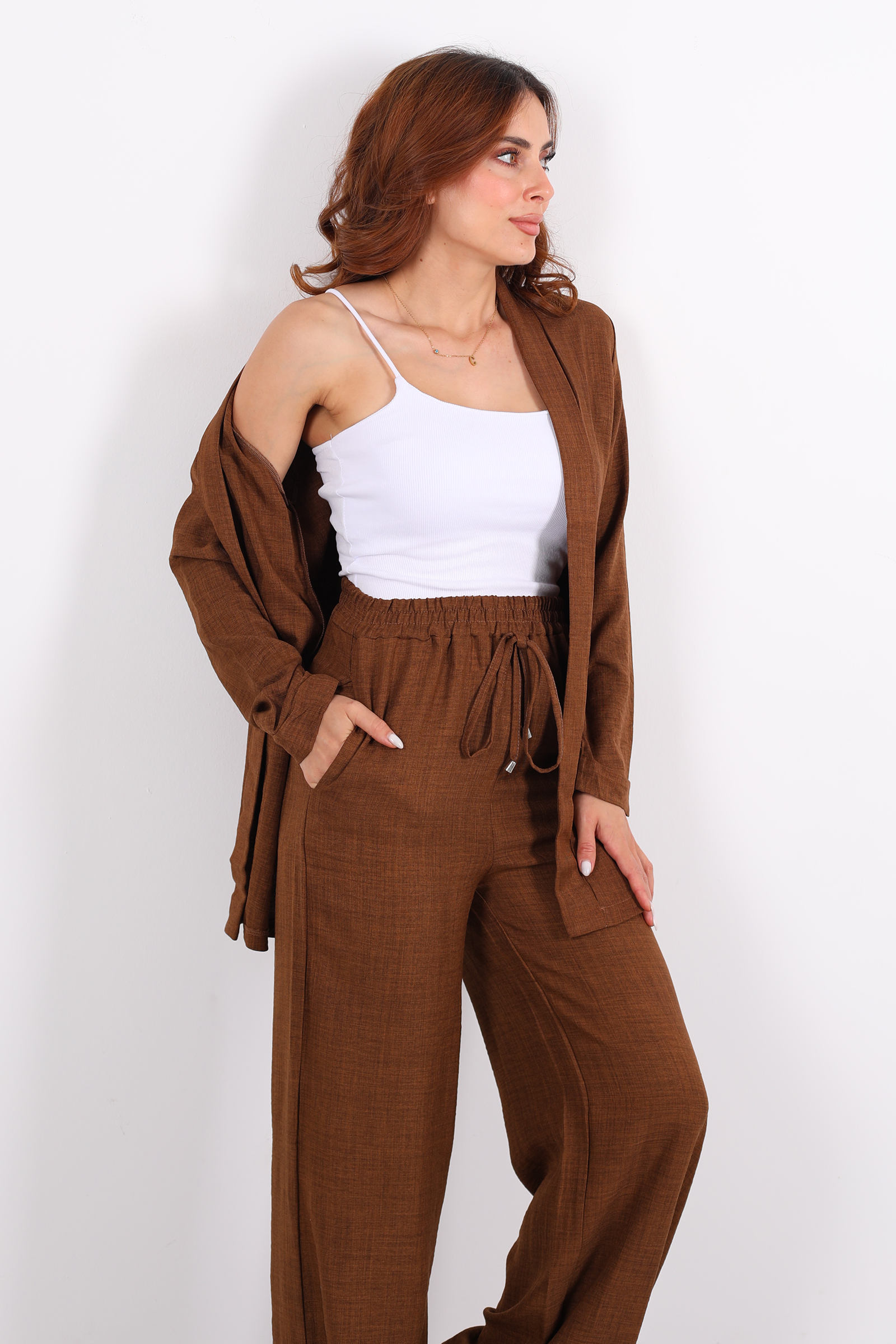 Doğadan ilham alan sıcak kahverengi tonlarıyla tasarlanmış bu keten blazer takım, gardırobunuzun vazgeçilmezi olmaya aday. Oversize ceket, crop top ve yüksek bel pantolondan oluşan üçlü set, ketenin doğal dokusunu ve nefes alabilirliğini modern kesimlerle buluşturuyor. Günlük kullanımda konforu, özel günlerde ise zarafeti ön planda tutan bu takım, çok yönlü stiliniz için mükemmel bir seçenek.