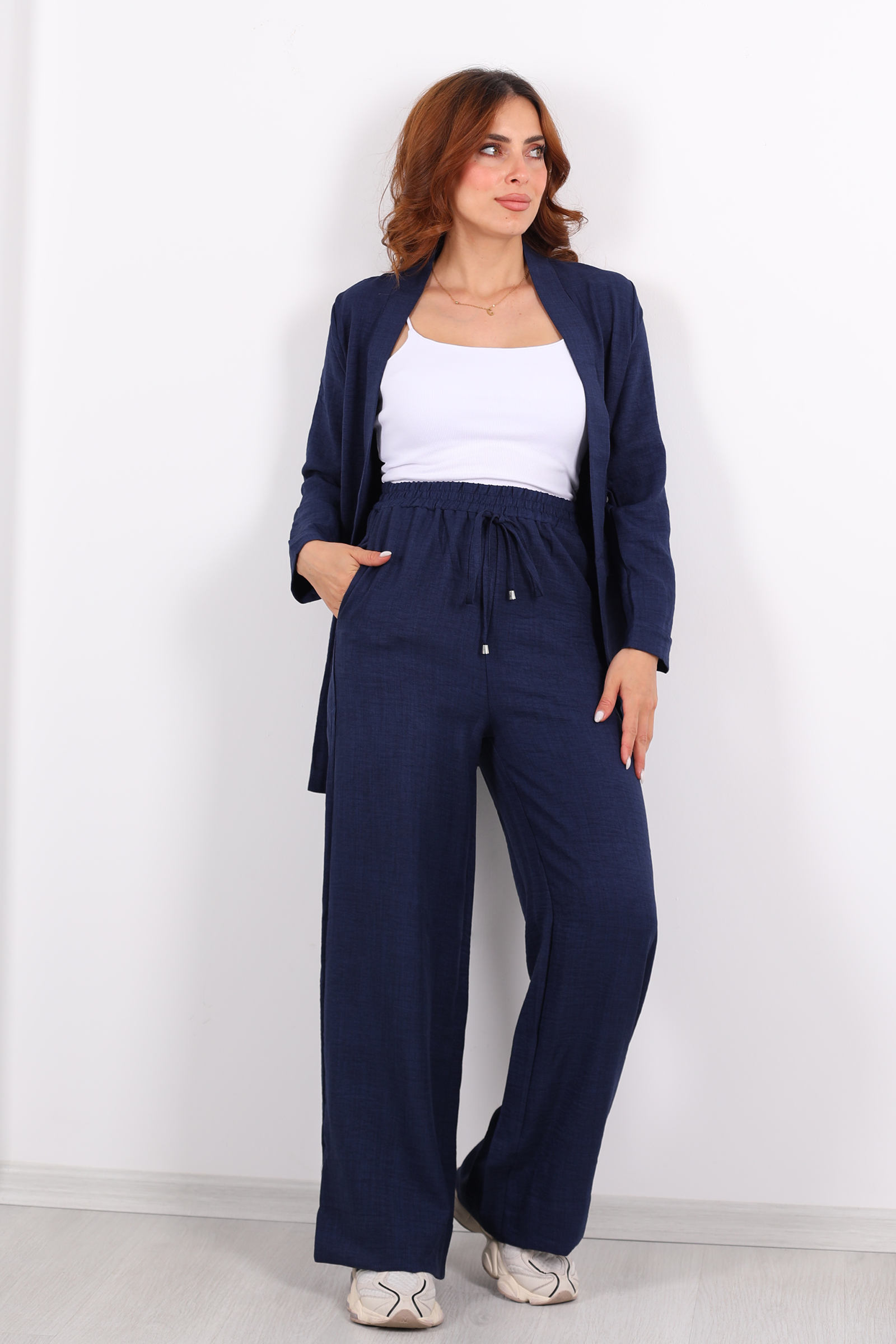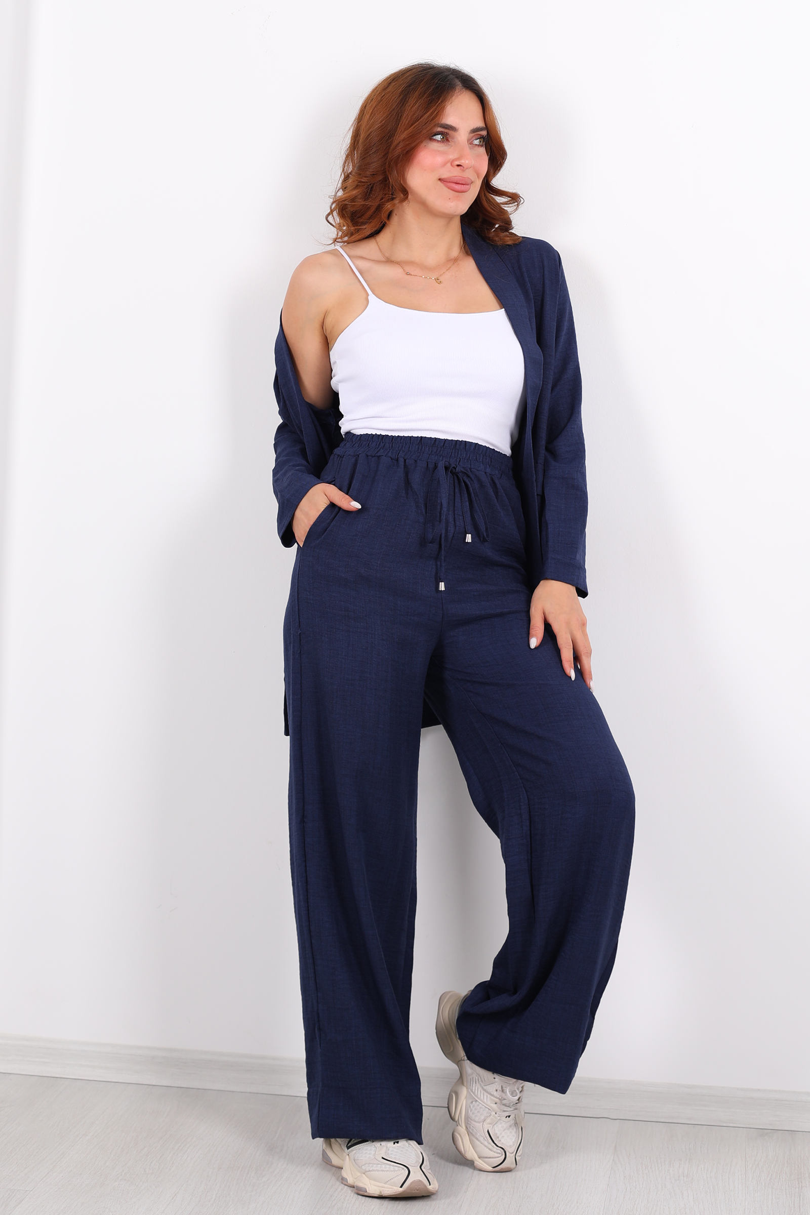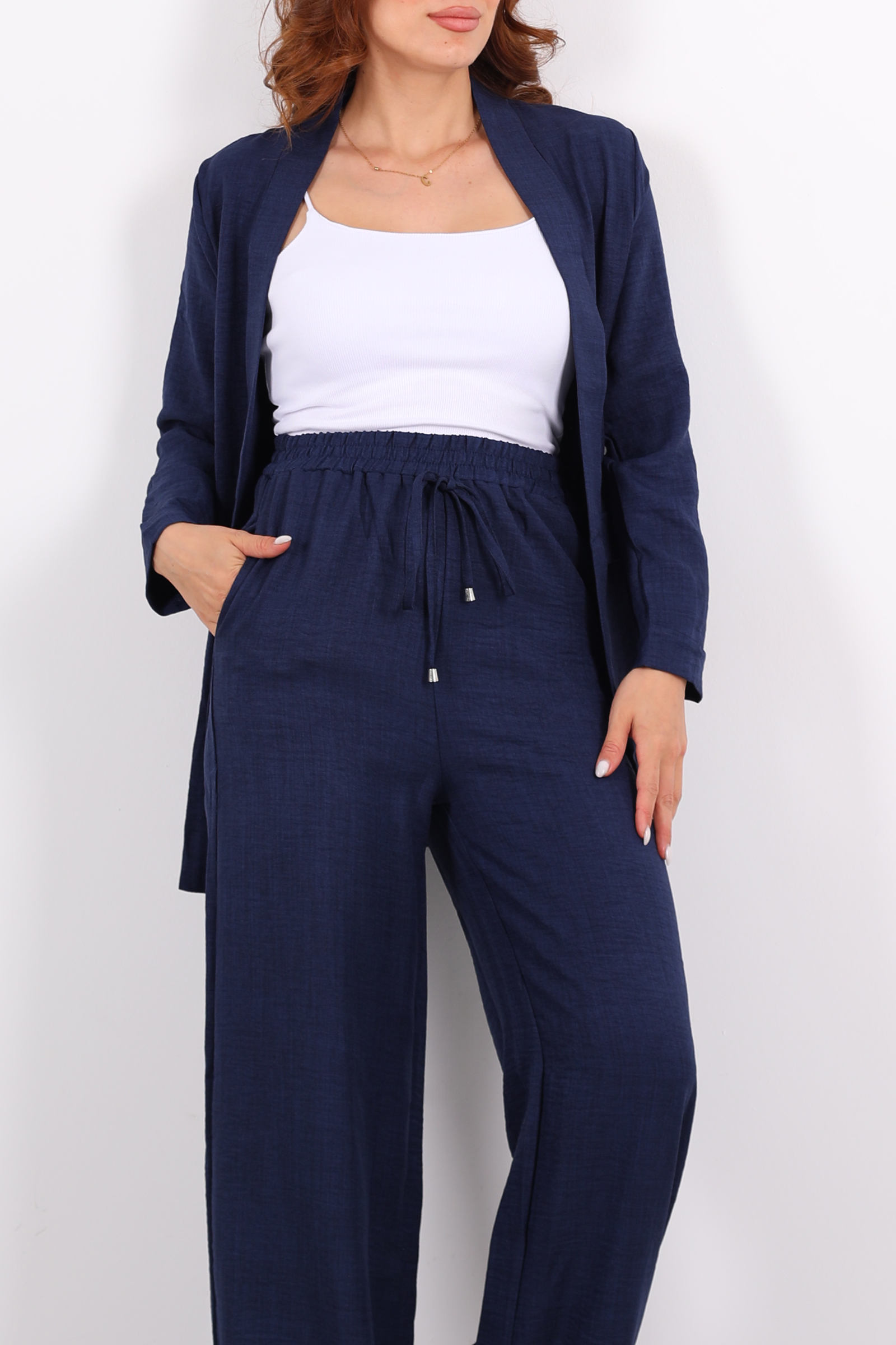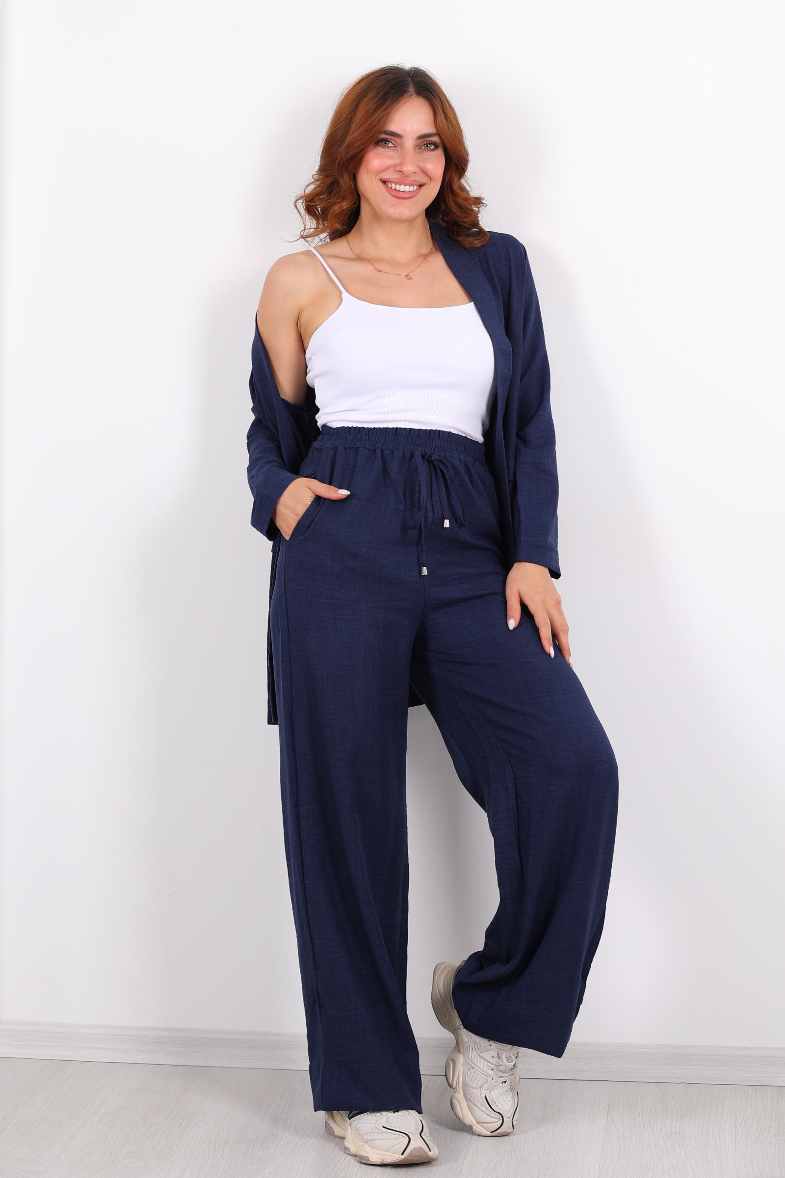 Bu takım, klasik siyah rengin güçlü duruşunu keten kumaşın ferah ve hissedilir dokusuyla buluşturuyor. Sadece bir kombin değil,bir ifade. Günlük ve özel görünümün kusursuz birleşimi bu set: Modern kesimiyle profesyonel bir hava katarken, keten dokusu sayesinde ağırlık hissettirmez.Rahat kesimiyle hareket özgürlüğü sağlar, siyahın gücüyle sade şıklığı temsil eder.