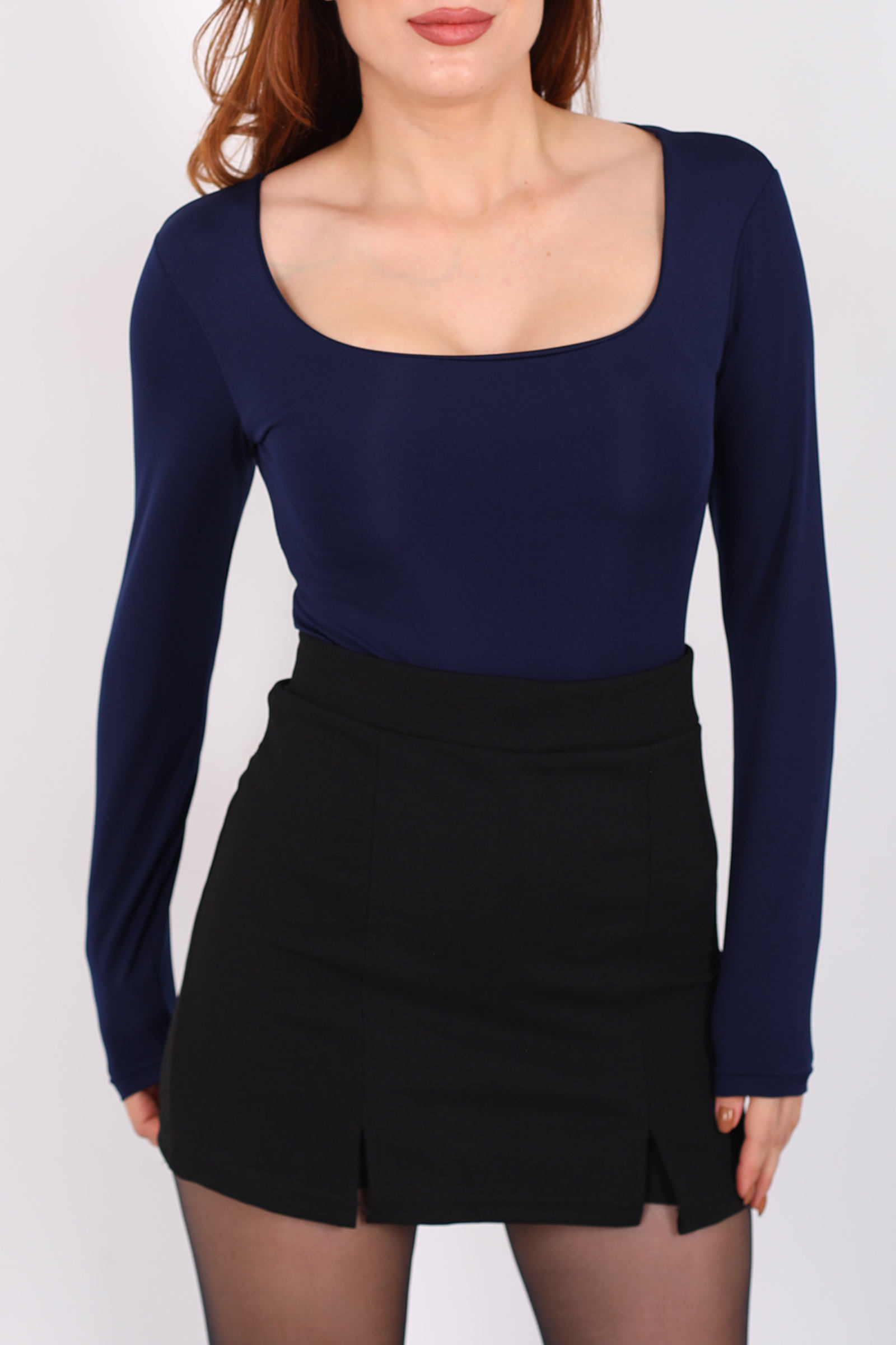 Uzun Kol Kare Yaka Lacivert Çıtçıtlı Body