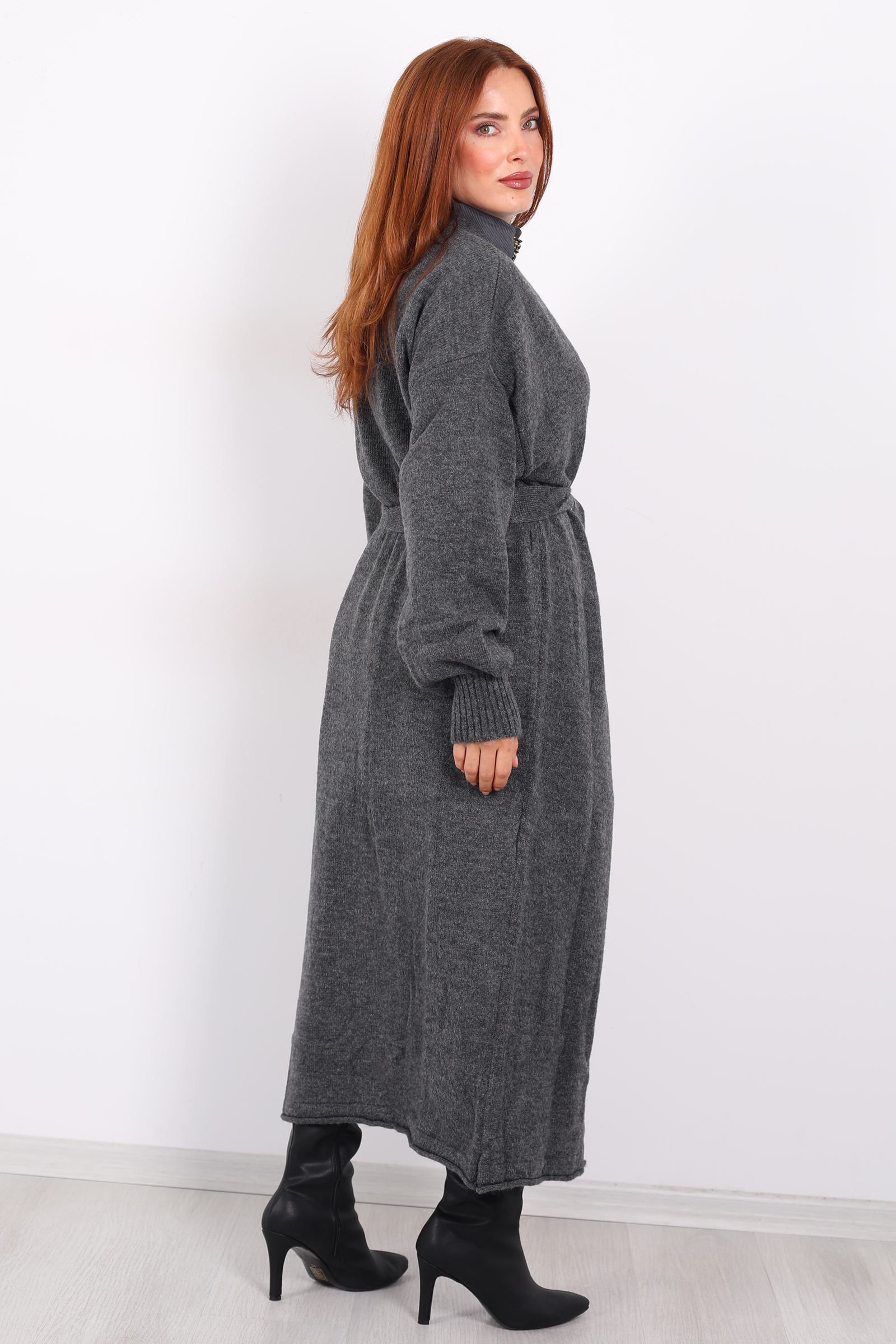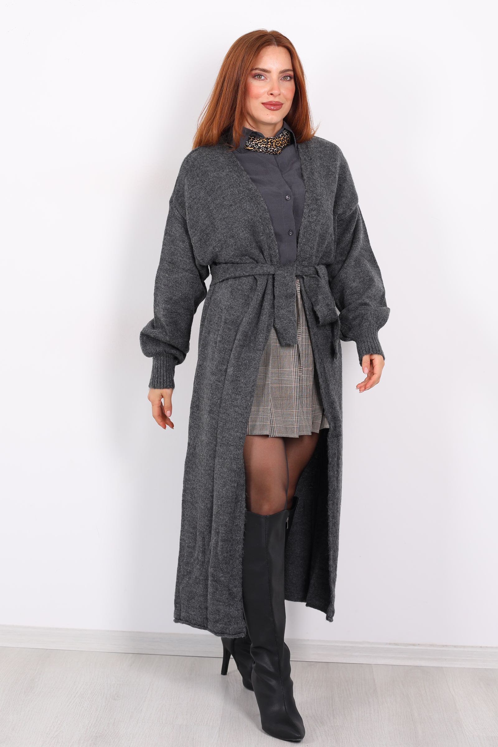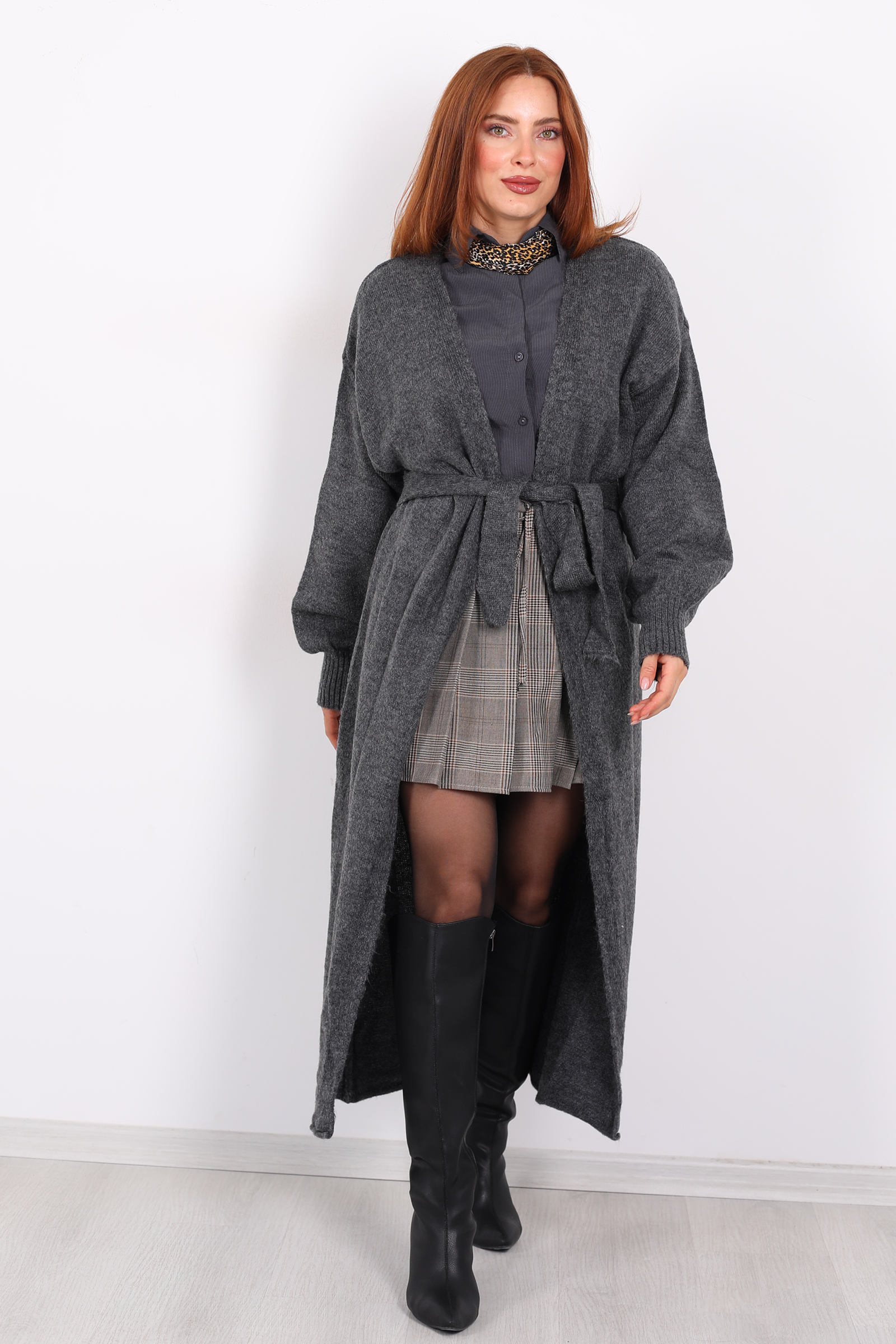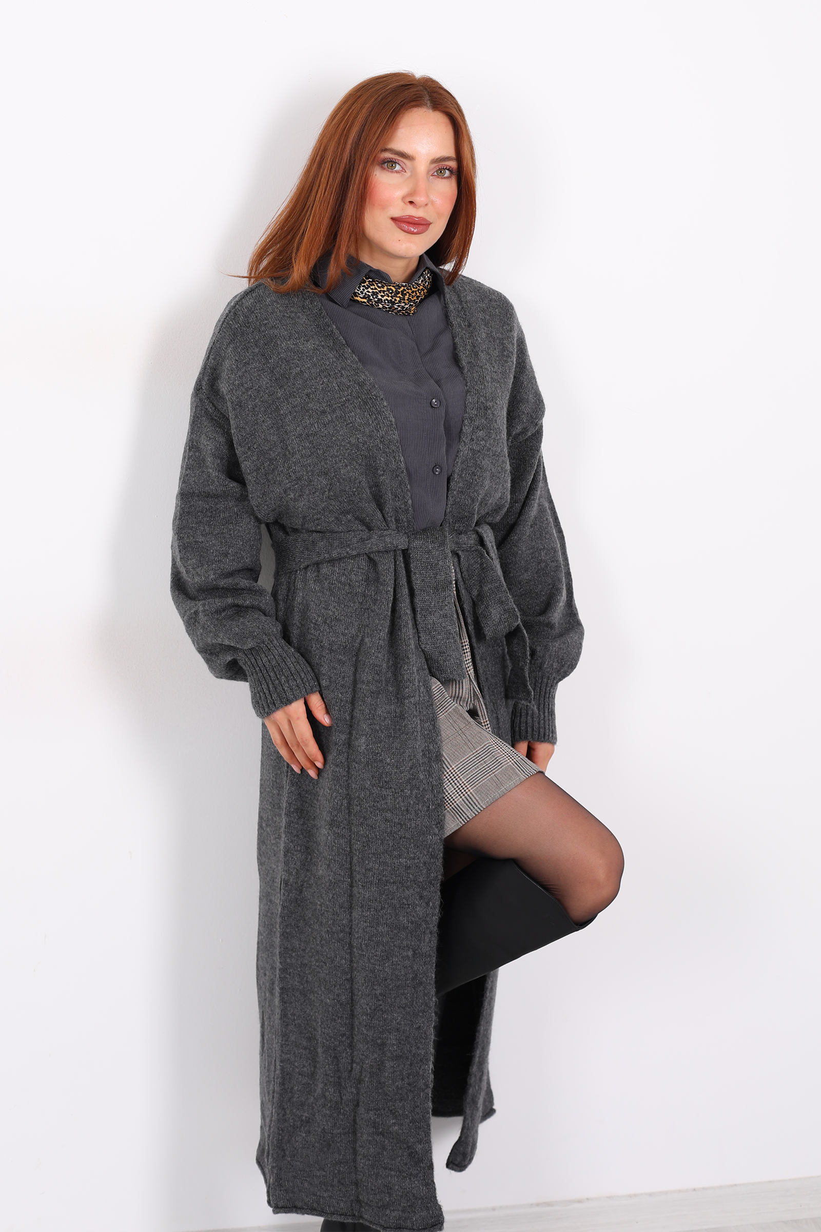 Bu zarif uzun kuşaklı füme triko hırka, minimalist tasarımı ve yumuşak dokusuyla stilinize sofistikasyon katıyor. Füme rengi, koyu gri ve mor tonları arasında dengeli bir denge sunarak hem gündelik hem de şık kombinlerde kolayca kullanılabilir.