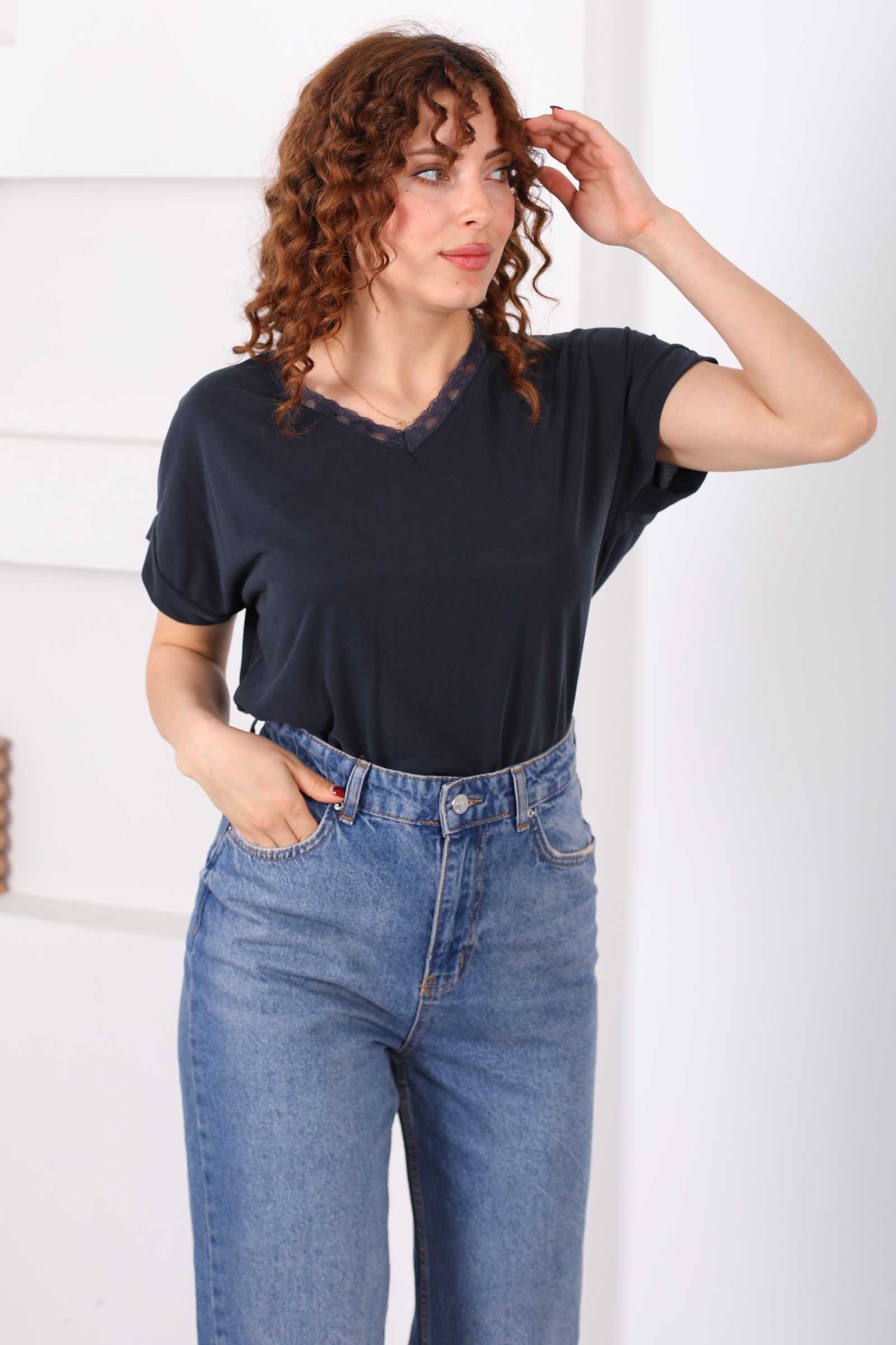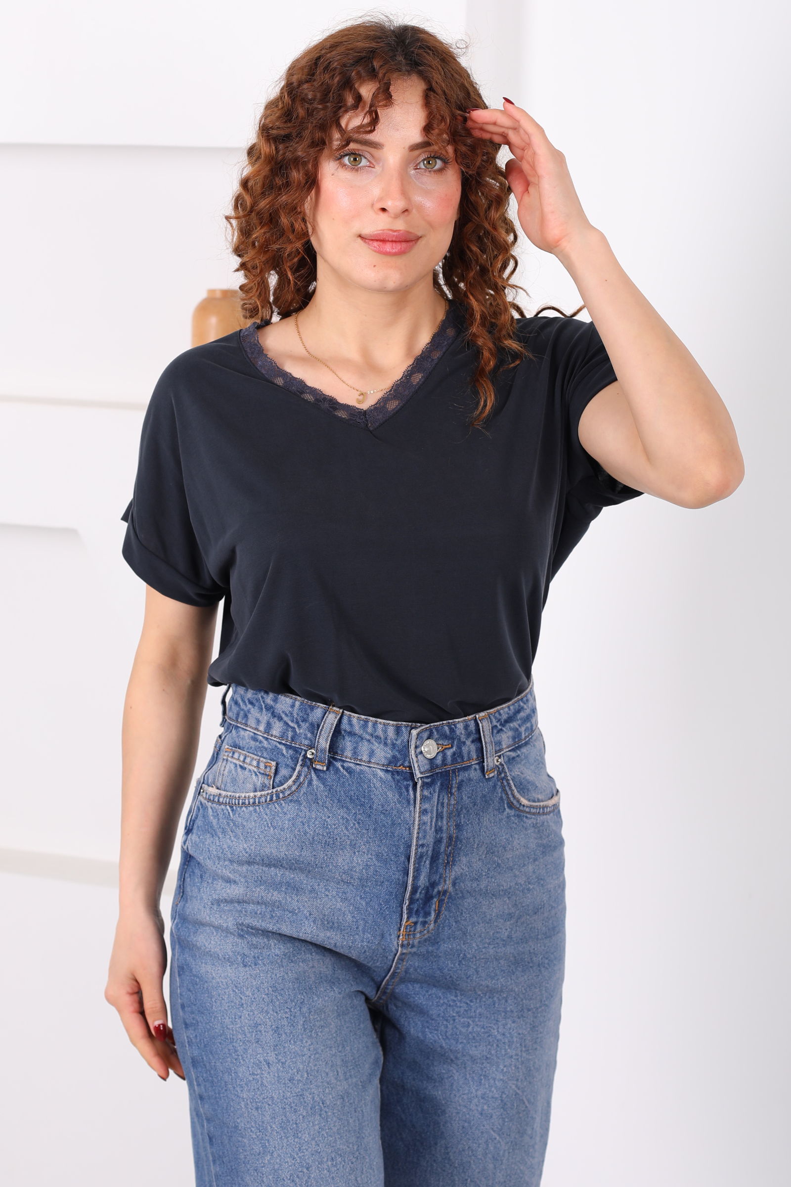 V Yaka Dantelli Kısa Kol Füme Kadın Bluz