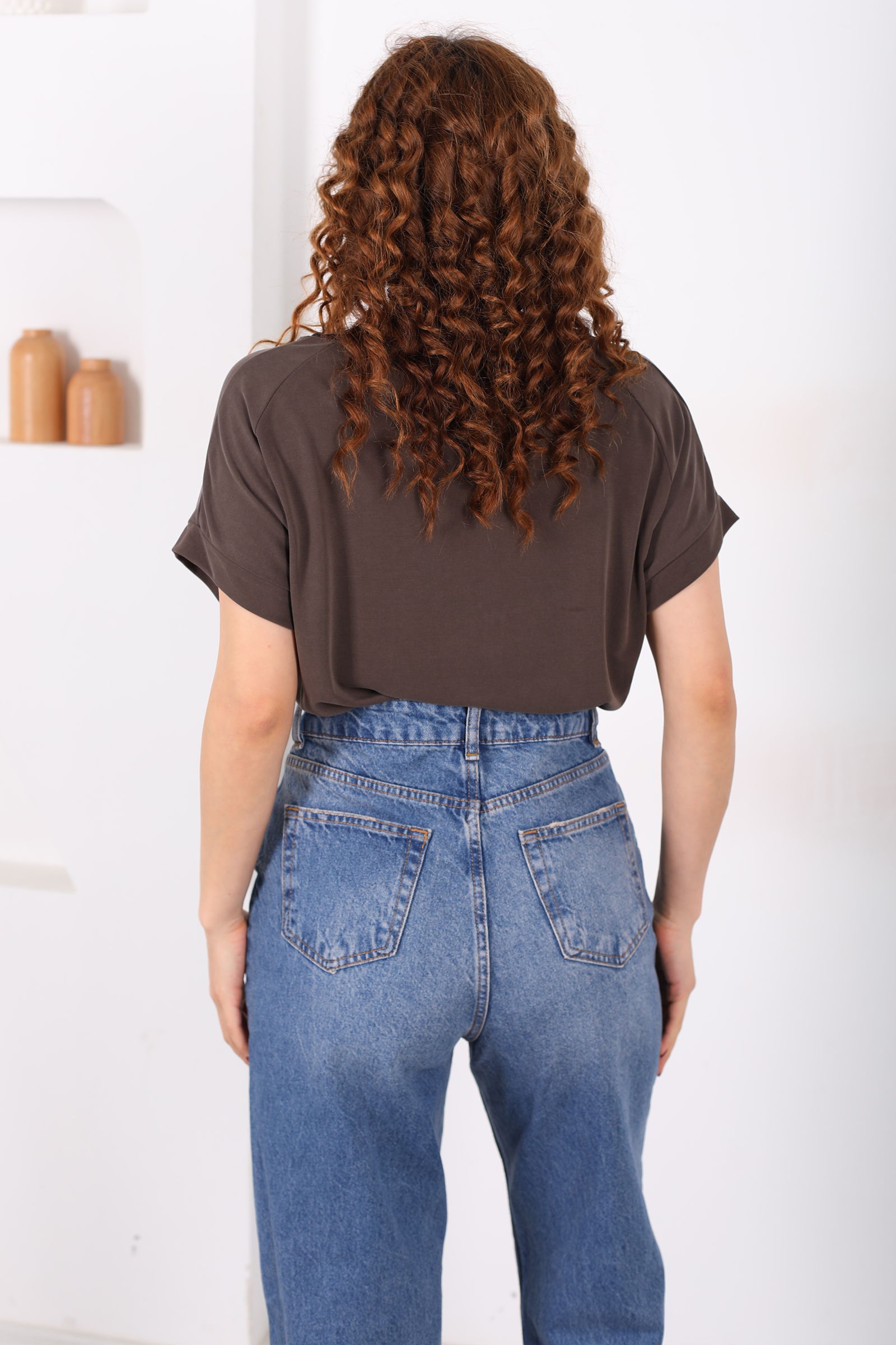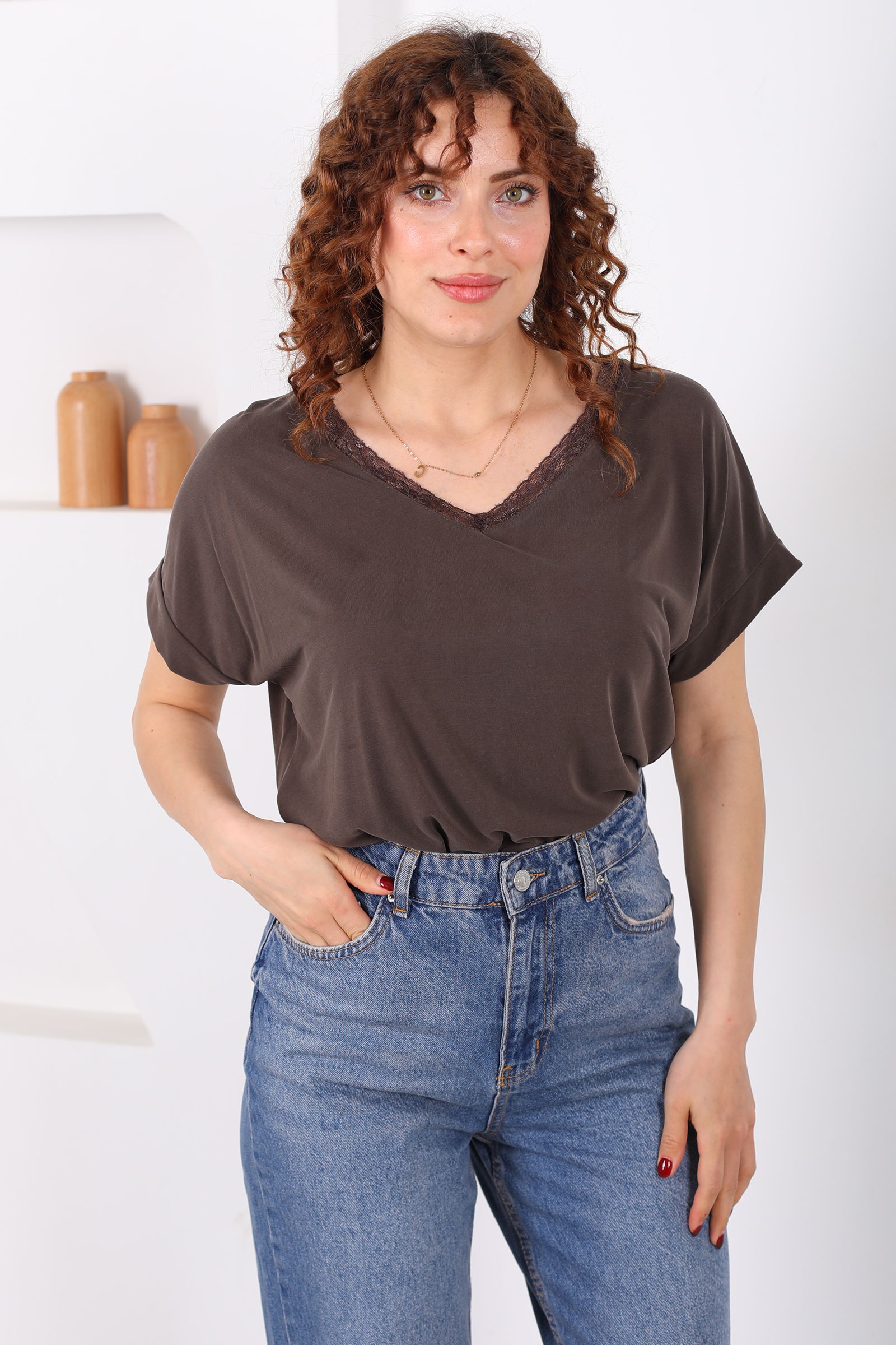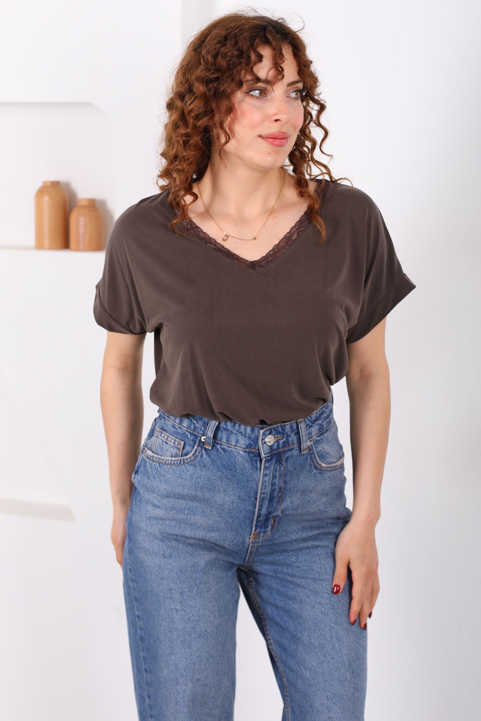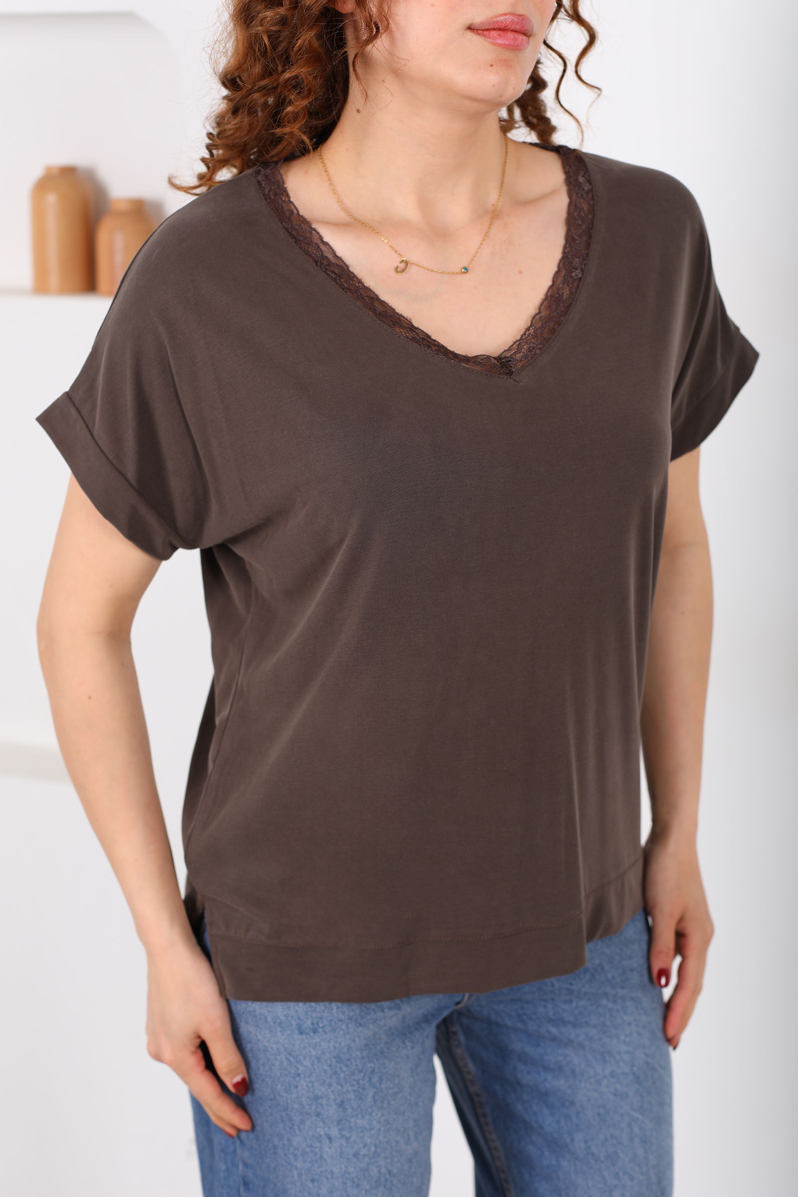 V Yaka Dantelli Kısa Kol Kahverengi Kadın Bluz