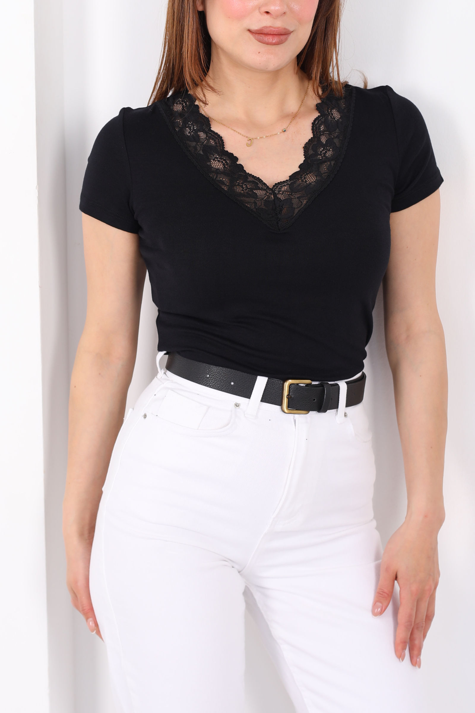 V Yaka Dantelli Kısa Kol Siyah Kadın Bluz