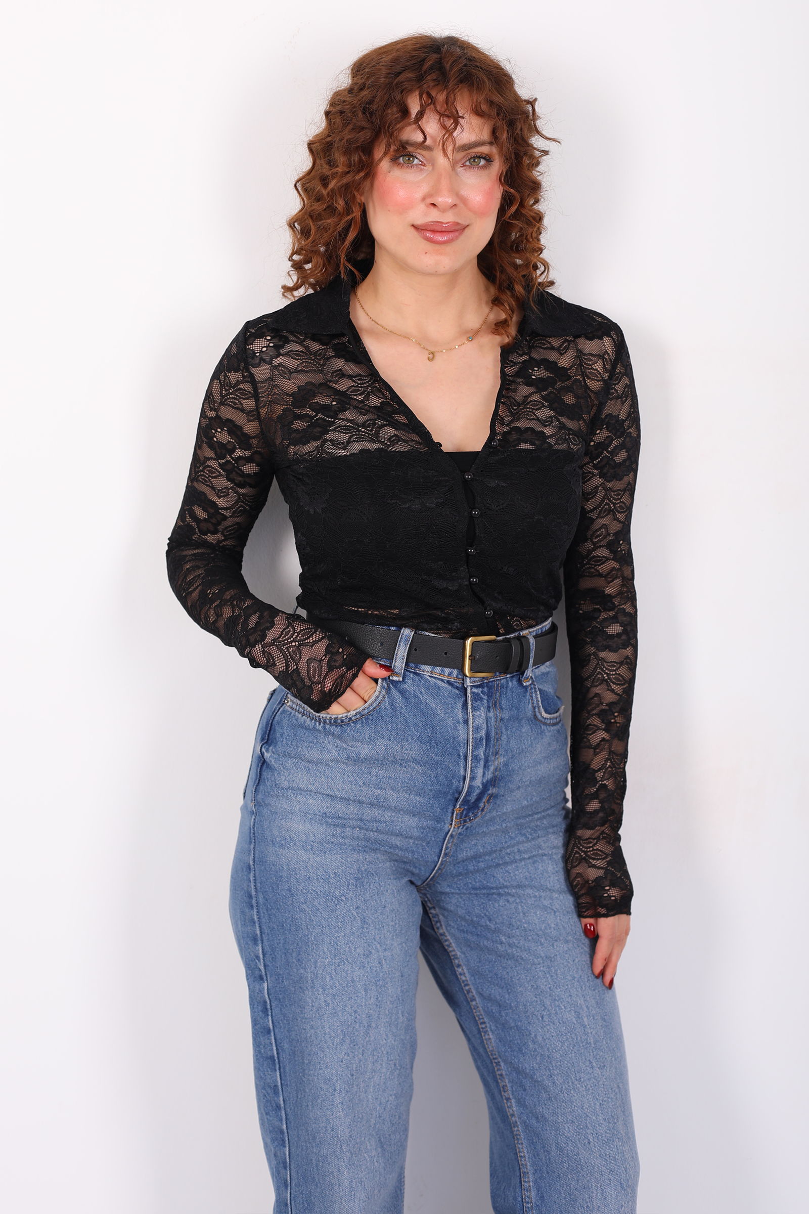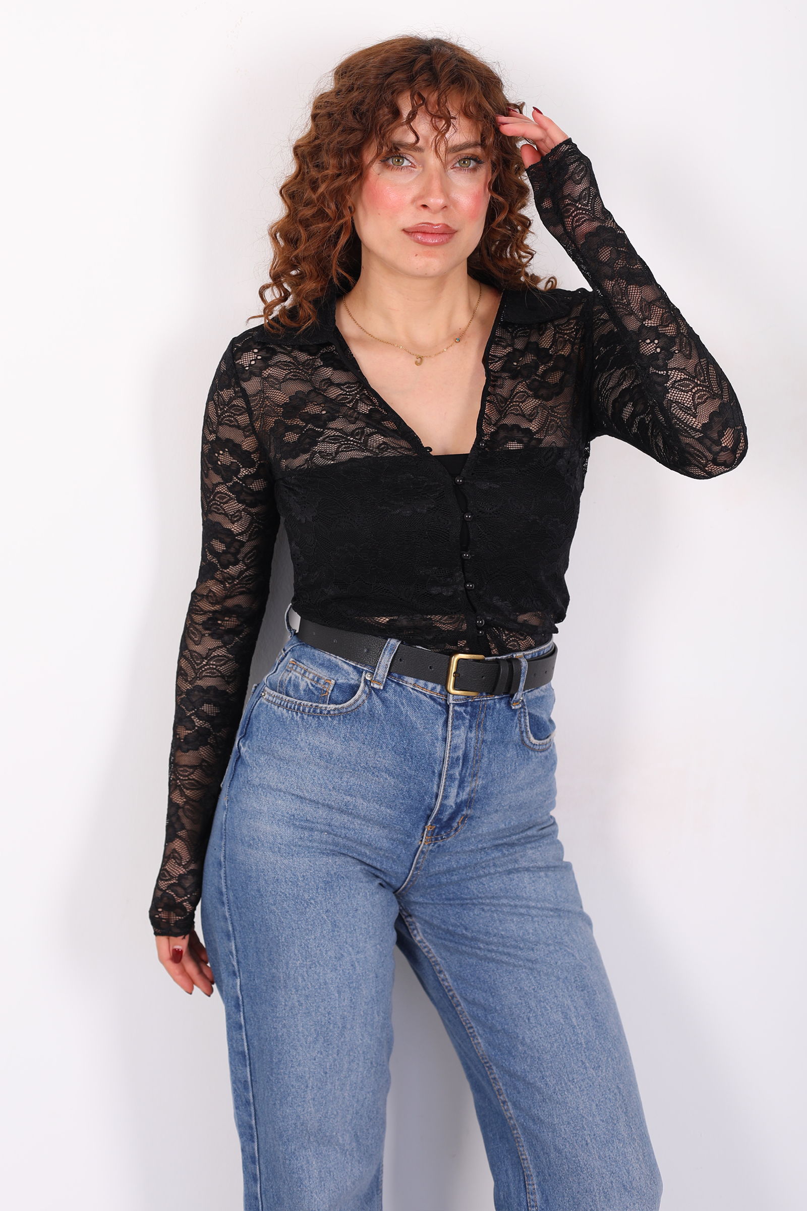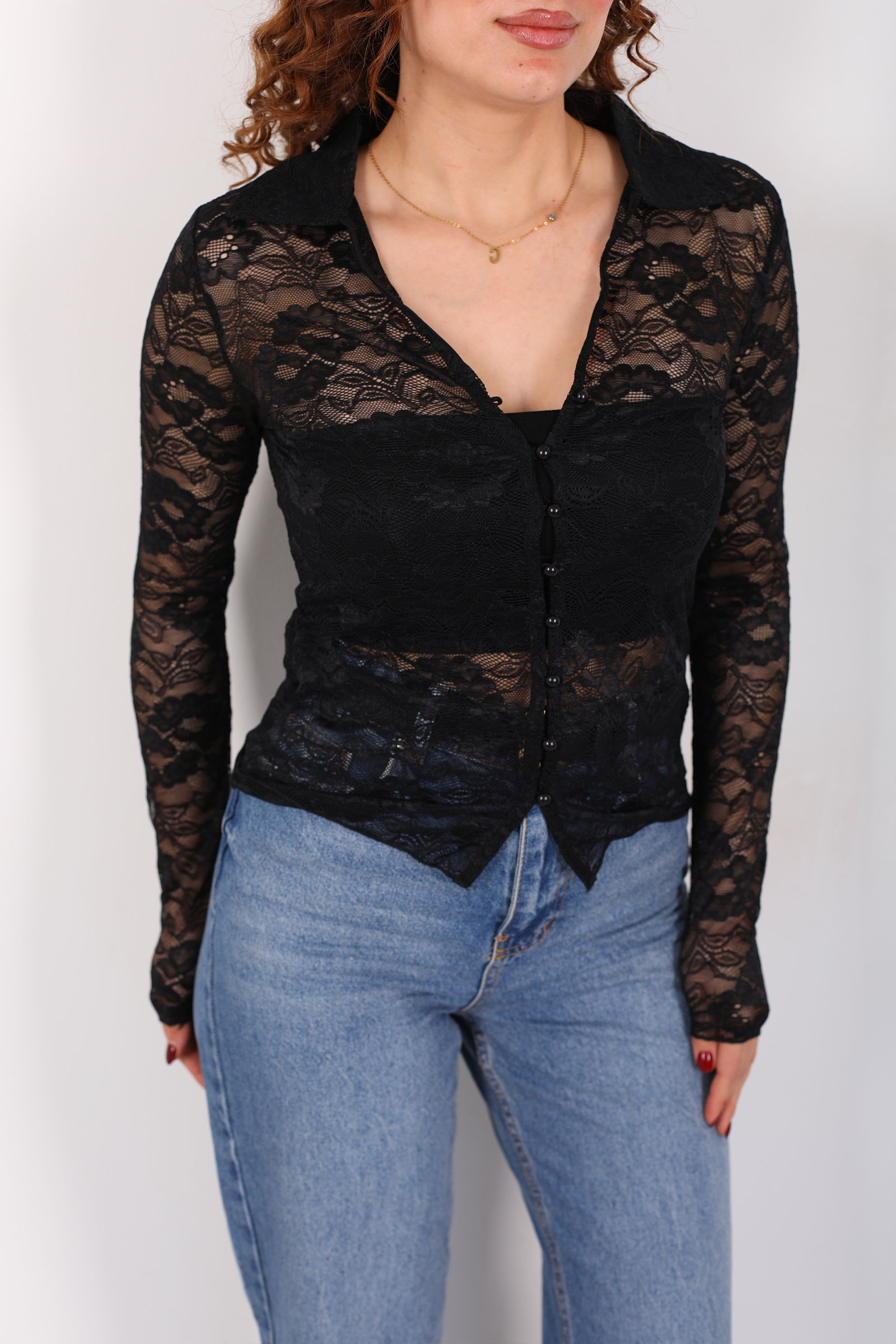 V Yaka Düğmeli Siyah Kadın Dantel Gömlek