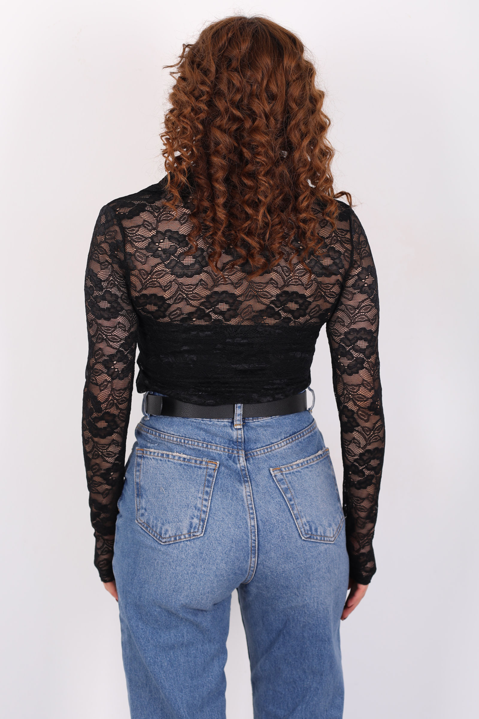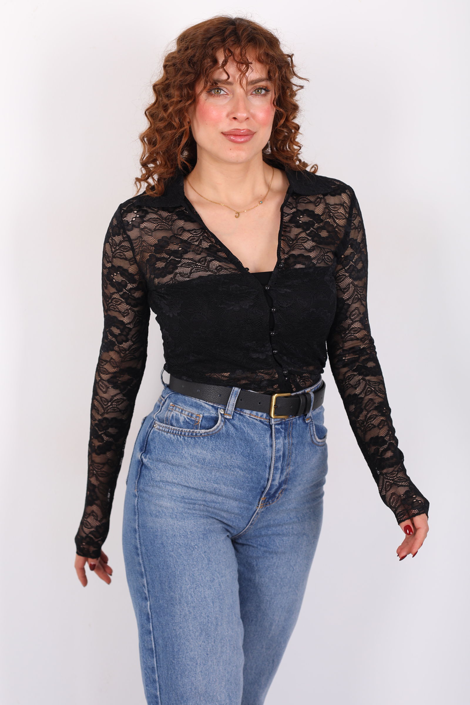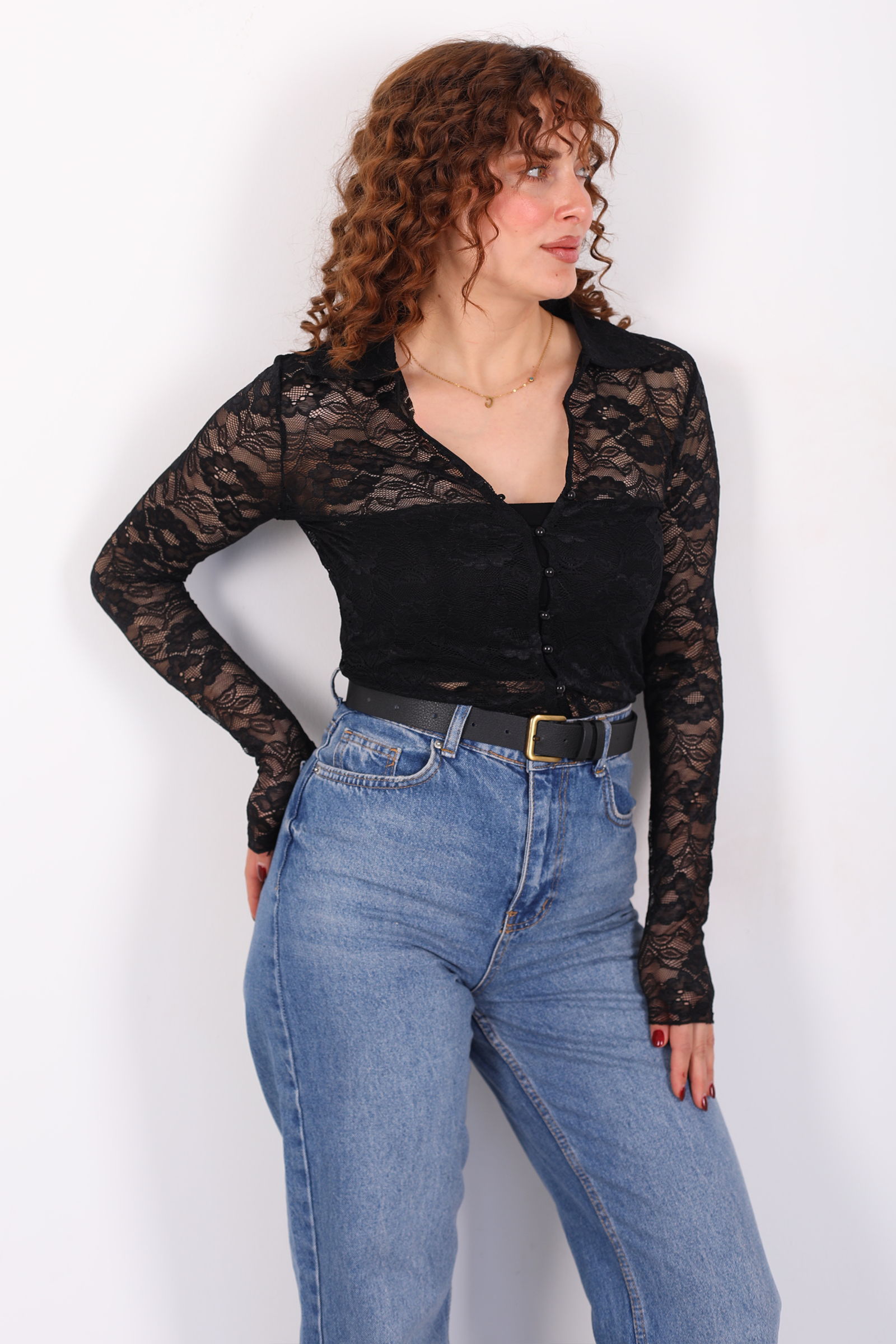 V Yaka Düğmeli Siyah Kadın Dantel Gömlek