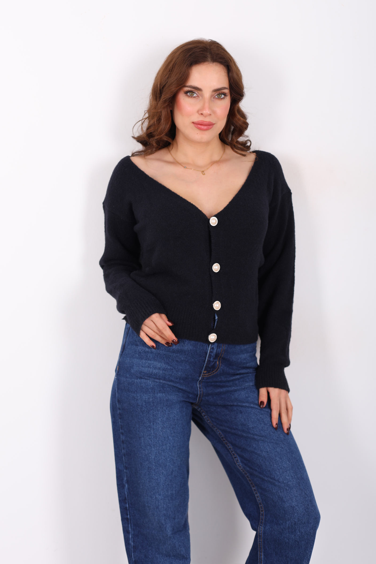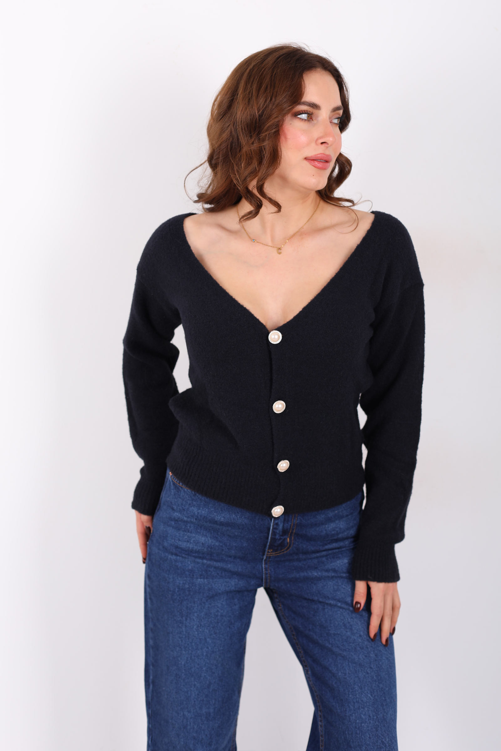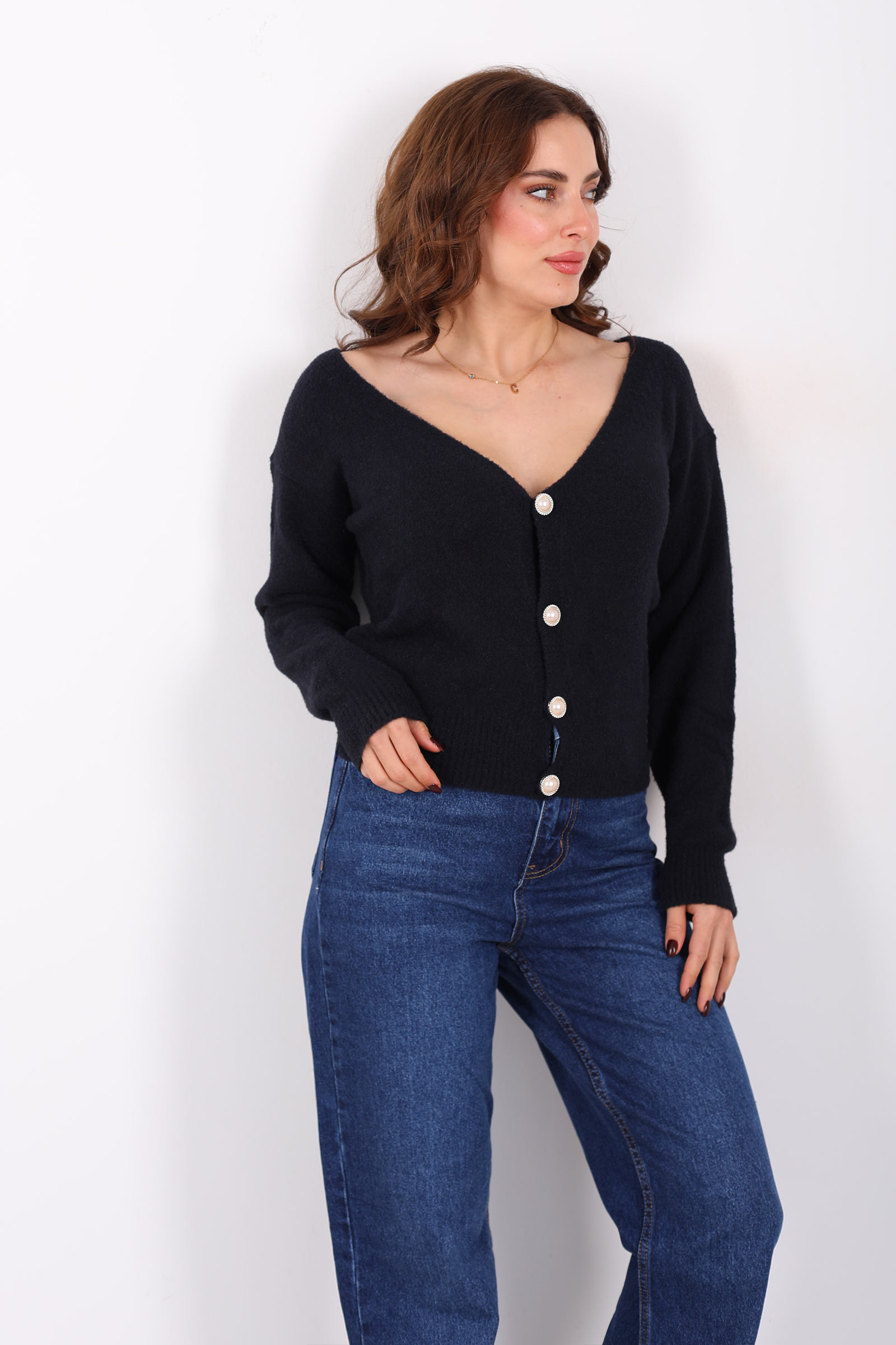 V Yaka Düğmeli Yumoş Siyah Kadın Triko Hırka