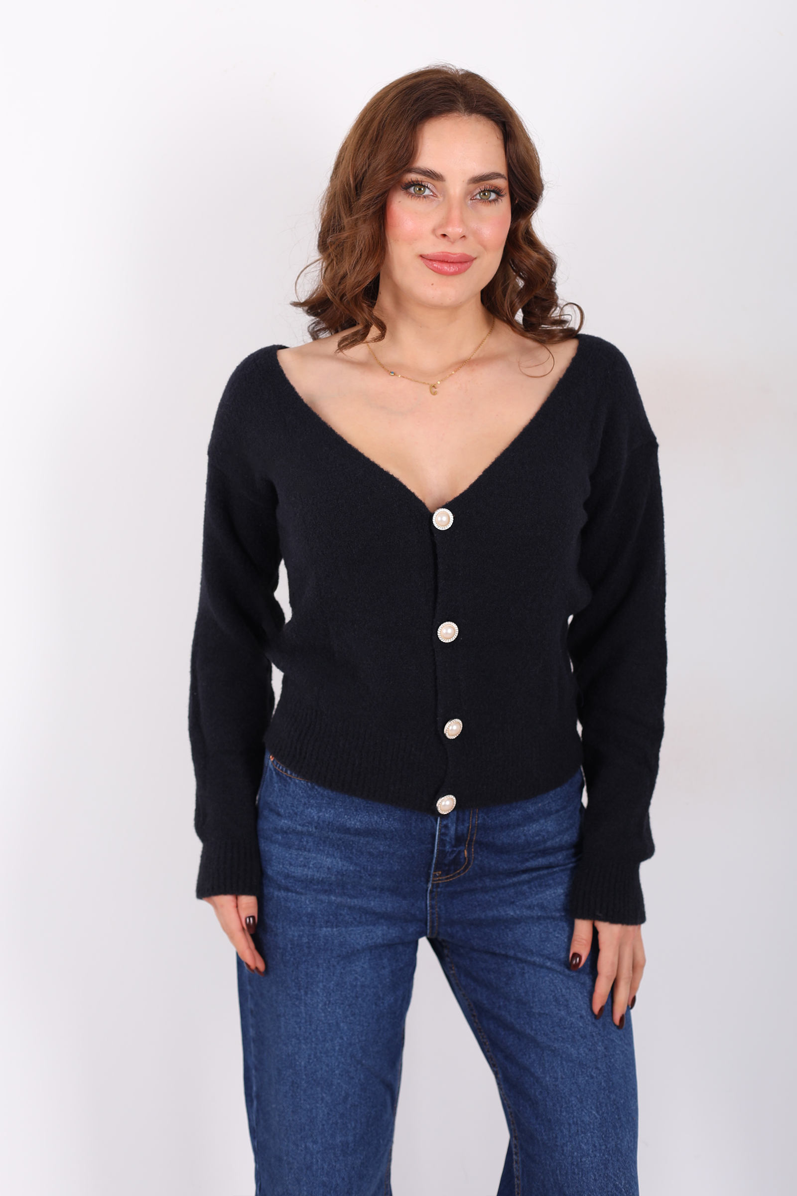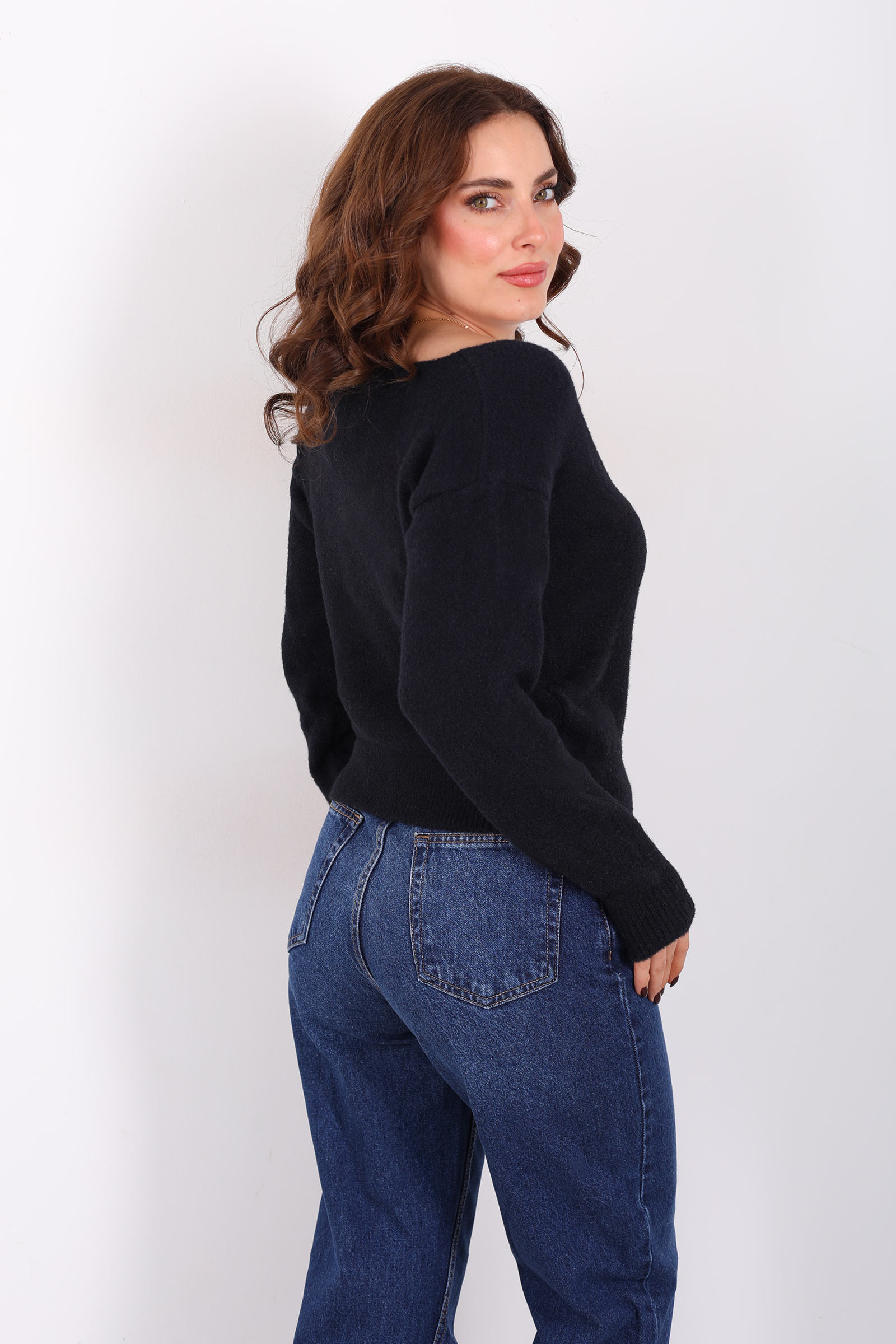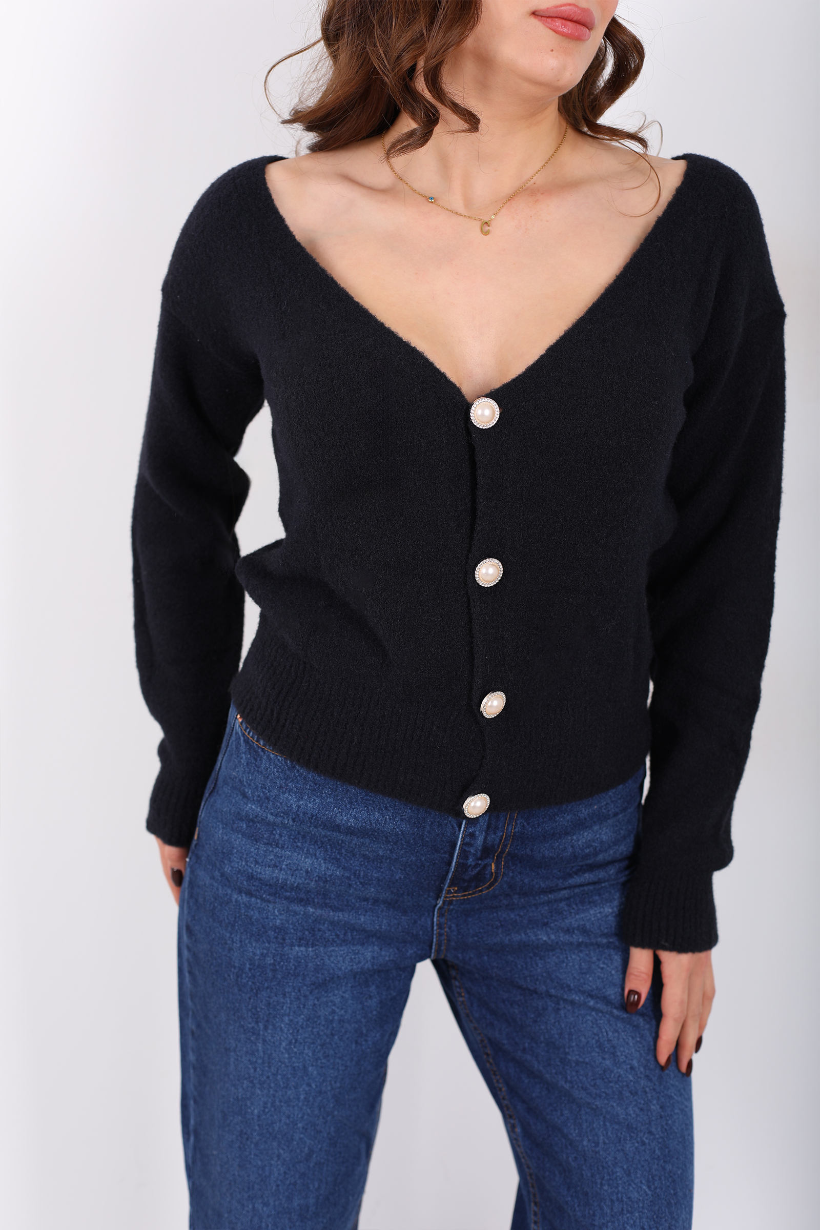 V Yaka Düğmeli Yumoş Siyah Kadın Triko Hırka