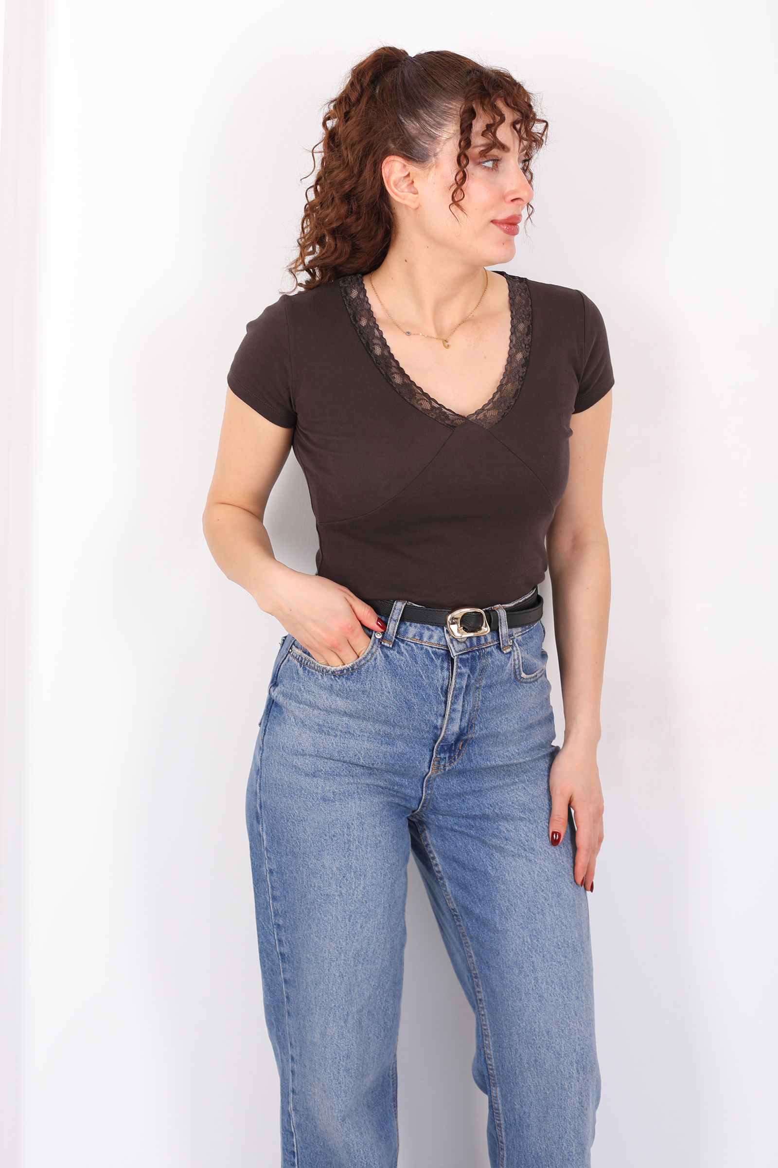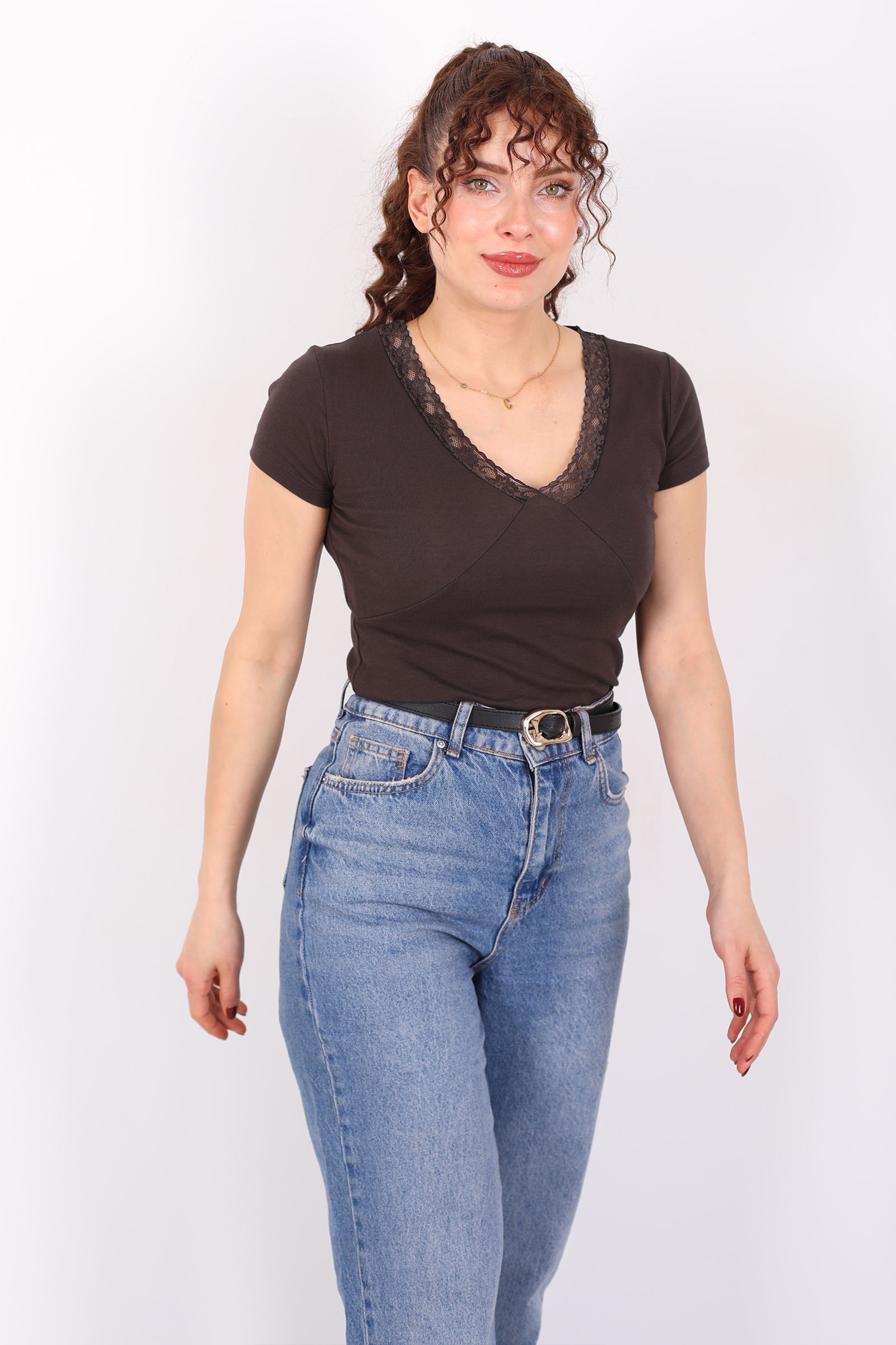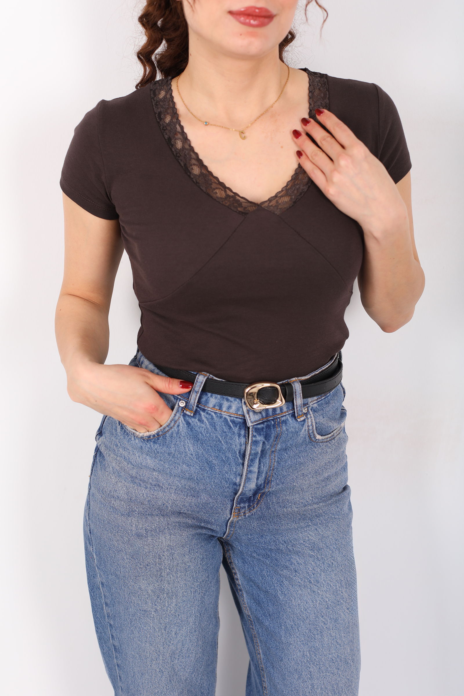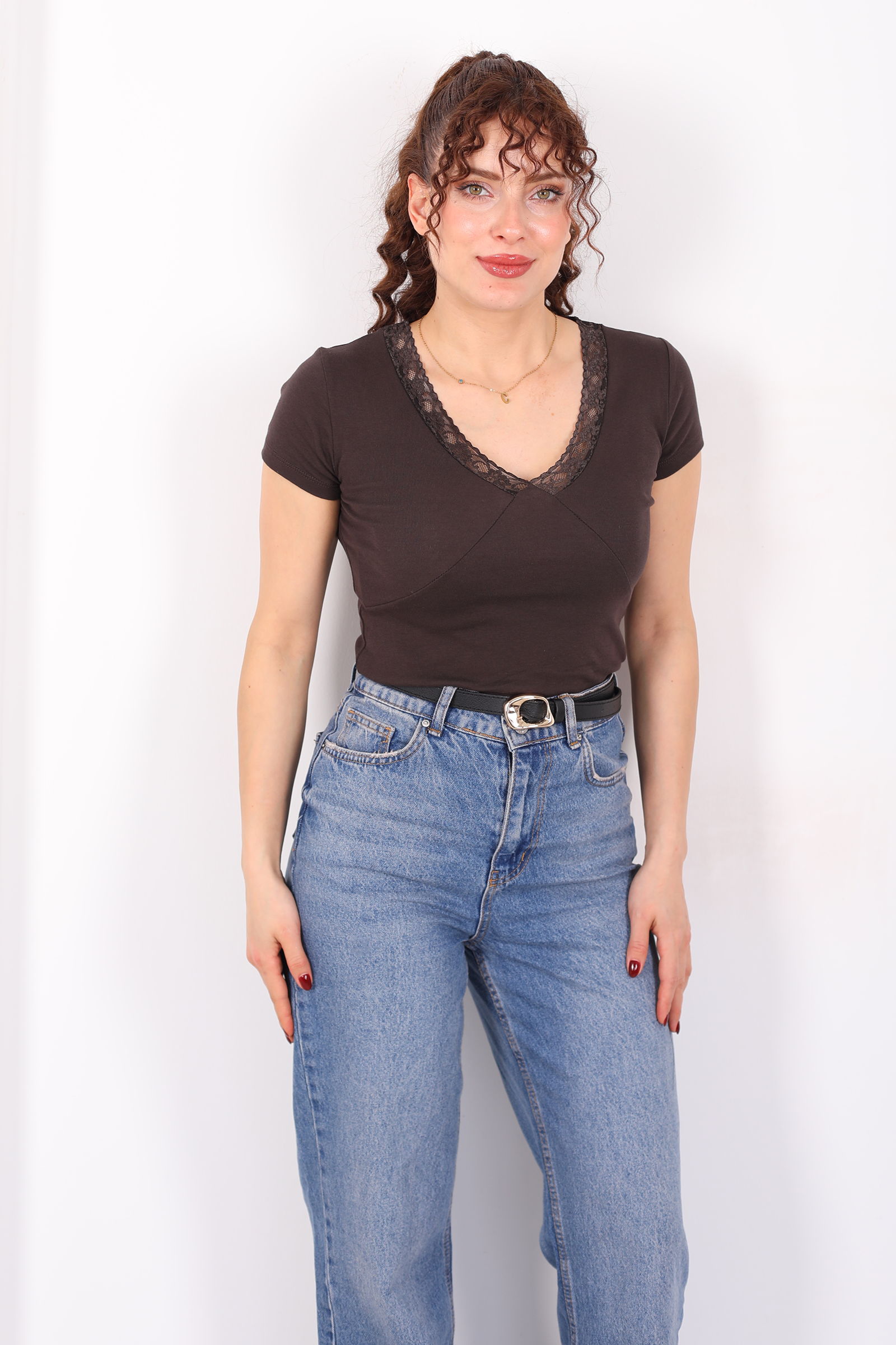 Sıcak tonların feminen yorumu V-yaka güpür detaylı kısa kol açık kahve kadın basic bluz ile stiline zarif bir dokunuş ekle! Açık kahve rengi, sade ve doğal bir ifade sunarken, V-yaka kesim boyun hattını zarifçe vurgular. Güpür detayları bluzun sade yapısına ince bir dantel şıklığı katarak günlük kombinleri sofistike bir dokunuşla tamamlar.