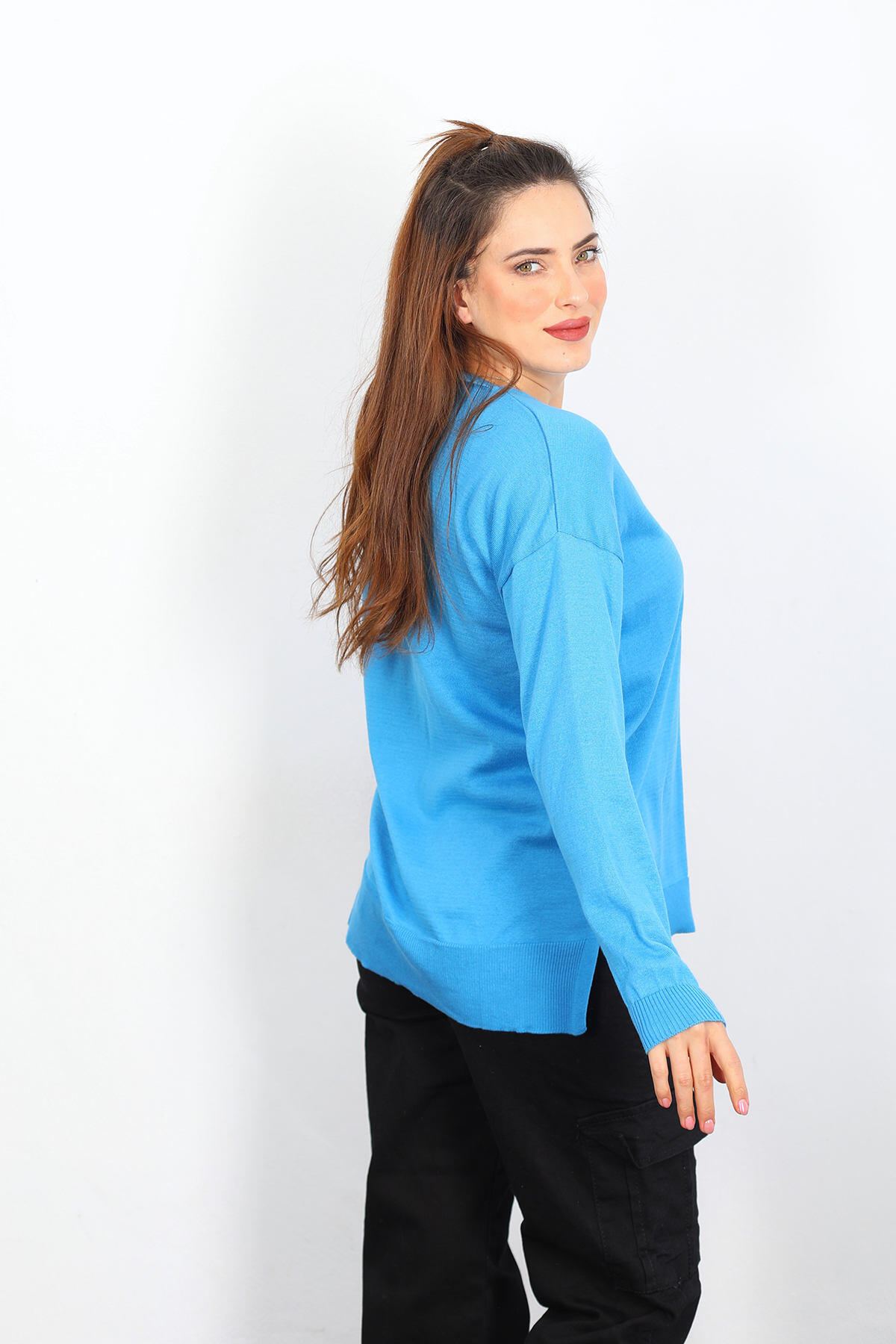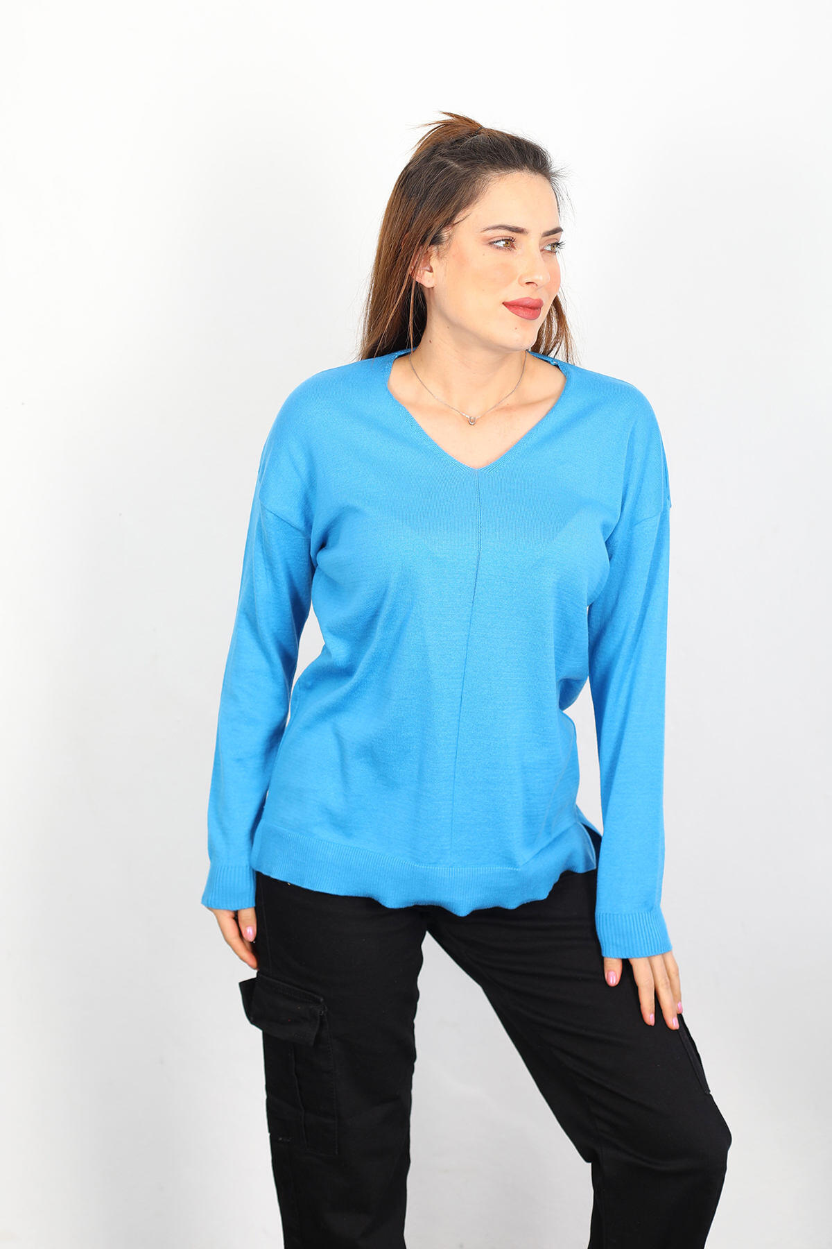 V Yaka Salaş Triko Mavi Kadın Kazak