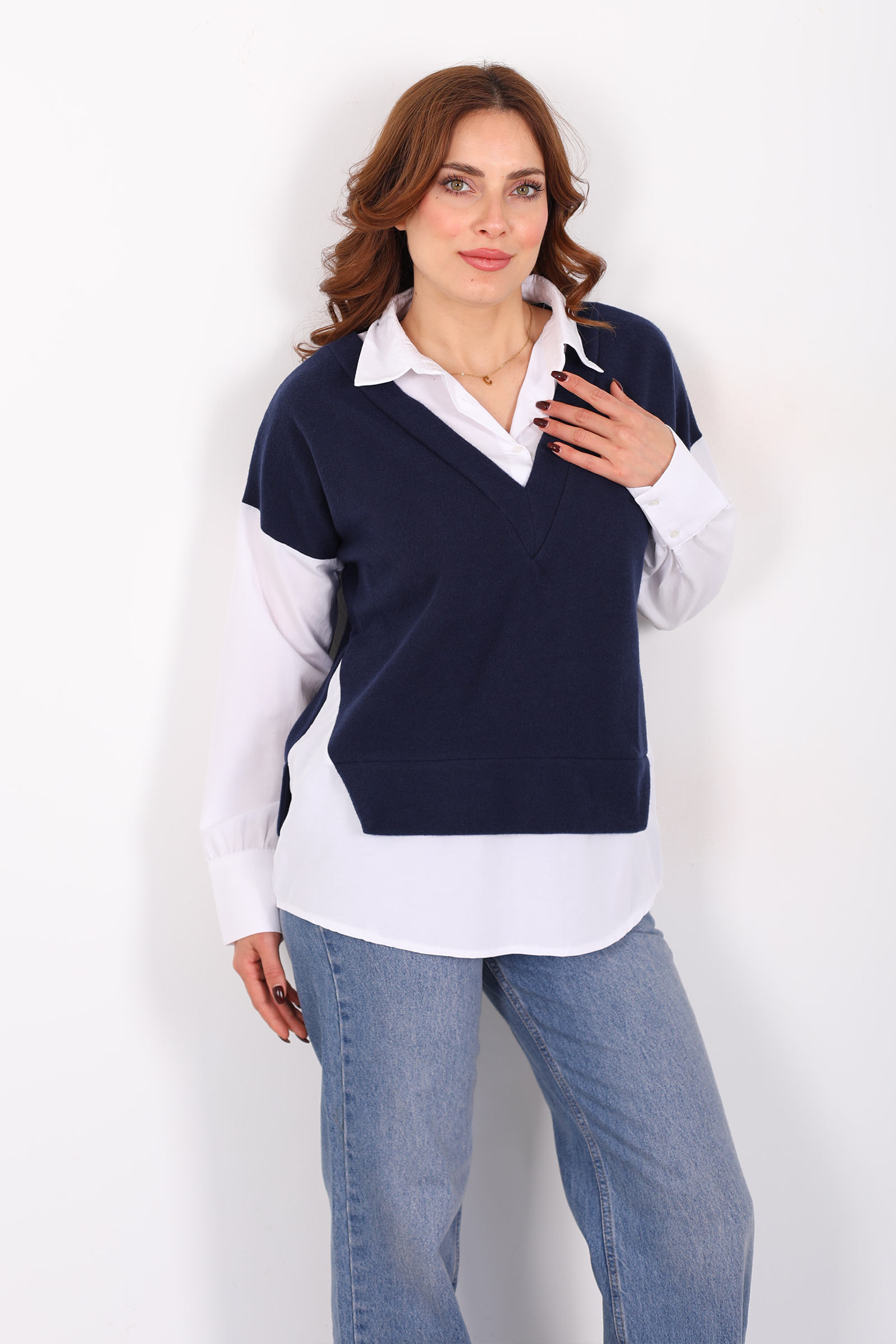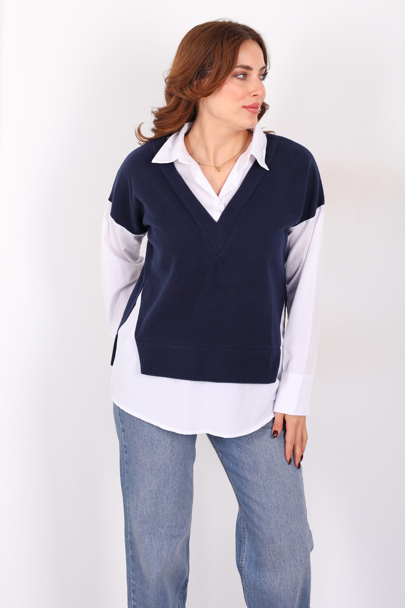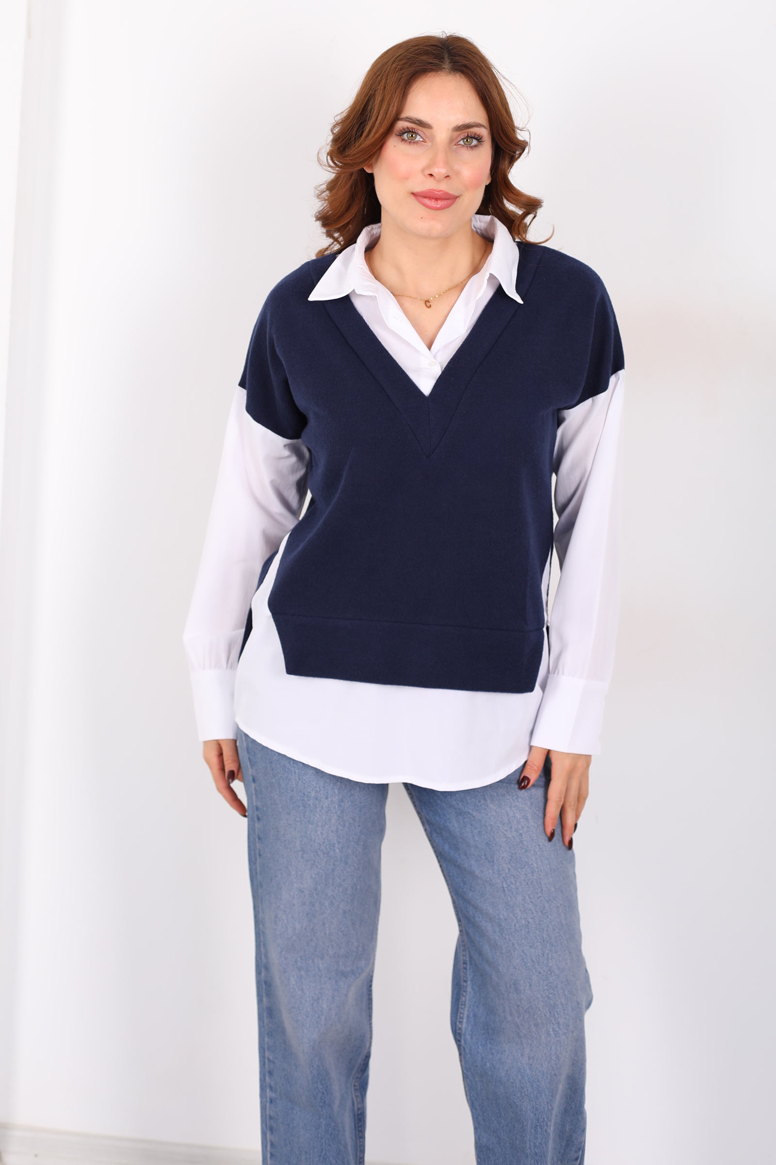 Lacivert selanik süveter ile zarif gömlek bluzun birleşimi, klasik ve modernin uyumlu dansını yansıtıyor. V yaka süveter kısmı boyun hattını net ve şık bir şekilde çerçevelerken gömlek bölümü günlük stilinizde sofistike bir katman oluşturur. Selanik dokunun belirgin yüzeyi, görünümde hacim ve doku zenginliği sağlar; lacivertin derin tonu ise her alt giysiyle dengeli uyum yakalar. Günlük ritminizden ofis stilinize kadar pek çok kombin seçeneğinde etkili bir görünüm sunar. Minimal detaylarla sade duruşu, şıklığınızı kolayca öne çıkarır.