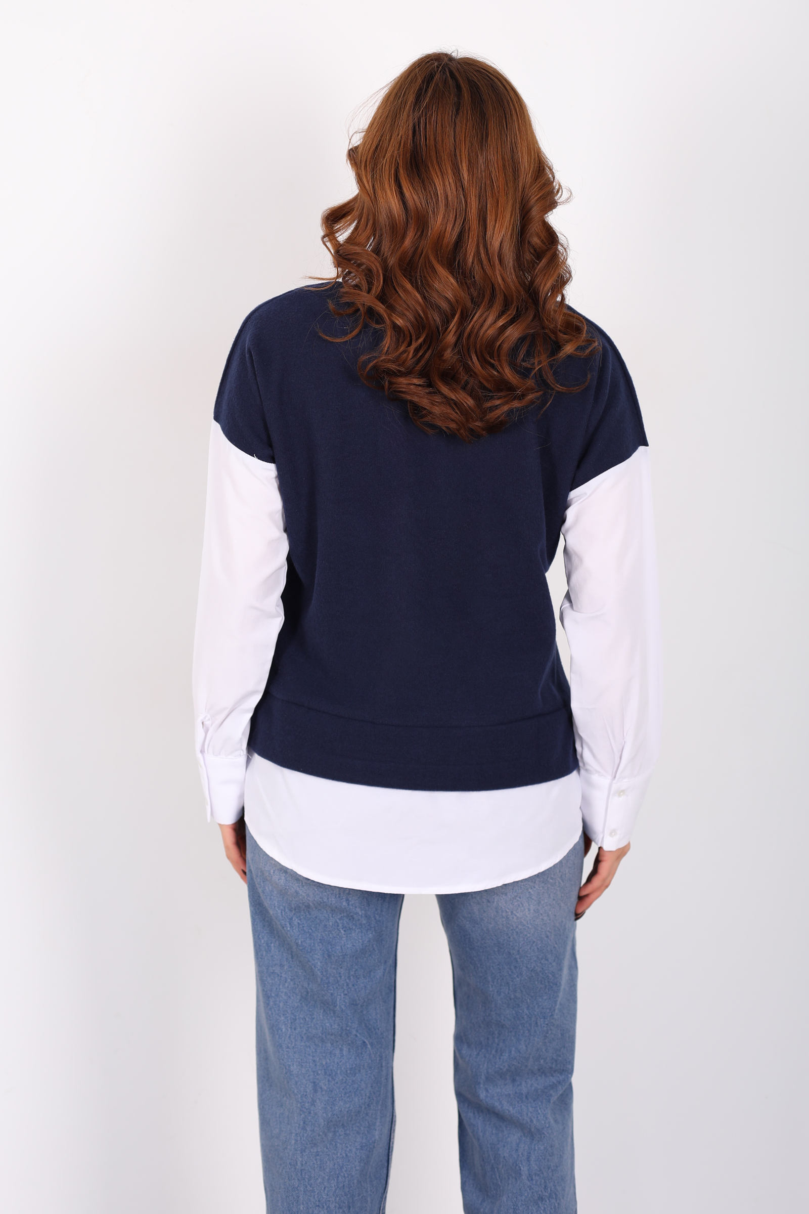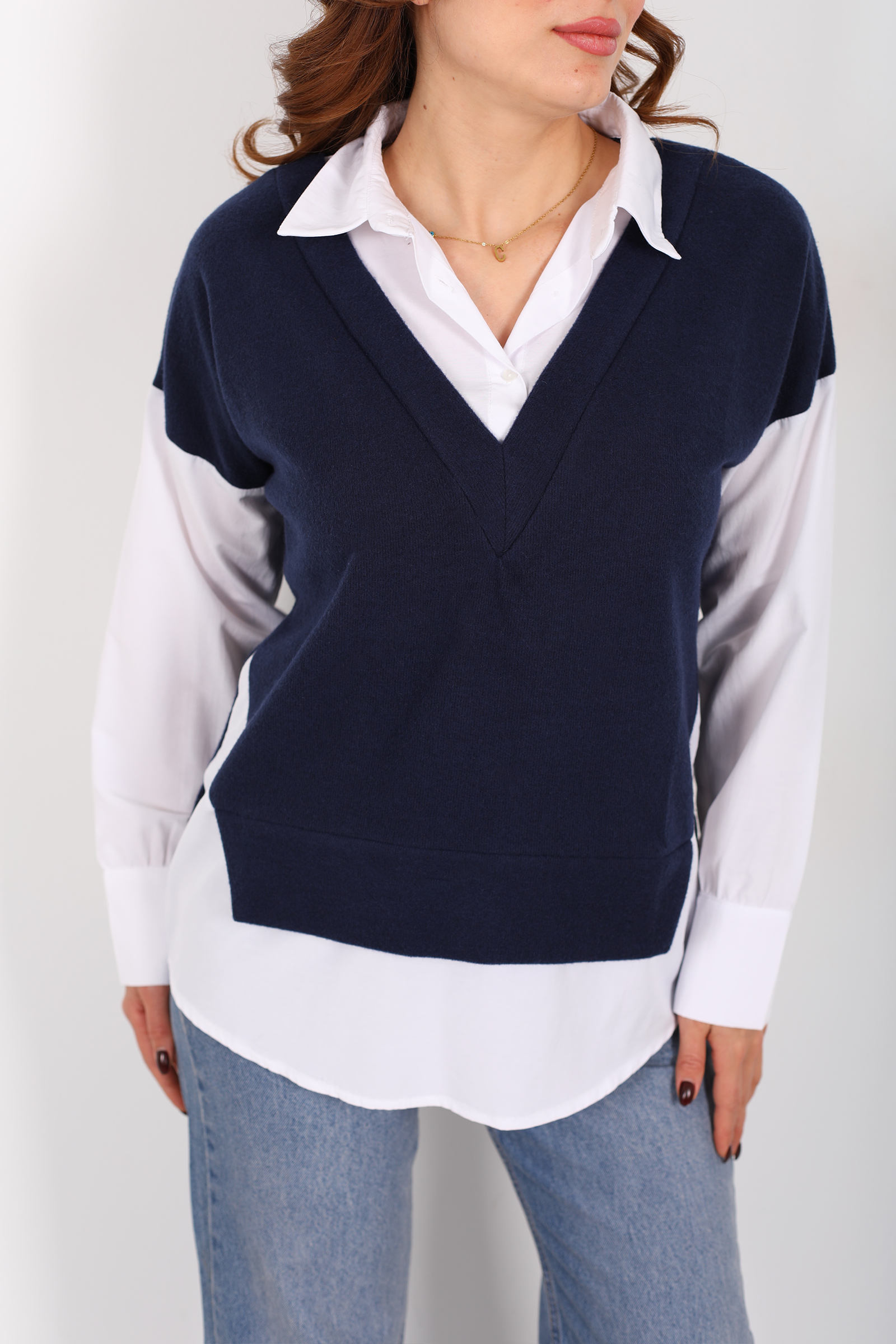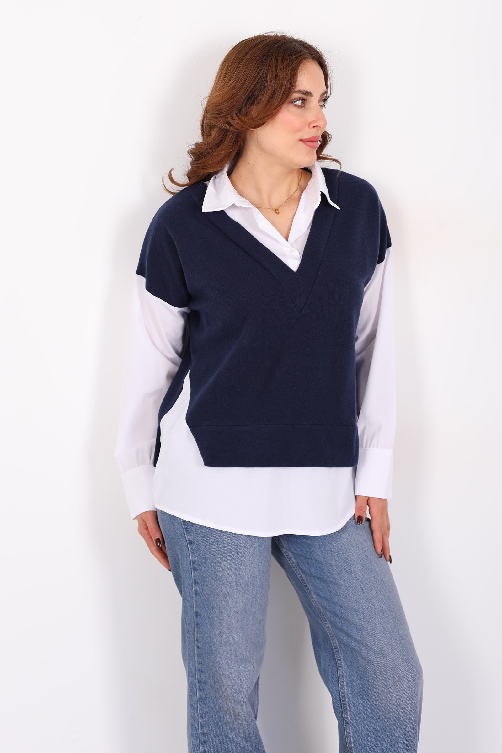 Lacivert selanik süveter ile zarif gömlek bluzun birleşimi, klasik ve modernin uyumlu dansını yansıtıyor. V yaka süveter kısmı boyun hattını net ve şık bir şekilde çerçevelerken gömlek bölümü günlük stilinizde sofistike bir katman oluşturur. Selanik dokunun belirgin yüzeyi, görünümde hacim ve doku zenginliği sağlar; lacivertin derin tonu ise her alt giysiyle dengeli uyum yakalar. Günlük ritminizden ofis stilinize kadar pek çok kombin seçeneğinde etkili bir görünüm sunar. Minimal detaylarla sade duruşu, şıklığınızı kolayca öne çıkarır.