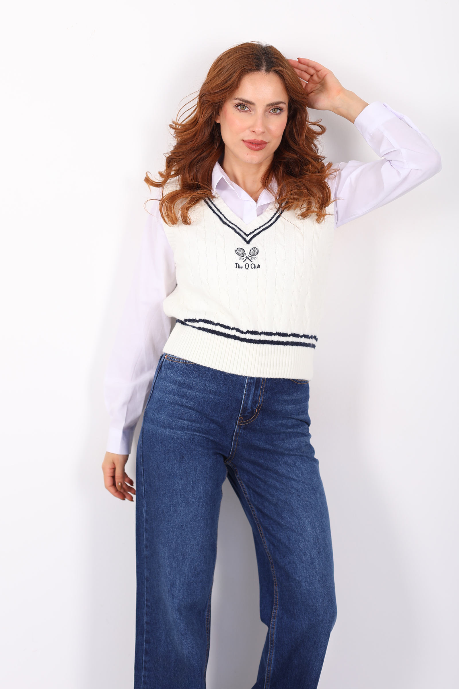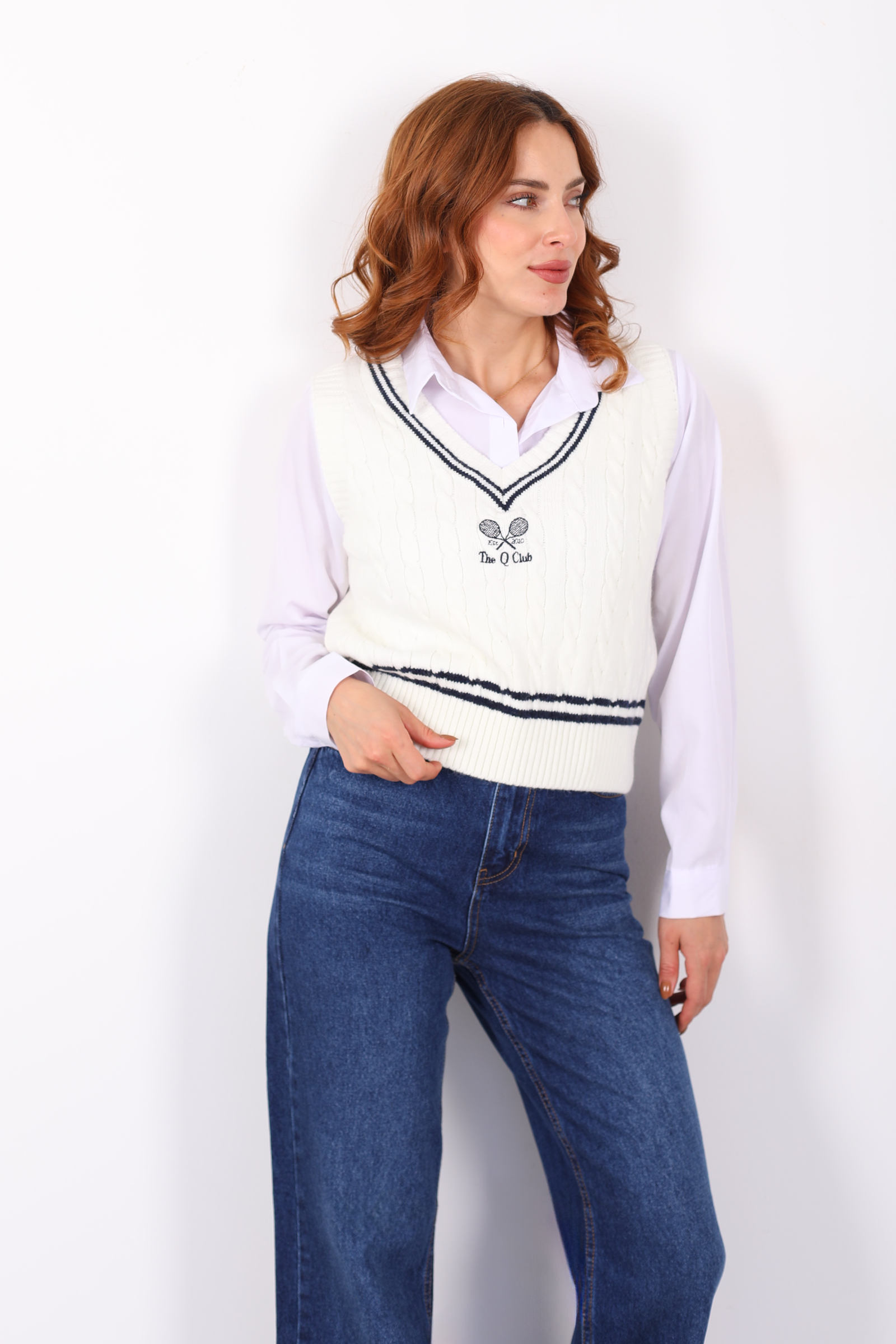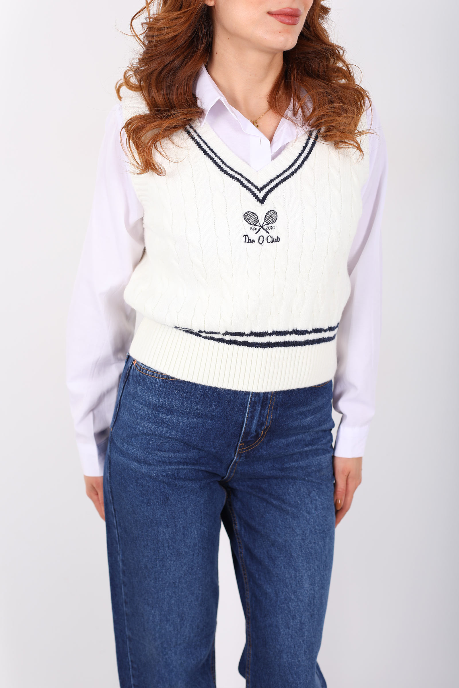 V Yaka Tenis Nakışlı Kadın Ekru Süveter
